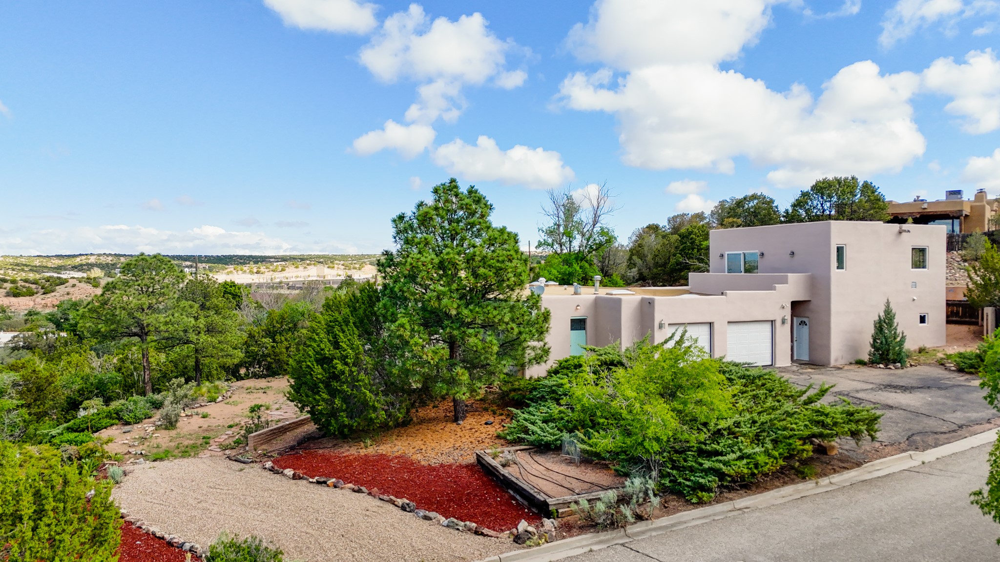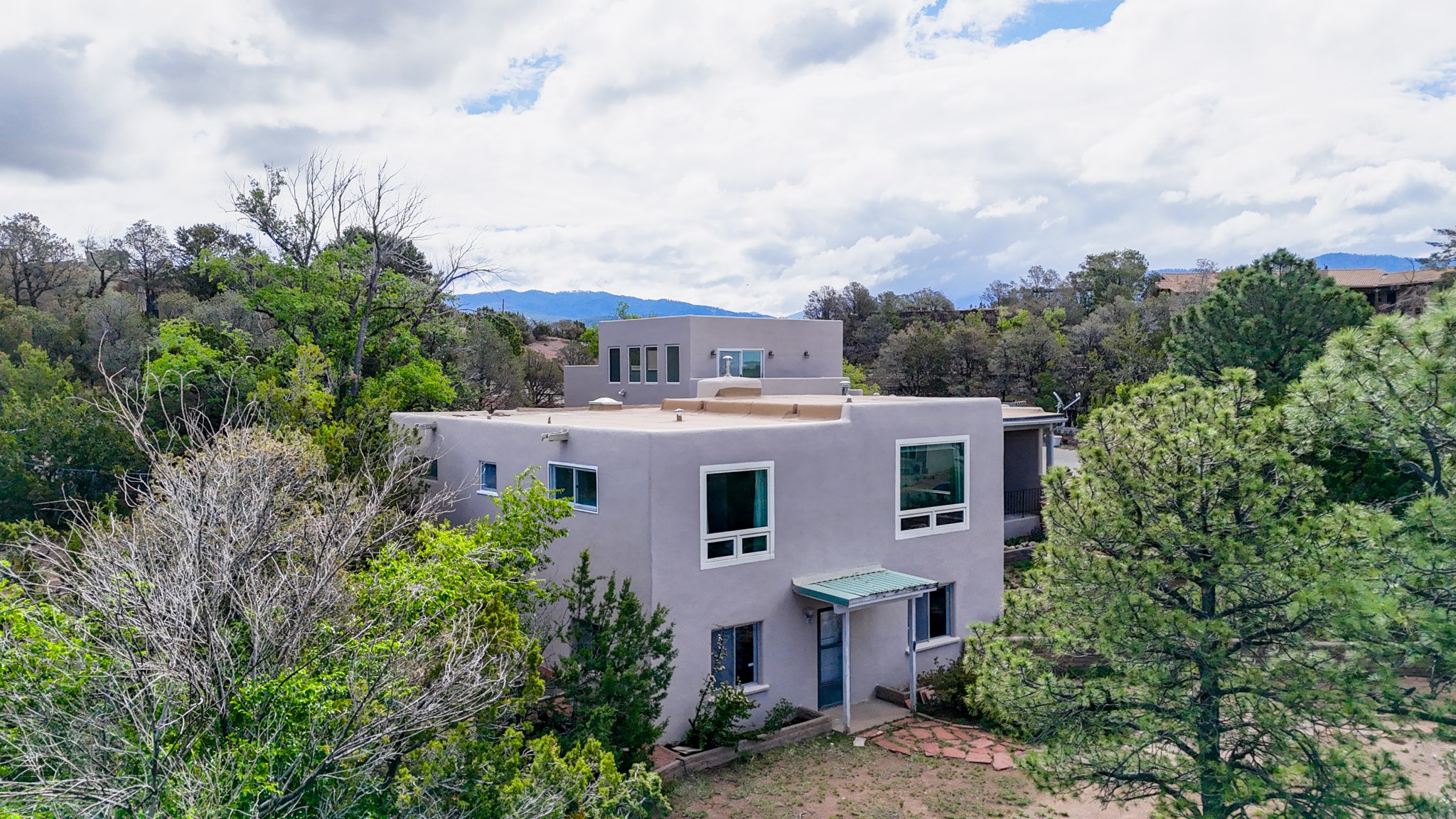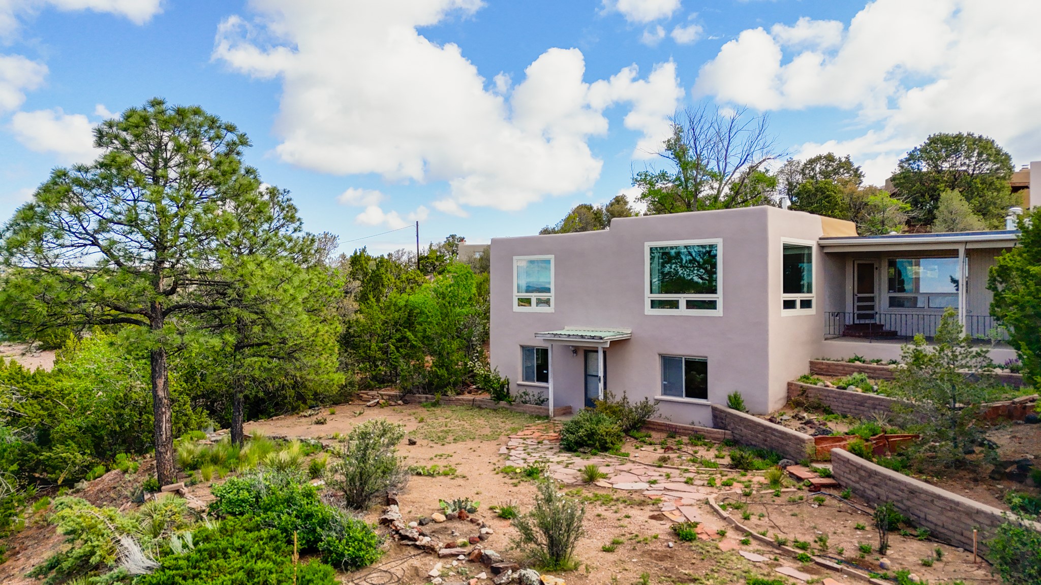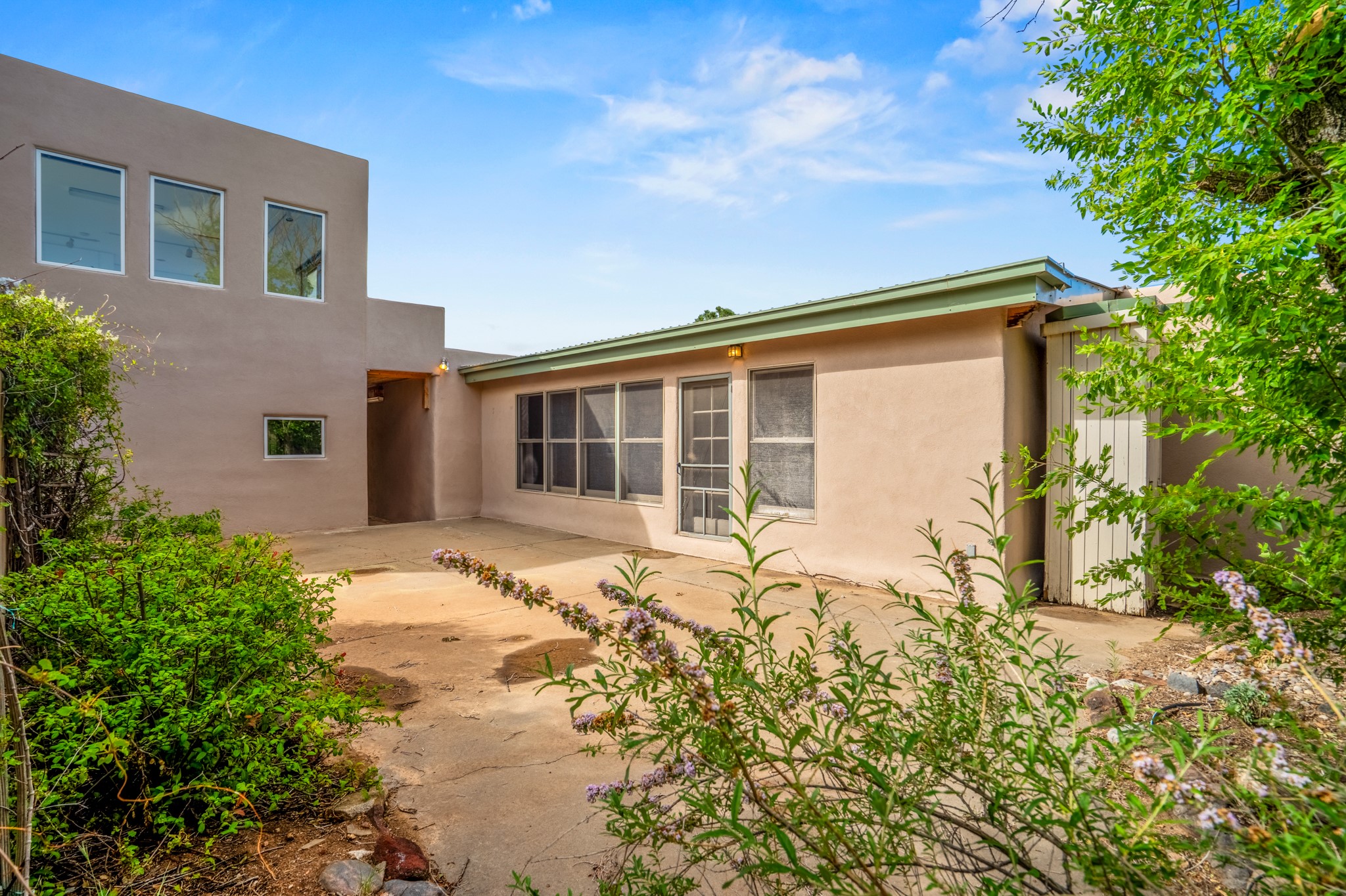 Discover the potential of this mid-century home paired with a contemporary studio, perched at the peak of the desirable Rosario Hill neighborhood and offering sweeping western views. The main house features potential mid-century charm, ready for a visionary owner to restore and personalize. The upper level includes a spacious living room with a cozy fireplace and expansive views, a formal dining area, a functional kitchen, two bedrooms, and a full bath. The lower level offers incredible versatility with two additional bedrooms, a full bath, a large family/living area with a fireplace, a private entrance, and dedicated parking--ideal for use as a rental unit or guest suite. Adding even more value is a separate studio building, offering two distinct studio spaces (approximately 600 sq. ft. each). The upper studio is bright and airy, with lovely views, while the lower studio includes a bath--perfect as an artist's retreat or as rental income from creative tenants.This unique property offers multiple income streams, artistic flexibility, and the opportunity to craft a dream home in one of the area's scenic neighborhoods 5 minutes from the Santa Fe Plaza.