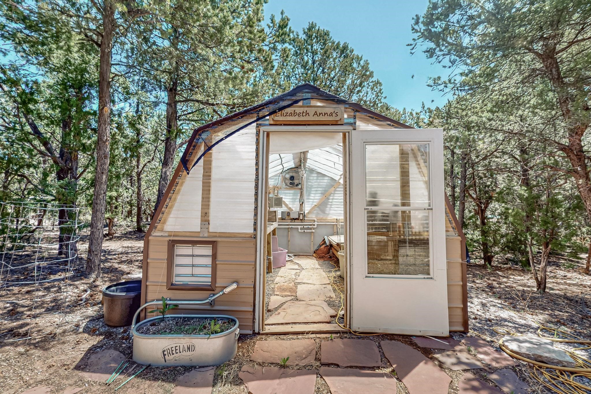 Beautiful custom built log cabin for sale on 5 gorgeous tree covered acres. The home features 5 bedrooms, 4 1/2 baths, chef's kitchen, expansive floor plan, a recently built workshop/studio, and expansive deck great for entertaining. The home is constructed using builder chosen 6-18 inch logs and features two in-home sprinkler systems. The property contains incredible landscaping and has potential for horses with ample storage and barns. There are two legal lots of record, a private well with water rights, chicken coop, greenhouse, fruit trees, sophisticated playground equipment, healthy Pion, Juniper trees, custom rock retaining walls, and graveled driveway. Conveniently located 30 minutes from downtown Santa Fe, this incredible property combines the best of rural living with easy access to amenities. Set up a showing today!