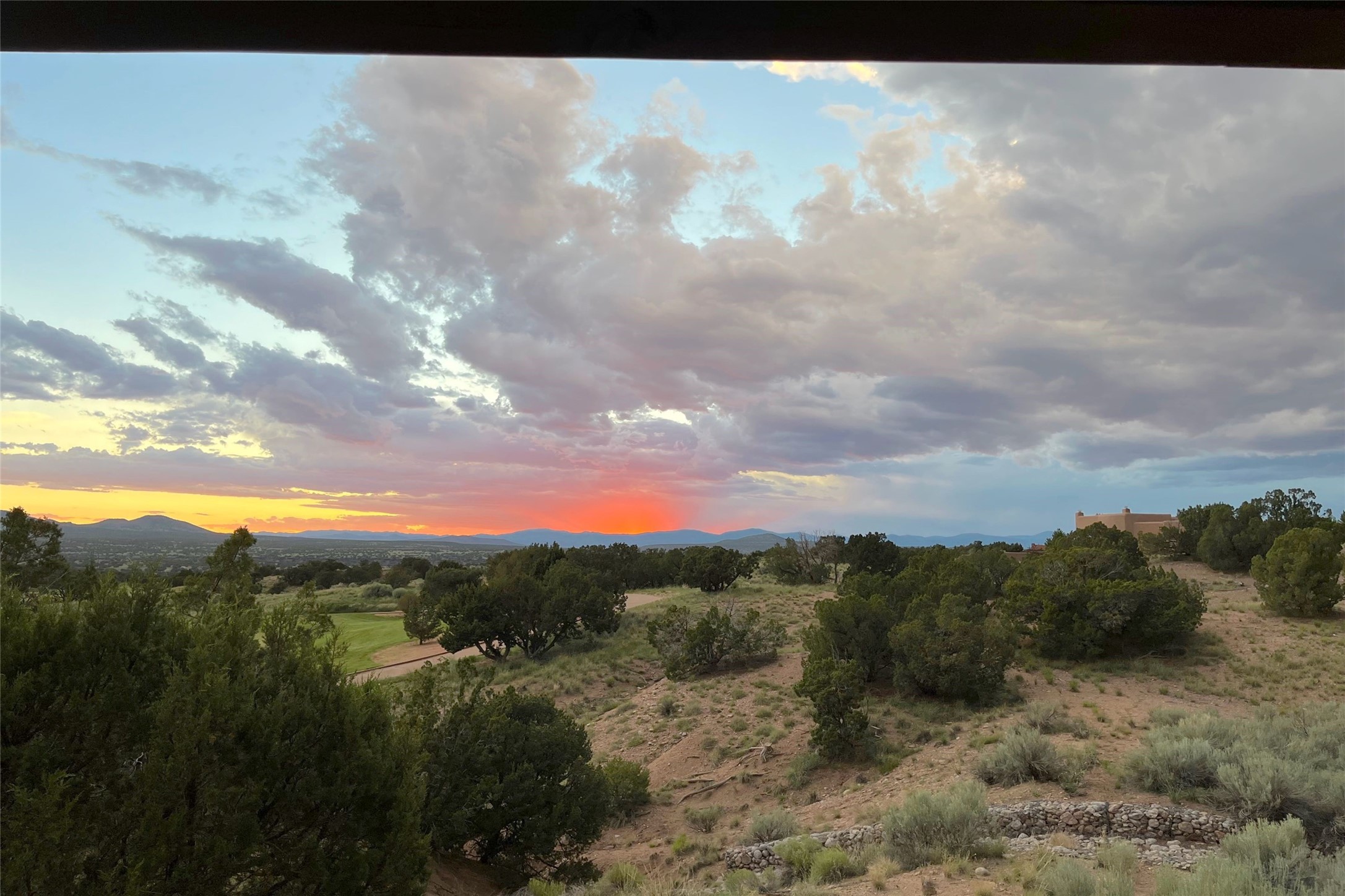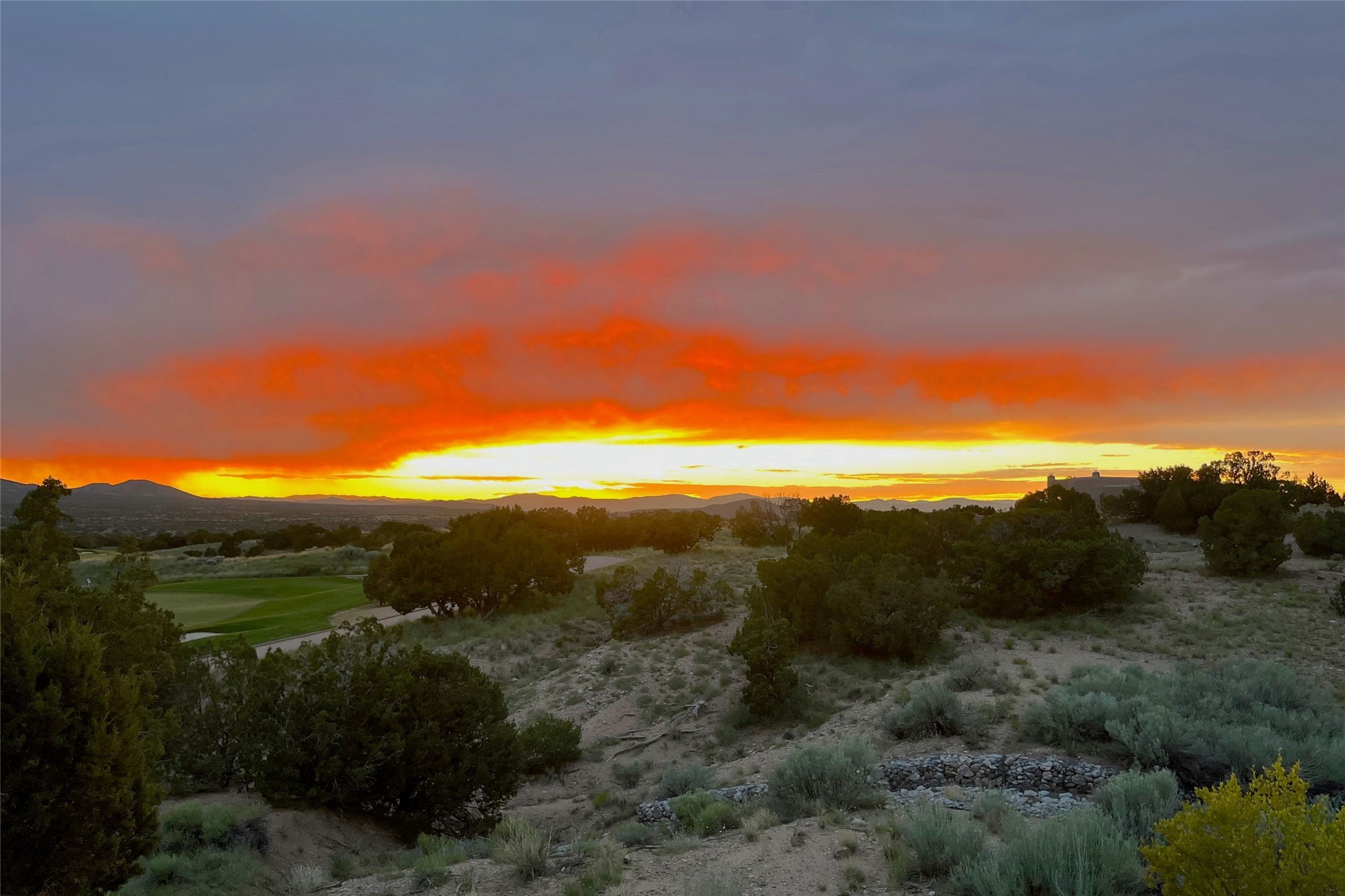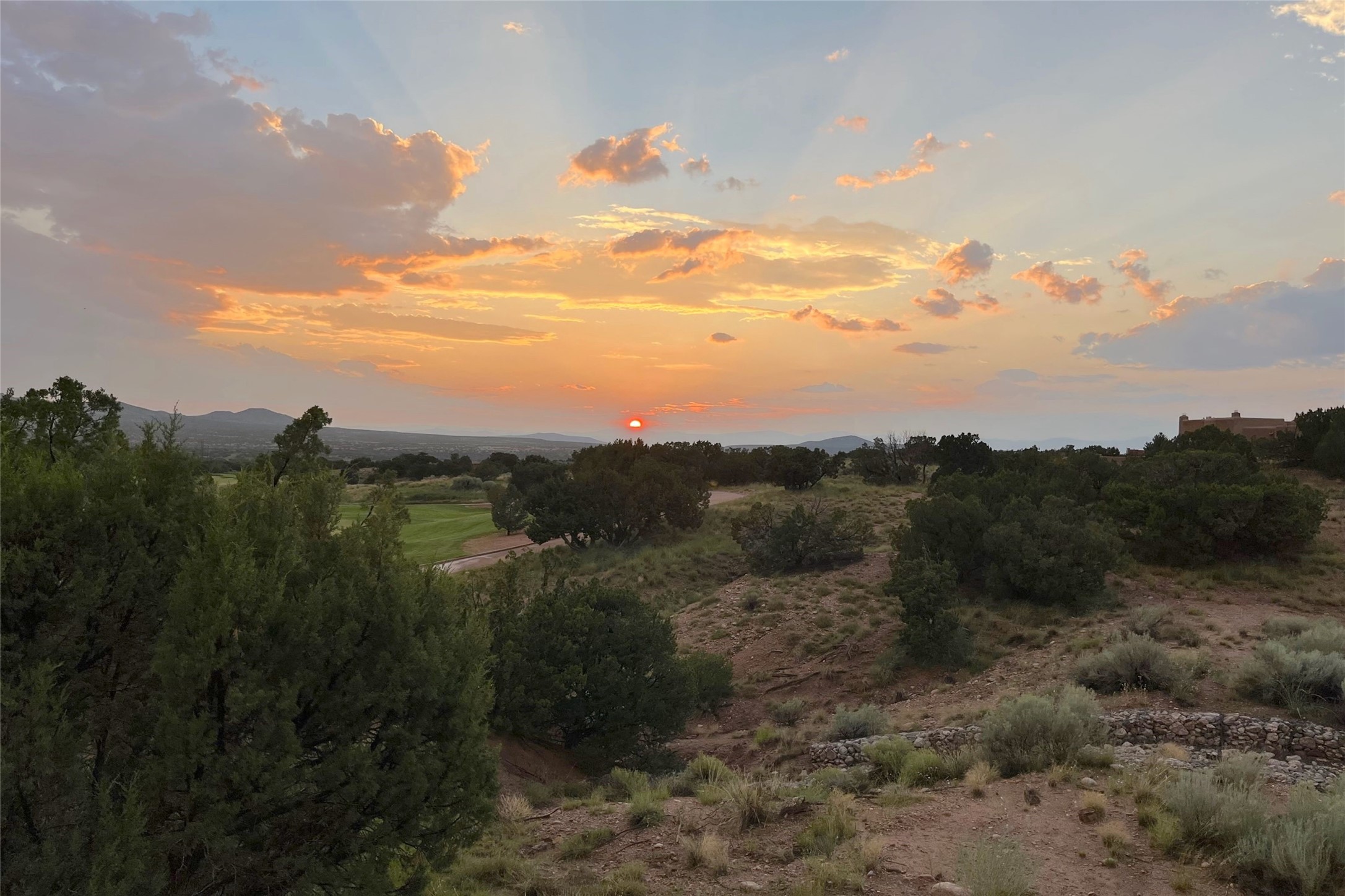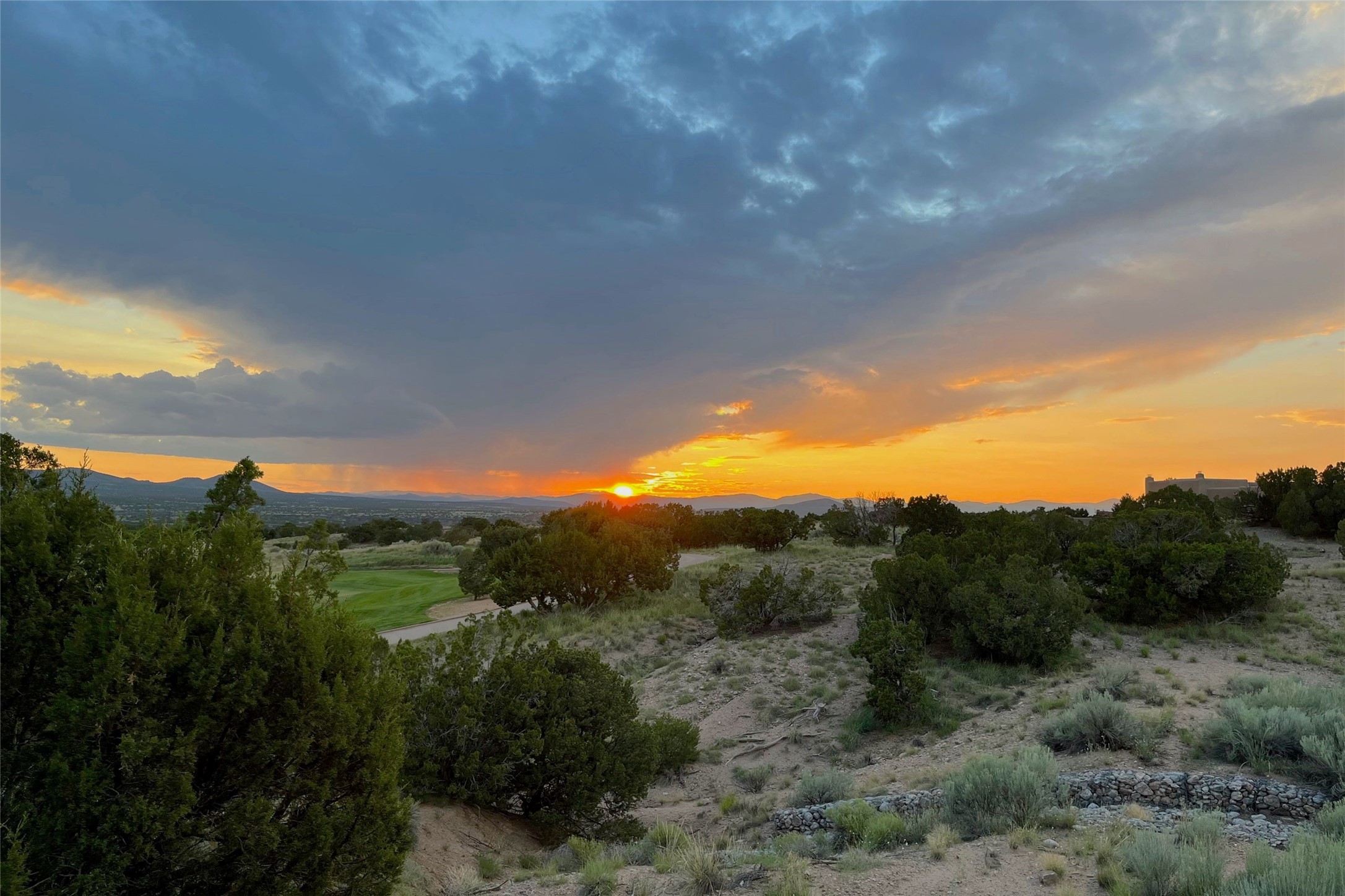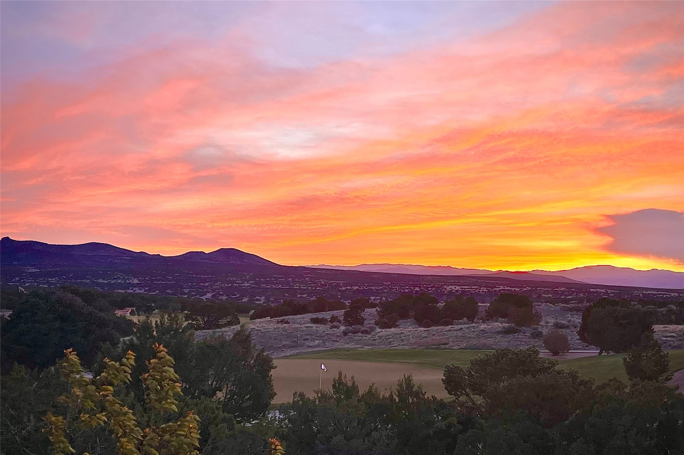 Accepting backup offers. Nestled in the prestigious Las Campanas gated community, this nearly new home offers breathtaking sunset & golf course views. Meticulously upgraded by the discerning owners, this residence boasts superior craftsmanship & thoughtful design. Energy efficient with Anderson 400 series windows & the convenience of an oversized, climate-controlled three car garage (Pre-wired for EV charger). The open concept floor plan flows seamlessly from the gourmet kitchen, featuring undermount lighting, quartz countertops with waterfall edge, Viking appliances, & a walk-in pantry, to the expansive dining & living areas. Imagine cozy evenings by the contemporary gas fireplace with its striking stacked stone wall, surrounded by large sliders leading to multiple outdoor living spaces. Electric Hunter Douglas shades in the living & dining rooms, while a built-in Sonos sound system enhances the ambiance in the living room, primary bedroom, & patio. Retreat to the primary bedroom, a sanctuary of relaxation with its private portal offering million dollar sunset & golf course vistas. The luxurious primary bath features a curbless walk-in shower, soaking tub, dual sinks & walk-in closet. A convenient access door leads from the primary closet to the laundry room, complete with a utility sink, custom cabinetry, and Electrolux washer/dryer. The secondary bedrooms are on a separate wing for enhanced privacy & floating vanities add a touch of modern elegance to the half bath and guest bath. The large third bedroom & guest bath may be closed off for added quietness. Soft-close drawers & cabinets throughout the entire home - custom-built closet systems in all three bedrooms. Security system w/ 6 cameras. Enjoy the outdoors with four distinct living spaces, including one at the front & three at the rear, showcasing direct views of the Jemez Mountains, stunning western sunsets, & golf course. Situated on the largest lot on the street, this home offers unparalleled privacy.