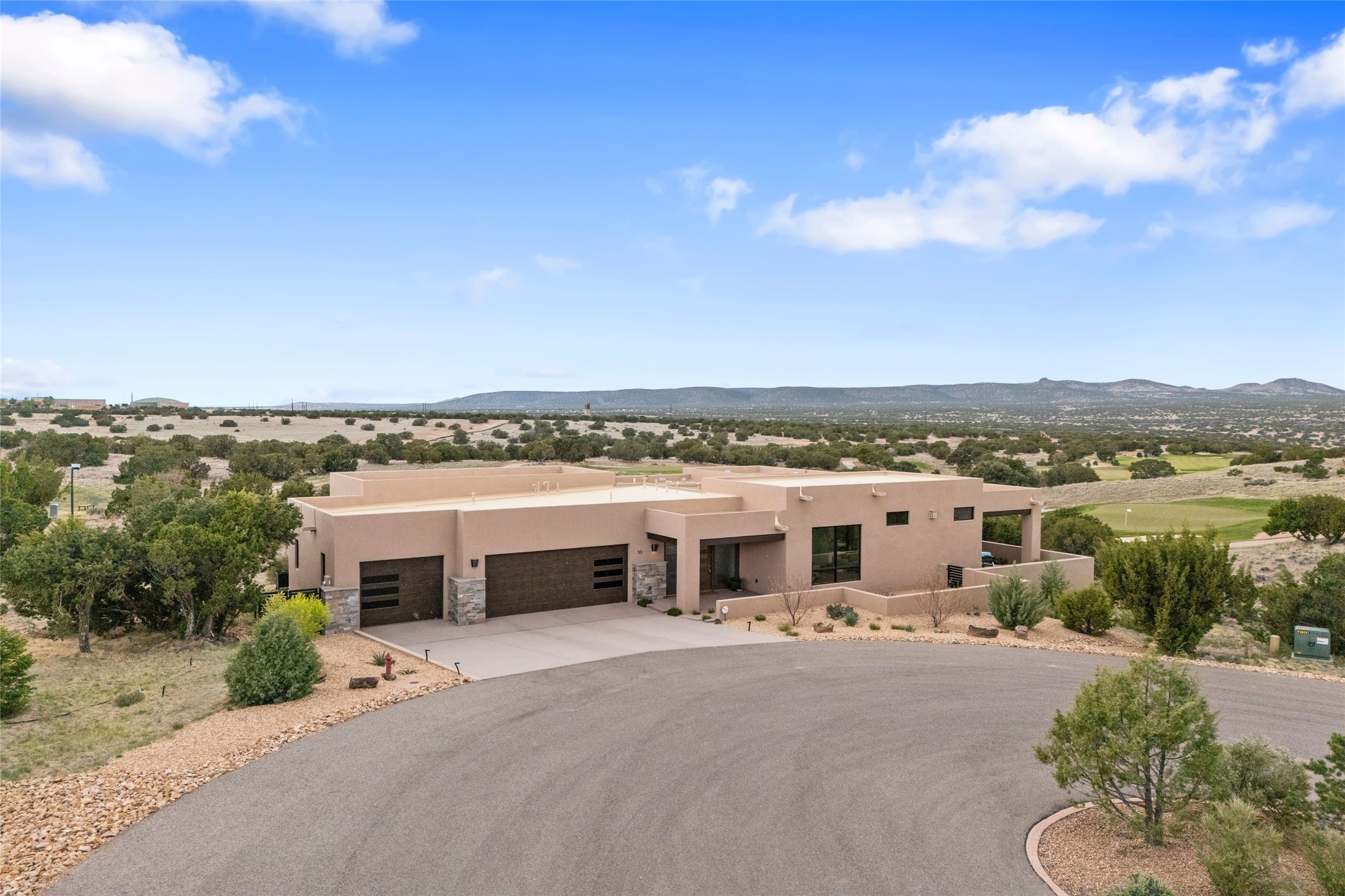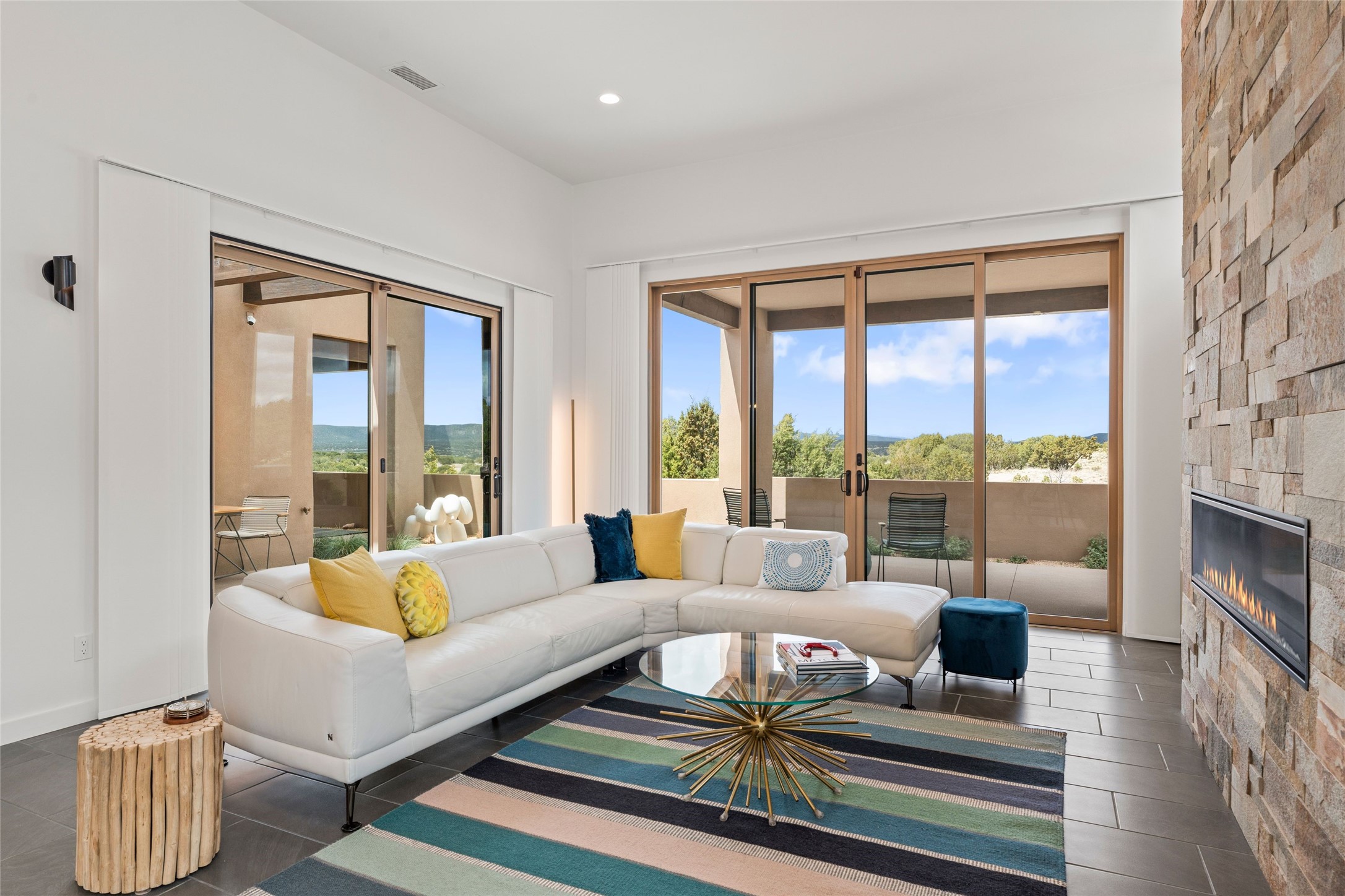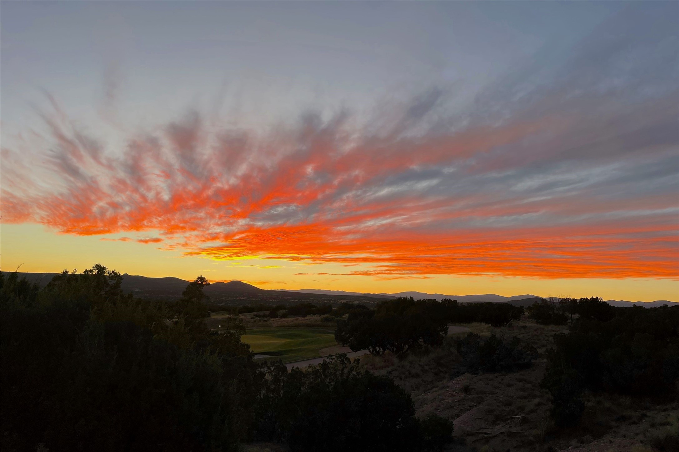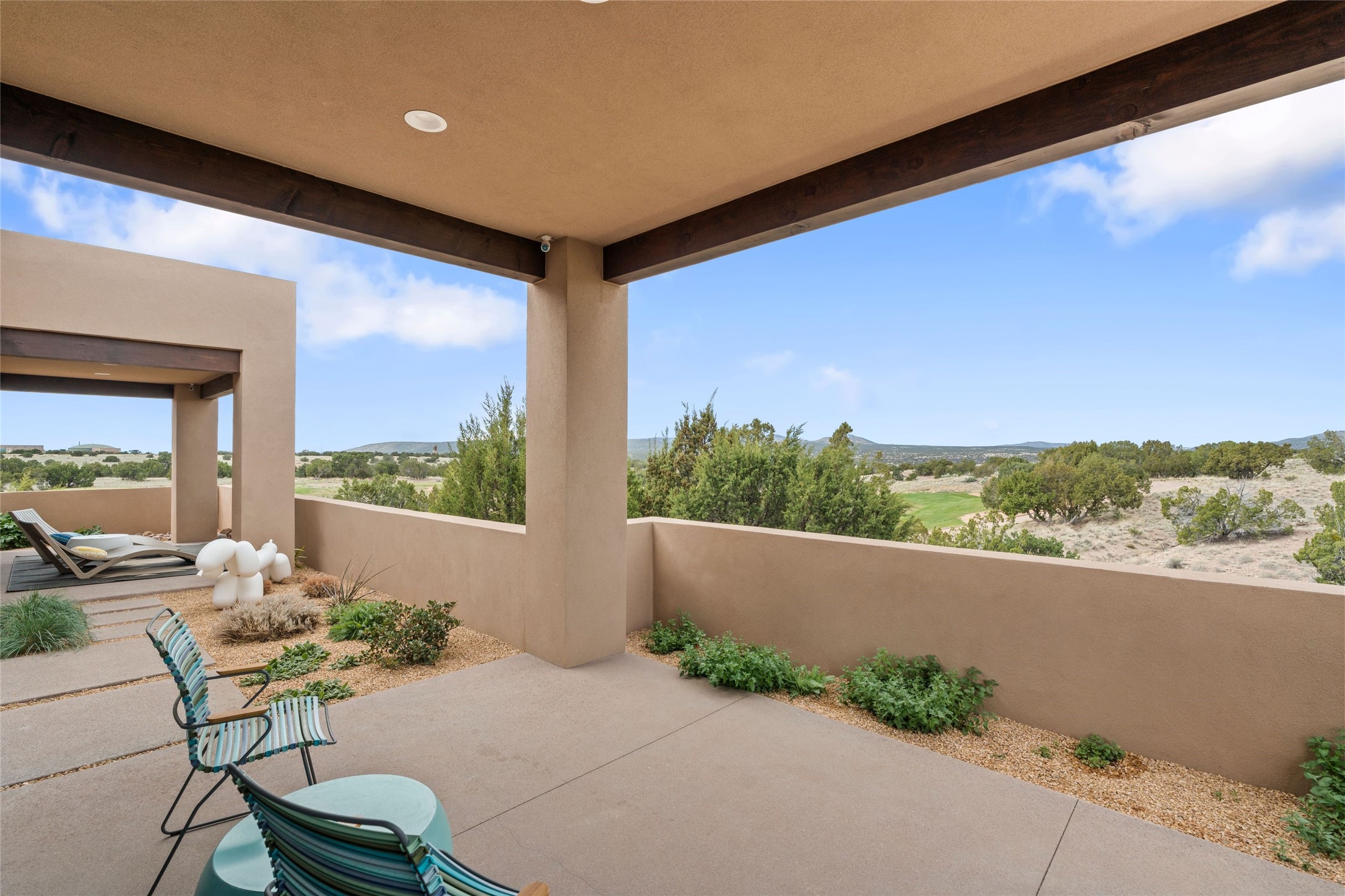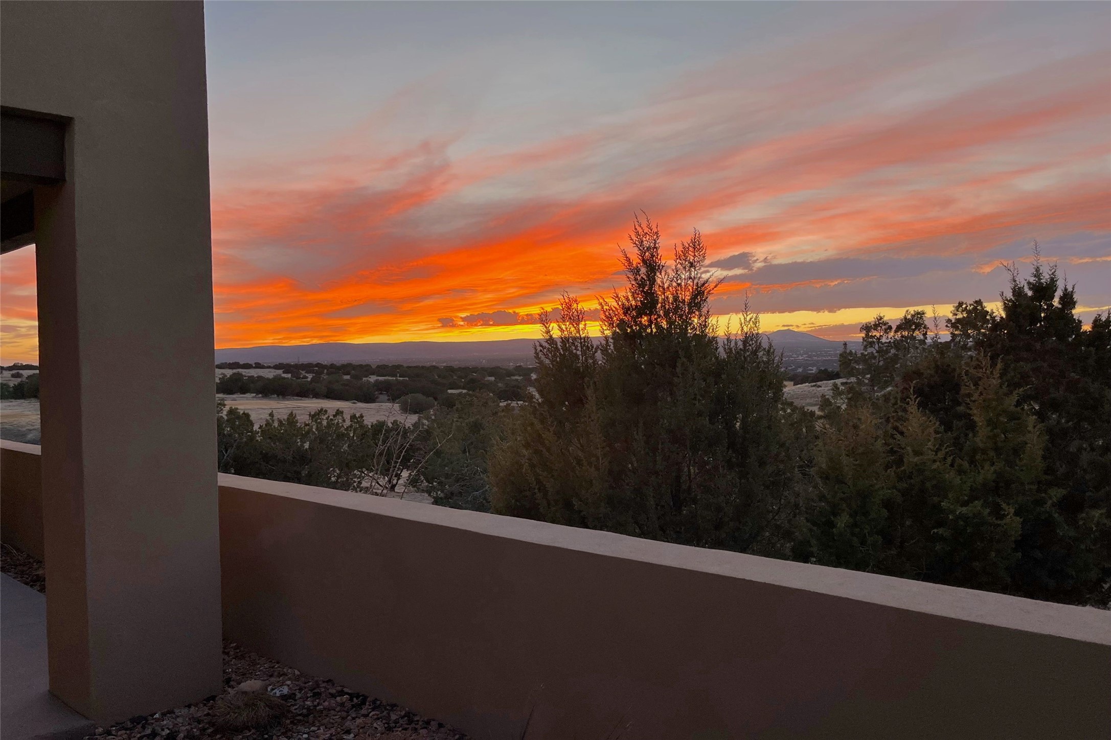 Accepting backup offers. Nestled in the prestigious Las Campanas gated community, this nearly new home offers breathtaking sunset & golf course views. Meticulously upgraded by the discerning owners, this residence boasts superior craftsmanship & thoughtful design. Energy efficient with Anderson 400 series windows & the convenience of an oversized, climate-controlled three car garage (Pre-wired for EV charger). The open concept floor plan flows seamlessly from the gourmet kitchen, featuring undermount lighting, quartz countertops with waterfall edge, Viking appliances, & a walk-in pantry, to the expansive dining & living areas. Imagine cozy evenings by the contemporary gas fireplace with its striking stacked stone wall, surrounded by large sliders leading to multiple outdoor living spaces. Electric Hunter Douglas shades in the living & dining rooms, while a built-in Sonos sound system enhances the ambiance in the living room, primary bedroom, & patio. Retreat to the primary bedroom, a sanctuary of relaxation with its private portal offering million dollar sunset & golf course vistas. The luxurious primary bath features a curbless walk-in shower, soaking tub, dual sinks & walk-in closet. A convenient access door leads from the primary closet to the laundry room, complete with a utility sink, custom cabinetry, and Electrolux washer/dryer. The secondary bedrooms are on a separate wing for enhanced privacy & floating vanities add a touch of modern elegance to the half bath and guest bath. The large third bedroom & guest bath may be closed off for added quietness. Soft-close drawers & cabinets throughout the entire home - custom-built closet systems in all three bedrooms. Security system w/ 6 cameras. Enjoy the outdoors with four distinct living spaces, including one at the front & three at the rear, showcasing direct views of the Jemez Mountains, stunning western sunsets, & golf course. Situated on the largest lot on the street, this home offers unparalleled privacy.