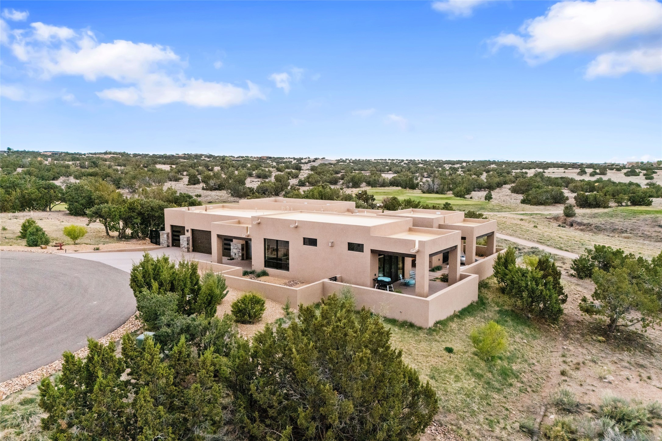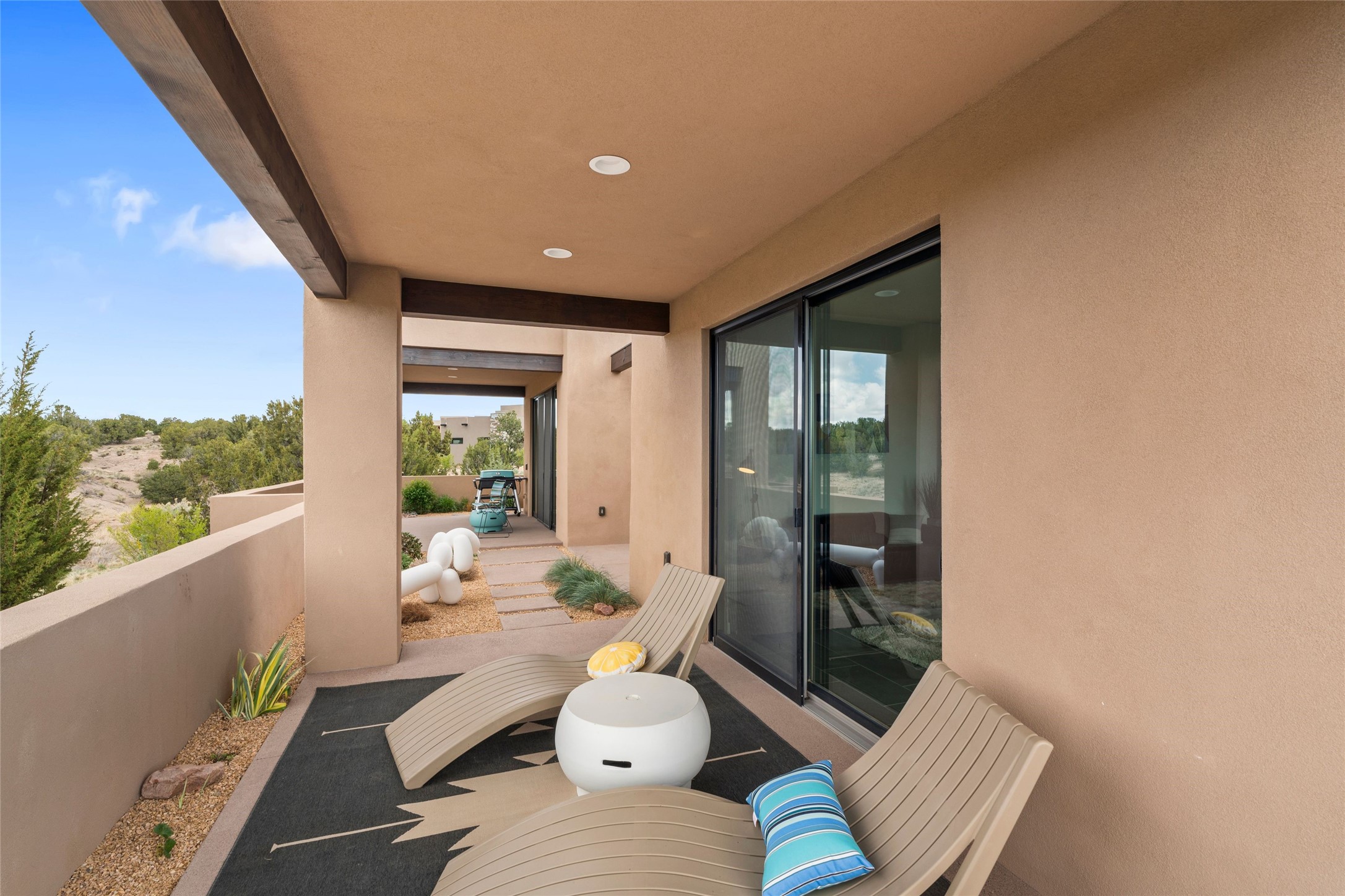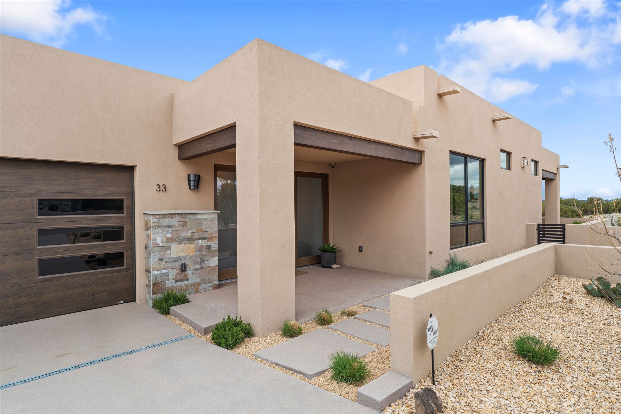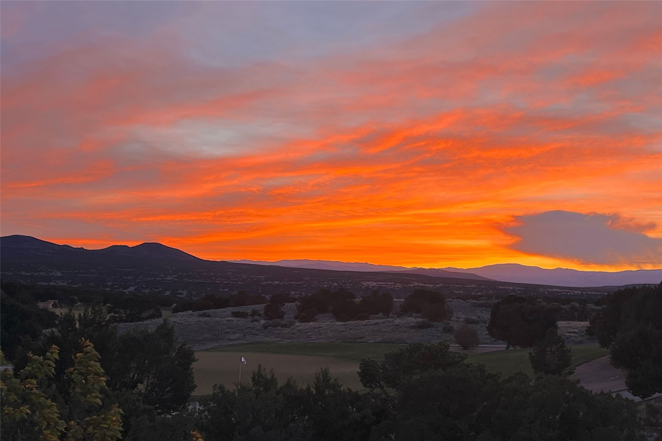 Accepting backup offers. Nestled in the prestigious Las Campanas gated community, this nearly new home offers breathtaking sunset & golf course views. Meticulously upgraded by the discerning owners, this residence boasts superior craftsmanship & thoughtful design. Energy efficient with Anderson 400 series windows & the convenience of an oversized, climate-controlled three car garage (Pre-wired for EV charger). The open concept floor plan flows seamlessly from the gourmet kitchen, featuring undermount lighting, quartz countertops with waterfall edge, Viking appliances, & a walk-in pantry, to the expansive dining & living areas. Imagine cozy evenings by the contemporary gas fireplace with its striking stacked stone wall, surrounded by large sliders leading to multiple outdoor living spaces. Electric Hunter Douglas shades in the living & dining rooms, while a built-in Sonos sound system enhances the ambiance in the living room, primary bedroom, & patio. Retreat to the primary bedroom, a sanctuary of relaxation with its private portal offering million dollar sunset & golf course vistas. The luxurious primary bath features a curbless walk-in shower, soaking tub, dual sinks & walk-in closet. A convenient access door leads from the primary closet to the laundry room, complete with a utility sink, custom cabinetry, and Electrolux washer/dryer. The secondary bedrooms are on a separate wing for enhanced privacy & floating vanities add a touch of modern elegance to the half bath and guest bath. The large third bedroom & guest bath may be closed off for added quietness. Soft-close drawers & cabinets throughout the entire home - custom-built closet systems in all three bedrooms. Security system w/ 6 cameras. Enjoy the outdoors with four distinct living spaces, including one at the front & three at the rear, showcasing direct views of the Jemez Mountains, stunning western sunsets, & golf course. Situated on the largest lot on the street, this home offers unparalleled privacy.