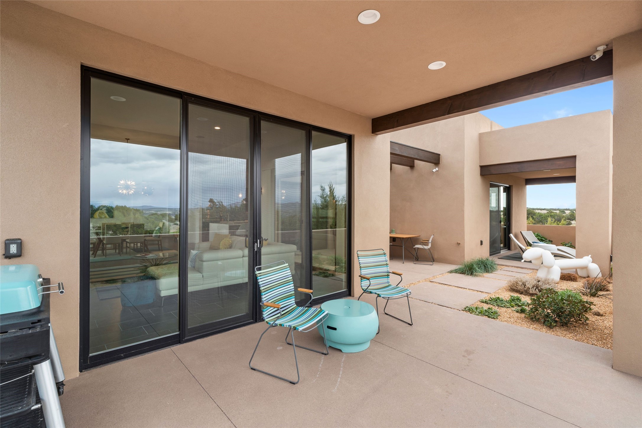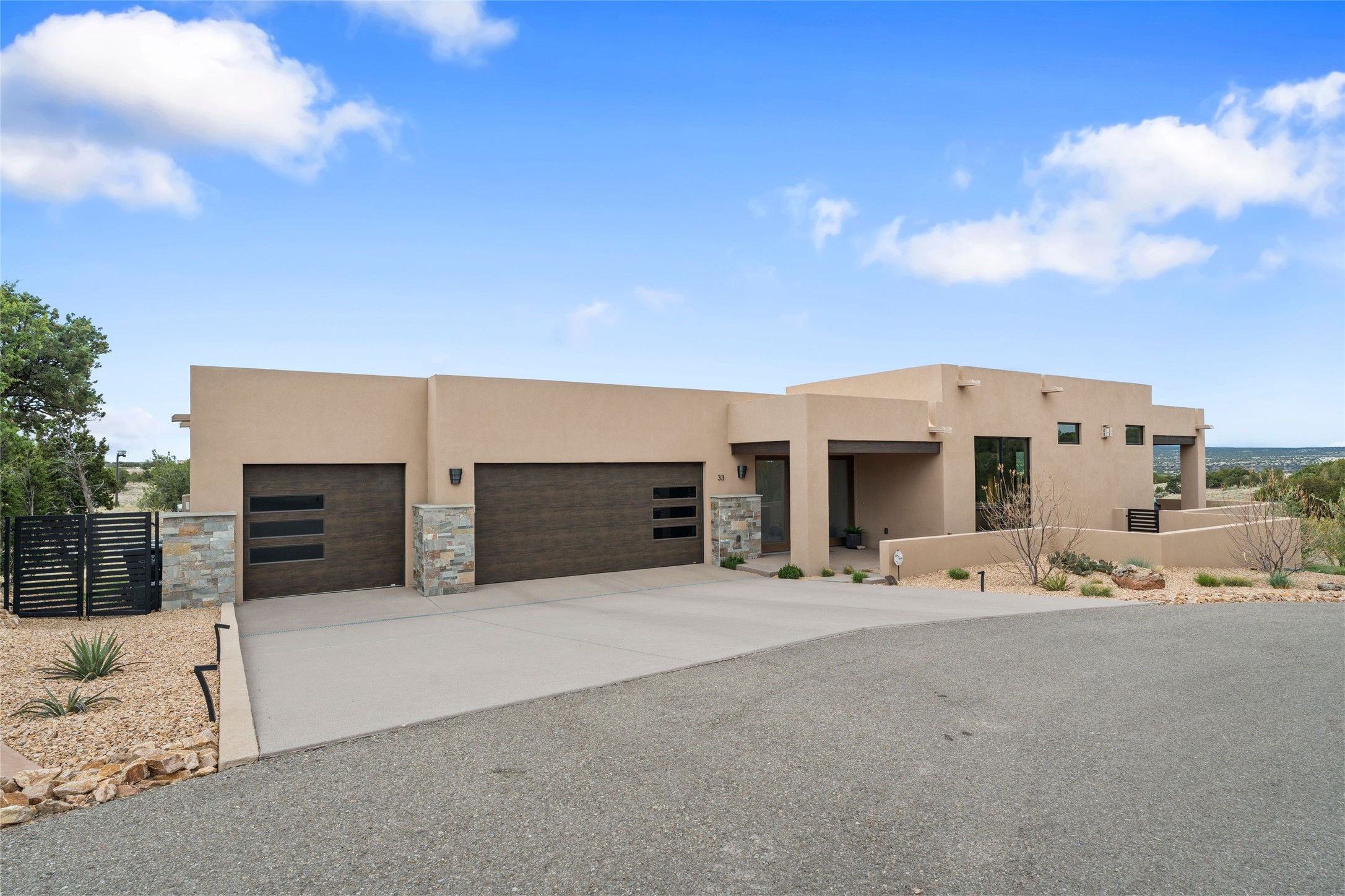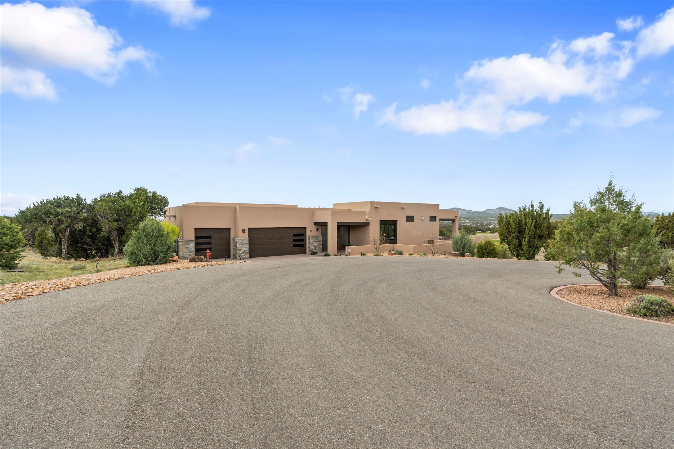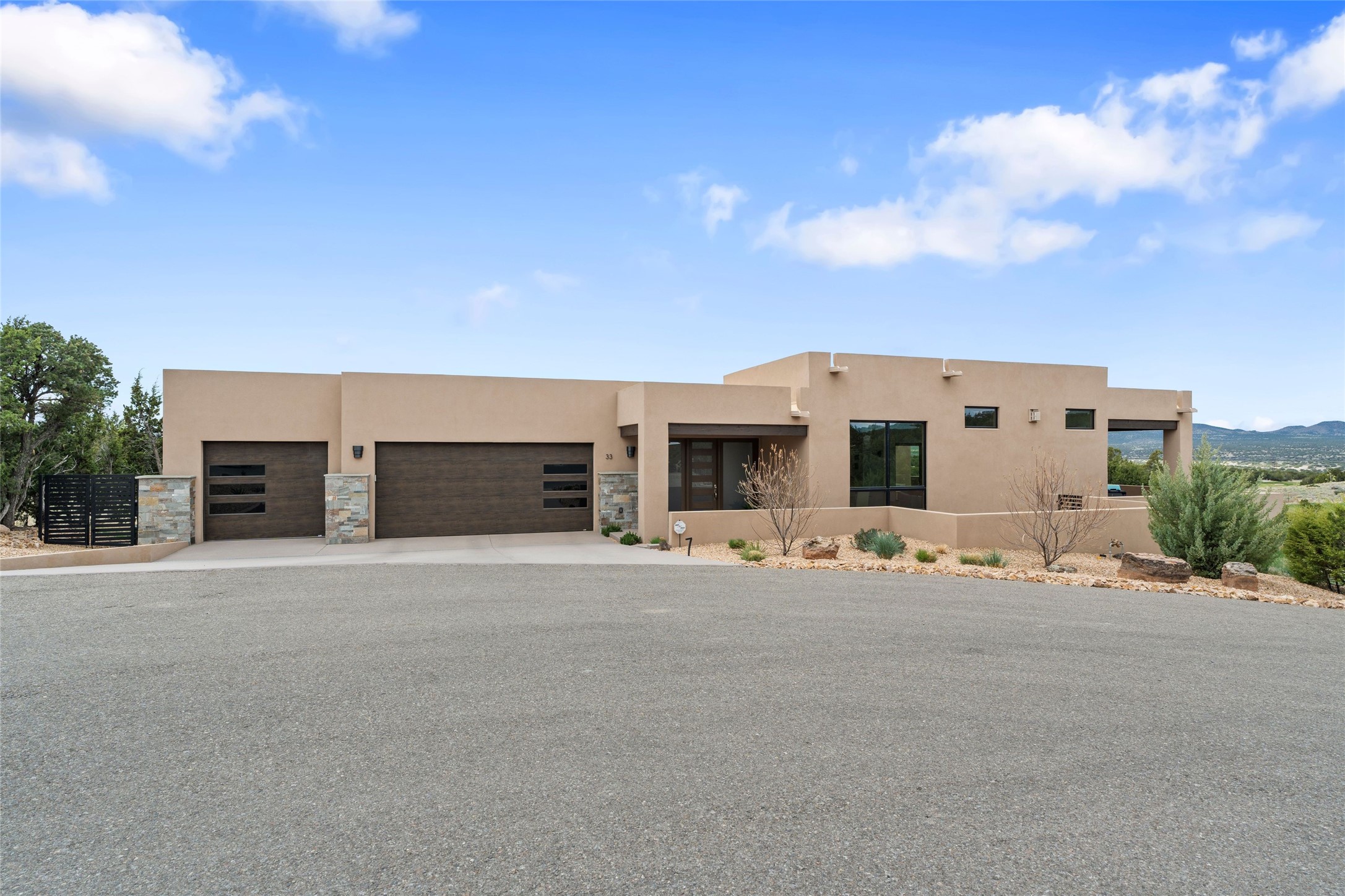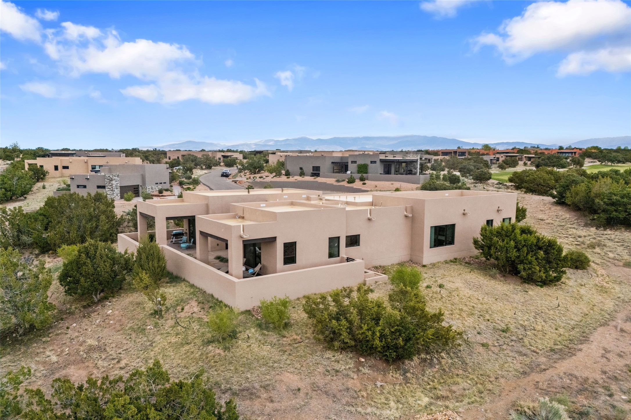 Accepting backup offers. Nestled in the prestigious Las Campanas gated community, this nearly new home offers breathtaking sunset & golf course views. Meticulously upgraded by the discerning owners, this residence boasts superior craftsmanship & thoughtful design. Energy efficient with Anderson 400 series windows & the convenience of an oversized, climate-controlled three car garage (Pre-wired for EV charger). The open concept floor plan flows seamlessly from the gourmet kitchen, featuring undermount lighting, quartz countertops with waterfall edge, Viking appliances, & a walk-in pantry, to the expansive dining & living areas. Imagine cozy evenings by the contemporary gas fireplace with its striking stacked stone wall, surrounded by large sliders leading to multiple outdoor living spaces. Electric Hunter Douglas shades in the living & dining rooms, while a built-in Sonos sound system enhances the ambiance in the living room, primary bedroom, & patio. Retreat to the primary bedroom, a sanctuary of relaxation with its private portal offering million dollar sunset & golf course vistas. The luxurious primary bath features a curbless walk-in shower, soaking tub, dual sinks & walk-in closet. A convenient access door leads from the primary closet to the laundry room, complete with a utility sink, custom cabinetry, and Electrolux washer/dryer. The secondary bedrooms are on a separate wing for enhanced privacy & floating vanities add a touch of modern elegance to the half bath and guest bath. The large third bedroom & guest bath may be closed off for added quietness. Soft-close drawers & cabinets throughout the entire home - custom-built closet systems in all three bedrooms. Security system w/ 6 cameras. Enjoy the outdoors with four distinct living spaces, including one at the front & three at the rear, showcasing direct views of the Jemez Mountains, stunning western sunsets, & golf course. Situated on the largest lot on the street, this home offers unparalleled privacy.