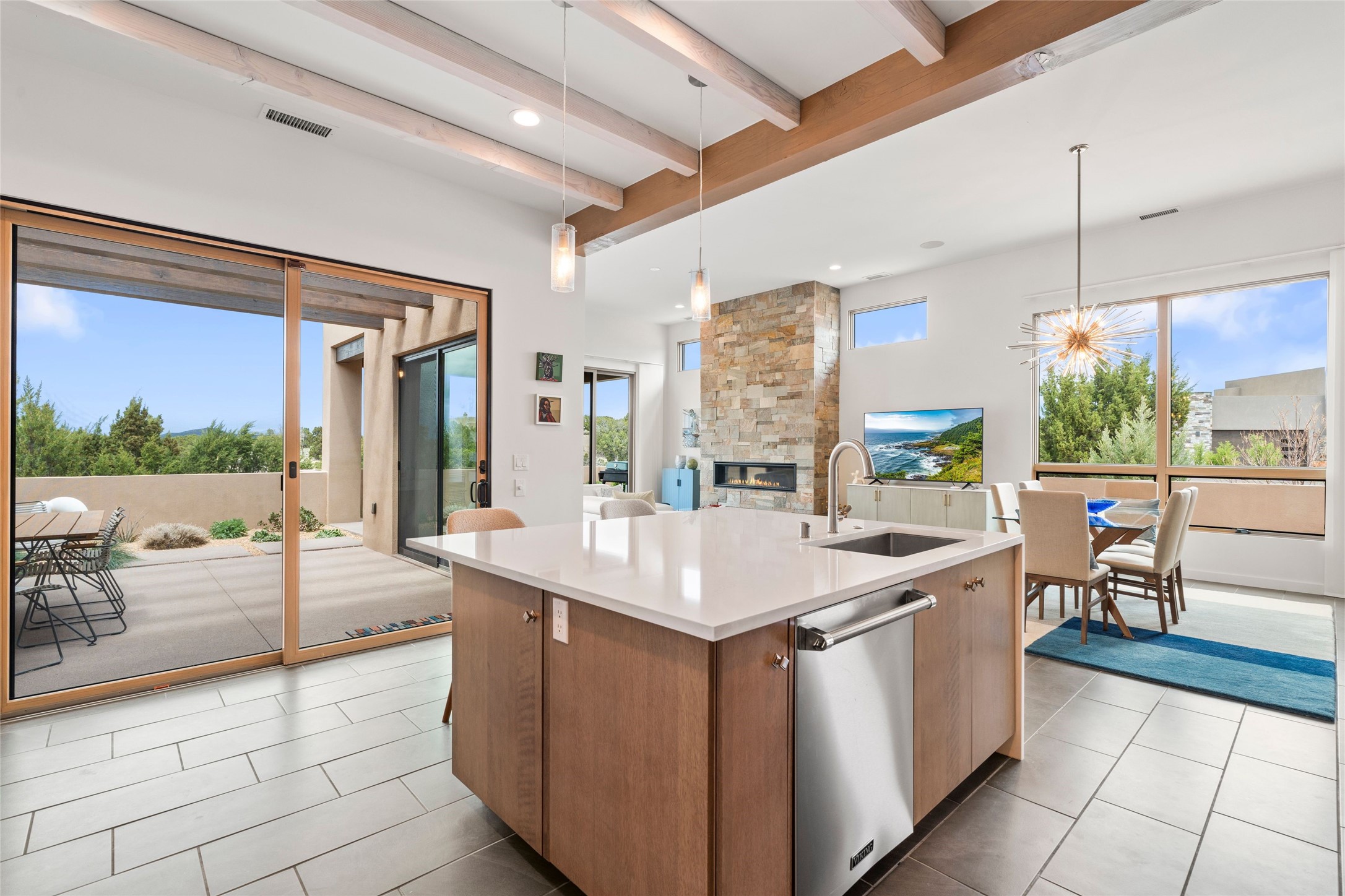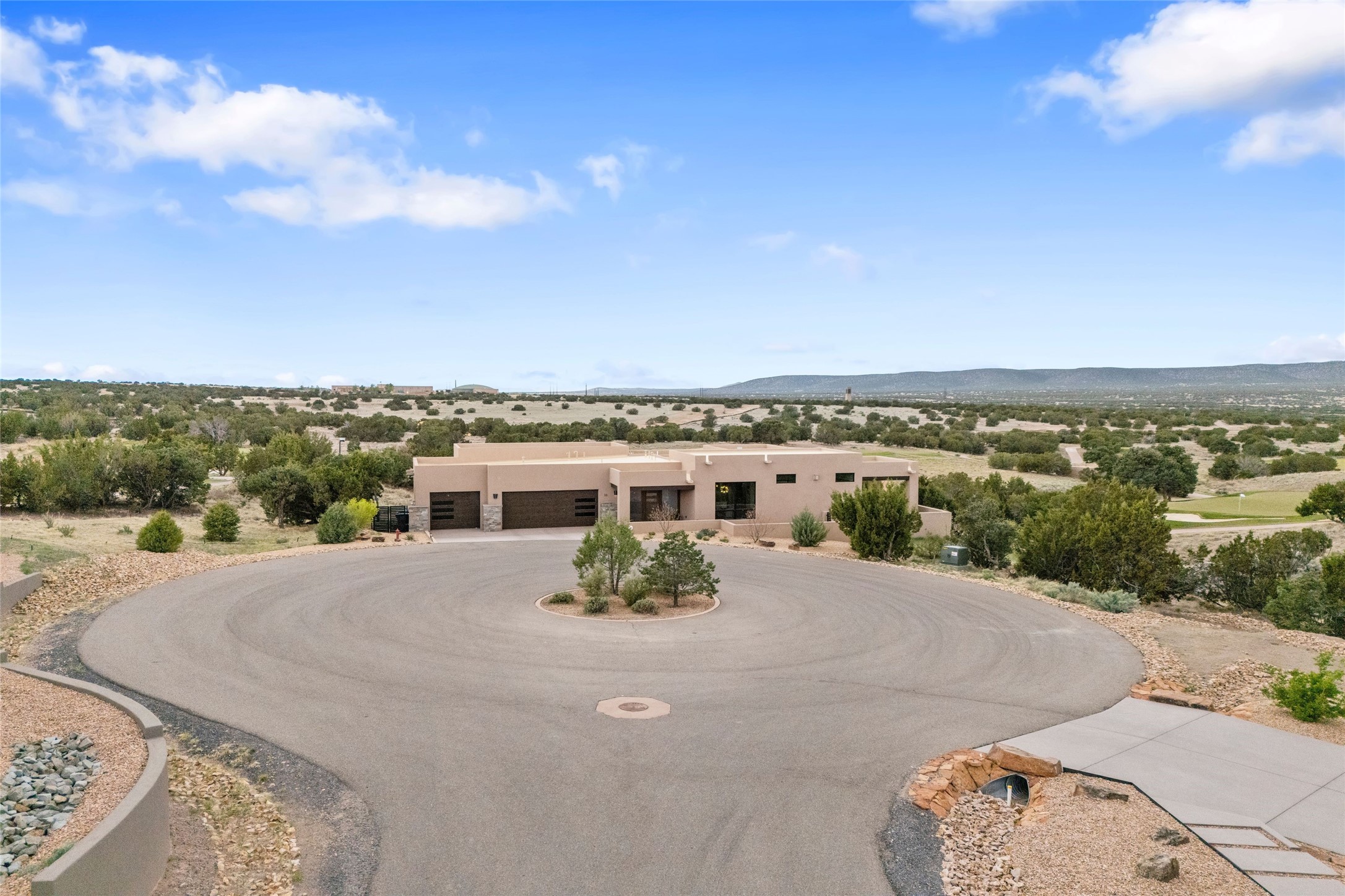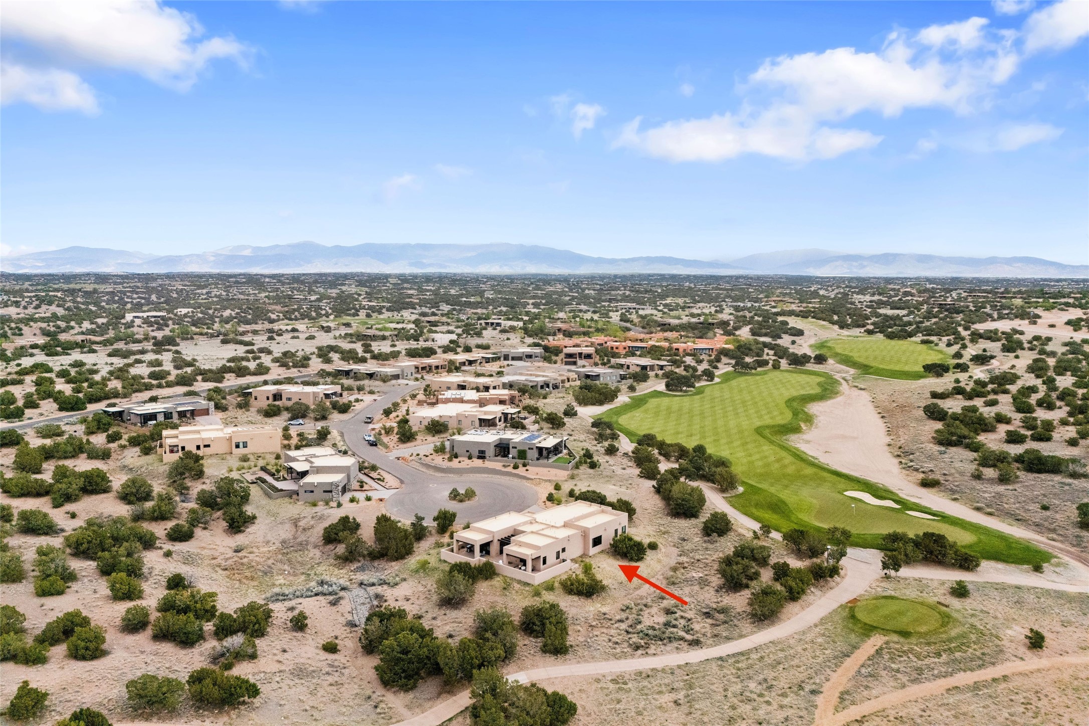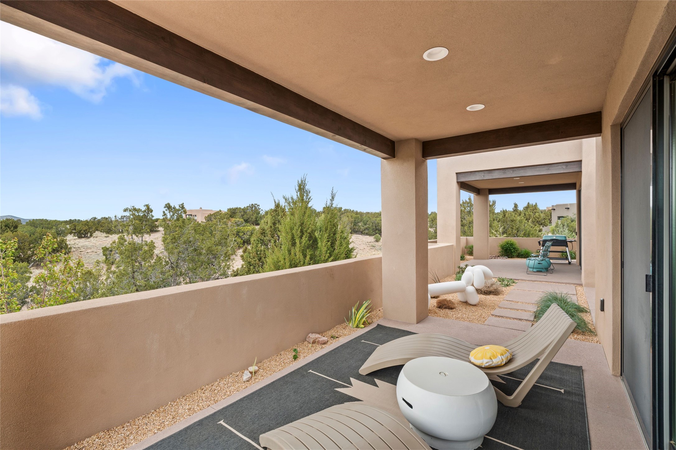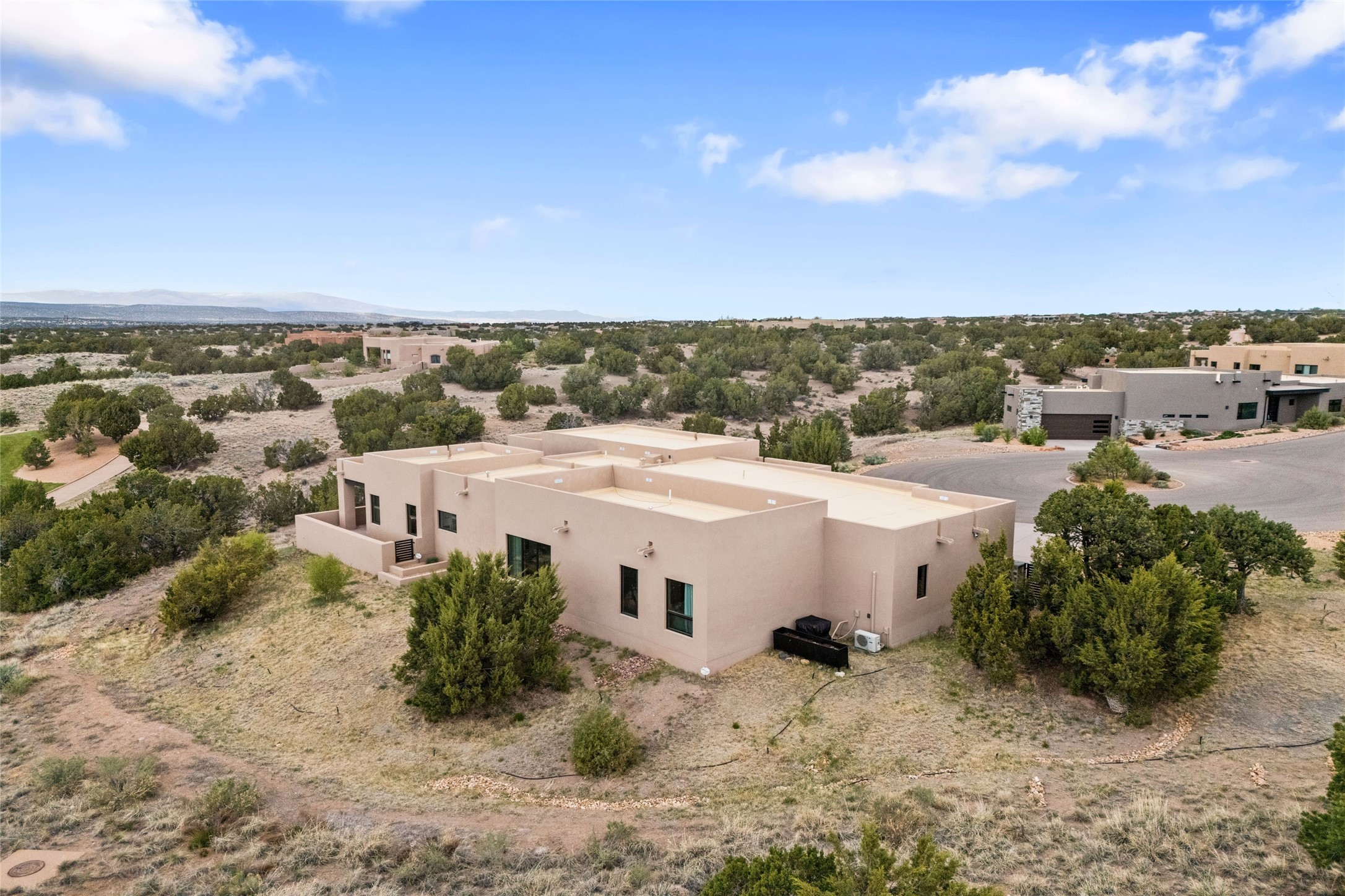 Accepting backup offers. Nestled in the prestigious Las Campanas gated community, this nearly new home offers breathtaking sunset & golf course views. Meticulously upgraded by the discerning owners, this residence boasts superior craftsmanship & thoughtful design. Energy efficient with Anderson 400 series windows & the convenience of an oversized, climate-controlled three car garage (Pre-wired for EV charger). The open concept floor plan flows seamlessly from the gourmet kitchen, featuring undermount lighting, quartz countertops with waterfall edge, Viking appliances, & a walk-in pantry, to the expansive dining & living areas. Imagine cozy evenings by the contemporary gas fireplace with its striking stacked stone wall, surrounded by large sliders leading to multiple outdoor living spaces. Electric Hunter Douglas shades in the living & dining rooms, while a built-in Sonos sound system enhances the ambiance in the living room, primary bedroom, & patio. Retreat to the primary bedroom, a sanctuary of relaxation with its private portal offering million dollar sunset & golf course vistas. The luxurious primary bath features a curbless walk-in shower, soaking tub, dual sinks & walk-in closet. A convenient access door leads from the primary closet to the laundry room, complete with a utility sink, custom cabinetry, and Electrolux washer/dryer. The secondary bedrooms are on a separate wing for enhanced privacy & floating vanities add a touch of modern elegance to the half bath and guest bath. The large third bedroom & guest bath may be closed off for added quietness. Soft-close drawers & cabinets throughout the entire home - custom-built closet systems in all three bedrooms. Security system w/ 6 cameras. Enjoy the outdoors with four distinct living spaces, including one at the front & three at the rear, showcasing direct views of the Jemez Mountains, stunning western sunsets, & golf course. Situated on the largest lot on the street, this home offers unparalleled privacy.