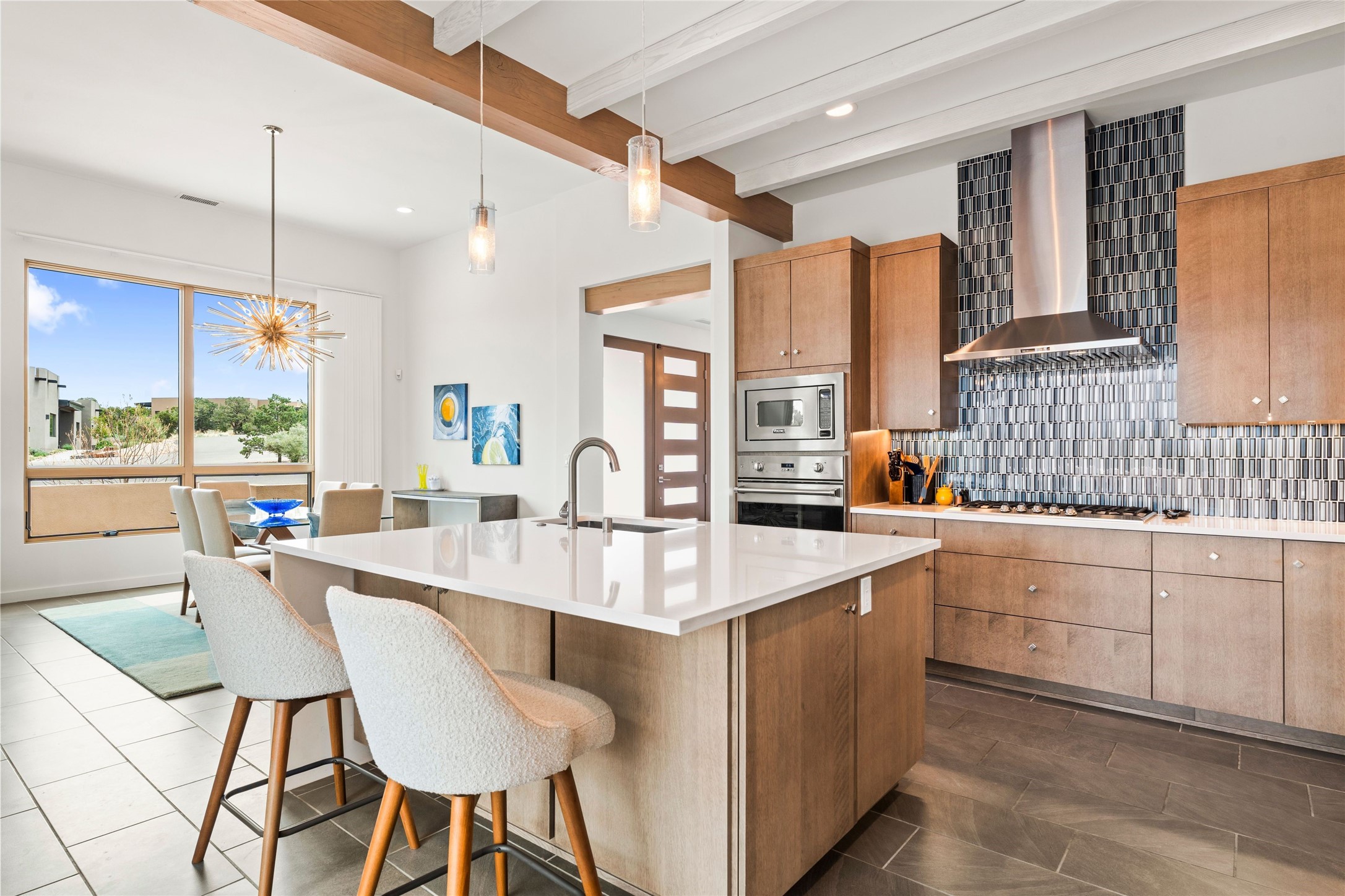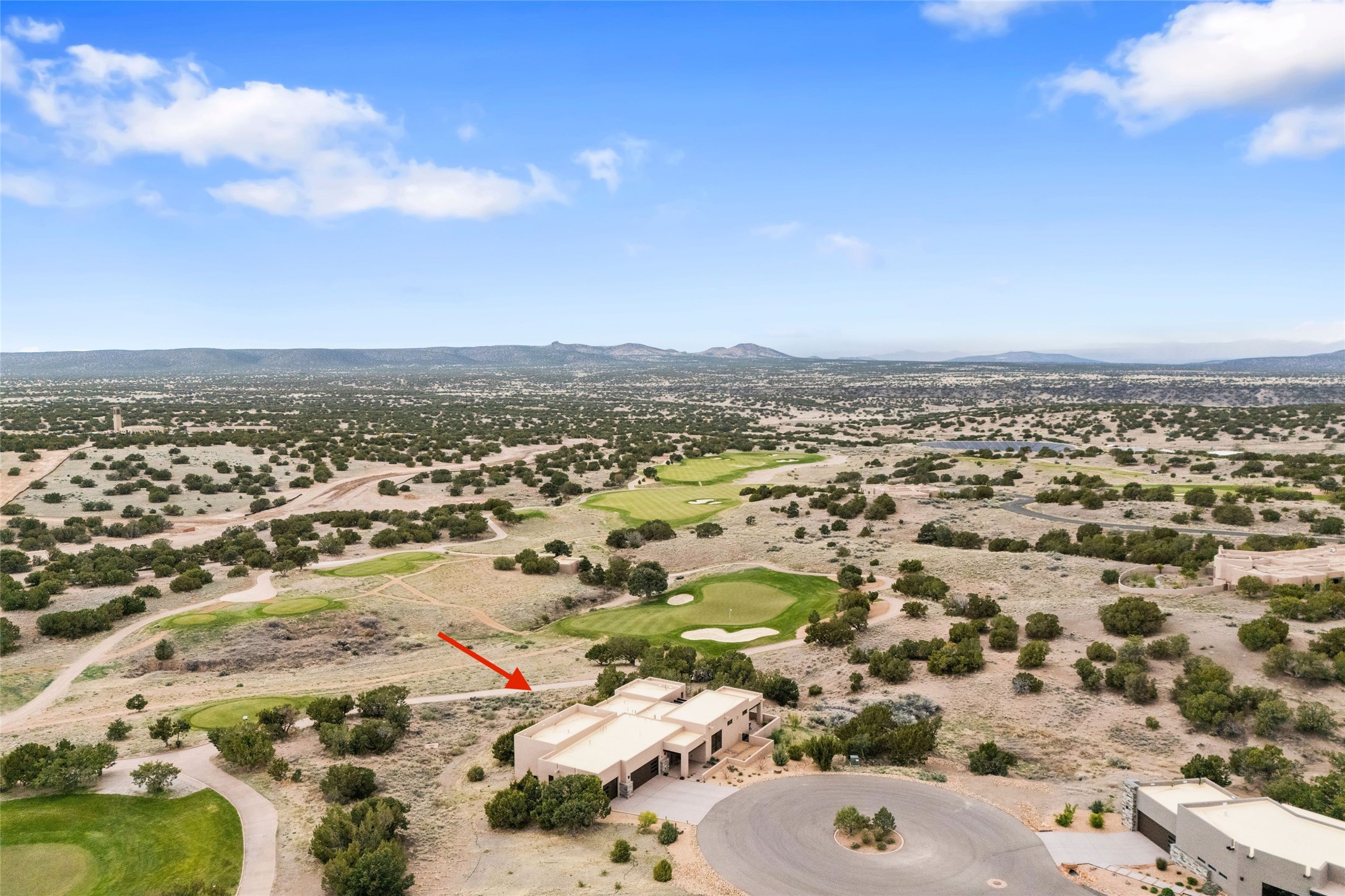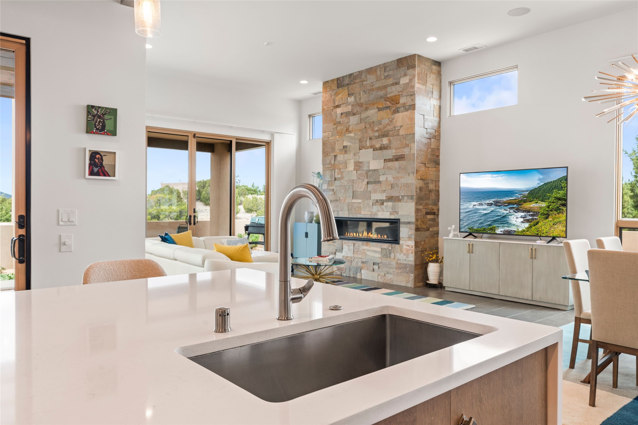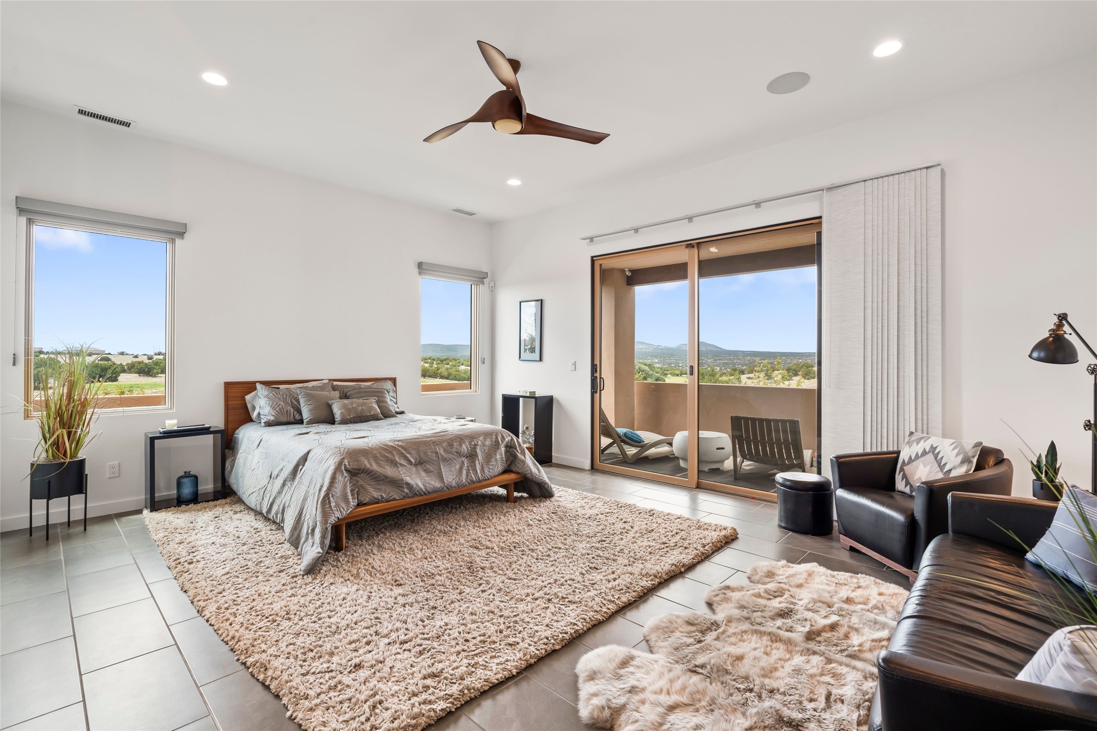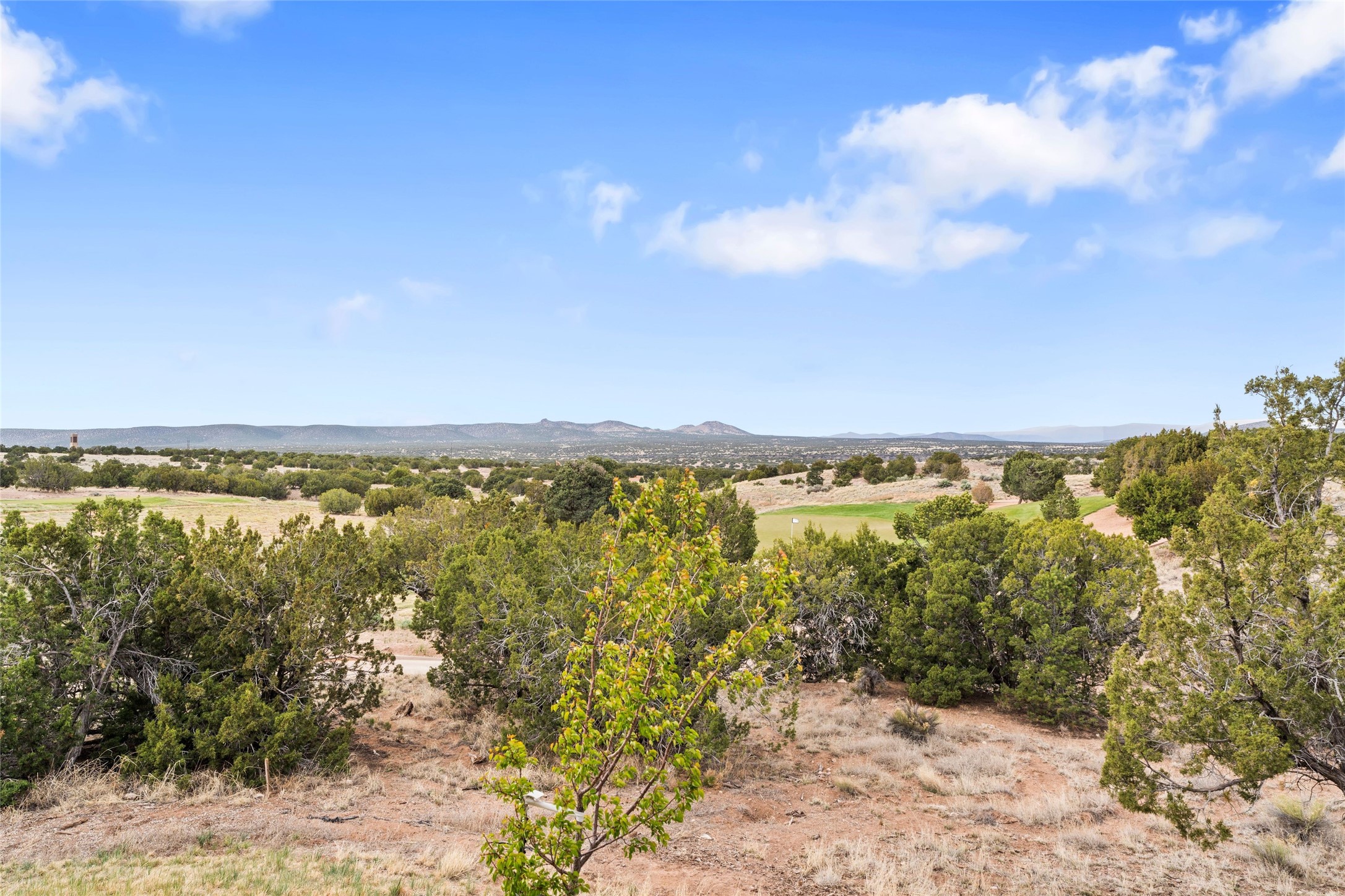 Accepting backup offers. Nestled in the prestigious Las Campanas gated community, this nearly new home offers breathtaking sunset & golf course views. Meticulously upgraded by the discerning owners, this residence boasts superior craftsmanship & thoughtful design. Energy efficient with Anderson 400 series windows & the convenience of an oversized, climate-controlled three car garage (Pre-wired for EV charger). The open concept floor plan flows seamlessly from the gourmet kitchen, featuring undermount lighting, quartz countertops with waterfall edge, Viking appliances, & a walk-in pantry, to the expansive dining & living areas. Imagine cozy evenings by the contemporary gas fireplace with its striking stacked stone wall, surrounded by large sliders leading to multiple outdoor living spaces. Electric Hunter Douglas shades in the living & dining rooms, while a built-in Sonos sound system enhances the ambiance in the living room, primary bedroom, & patio. Retreat to the primary bedroom, a sanctuary of relaxation with its private portal offering million dollar sunset & golf course vistas. The luxurious primary bath features a curbless walk-in shower, soaking tub, dual sinks & walk-in closet. A convenient access door leads from the primary closet to the laundry room, complete with a utility sink, custom cabinetry, and Electrolux washer/dryer. The secondary bedrooms are on a separate wing for enhanced privacy & floating vanities add a touch of modern elegance to the half bath and guest bath. The large third bedroom & guest bath may be closed off for added quietness. Soft-close drawers & cabinets throughout the entire home - custom-built closet systems in all three bedrooms. Security system w/ 6 cameras. Enjoy the outdoors with four distinct living spaces, including one at the front & three at the rear, showcasing direct views of the Jemez Mountains, stunning western sunsets, & golf course. Situated on the largest lot on the street, this home offers unparalleled privacy.