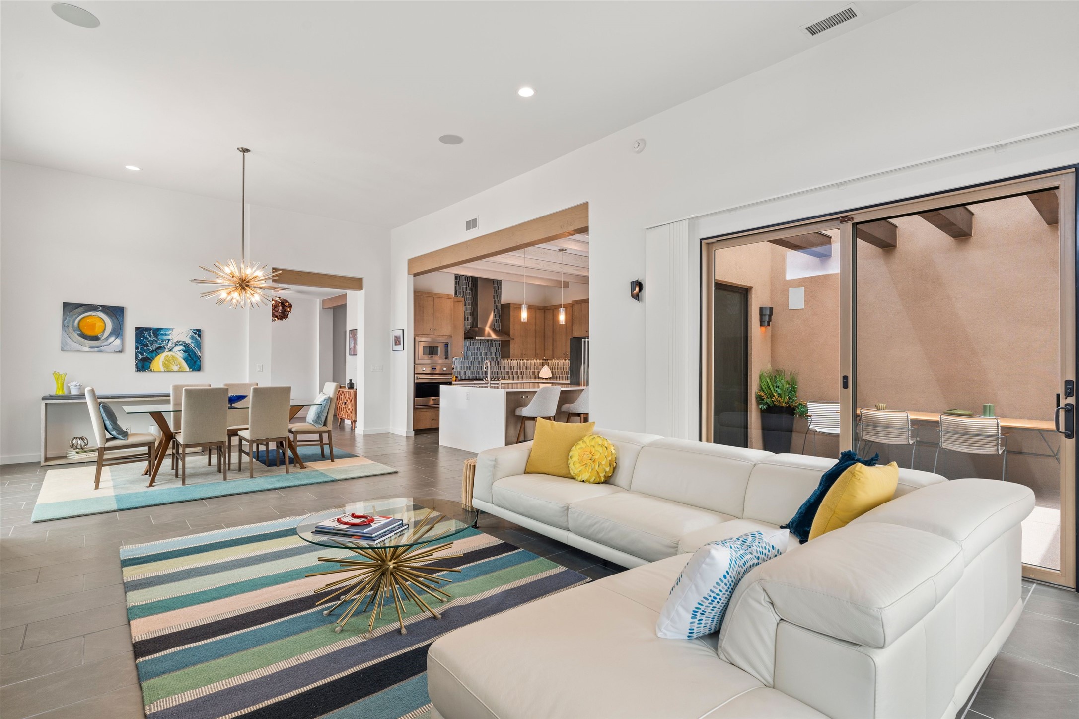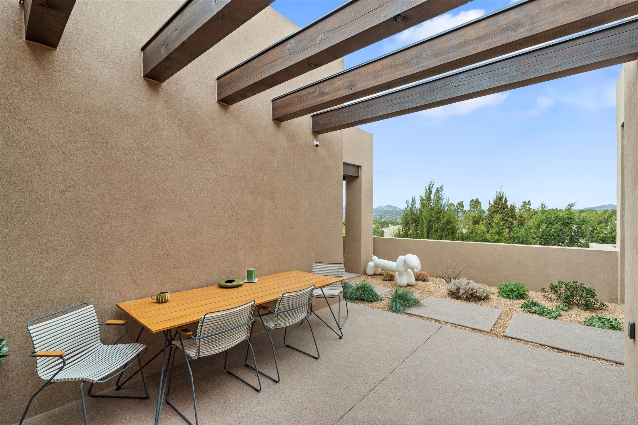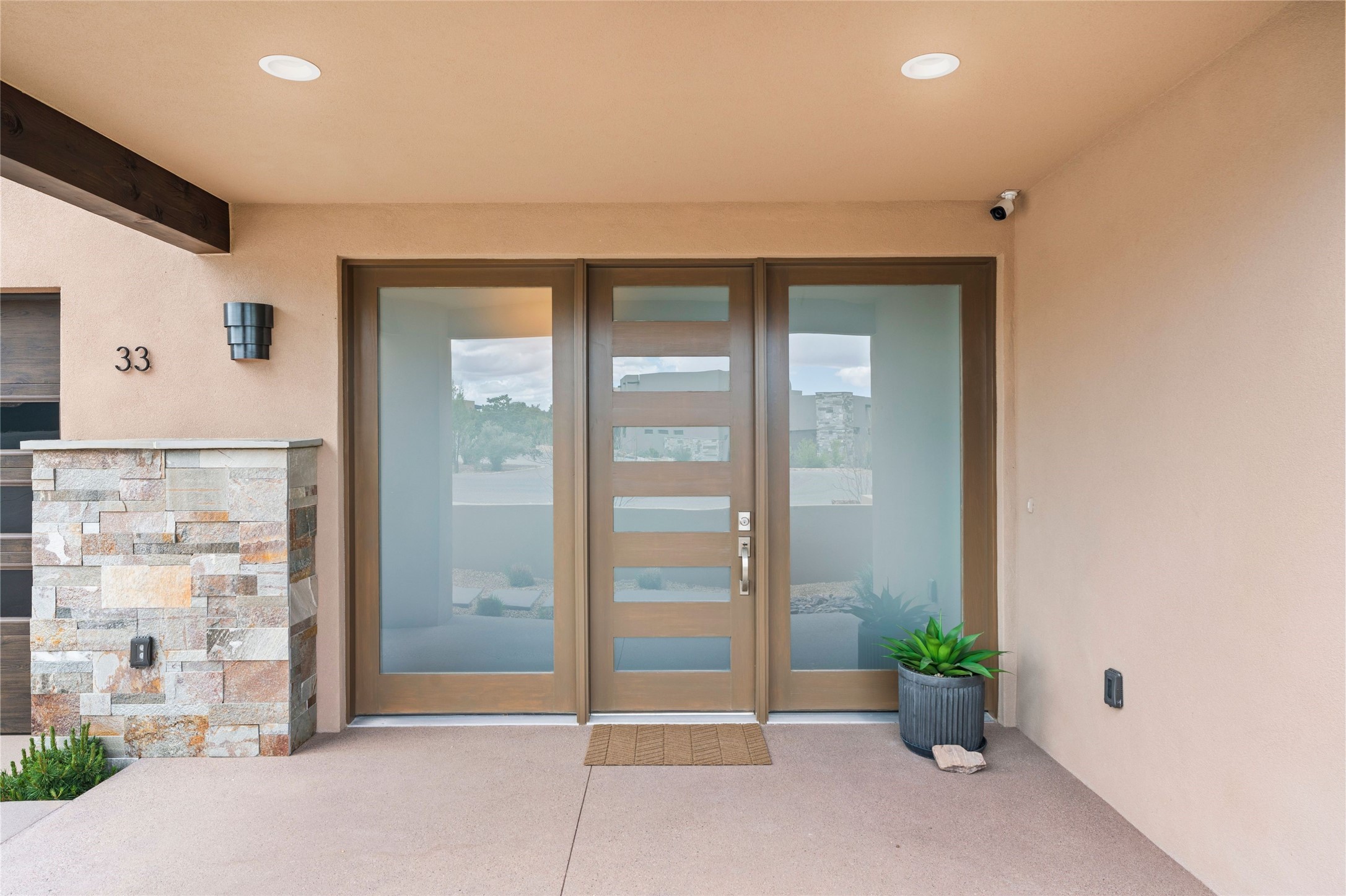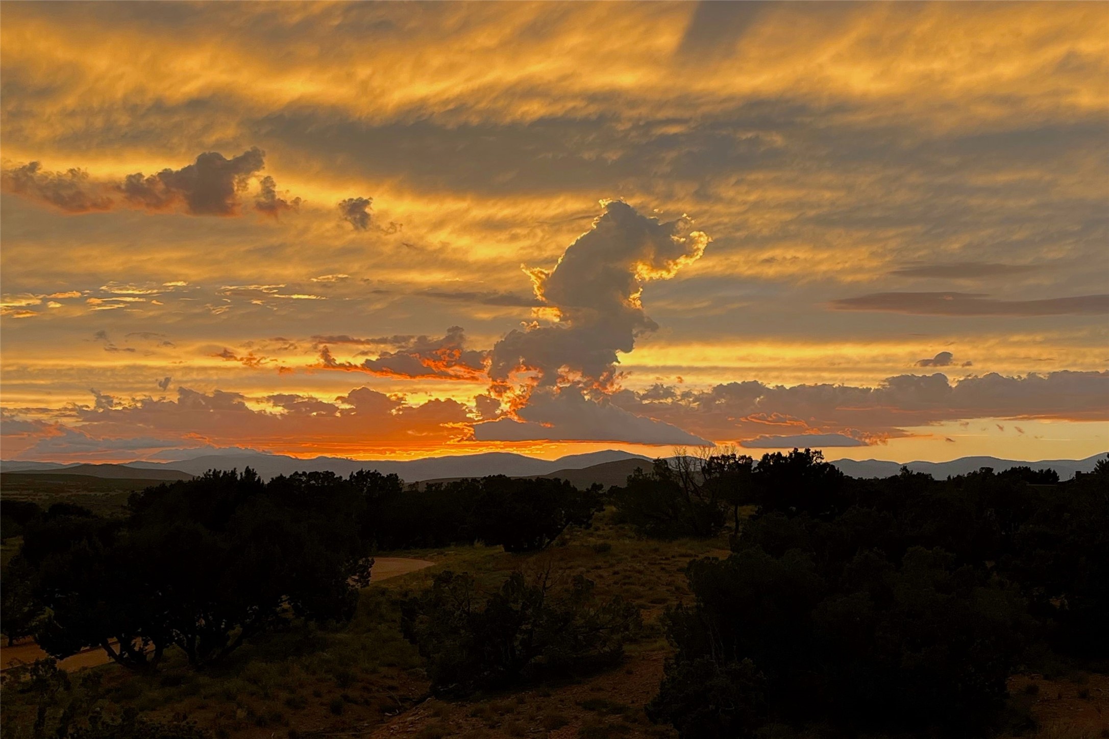 Accepting backup offers. Nestled in the prestigious Las Campanas gated community, this nearly new home offers breathtaking sunset & golf course views. Meticulously upgraded by the discerning owners, this residence boasts superior craftsmanship & thoughtful design. Energy efficient with Anderson 400 series windows & the convenience of an oversized, climate-controlled three car garage (Pre-wired for EV charger). The open concept floor plan flows seamlessly from the gourmet kitchen, featuring undermount lighting, quartz countertops with waterfall edge, Viking appliances, & a walk-in pantry, to the expansive dining & living areas. Imagine cozy evenings by the contemporary gas fireplace with its striking stacked stone wall, surrounded by large sliders leading to multiple outdoor living spaces. Electric Hunter Douglas shades in the living & dining rooms, while a built-in Sonos sound system enhances the ambiance in the living room, primary bedroom, & patio. Retreat to the primary bedroom, a sanctuary of relaxation with its private portal offering million dollar sunset & golf course vistas. The luxurious primary bath features a curbless walk-in shower, soaking tub, dual sinks & walk-in closet. A convenient access door leads from the primary closet to the laundry room, complete with a utility sink, custom cabinetry, and Electrolux washer/dryer. The secondary bedrooms are on a separate wing for enhanced privacy & floating vanities add a touch of modern elegance to the half bath and guest bath. The large third bedroom & guest bath may be closed off for added quietness. Soft-close drawers & cabinets throughout the entire home - custom-built closet systems in all three bedrooms. Security system w/ 6 cameras. Enjoy the outdoors with four distinct living spaces, including one at the front & three at the rear, showcasing direct views of the Jemez Mountains, stunning western sunsets, & golf course. Situated on the largest lot on the street, this home offers unparalleled privacy.
