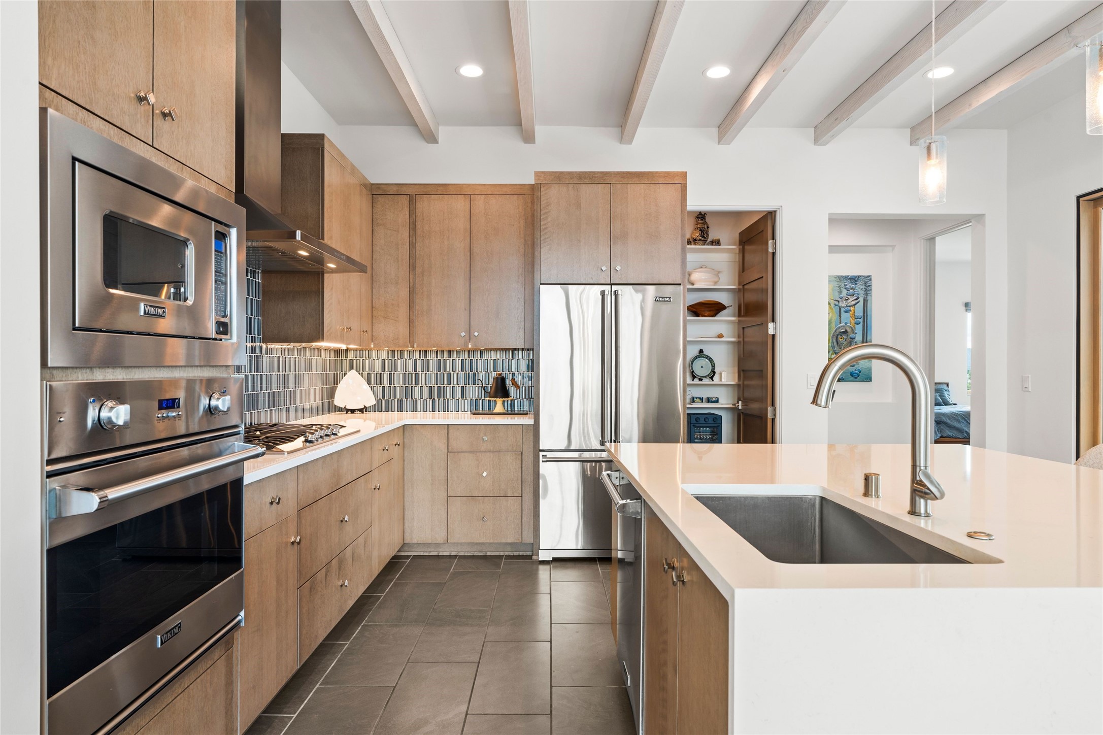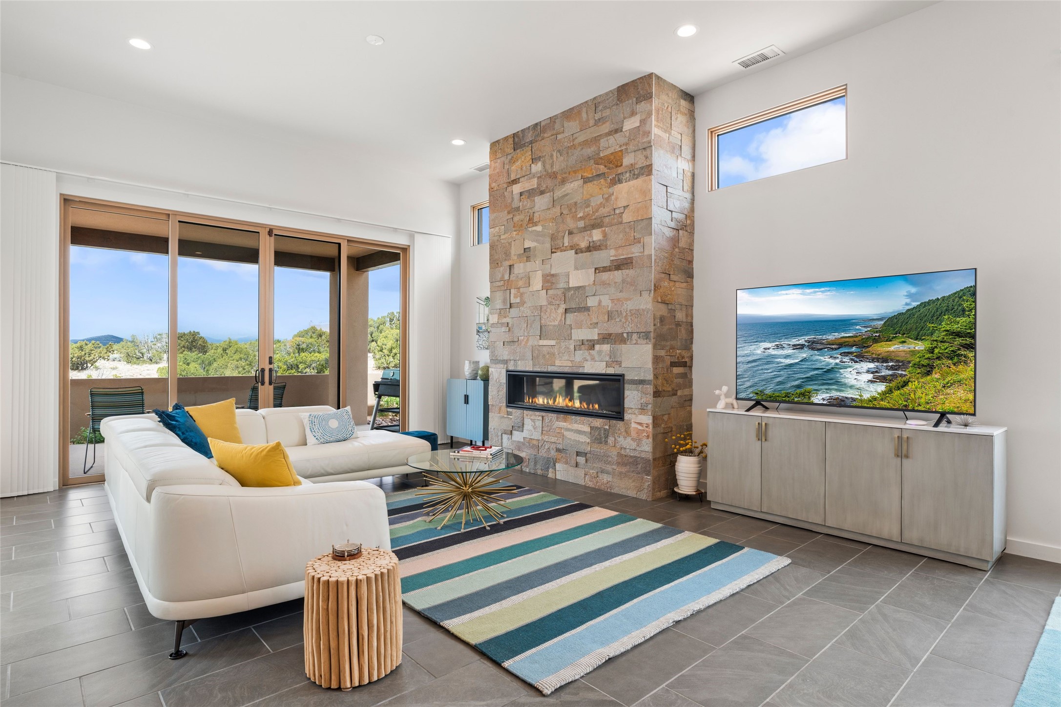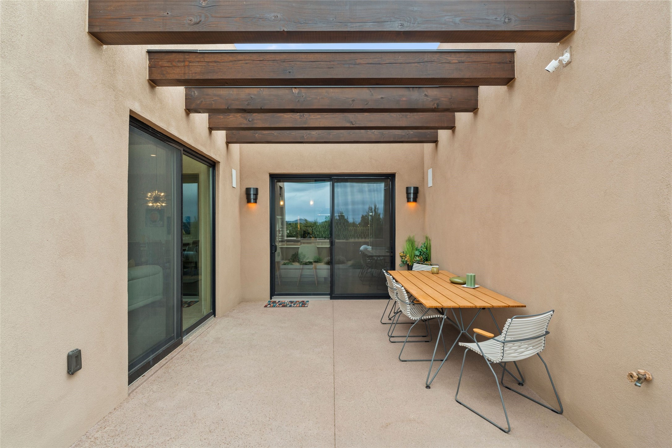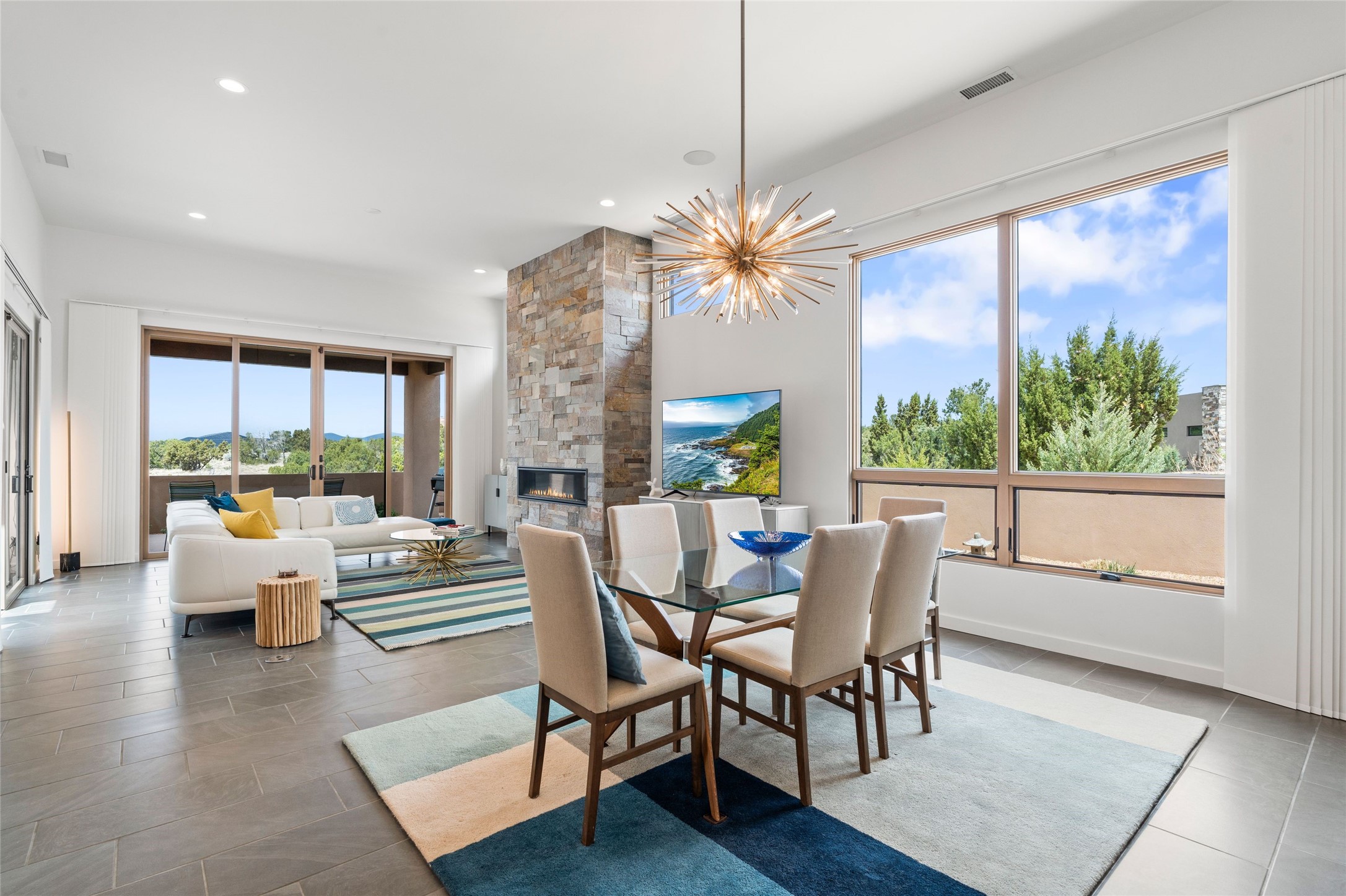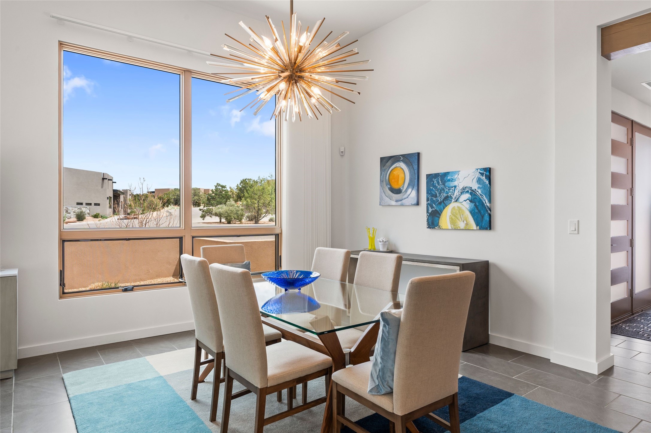 Accepting backup offers. Nestled in the prestigious Las Campanas gated community, this nearly new home offers breathtaking sunset & golf course views. Meticulously upgraded by the discerning owners, this residence boasts superior craftsmanship & thoughtful design. Energy efficient with Anderson 400 series windows & the convenience of an oversized, climate-controlled three car garage (Pre-wired for EV charger). The open concept floor plan flows seamlessly from the gourmet kitchen, featuring undermount lighting, quartz countertops with waterfall edge, Viking appliances, & a walk-in pantry, to the expansive dining & living areas. Imagine cozy evenings by the contemporary gas fireplace with its striking stacked stone wall, surrounded by large sliders leading to multiple outdoor living spaces. Electric Hunter Douglas shades in the living & dining rooms, while a built-in Sonos sound system enhances the ambiance in the living room, primary bedroom, & patio. Retreat to the primary bedroom, a sanctuary of relaxation with its private portal offering million dollar sunset & golf course vistas. The luxurious primary bath features a curbless walk-in shower, soaking tub, dual sinks & walk-in closet. A convenient access door leads from the primary closet to the laundry room, complete with a utility sink, custom cabinetry, and Electrolux washer/dryer. The secondary bedrooms are on a separate wing for enhanced privacy & floating vanities add a touch of modern elegance to the half bath and guest bath. The large third bedroom & guest bath may be closed off for added quietness. Soft-close drawers & cabinets throughout the entire home - custom-built closet systems in all three bedrooms. Security system w/ 6 cameras. Enjoy the outdoors with four distinct living spaces, including one at the front & three at the rear, showcasing direct views of the Jemez Mountains, stunning western sunsets, & golf course. Situated on the largest lot on the street, this home offers unparalleled privacy.