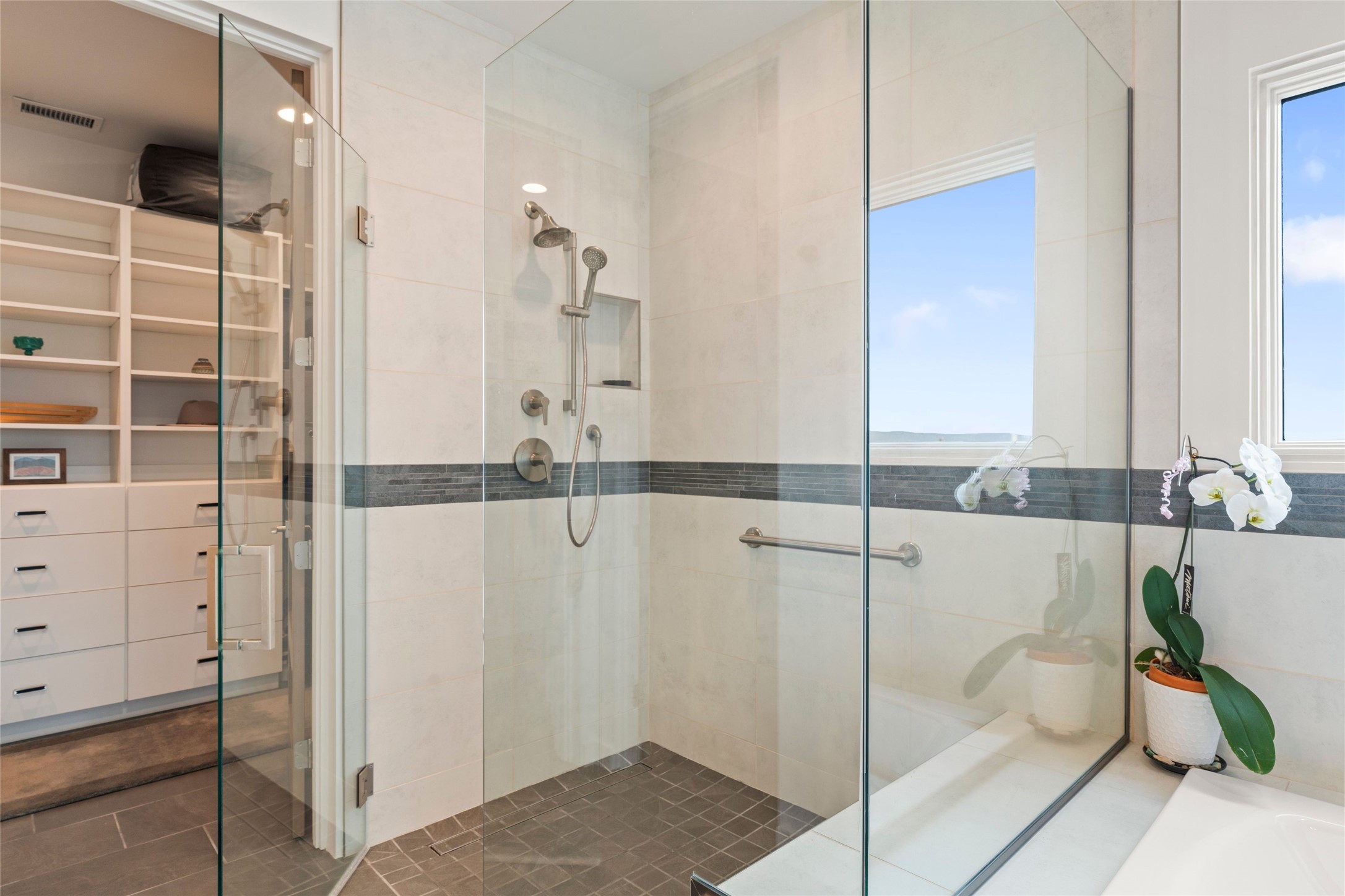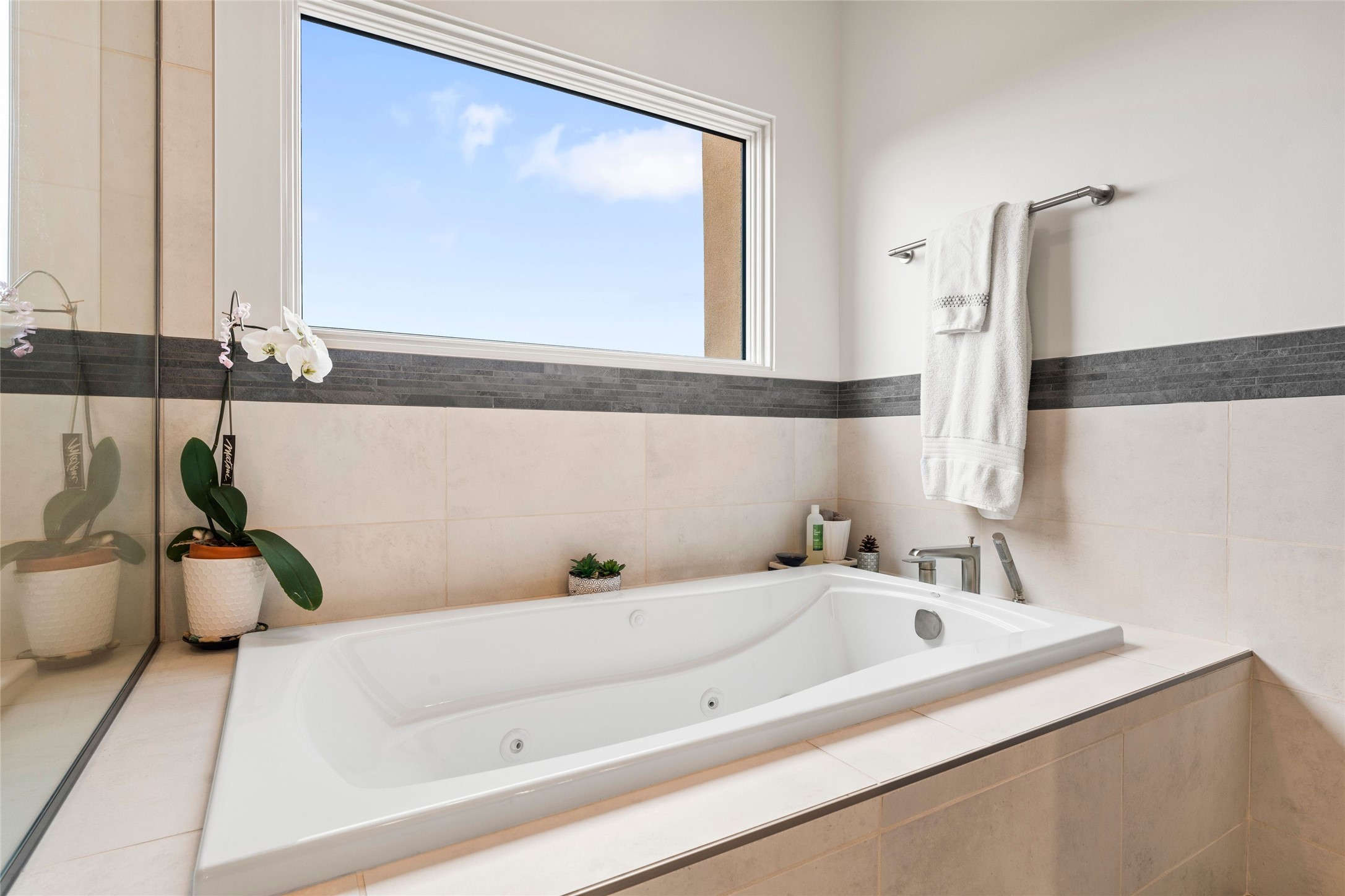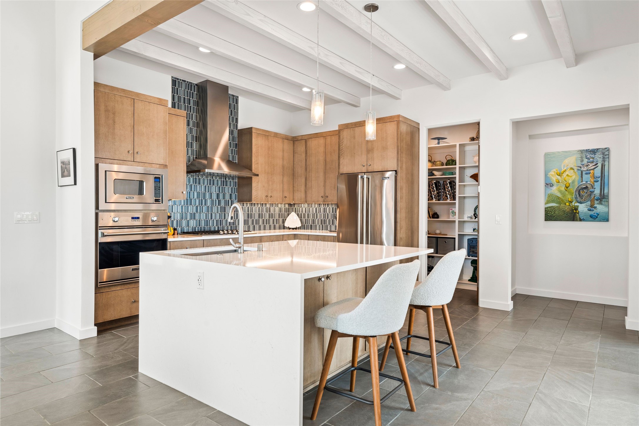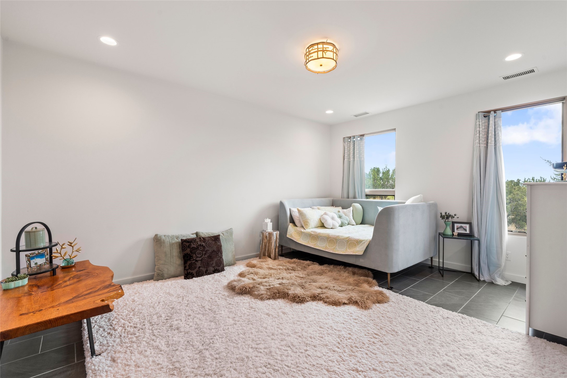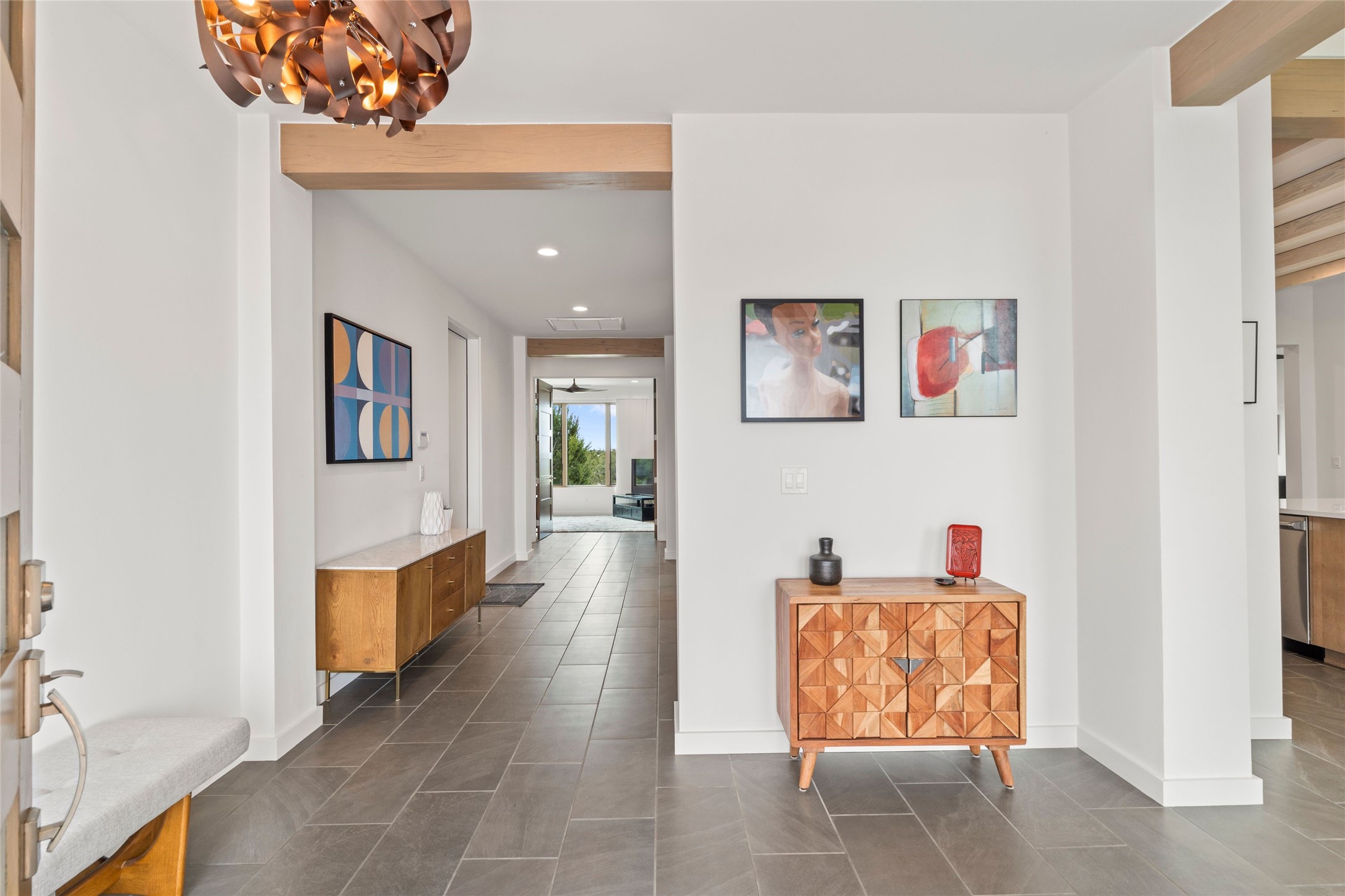 Accepting backup offers. Nestled in the prestigious Las Campanas gated community, this nearly new home offers breathtaking sunset & golf course views. Meticulously upgraded by the discerning owners, this residence boasts superior craftsmanship & thoughtful design. Energy efficient with Anderson 400 series windows & the convenience of an oversized, climate-controlled three car garage (Pre-wired for EV charger). The open concept floor plan flows seamlessly from the gourmet kitchen, featuring undermount lighting, quartz countertops with waterfall edge, Viking appliances, & a walk-in pantry, to the expansive dining & living areas. Imagine cozy evenings by the contemporary gas fireplace with its striking stacked stone wall, surrounded by large sliders leading to multiple outdoor living spaces. Electric Hunter Douglas shades in the living & dining rooms, while a built-in Sonos sound system enhances the ambiance in the living room, primary bedroom, & patio. Retreat to the primary bedroom, a sanctuary of relaxation with its private portal offering million dollar sunset & golf course vistas. The luxurious primary bath features a curbless walk-in shower, soaking tub, dual sinks & walk-in closet. A convenient access door leads from the primary closet to the laundry room, complete with a utility sink, custom cabinetry, and Electrolux washer/dryer. The secondary bedrooms are on a separate wing for enhanced privacy & floating vanities add a touch of modern elegance to the half bath and guest bath. The large third bedroom & guest bath may be closed off for added quietness. Soft-close drawers & cabinets throughout the entire home - custom-built closet systems in all three bedrooms. Security system w/ 6 cameras. Enjoy the outdoors with four distinct living spaces, including one at the front & three at the rear, showcasing direct views of the Jemez Mountains, stunning western sunsets, & golf course. Situated on the largest lot on the street, this home offers unparalleled privacy.