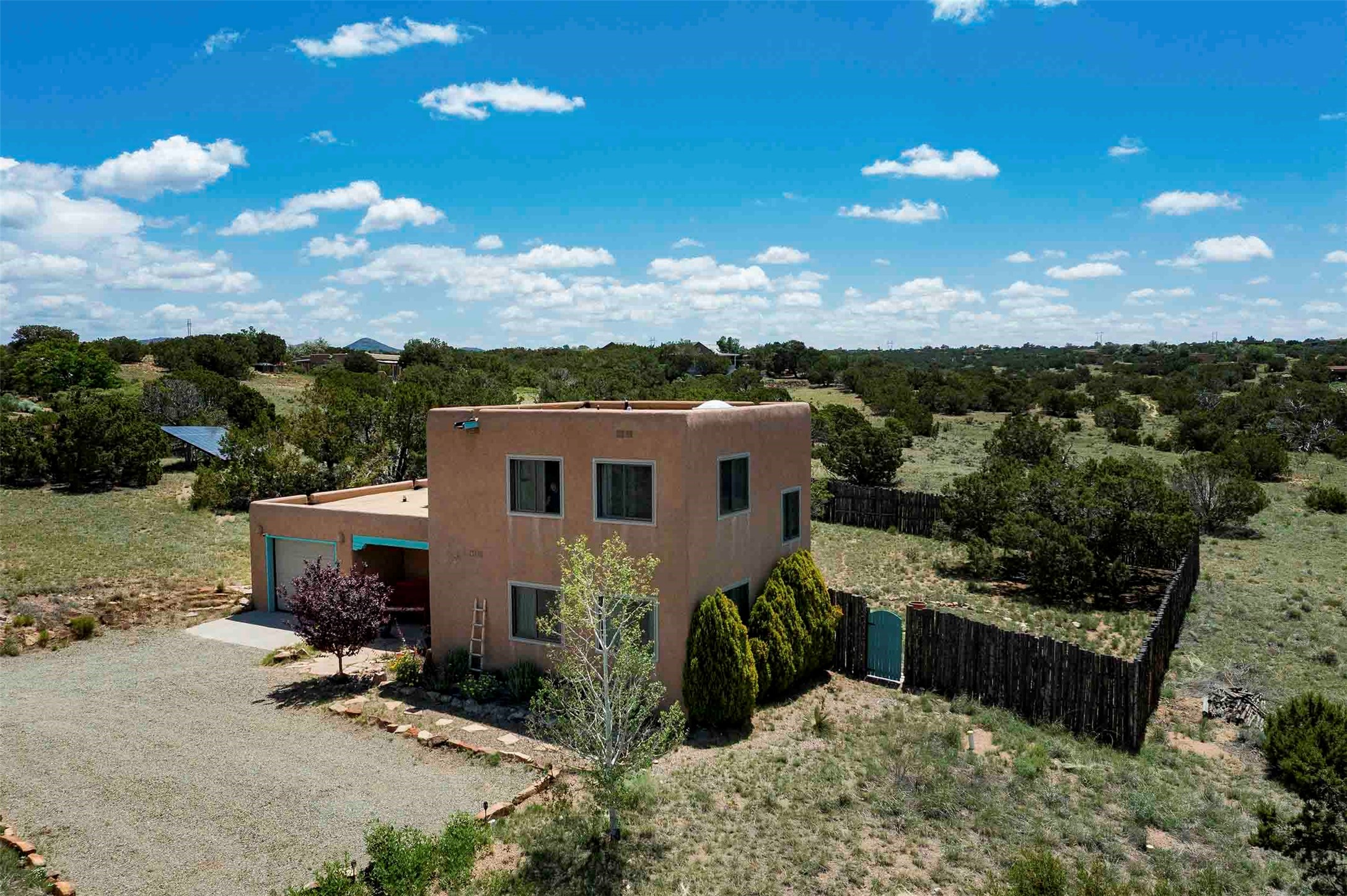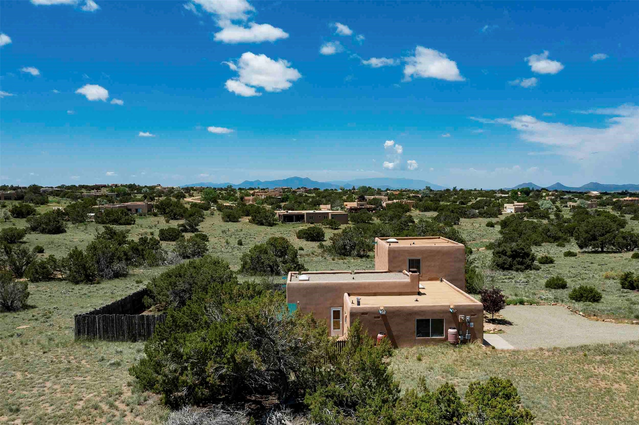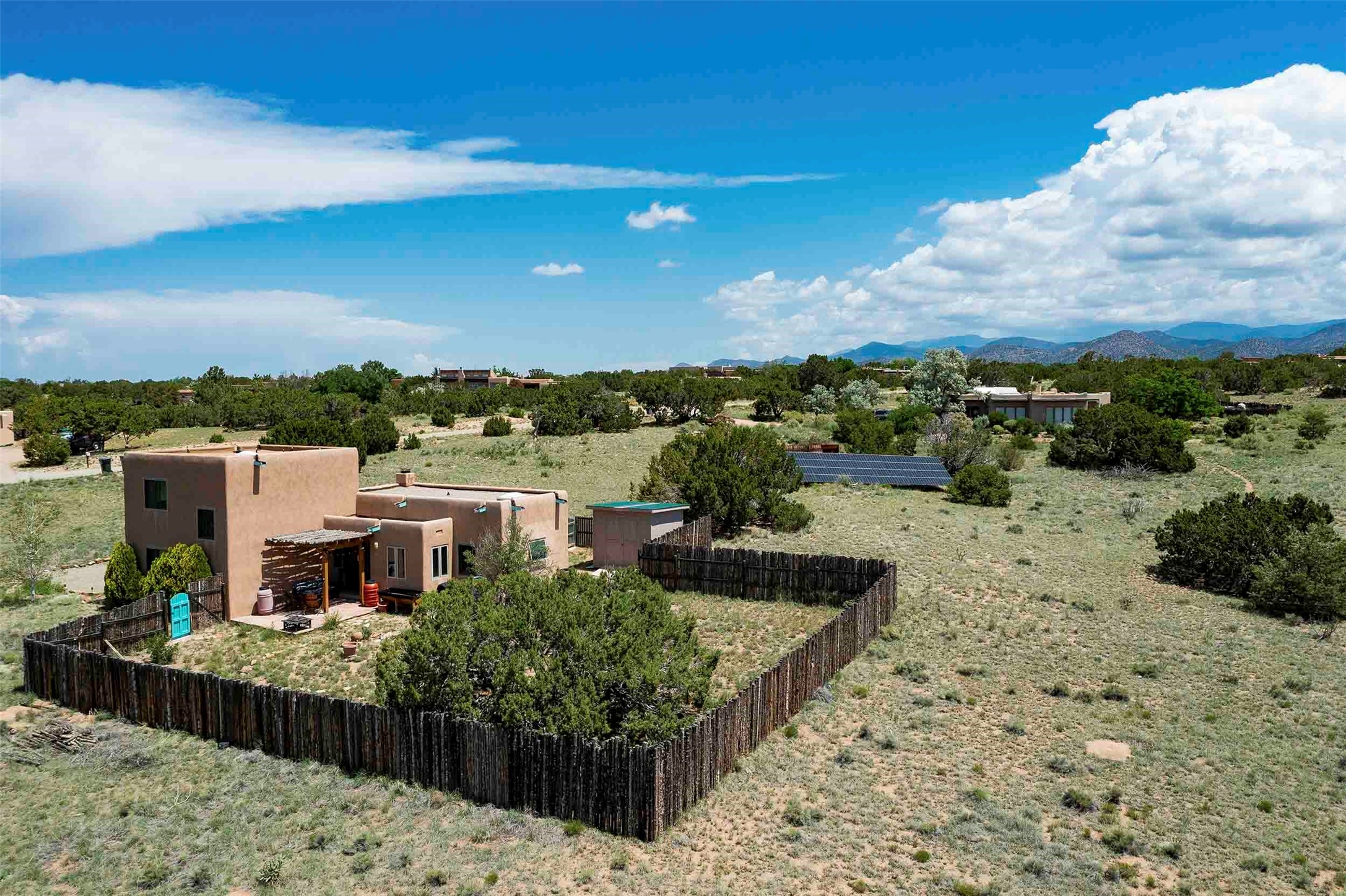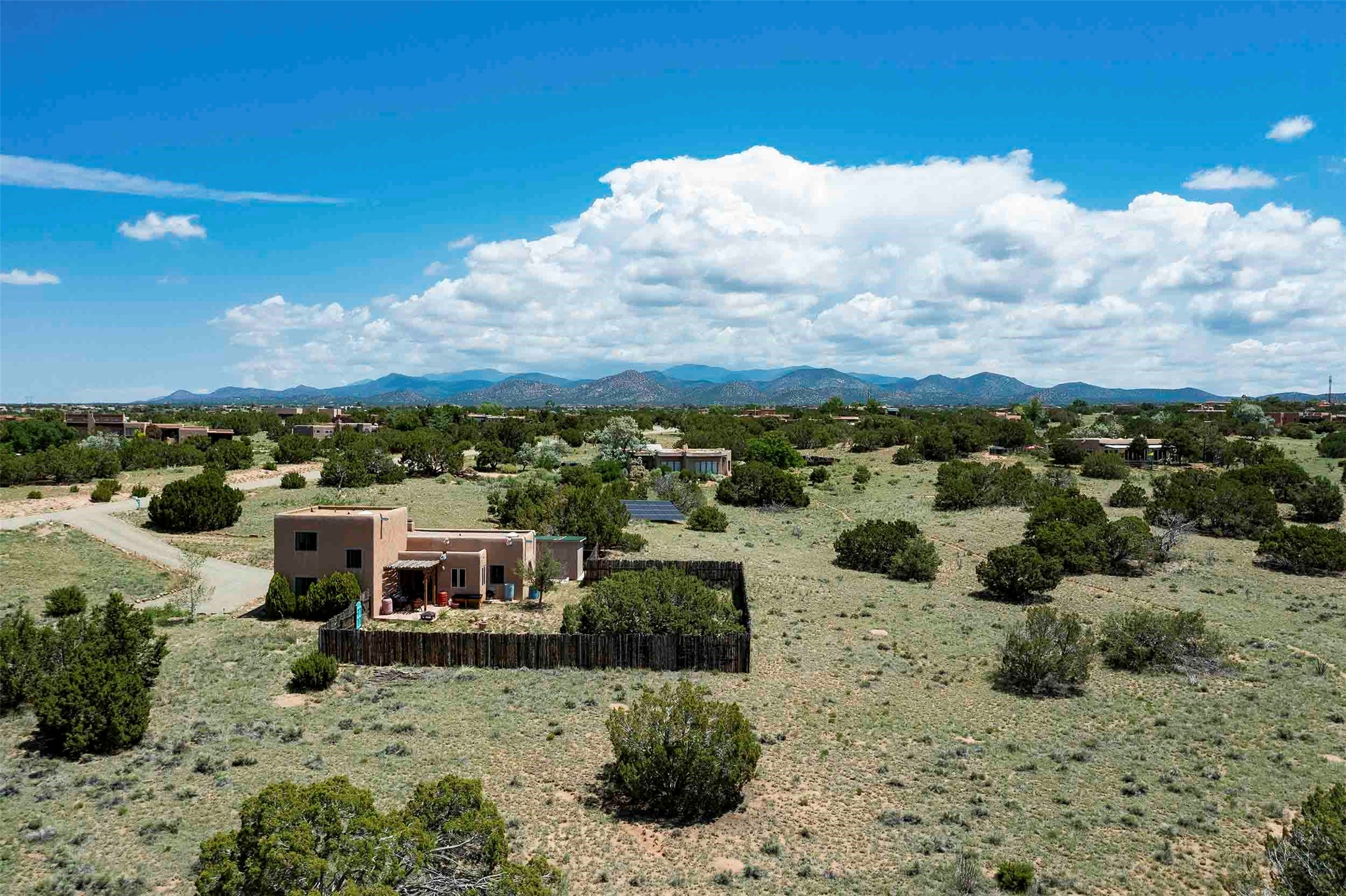 PRICE IMPROVEMENT! Welcome to 11 Balsa Court, where sustainability meets Southwest charm in the heart of Eldorado. This home features a fully owned 22-panel ground-mounted solar system (installed in 2021) that keeps electric bills under $12/month--a rare and valuable benefit.Backed by a greenbelt with stunning views of the San Pedro, Ortiz, and Jemez Mountains, the home offers privacy, open skies, and constant connection to nature. Enjoy sunsets from the bedroom and stargazing from the patio.Inside, the layout is open and comfortable. The great room features beautiful viga ceilings, a kiva fireplace, Saltillo tile floors, and plenty of natural light. The kitchen is equipped with a large center island and modern lighting, and there's a built-in banco for casual dining. All rooms are generously sized, offering flexibility for how you live and work. Out back, a flagstone patio with a ramada creates a shaded outdoor living space ideal for relaxing or entertaining. In addition, there are 17 new windows that were replaced in the spring of 2023, Renewal by Anderson, energy-efficient.The fully fenced yard makes life easy for pet owners, and the garden is already established with native trees and perennials. Living in Eldorado means easy access to miles of trails, a tight-knit community, great schools, local markets and restaurants, and the kind of quiet that's getting harder to find. This is the kind of property that makes it easy to settle in and feel at home.