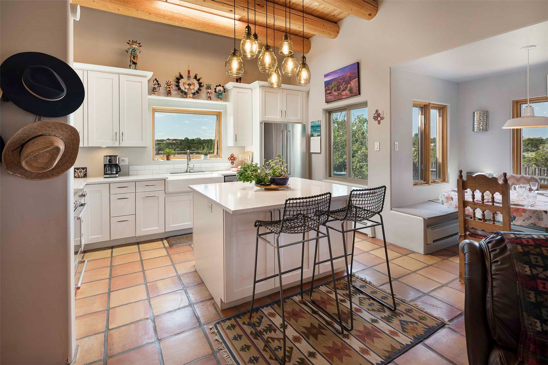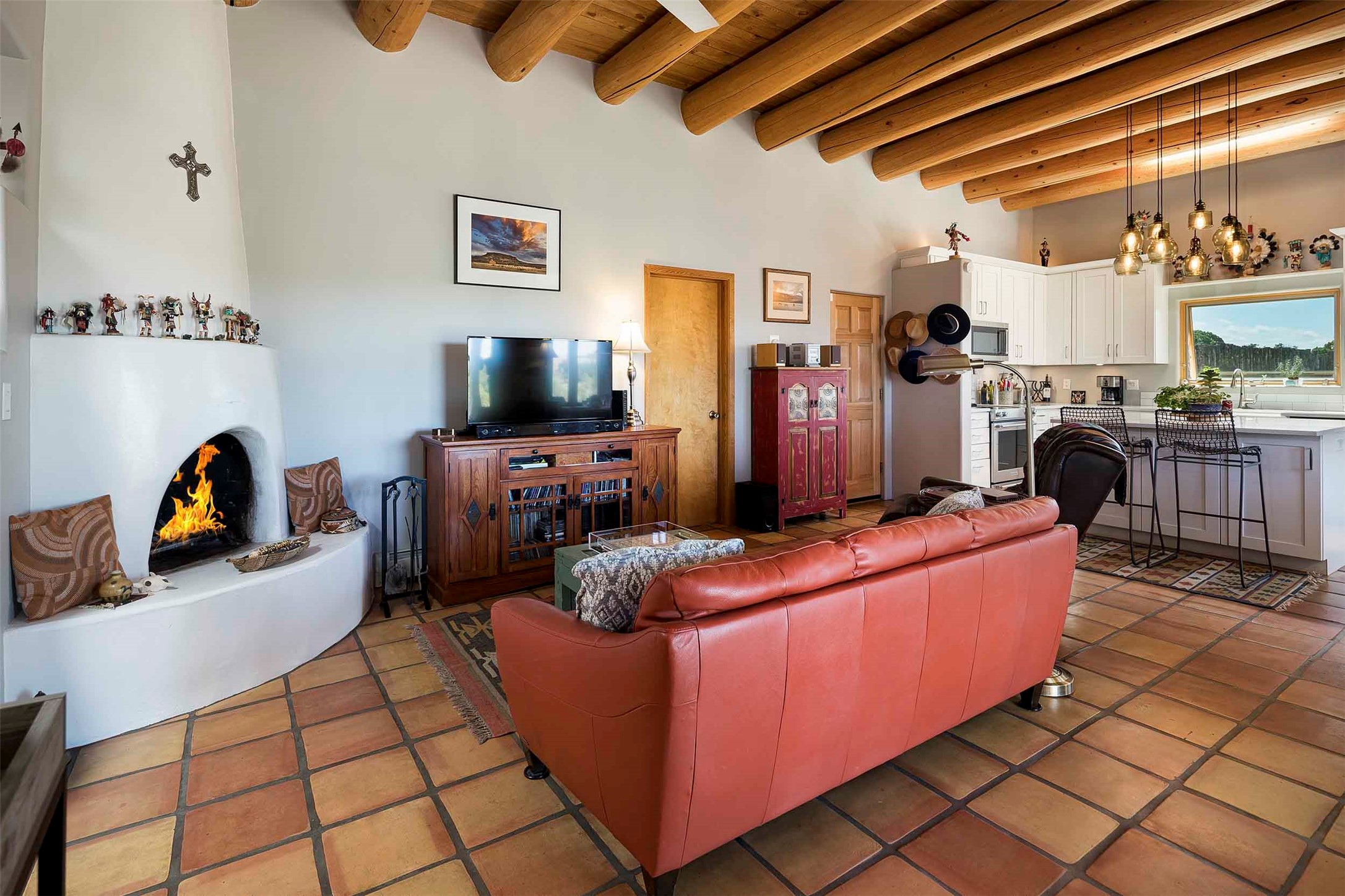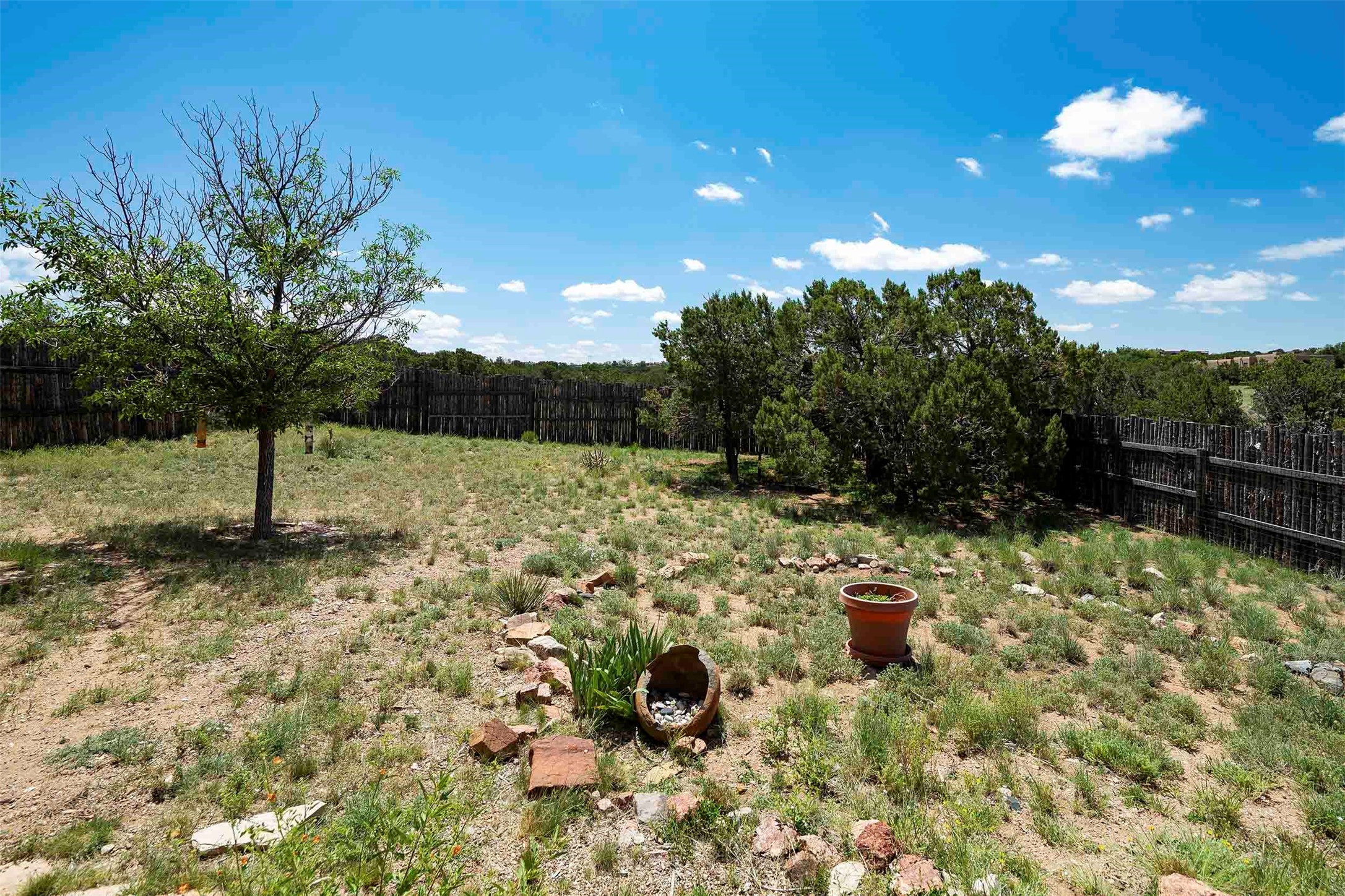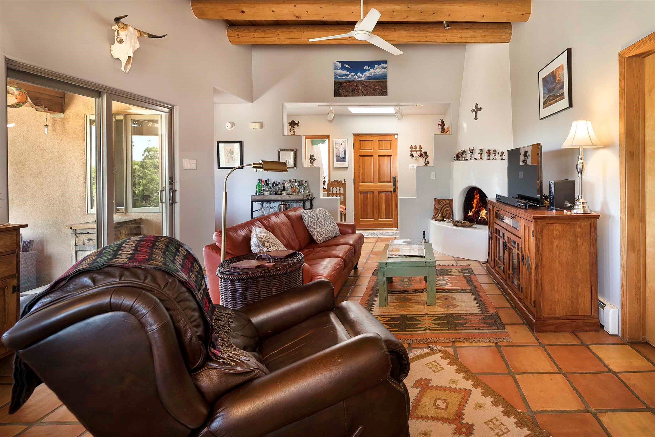 PRICE IMPROVEMENT! Welcome to 11 Balsa Court, where sustainability meets Southwest charm in the heart of Eldorado. This home features a fully owned 22-panel ground-mounted solar system (installed in 2021) that keeps electric bills under $12/month--a rare and valuable benefit.Backed by a greenbelt with stunning views of the San Pedro, Ortiz, and Jemez Mountains, the home offers privacy, open skies, and constant connection to nature. Enjoy sunsets from the bedroom and stargazing from the patio.Inside, the layout is open and comfortable. The great room features beautiful viga ceilings, a kiva fireplace, Saltillo tile floors, and plenty of natural light. The kitchen is equipped with a large center island and modern lighting, and there's a built-in banco for casual dining. All rooms are generously sized, offering flexibility for how you live and work. Out back, a flagstone patio with a ramada creates a shaded outdoor living space ideal for relaxing or entertaining. In addition, there are 17 new windows that were replaced in the spring of 2023, Renewal by Anderson, energy-efficient.The fully fenced yard makes life easy for pet owners, and the garden is already established with native trees and perennials. Living in Eldorado means easy access to miles of trails, a tight-knit community, great schools, local markets and restaurants, and the kind of quiet that's getting harder to find. This is the kind of property that makes it easy to settle in and feel at home.