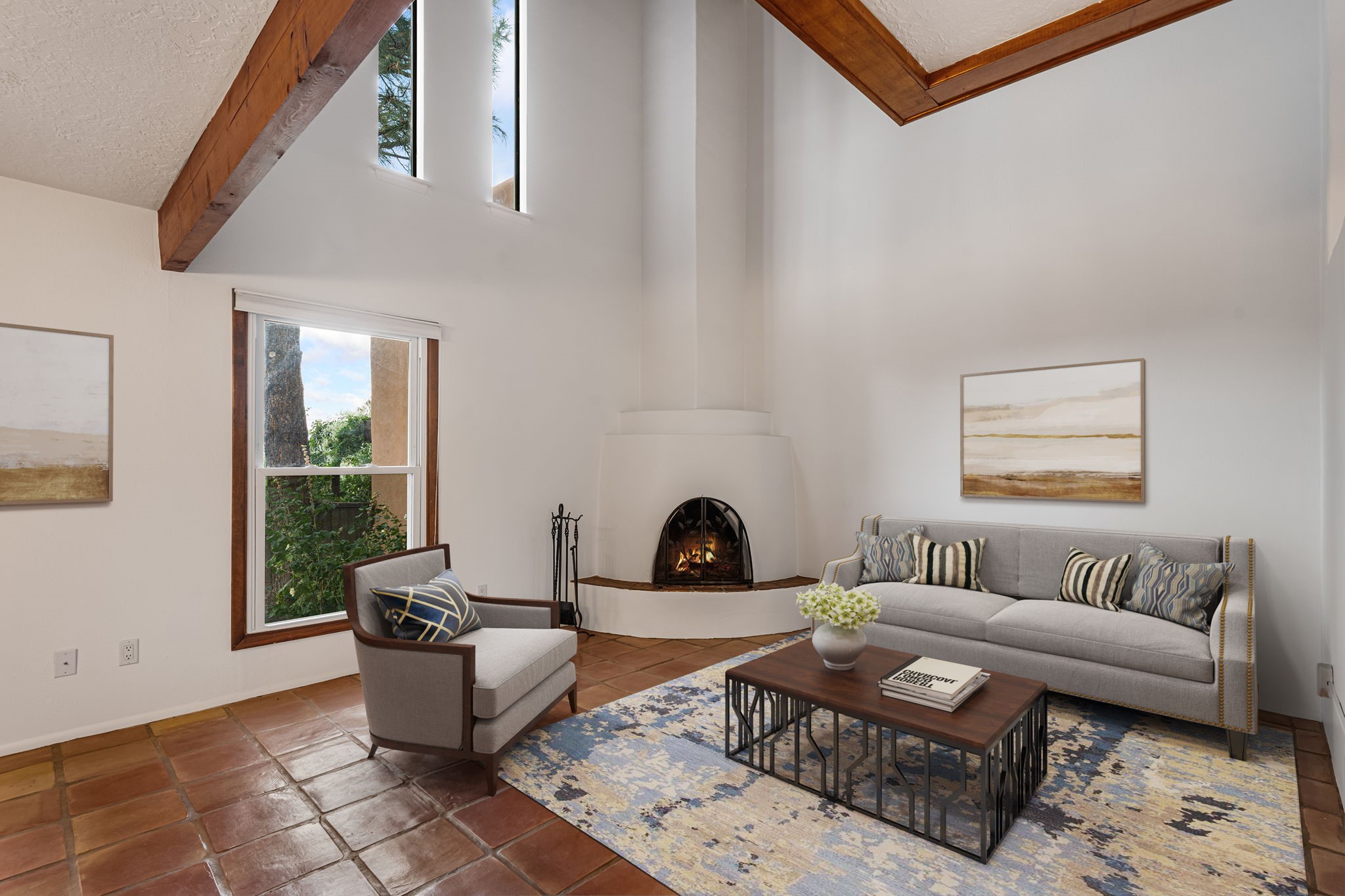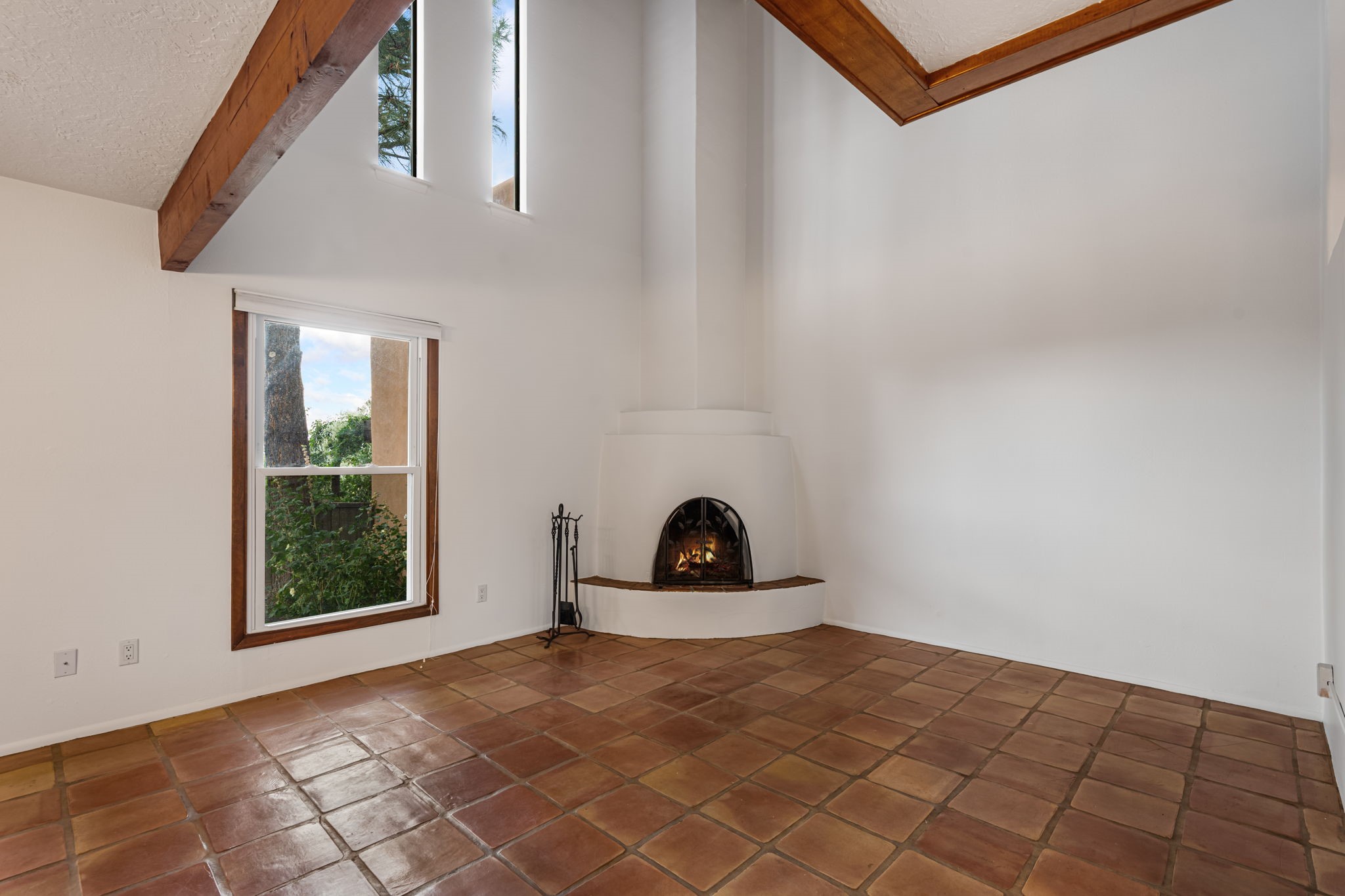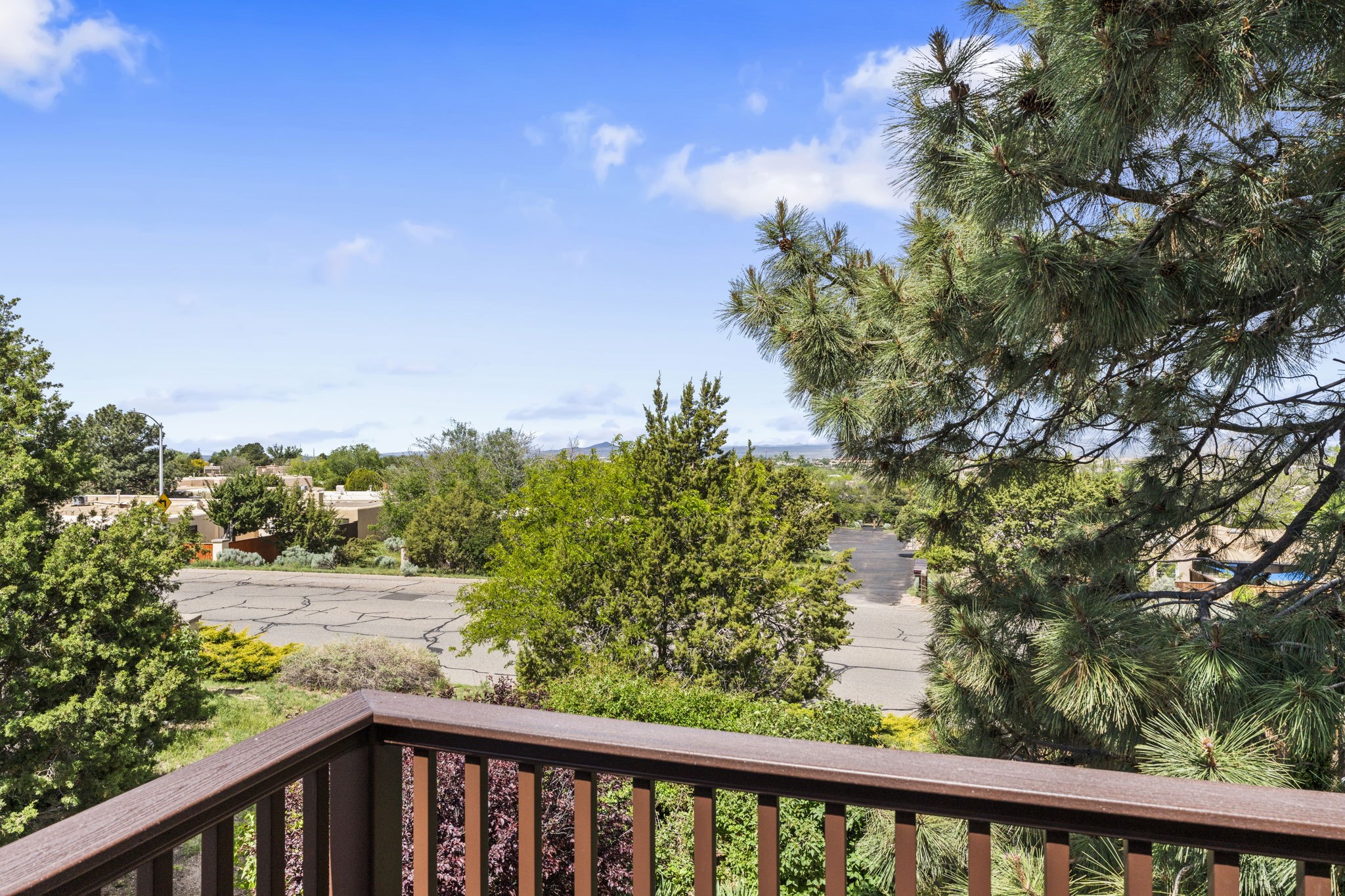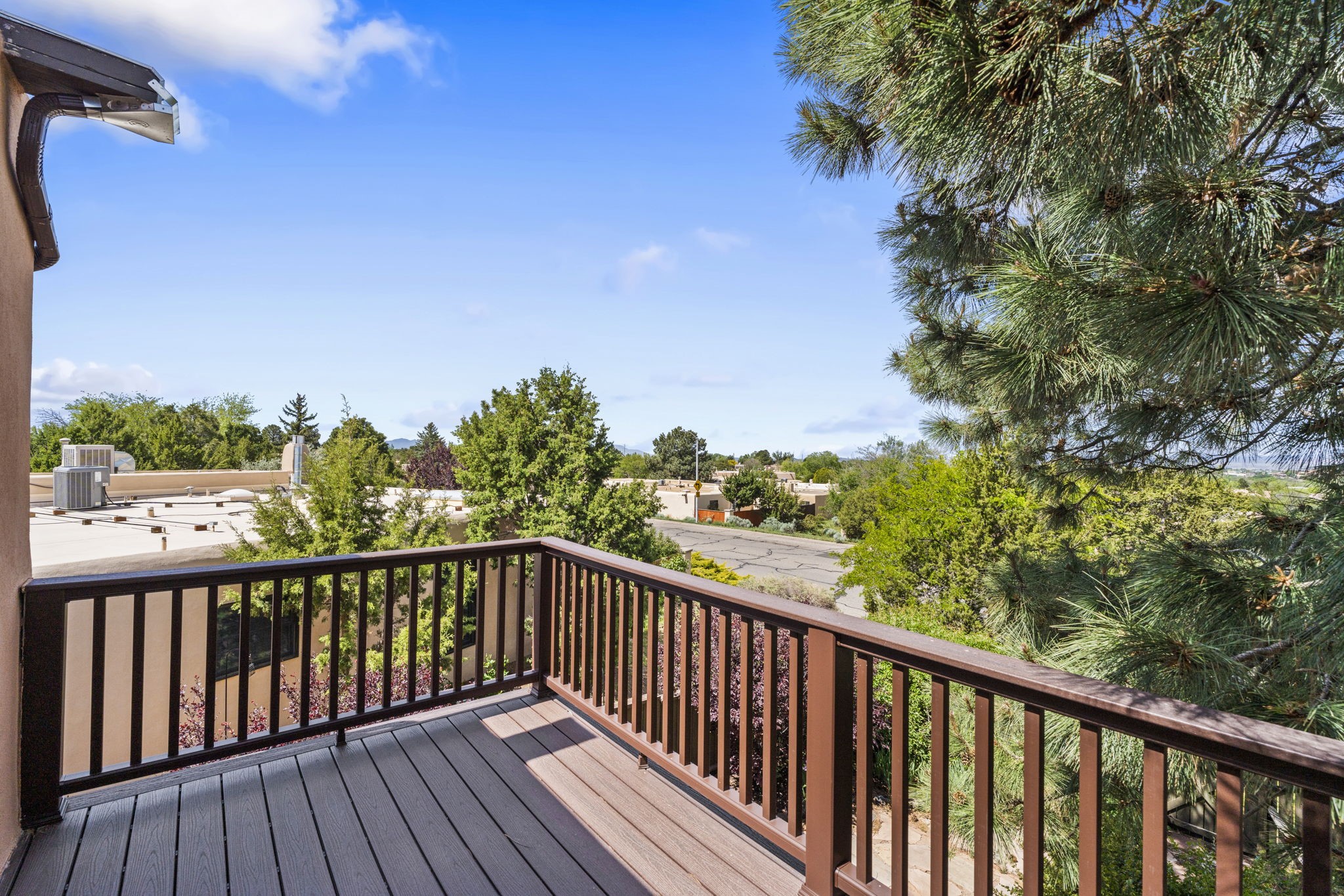 This stylish, freshly painted 3 bed, 2 bath tri-level home in the sought-after Park Plazas community blends Southwestern charm with modern updates.The spacious downstairs level invites you in with a tiled living room featuring striking two-story ceilings, interesting architectural detail and a dramatic Kiva fireplace--the perfect focal point for cozy gatherings. The open-concept dining area flows seamlessly into the well-appointed kitchen and provides direct access to a serene, shaded portal and flagstone patio, nestled beneath a majestic ponderosa pine. It's the ideal spot for al fresco dining or morning coffee, surrounded by the tranquility of a fully fenced backyard.This level also includes a bedroom, laundry area, and a convenient half bath, perfect for guests or multi-generational living.Upstairs, you'll find two generously sized bedrooms and a full bathroom with ample storage. The primary suite is a true retreat, opening to a sunny, recently rebuilt Trex deck--designed for low maintenance and long-lasting durability--where you can unwind while soaking in breathtaking sunset views of the Jemez and Sandia Mountains.With a newer roof (3 years old) and fresh stucco (2 years old), this home is move-in ready and built to last. A two-car garage adds practicality, while community amenities--including miles of walking trails, an off-leash dog park, tennis courts, a community garden, and more--elevate everyday living.Ideally located just minutes from shopping, dining, and all the cultural richness Santa Fe has to offer, this home is a rare find at a fantastic price. Don't miss your chance to own a slice of Southwestern paradise!