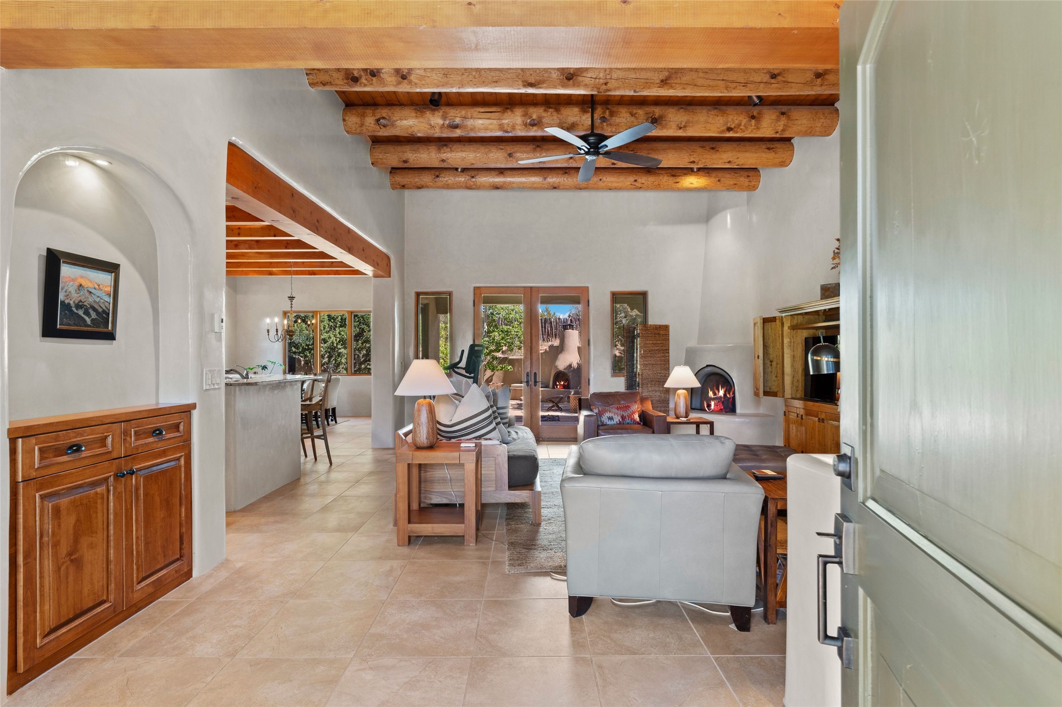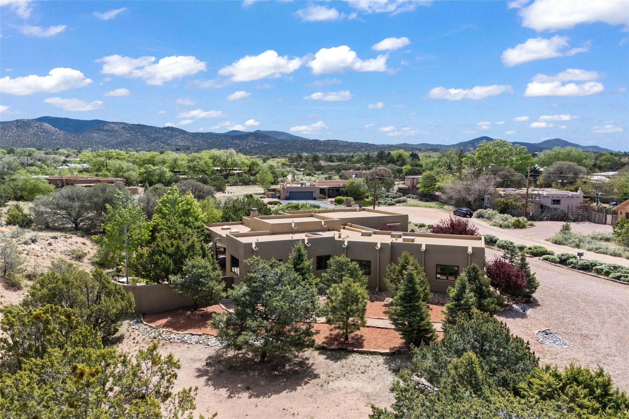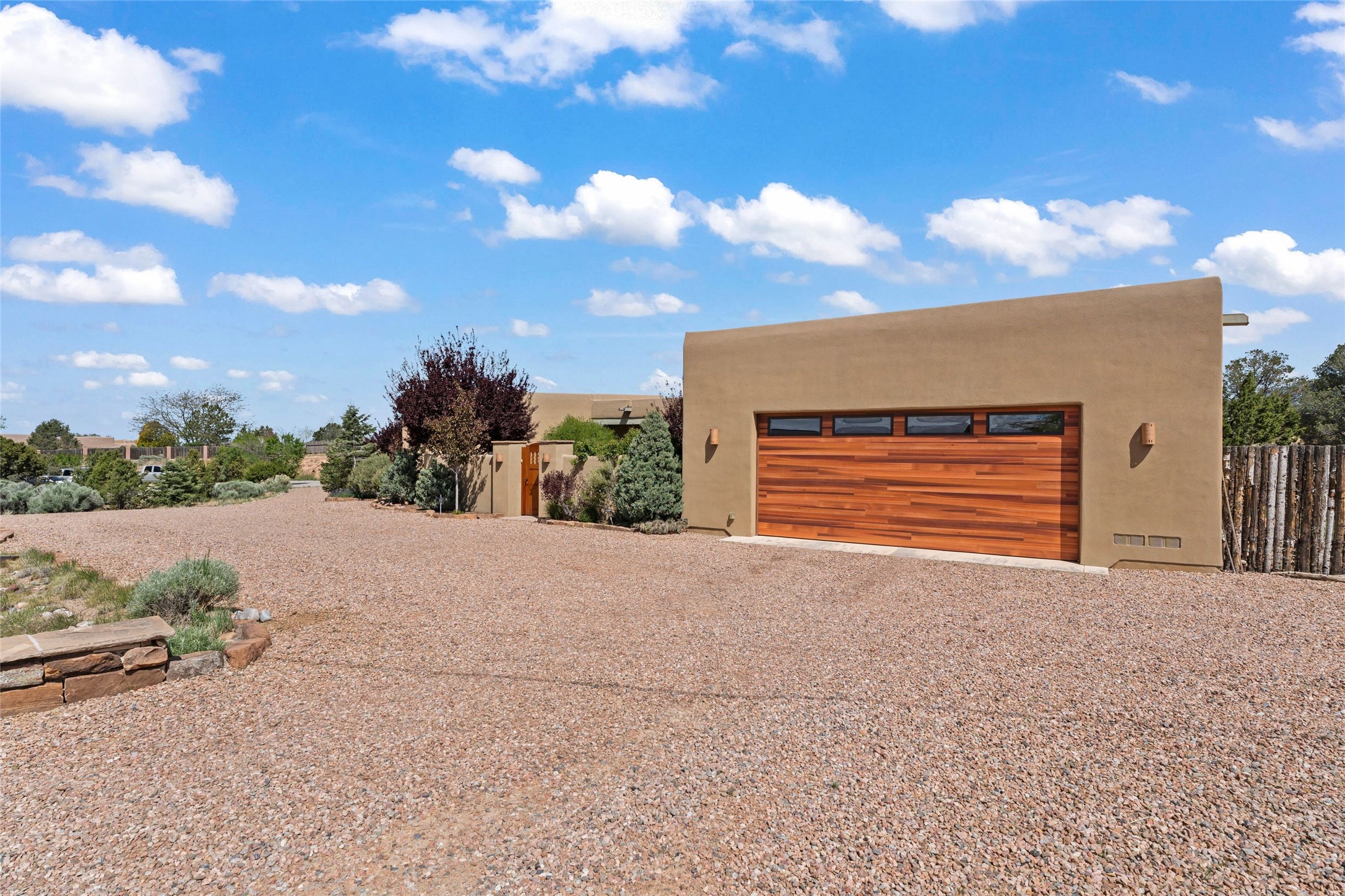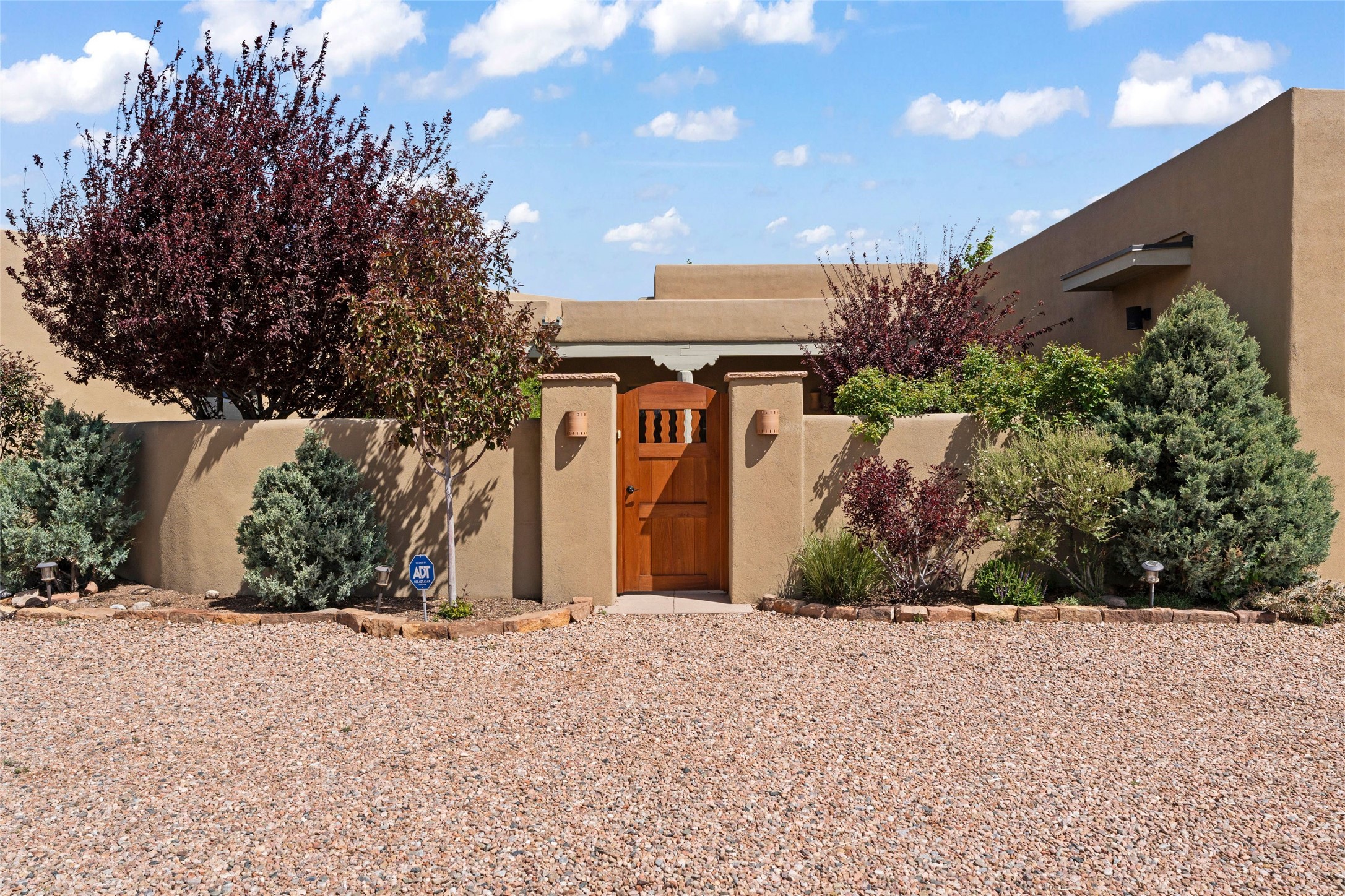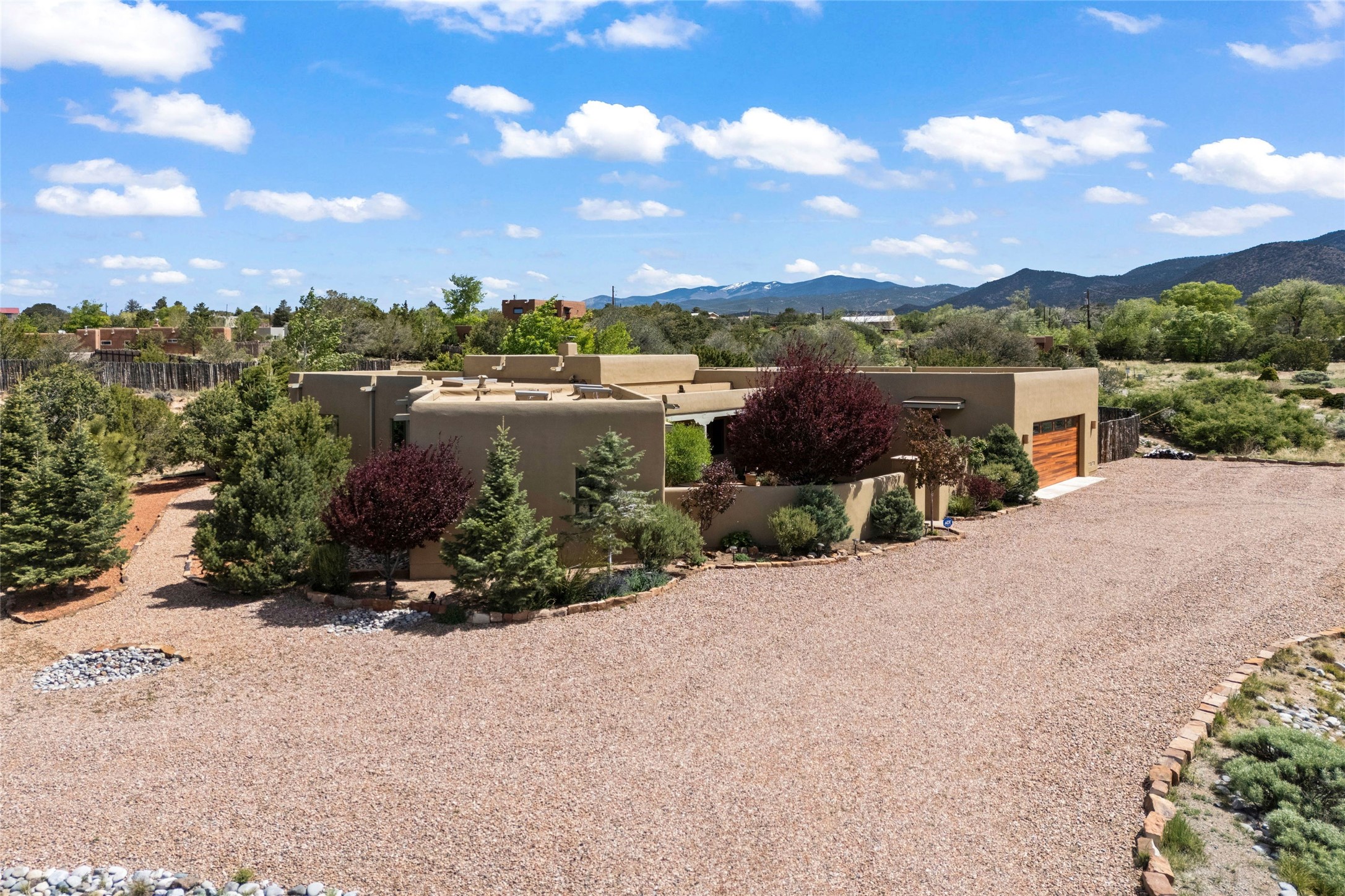 Explore the inviting three-bedroom, two-bath home situated on a cul-de-sac lot on 1.06 acres in the highly desirable, close in neighborhood of Valle Chamiso. Constructed in 2013 by John Di Janni Homes, this residence showcases high-end finishes that elevate its appeal, including expertly plastered walls and three fireplaces, featuring a distinctive outdoor kiva. The interior is enhanced with knotty alder doors, tile and wood flooring, and traditional vigas and beams that add a touch of elegance. The kitchen stands out with premium appliances, including a 36" Wolf range, creating an ideal space for culinary exploration. This single-level home offers convenience with no interior steps, making it accessible for everyone. Recognized with the 2013 Hacienda Homes Parade 2013 People's Choice Award, this property reflects a commitment to quality and thoughtful design. An oversized, insulated two-car garage provides generous space for vehicles and storage needs. Environmentally conscious features include compliance with the City of Santa Fe Green Code, a 57 HERS rating, Energy Star appliances, and a tankless water heater, ensuring energy efficiency and sustainability. Enjoy outdoor living with the charming portal and patio, perfect for gatherings or relaxation. The enclosed backyard features ample green space, ideal for gardening or leisure activities. Conveniently located near Santa Fe Plaza, Museum Hill, and a variety of dining, medical facilities, and shopping options, this property combines luxury with practicality in a vibrant community.