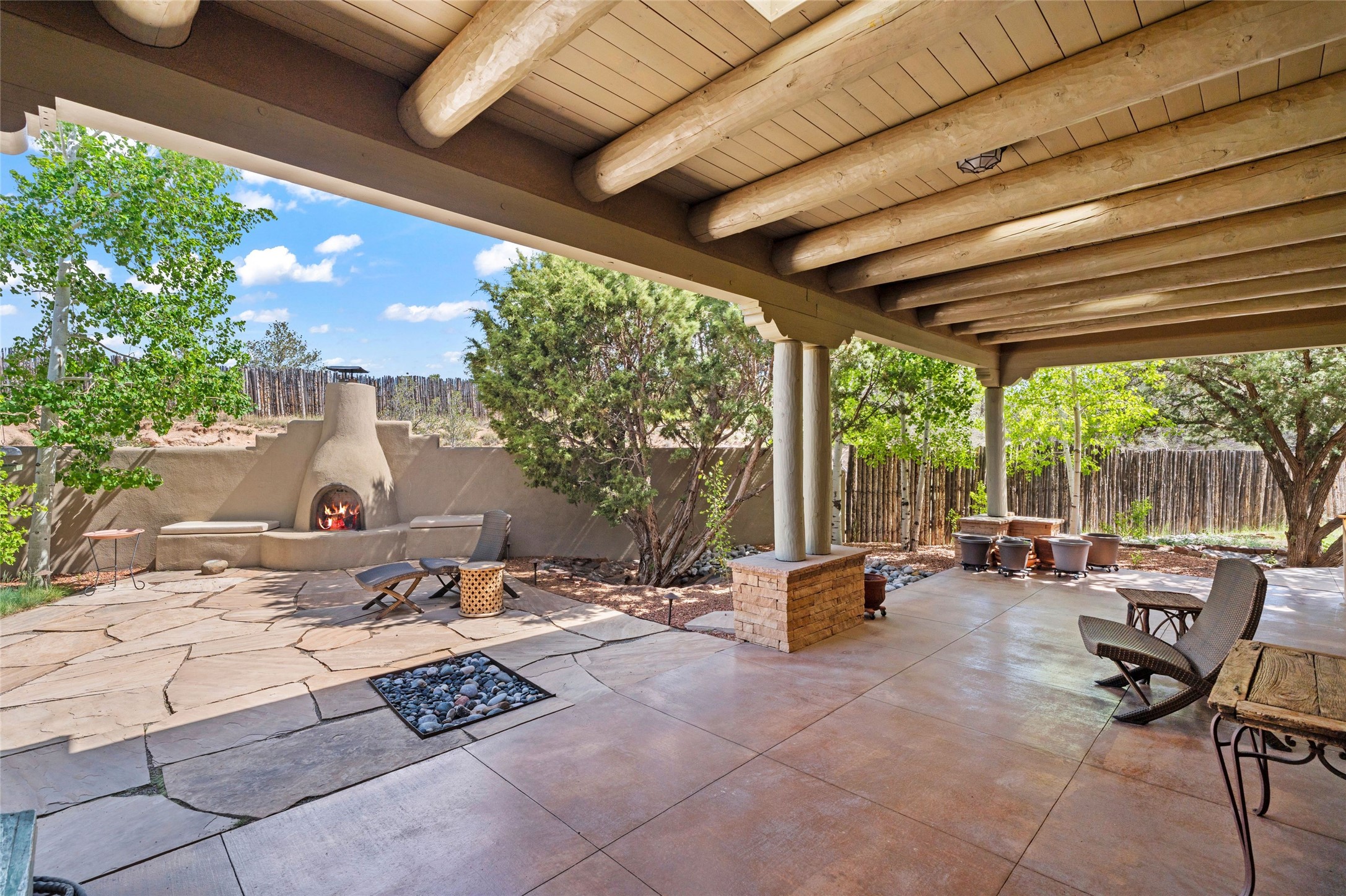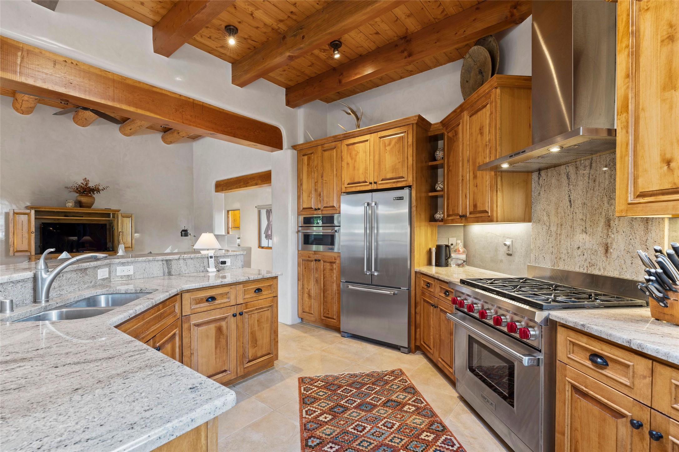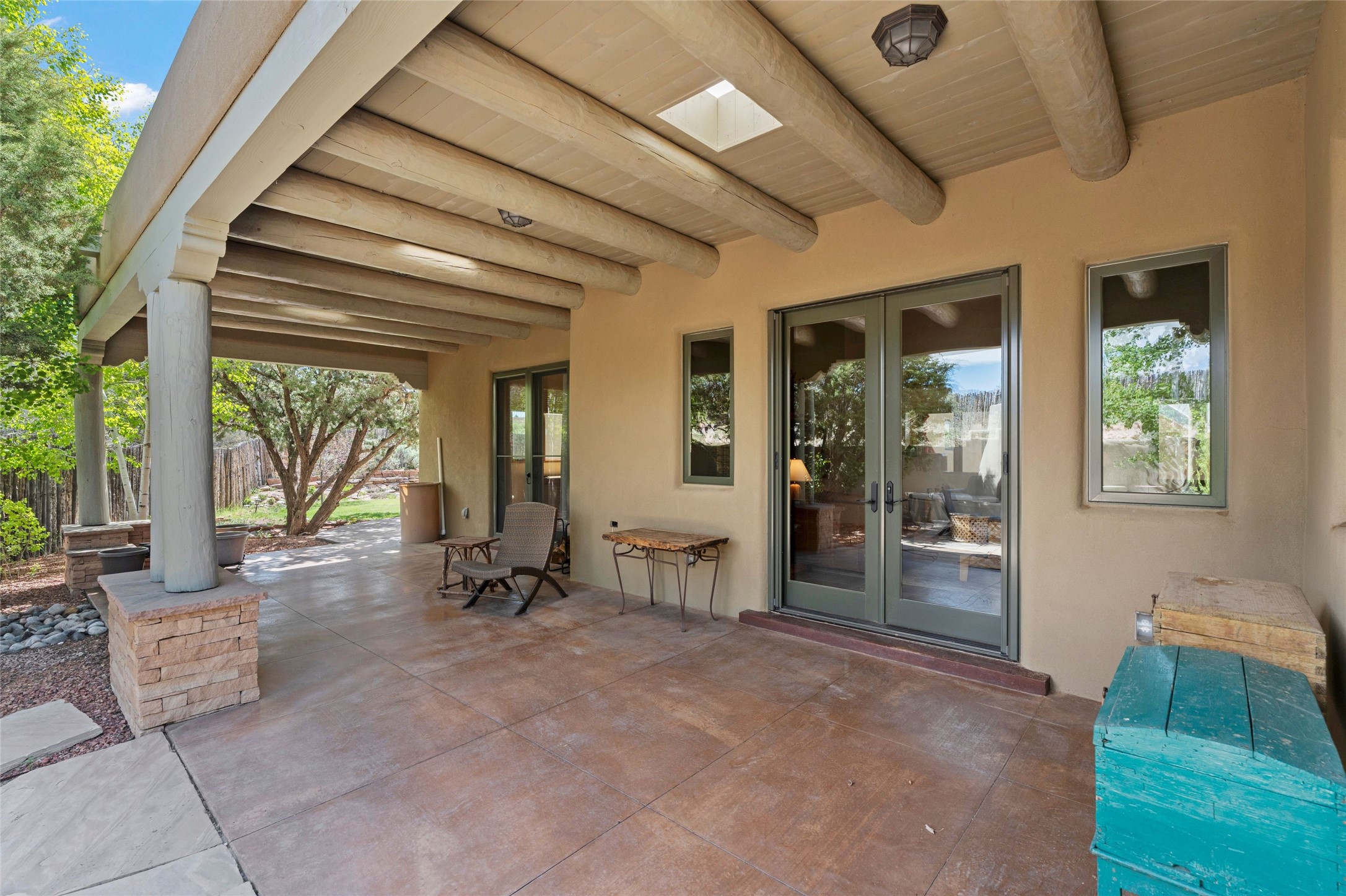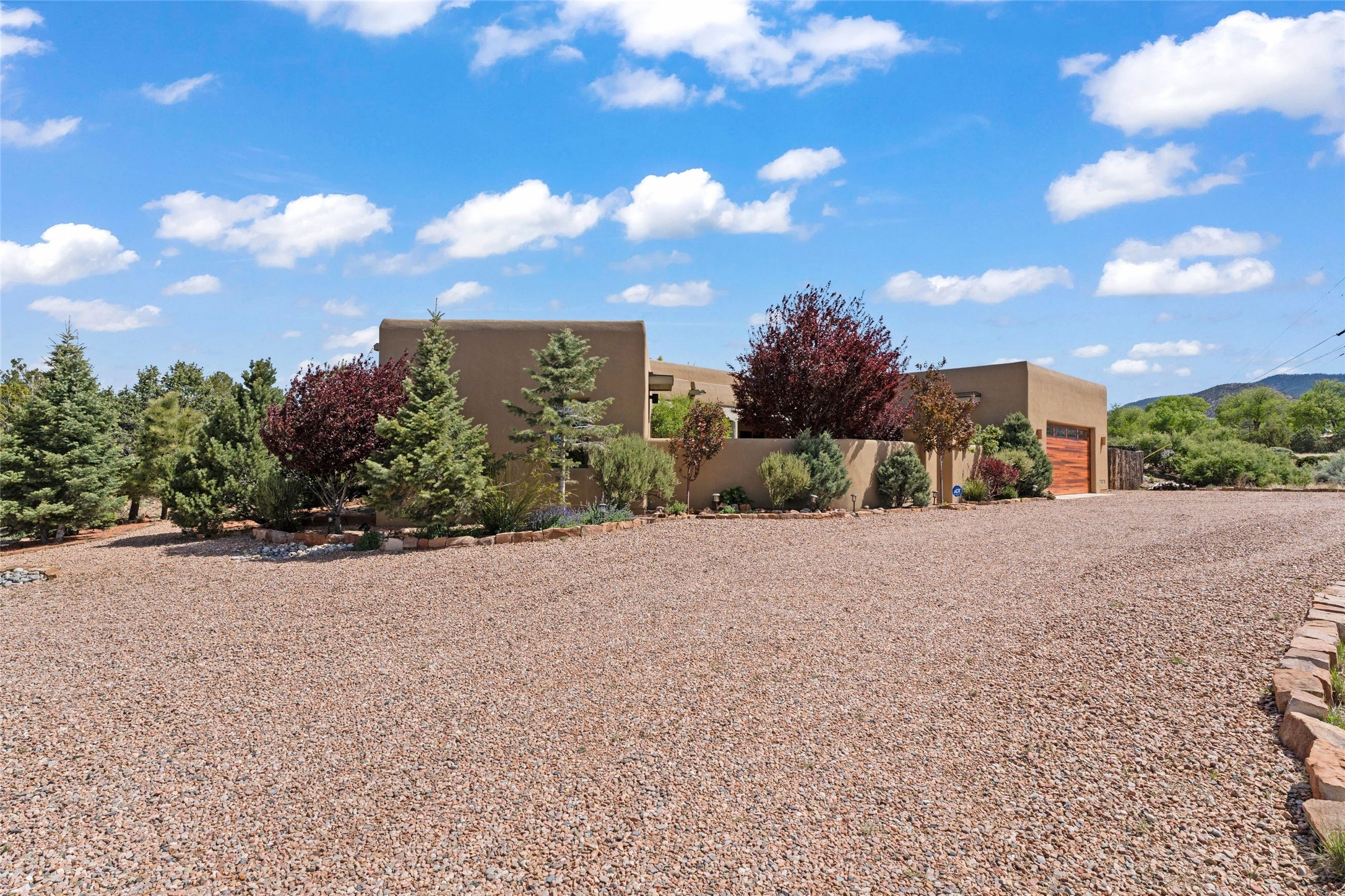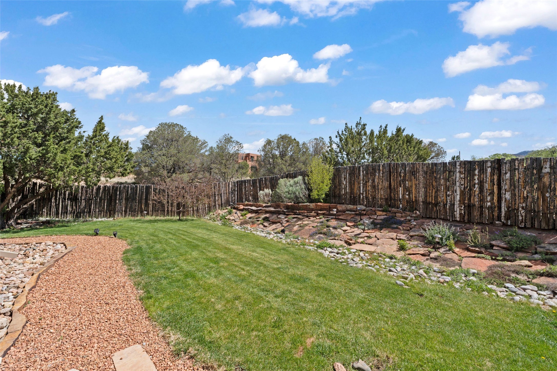 Explore the inviting three-bedroom, two-bath home situated on a cul-de-sac lot on 1.06 acres in the highly desirable, close in neighborhood of Valle Chamiso. Constructed in 2013 by John Di Janni Homes, this residence showcases high-end finishes that elevate its appeal, including expertly plastered walls and three fireplaces, featuring a distinctive outdoor kiva. The interior is enhanced with knotty alder doors, tile and wood flooring, and traditional vigas and beams that add a touch of elegance. The kitchen stands out with premium appliances, including a 36" Wolf range, creating an ideal space for culinary exploration. This single-level home offers convenience with no interior steps, making it accessible for everyone. Recognized with the 2013 Hacienda Homes Parade 2013 People's Choice Award, this property reflects a commitment to quality and thoughtful design. An oversized, insulated two-car garage provides generous space for vehicles and storage needs. Environmentally conscious features include compliance with the City of Santa Fe Green Code, a 57 HERS rating, Energy Star appliances, and a tankless water heater, ensuring energy efficiency and sustainability. Enjoy outdoor living with the charming portal and patio, perfect for gatherings or relaxation. The enclosed backyard features ample green space, ideal for gardening or leisure activities. Conveniently located near Santa Fe Plaza, Museum Hill, and a variety of dining, medical facilities, and shopping options, this property combines luxury with practicality in a vibrant community.