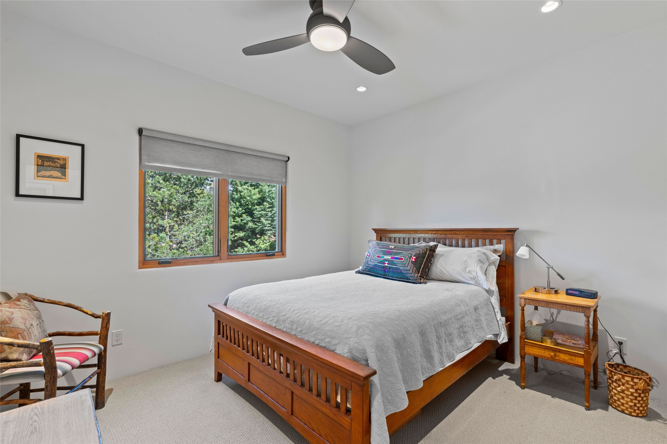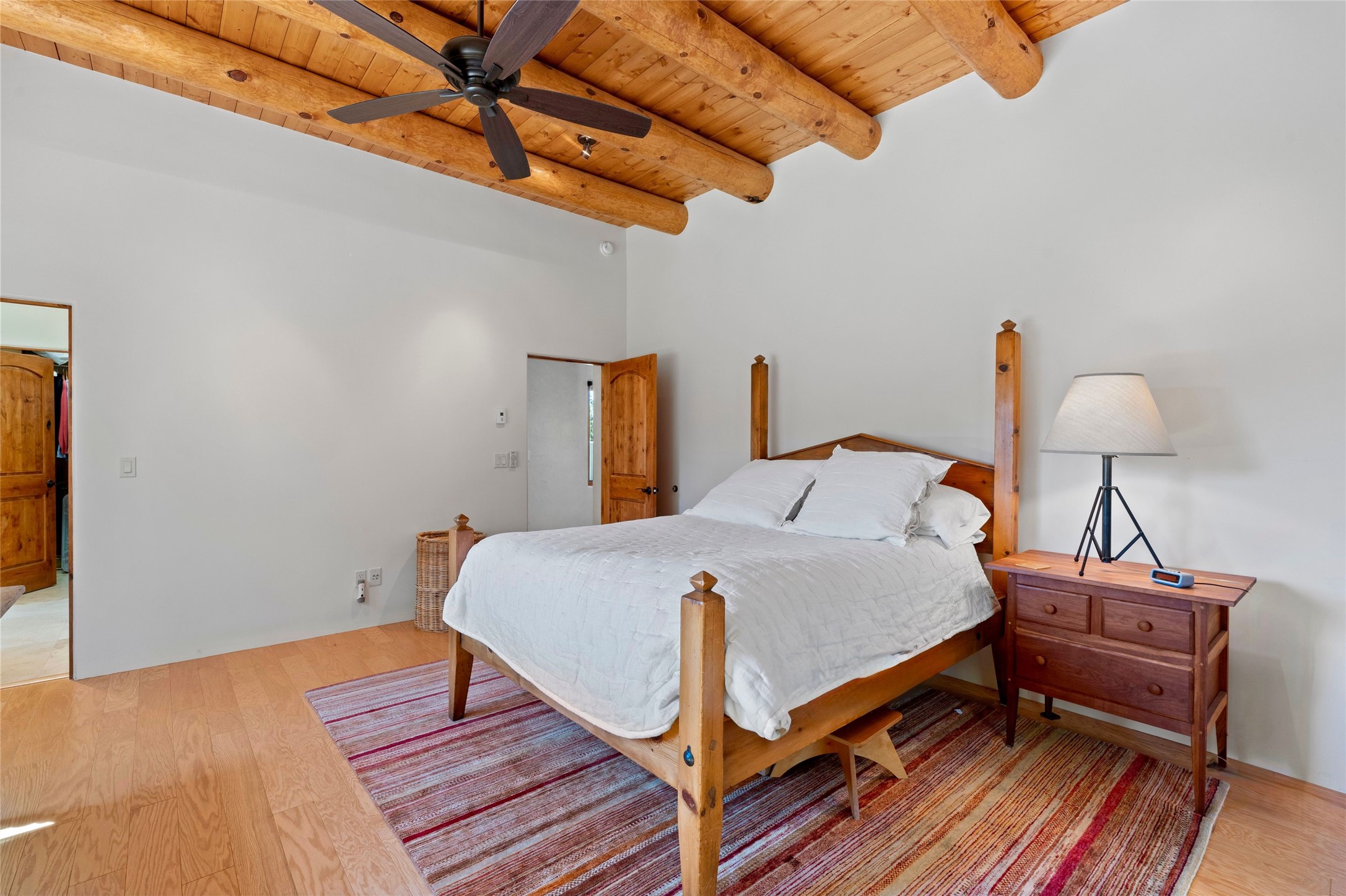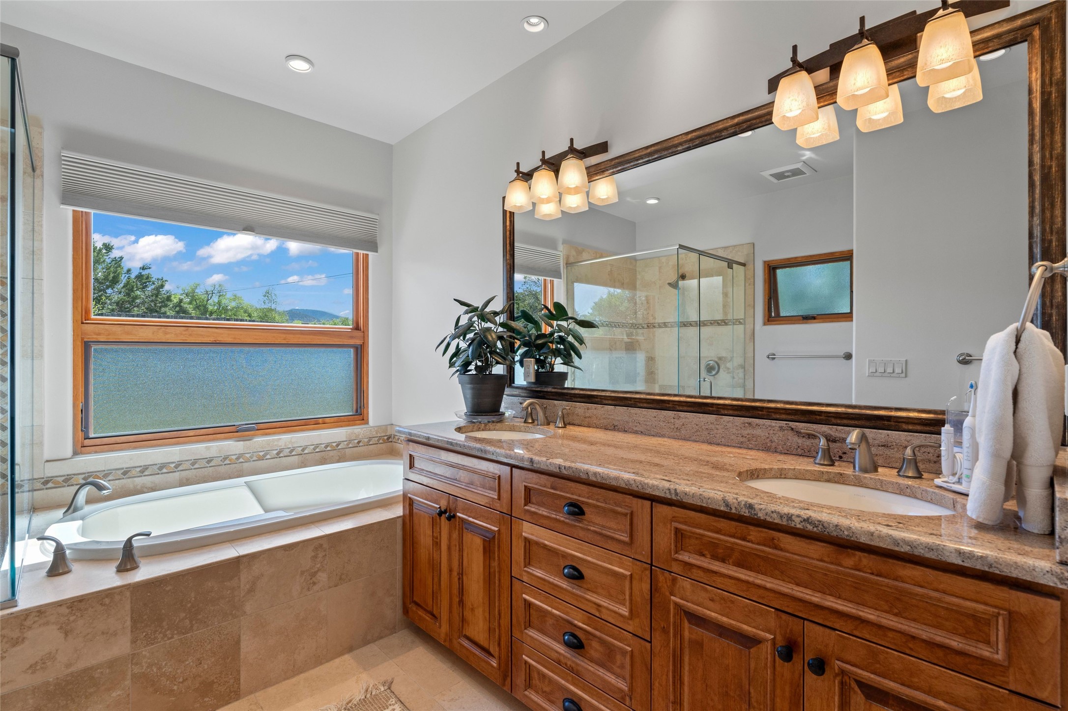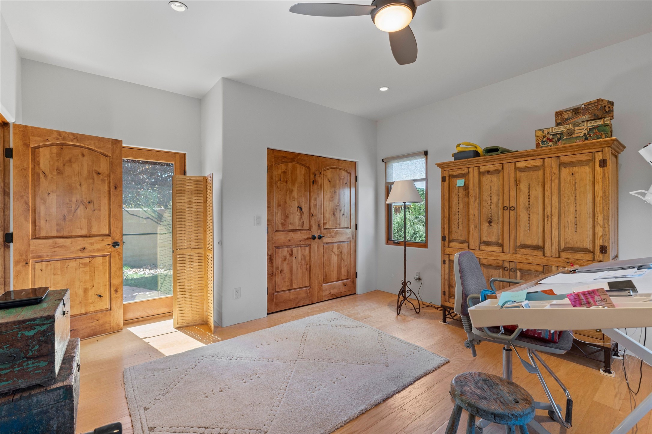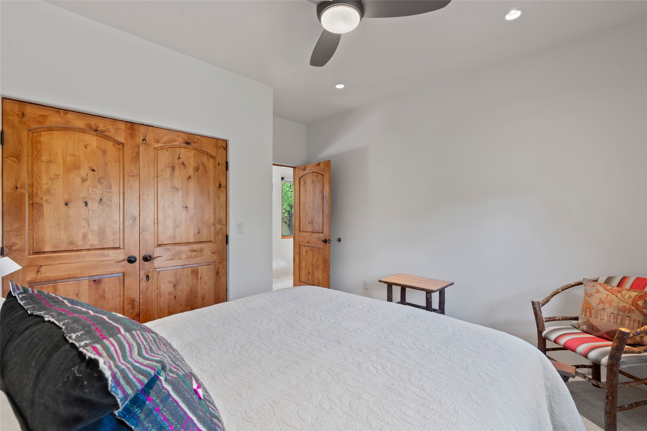 Explore the inviting three-bedroom, two-bath home situated on a cul-de-sac lot on 1.06 acres in the highly desirable, close in neighborhood of Valle Chamiso. Constructed in 2013 by John Di Janni Homes, this residence showcases high-end finishes that elevate its appeal, including expertly plastered walls and three fireplaces, featuring a distinctive outdoor kiva. The interior is enhanced with knotty alder doors, tile and wood flooring, and traditional vigas and beams that add a touch of elegance. The kitchen stands out with premium appliances, including a 36" Wolf range, creating an ideal space for culinary exploration. This single-level home offers convenience with no interior steps, making it accessible for everyone. Recognized with the 2013 Hacienda Homes Parade 2013 People's Choice Award, this property reflects a commitment to quality and thoughtful design. An oversized, insulated two-car garage provides generous space for vehicles and storage needs. Environmentally conscious features include compliance with the City of Santa Fe Green Code, a 57 HERS rating, Energy Star appliances, and a tankless water heater, ensuring energy efficiency and sustainability. Enjoy outdoor living with the charming portal and patio, perfect for gatherings or relaxation. The enclosed backyard features ample green space, ideal for gardening or leisure activities. Conveniently located near Santa Fe Plaza, Museum Hill, and a variety of dining, medical facilities, and shopping options, this property combines luxury with practicality in a vibrant community.