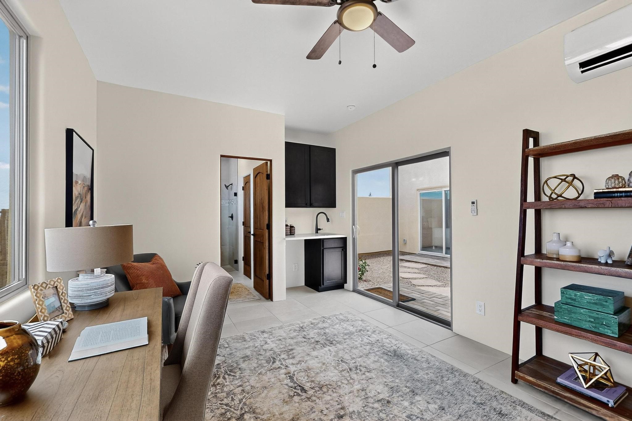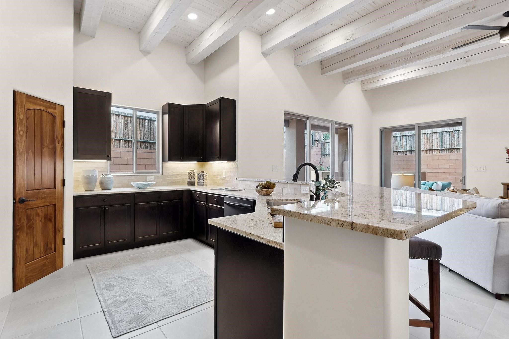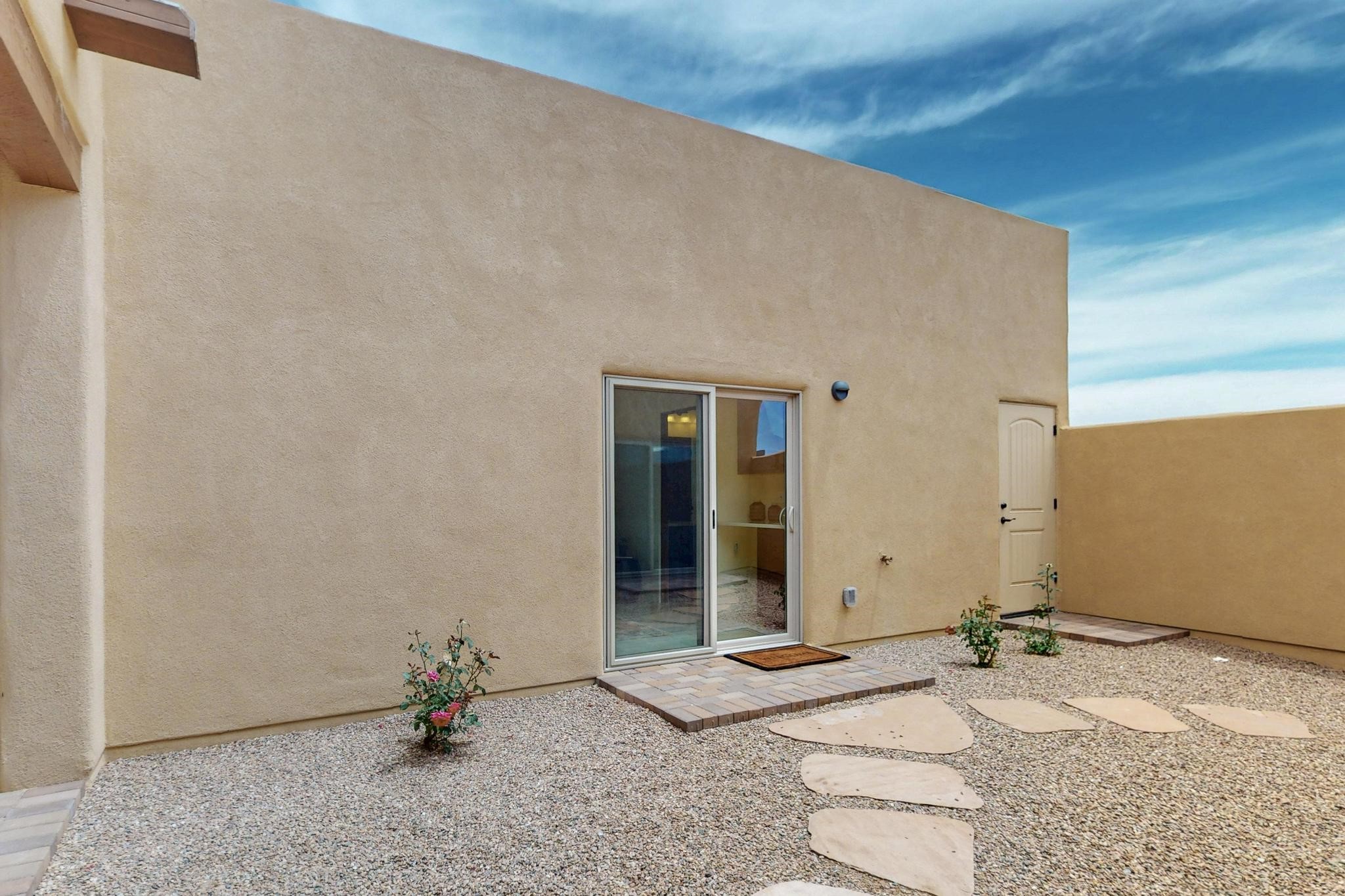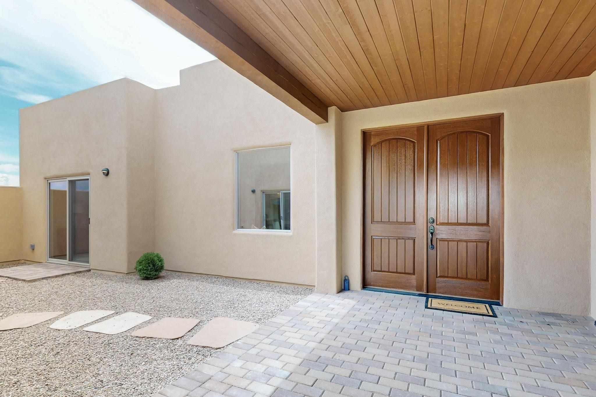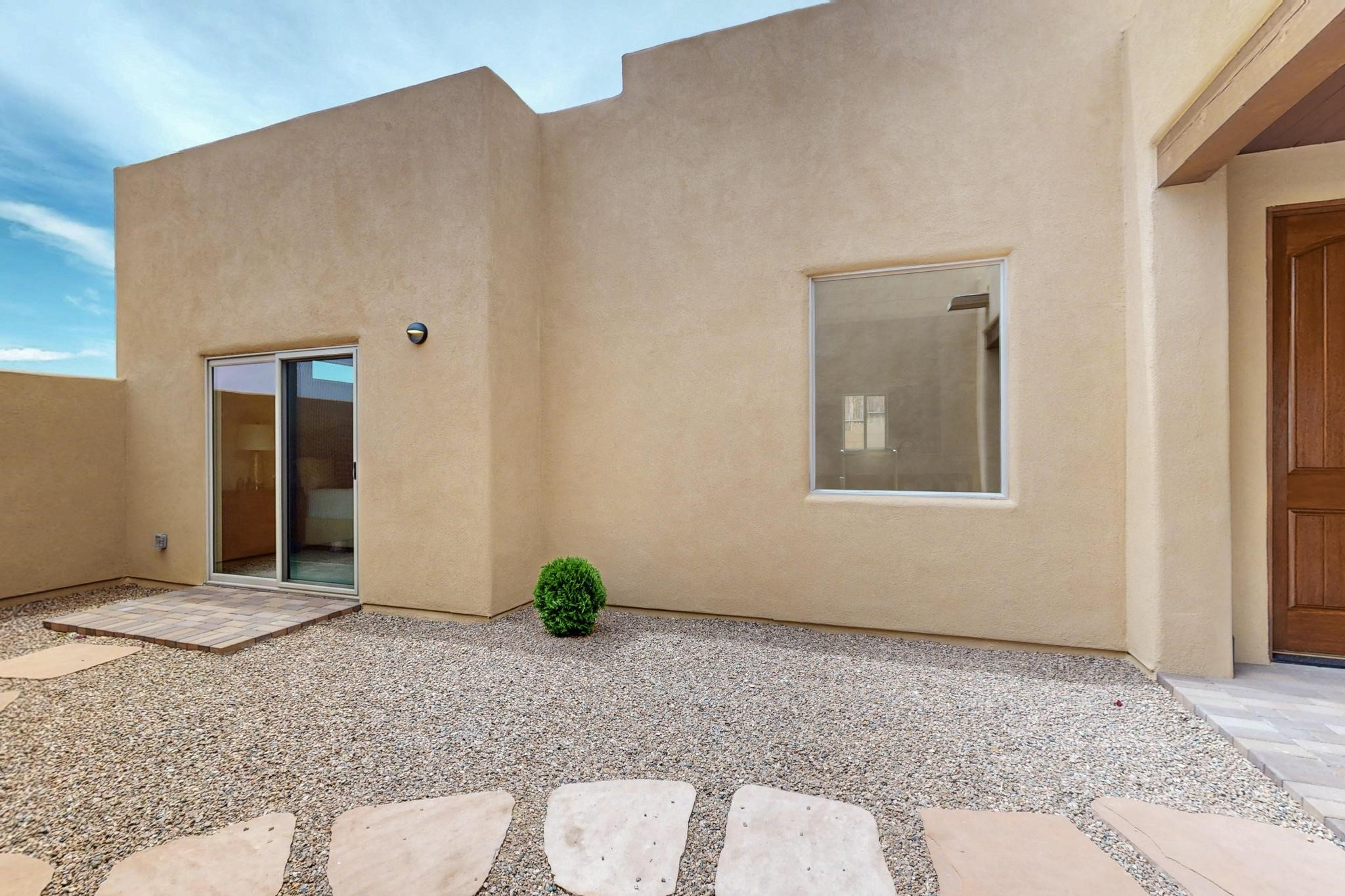 With a unique site plan and multiple pocket gardens and sitting areas,this delightful Zaguanita Plan with its rich and sophisticated colors is enteredthrough a lockable double-cedar and wrought iron gate into a covered entry (a"Zaguan") with brick pavers and an open private courtyard. To your left is aseparate living unit with a bedroom and three-quarter bath and its own HVAC unit, atankless hot water heater, tiled shower surrounds, ebony-colored cabinets withgrey quartz countertops, and a sink and an under-counter refrigerator. Themain entry leads to the formal entry with a lighted nicho and boveda ceiling. Tothe left is the owner's suite with a barn door entry to the master bath with alarge walk-in shower with euro-style shower fixtures and an overhead rainshower head. His-and-Hers closets are separated by a commode closet. Directlyahead of the entrance is the open living room with Pickling-white stained beamsand T&G planking offset with white quartz countertops, a kiva fireplace and anopen kitchen with an oversized counter. The kitchen and guest bedroom bothopen out to a covered portal that has a gas-fired kiva fireplace and brick pavers.To the right is the guest bedroom bath that can also serve as a powder room.The open kitchen has Smoked Gray color cabinets. All floors are tiled with lightgray porcelain planks. The exterior is a contemporary design with a TPO roof.The driveway is a colored stamped concrete design, and the insulated garageincludes an epoxy-coated floor.