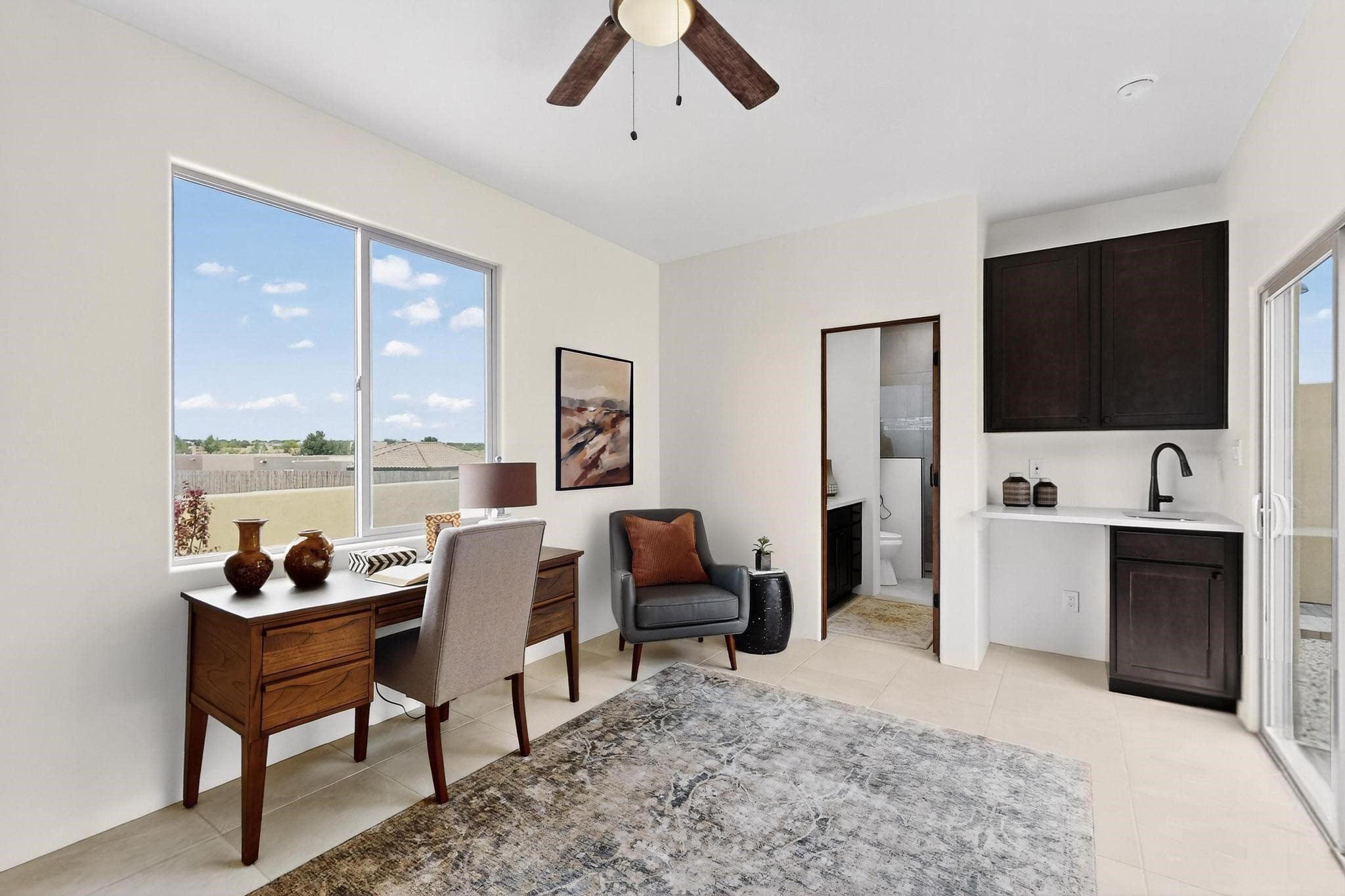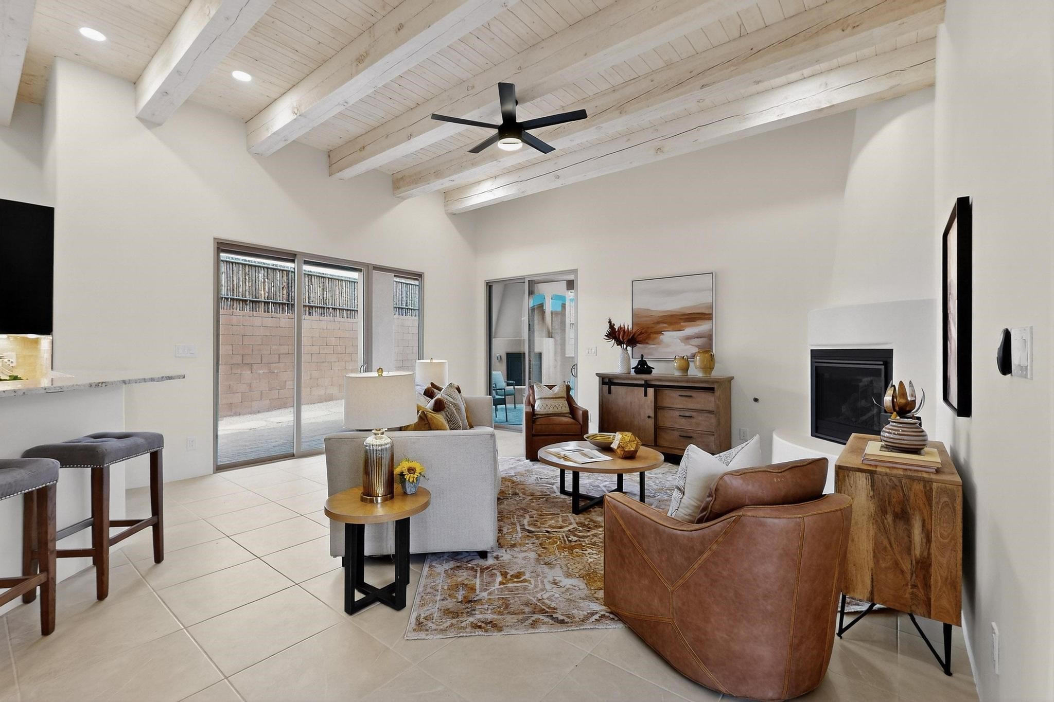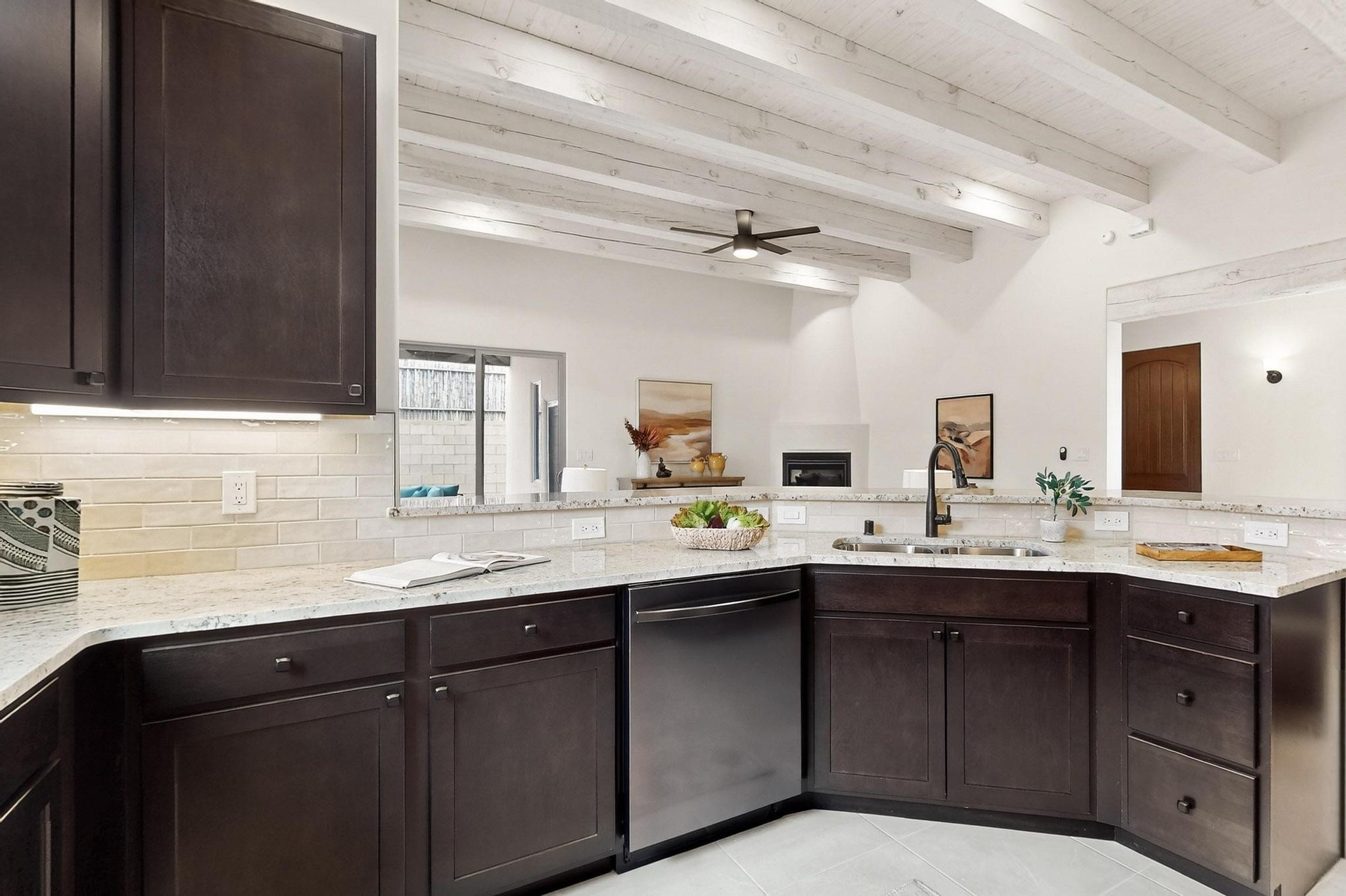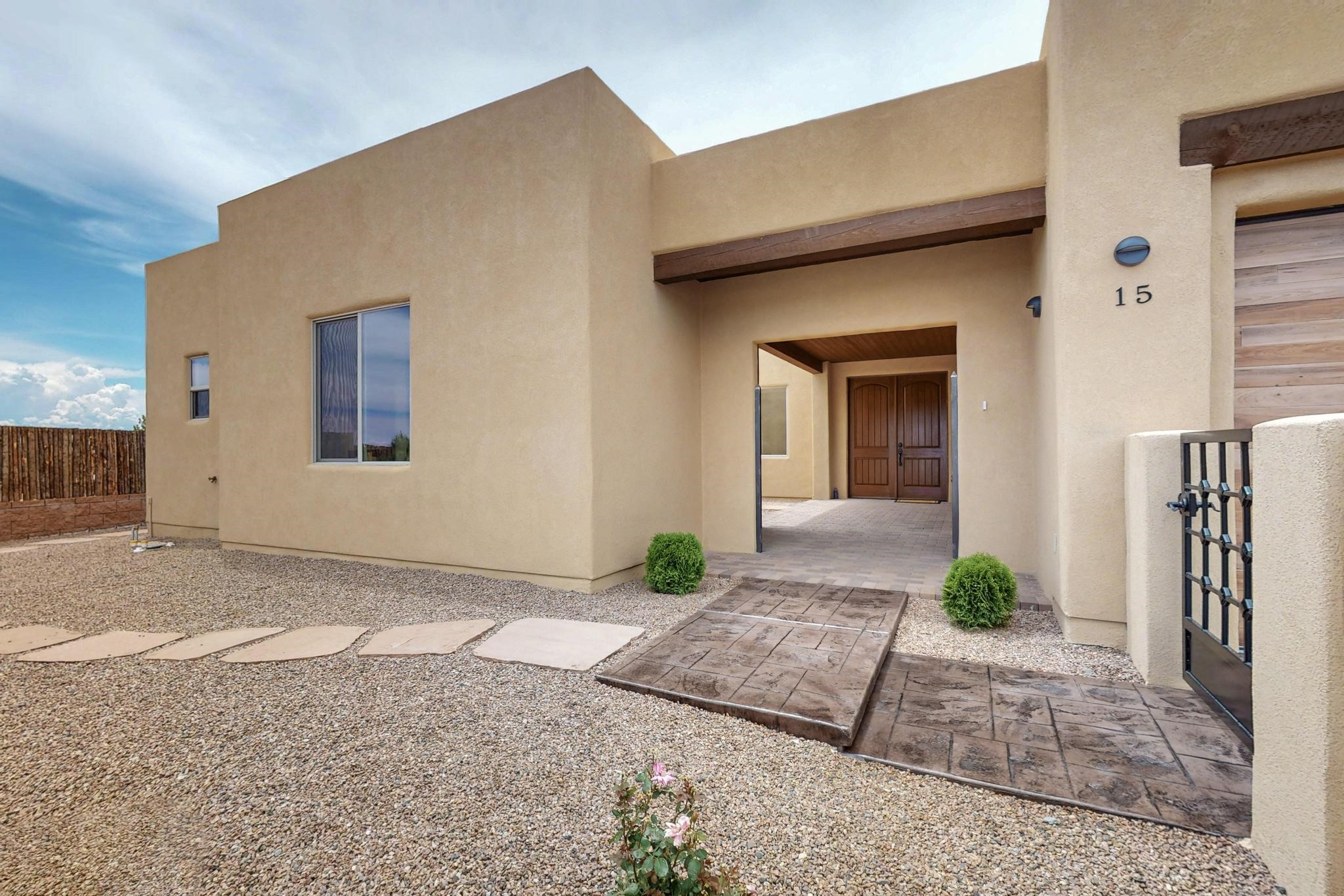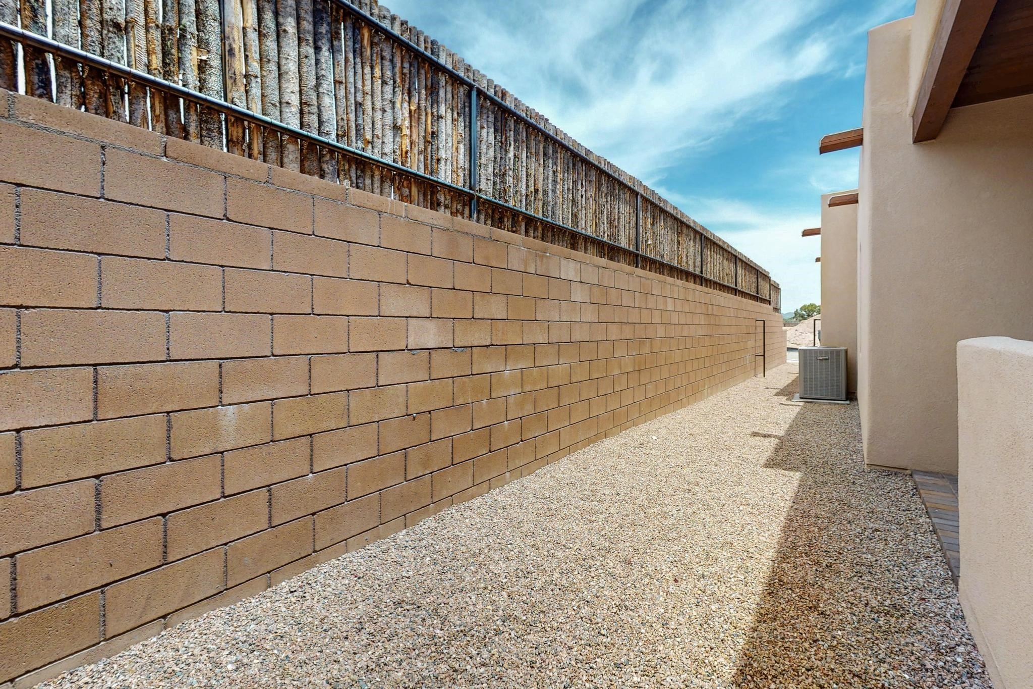 With a unique site plan and multiple pocket gardens and sitting areas,this delightful Zaguanita Plan with its rich and sophisticated colors is enteredthrough a lockable double-cedar and wrought iron gate into a covered entry (a"Zaguan") with brick pavers and an open private courtyard. To your left is aseparate living unit with a bedroom and three-quarter bath and its own HVAC unit, atankless hot water heater, tiled shower surrounds, ebony-colored cabinets withgrey quartz countertops, and a sink and an under-counter refrigerator. Themain entry leads to the formal entry with a lighted nicho and boveda ceiling. Tothe left is the owner's suite with a barn door entry to the master bath with alarge walk-in shower with euro-style shower fixtures and an overhead rainshower head. His-and-Hers closets are separated by a commode closet. Directlyahead of the entrance is the open living room with Pickling-white stained beamsand T&G planking offset with white quartz countertops, a kiva fireplace and anopen kitchen with an oversized counter. The kitchen and guest bedroom bothopen out to a covered portal that has a gas-fired kiva fireplace and brick pavers.To the right is the guest bedroom bath that can also serve as a powder room.The open kitchen has Smoked Gray color cabinets. All floors are tiled with lightgray porcelain planks. The exterior is a contemporary design with a TPO roof.The driveway is a colored stamped concrete design, and the insulated garageincludes an epoxy-coated floor.