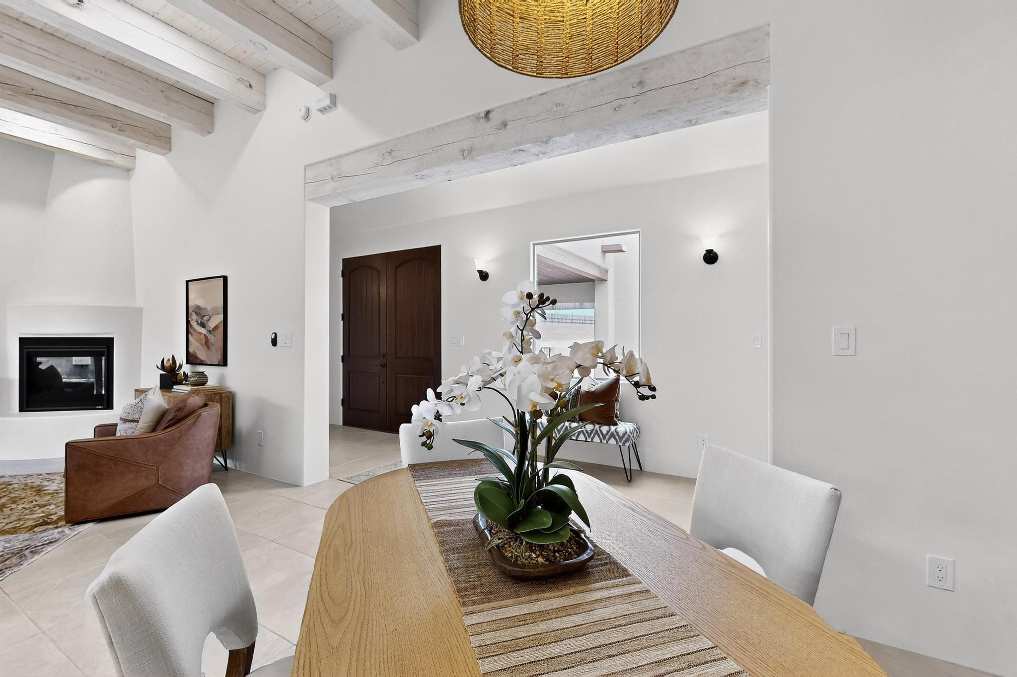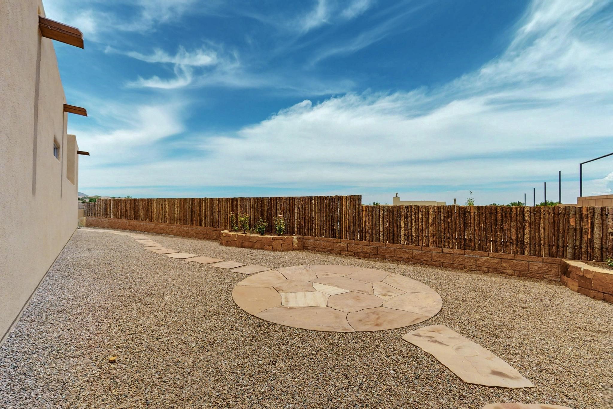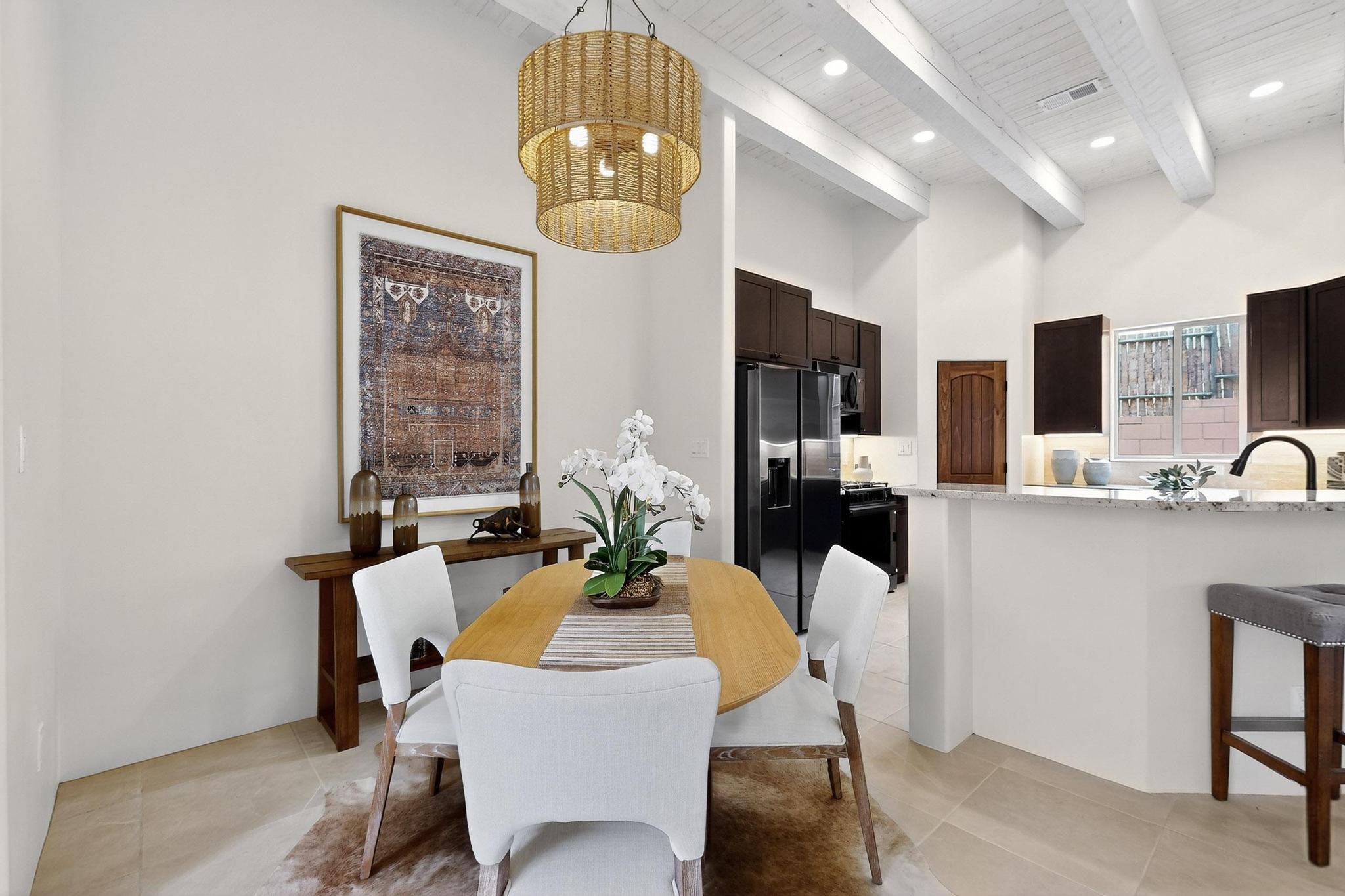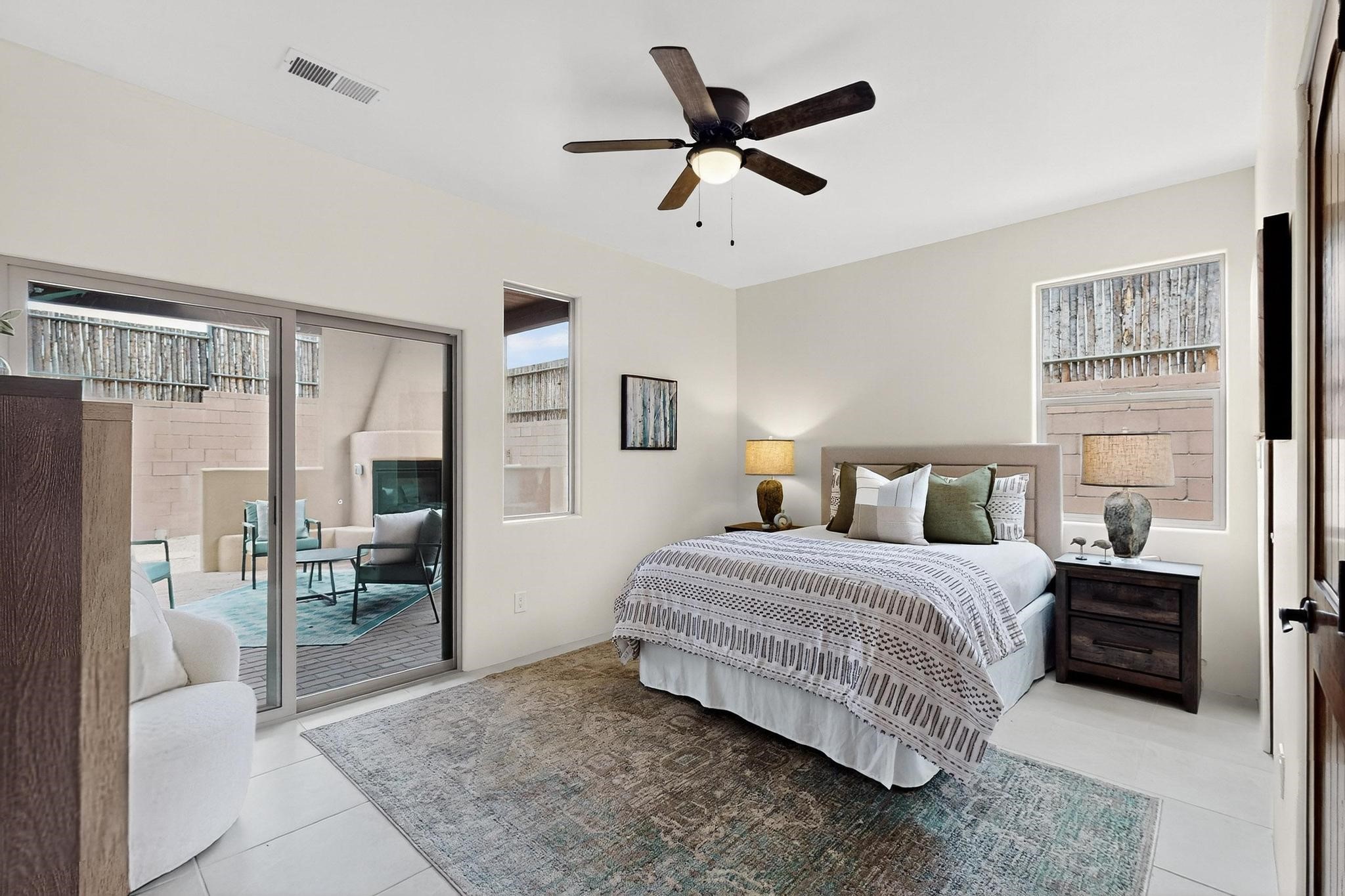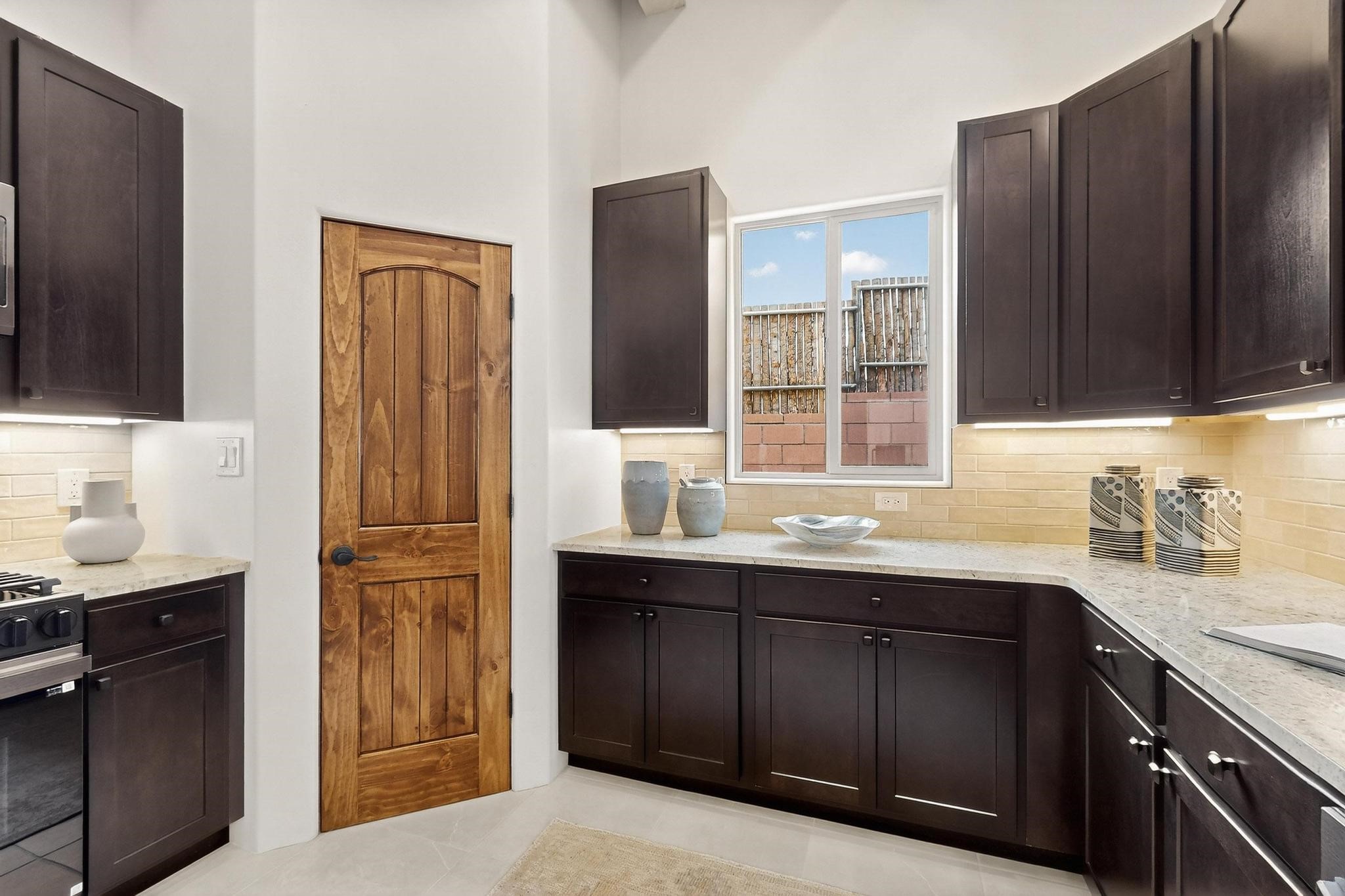 With a unique site plan and multiple pocket gardens and sitting areas,this delightful Zaguanita Plan with its rich and sophisticated colors is enteredthrough a lockable double-cedar and wrought iron gate into a covered entry (a"Zaguan") with brick pavers and an open private courtyard. To your left is aseparate living unit with a bedroom and three-quarter bath and its own HVAC unit, atankless hot water heater, tiled shower surrounds, ebony-colored cabinets withgrey quartz countertops, and a sink and an under-counter refrigerator. Themain entry leads to the formal entry with a lighted nicho and boveda ceiling. Tothe left is the owner's suite with a barn door entry to the master bath with alarge walk-in shower with euro-style shower fixtures and an overhead rainshower head. His-and-Hers closets are separated by a commode closet. Directlyahead of the entrance is the open living room with Pickling-white stained beamsand T&G planking offset with white quartz countertops, a kiva fireplace and anopen kitchen with an oversized counter. The kitchen and guest bedroom bothopen out to a covered portal that has a gas-fired kiva fireplace and brick pavers.To the right is the guest bedroom bath that can also serve as a powder room.The open kitchen has Smoked Gray color cabinets. All floors are tiled with lightgray porcelain planks. The exterior is a contemporary design with a TPO roof.The driveway is a colored stamped concrete design, and the insulated garageincludes an epoxy-coated floor.