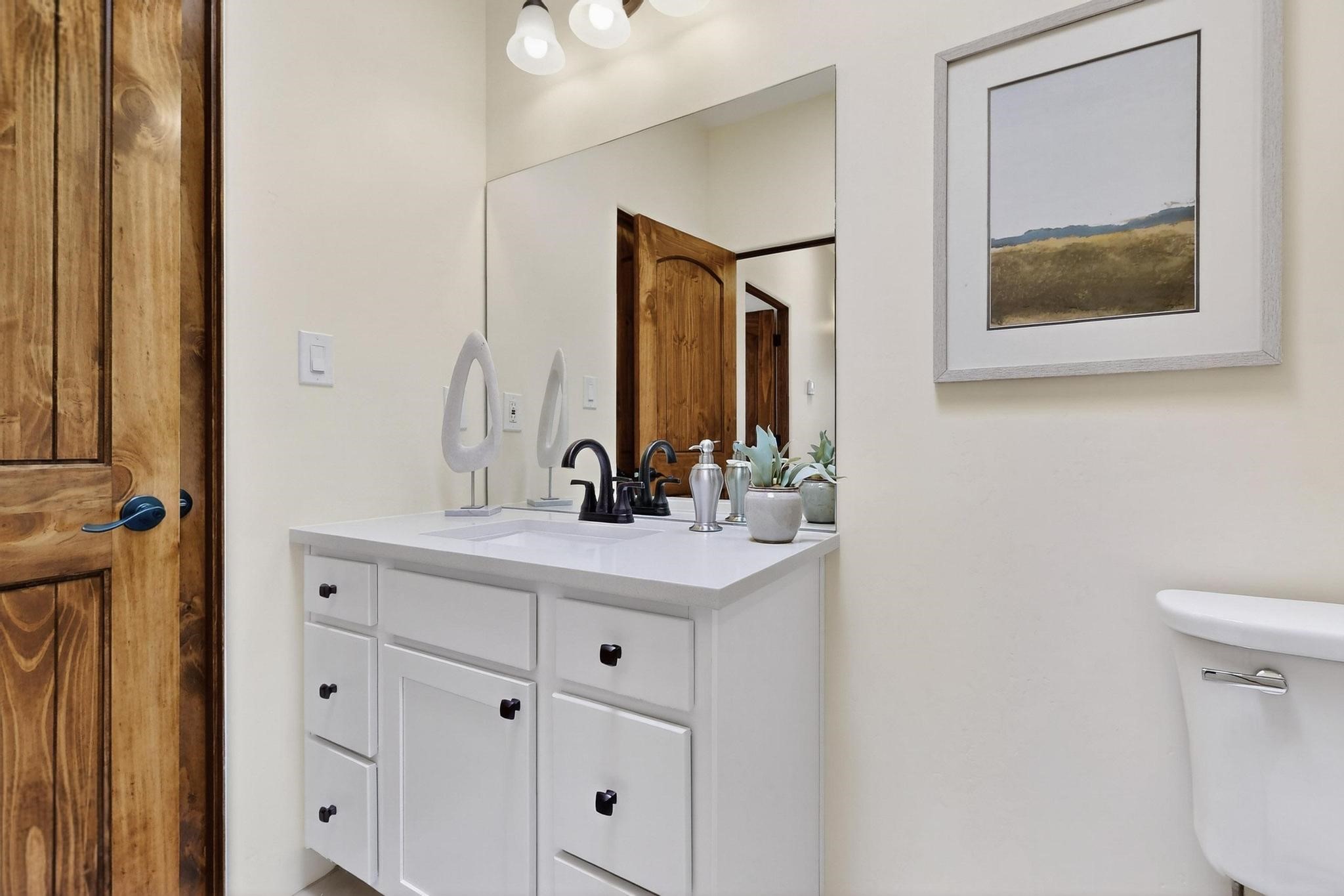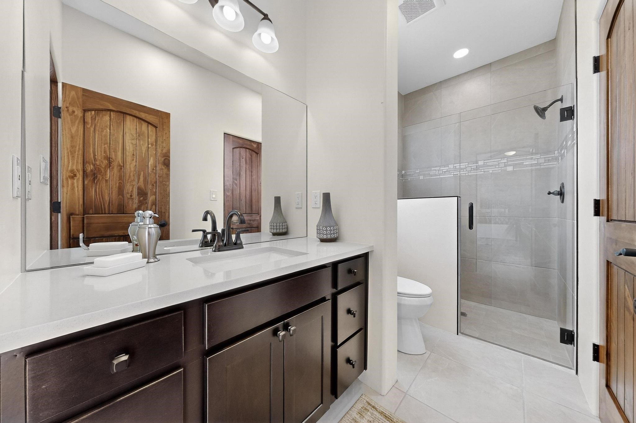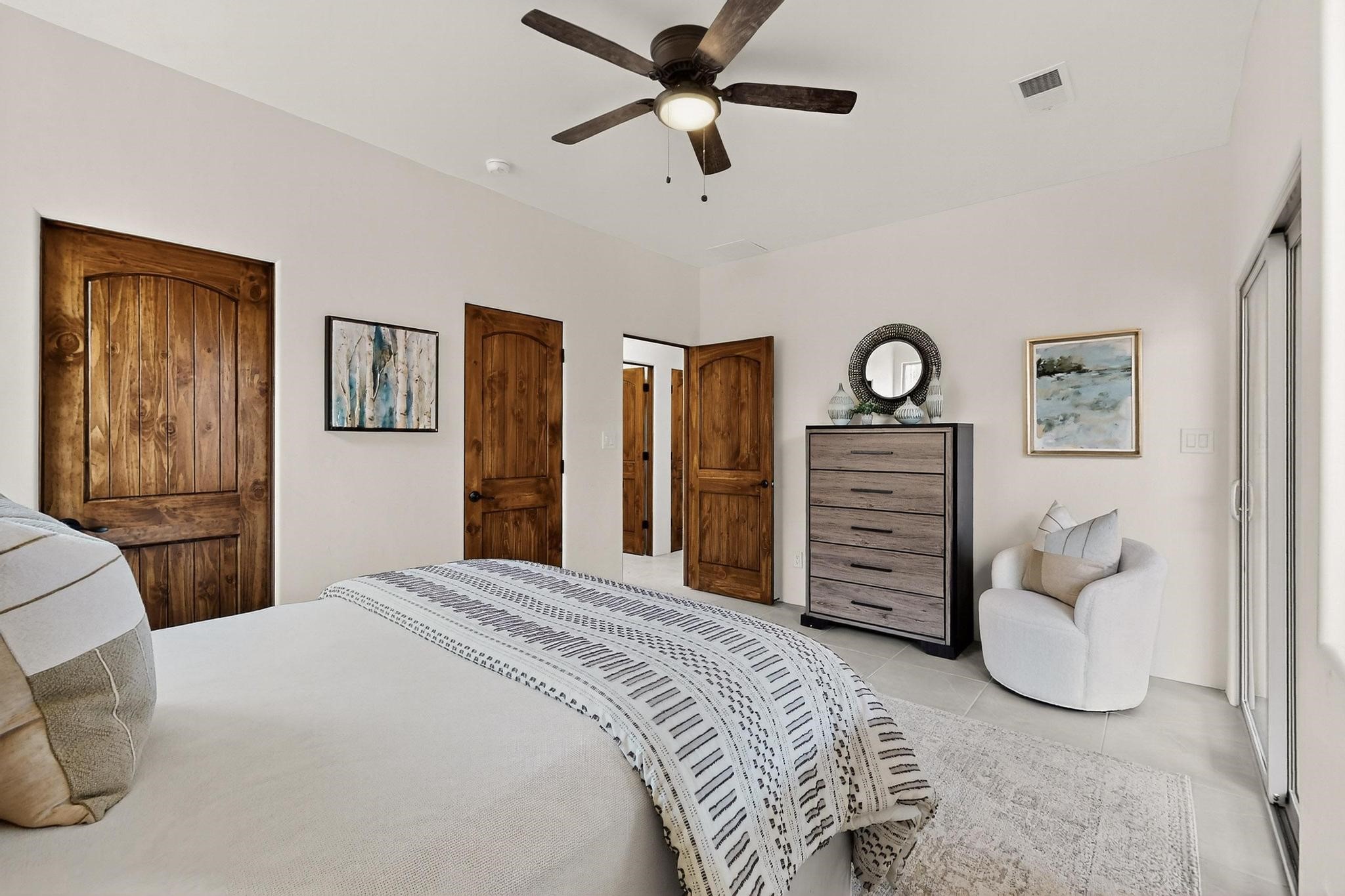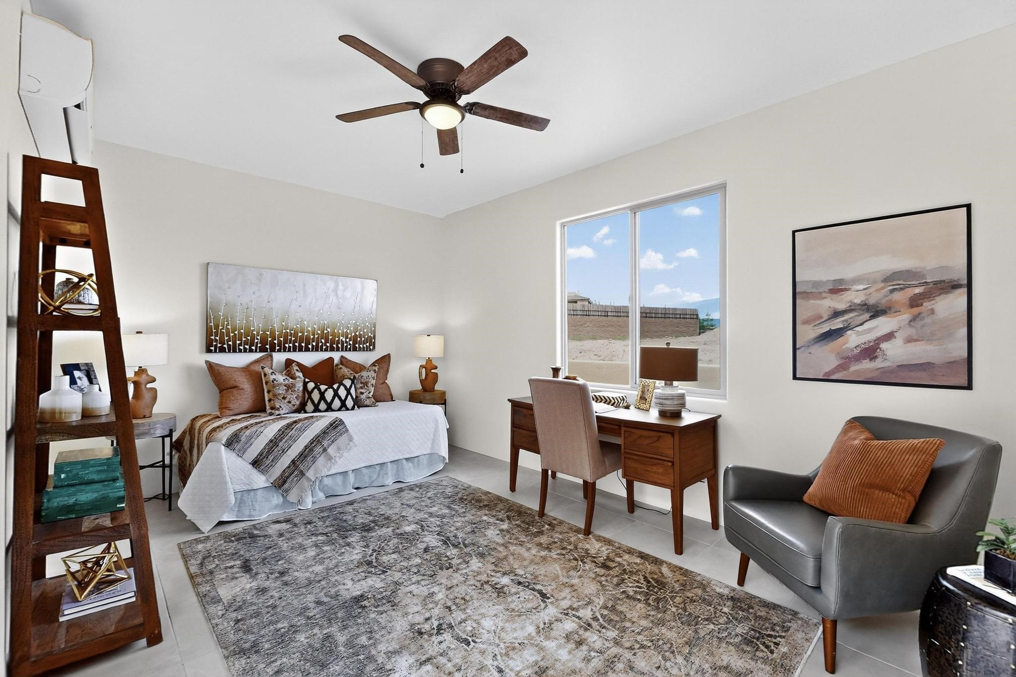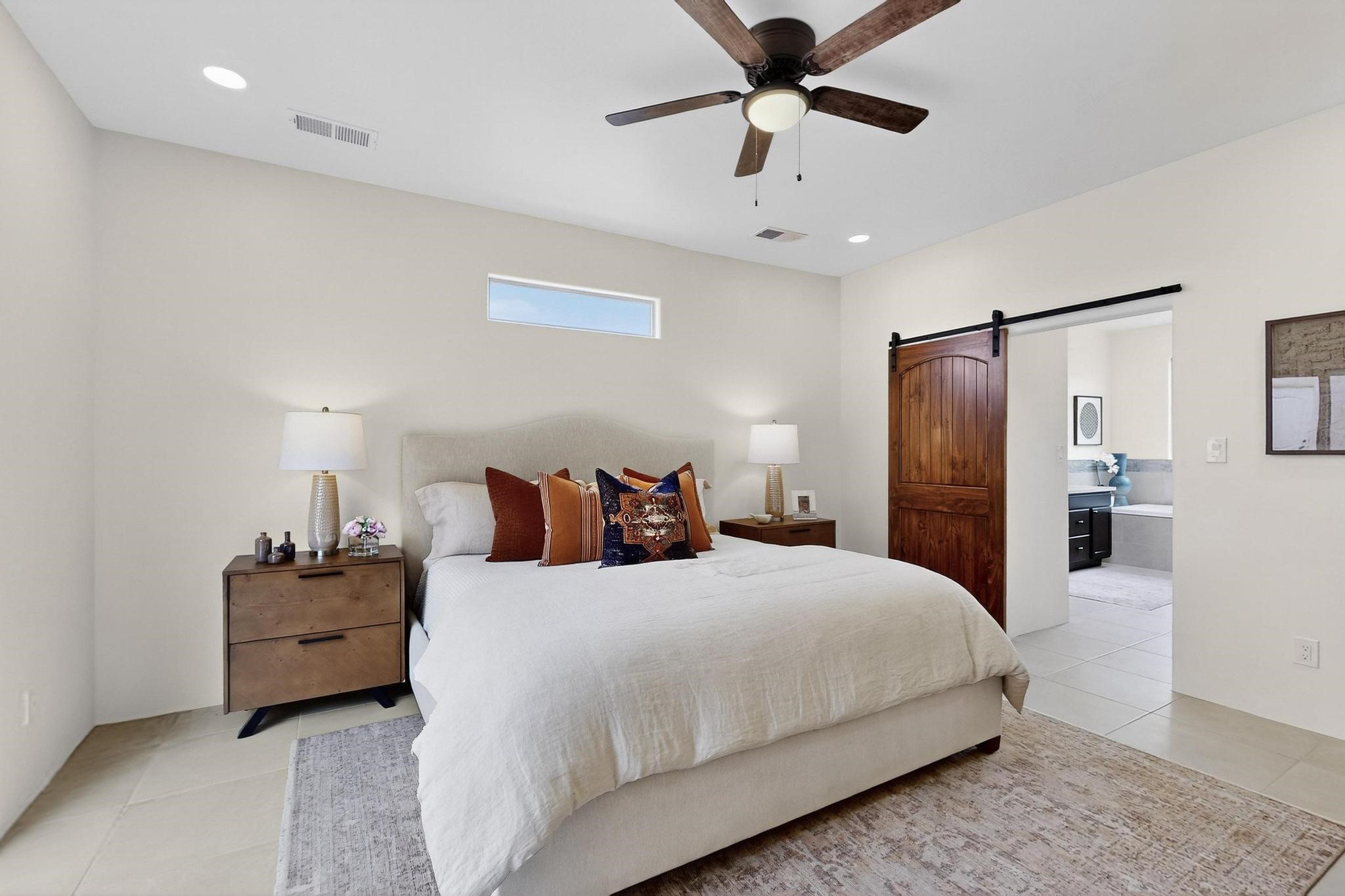With a unique site plan and multiple pocket gardens and sitting areas,this delightful Zaguanita Plan with its rich and sophisticated colors is enteredthrough a lockable double-cedar and wrought iron gate into a covered entry (a"Zaguan") with brick pavers and an open private courtyard. To your left is aseparate living unit with a bedroom and three-quarter bath and its own HVAC unit, atankless hot water heater, tiled shower surrounds, ebony-colored cabinets withgrey quartz countertops, and a sink and an under-counter refrigerator. Themain entry leads to the formal entry with a lighted nicho and boveda ceiling. Tothe left is the owner's suite with a barn door entry to the master bath with alarge walk-in shower with euro-style shower fixtures and an overhead rainshower head. His-and-Hers closets are separated by a commode closet. Directlyahead of the entrance is the open living room with Pickling-white stained beamsand T&G planking offset with white quartz countertops, a kiva fireplace and anopen kitchen with an oversized counter. The kitchen and guest bedroom bothopen out to a covered portal that has a gas-fired kiva fireplace and brick pavers.To the right is the guest bedroom bath that can also serve as a powder room.The open kitchen has Smoked Gray color cabinets. All floors are tiled with lightgray porcelain planks. The exterior is a contemporary design with a TPO roof.The driveway is a colored stamped concrete design, and the insulated garageincludes an epoxy-coated floor.