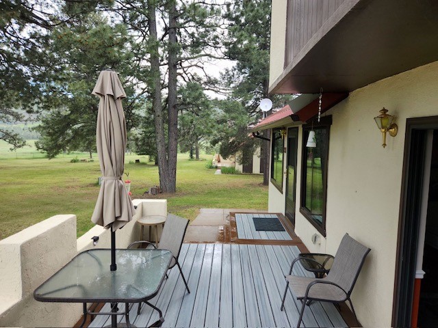 Charming condo in beautiful Pendaries Subdivision, in the mountains of northern New Mexico. Three bedroom, two and a half baths, with a two-car garage and all furnishings. Living room, kitchen, dining area, laundry room, and half bath are downstairs, with an LP gas fireplace in the living room. The front of the condo opens onto a large patio and a spacious view of a meadow in front of the mountains. An open staircase leads from the living room to three bedrooms upstairs. There are two more full baths upstairs, and the primary bedroom opens onto a large, covered balcony. Exterior repainted in 2024; new block wall around Trex patio; new electric panel; new oak tread and railing on staircase; new low-flow toilets. Desertgate high speed wireless internet. EV outlet in the garage. Sold furnished, so move in right away! Big enough for full-time living, or great for a second get-away home. HOA and covenants for the subdivision.