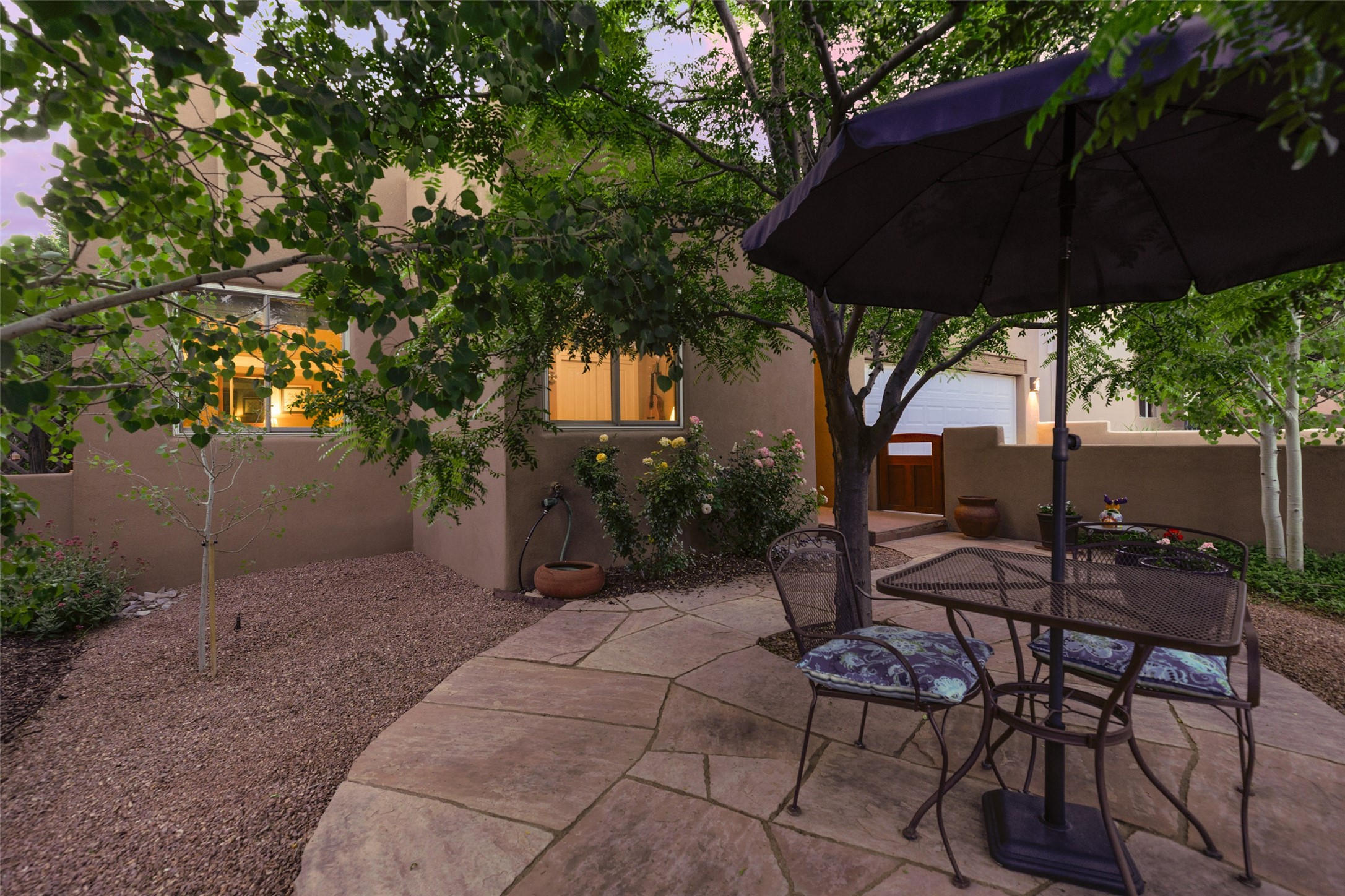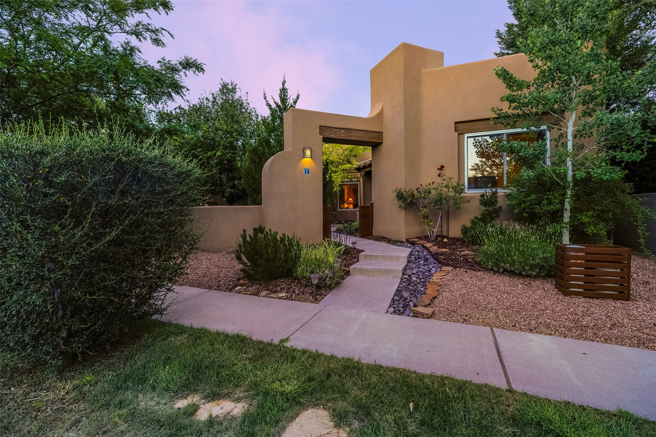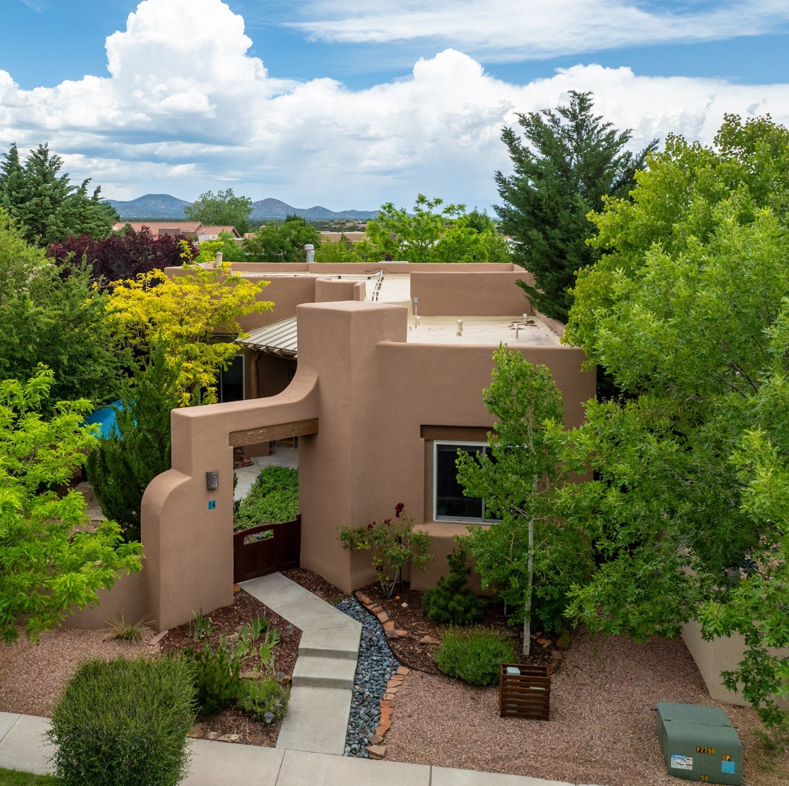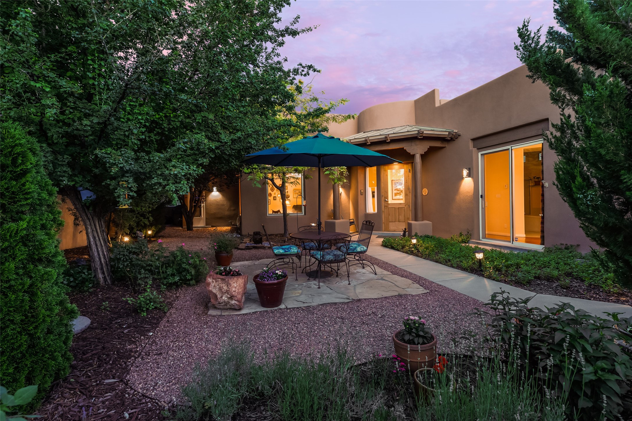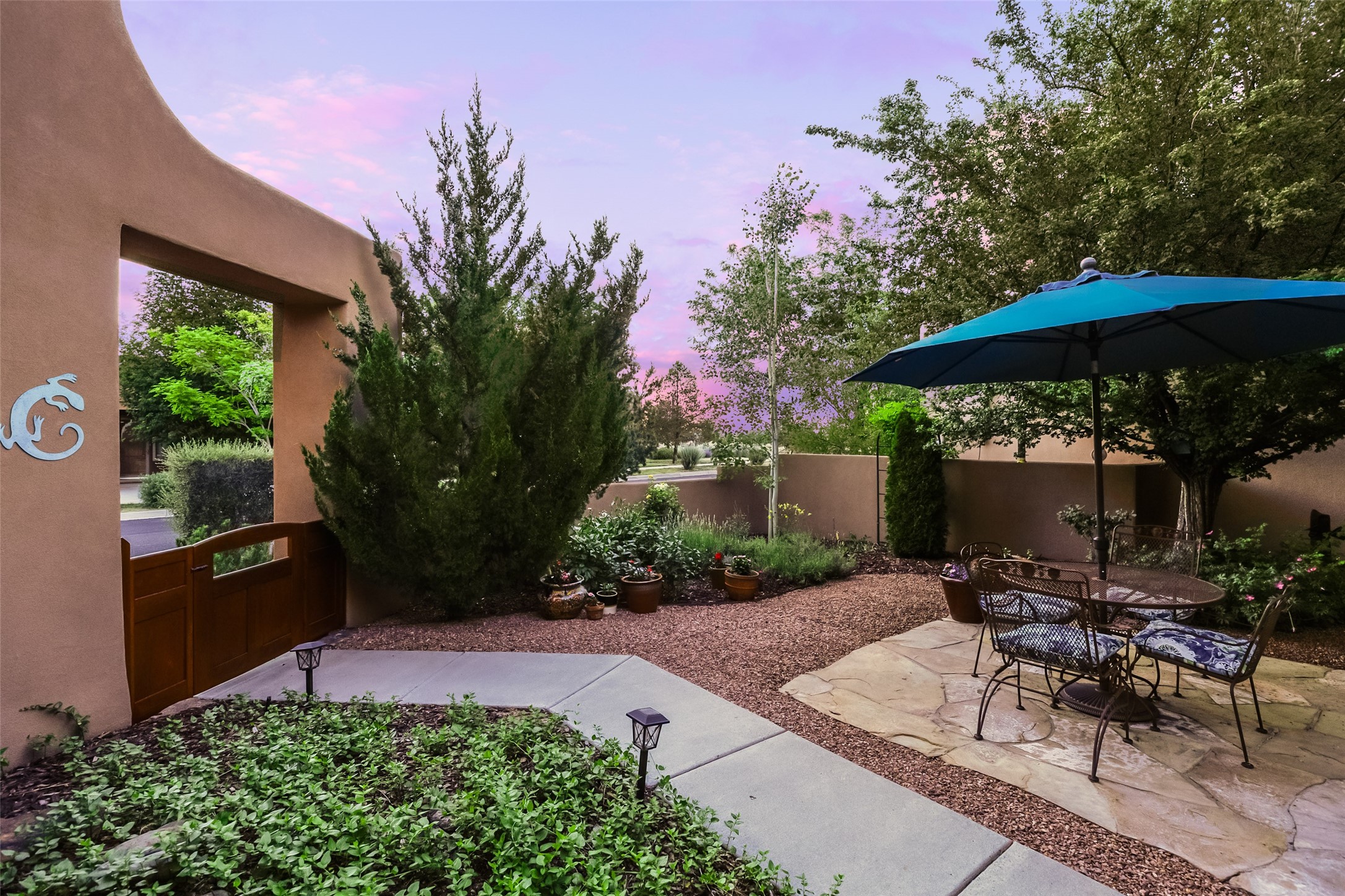 Popular Portal model on a quiet street in The Village at Rancho Viejo, this three bedroom, two bath single level home (no steps) has been meticulously maintained and updated by the current owner. The open concept living/dining area features a gas kiva fireplace, vigas, and 12 ft ceilings. The kitchen has a spacious island with seating, abundant cabinets, a cheery tile backsplash, a newer electric range (2024), a pantry and desk. Clerestory windows, recessed lights and under cabinet lighting provide ample light. There is great separation of the primary suite and guest bedrooms. The primary suite has a sliding door to the courtyard, a soaking tub and separate shower, spacious walk in closet, and dual sinks. The hall bath was updated in 2025 with a large tiled shower. The laundry room features a convenient utility sink and cabinets. Radiant in-floor heat, ceiling fans and three mini splits providing refrigerated air keep you comfortable year-round. The front and rear walled courtyards are beautifully landscaped with mature trees and plants, drip irrigation and a fountain in the front, offering privacy and tranquility. The living/dining rooms and bedrooms have gleaming hardwood floors (2020), and the bathrooms and kitchen are tiled (no carpet). The direct entry two car garage is drywalled and painted and has added lofted storage. Improvements include newer Andersen windows (2015) and a full restucco (2020). Rancho Viejo has miles of paved trails and 50 percent of the community is preserved as natural open space and parks.