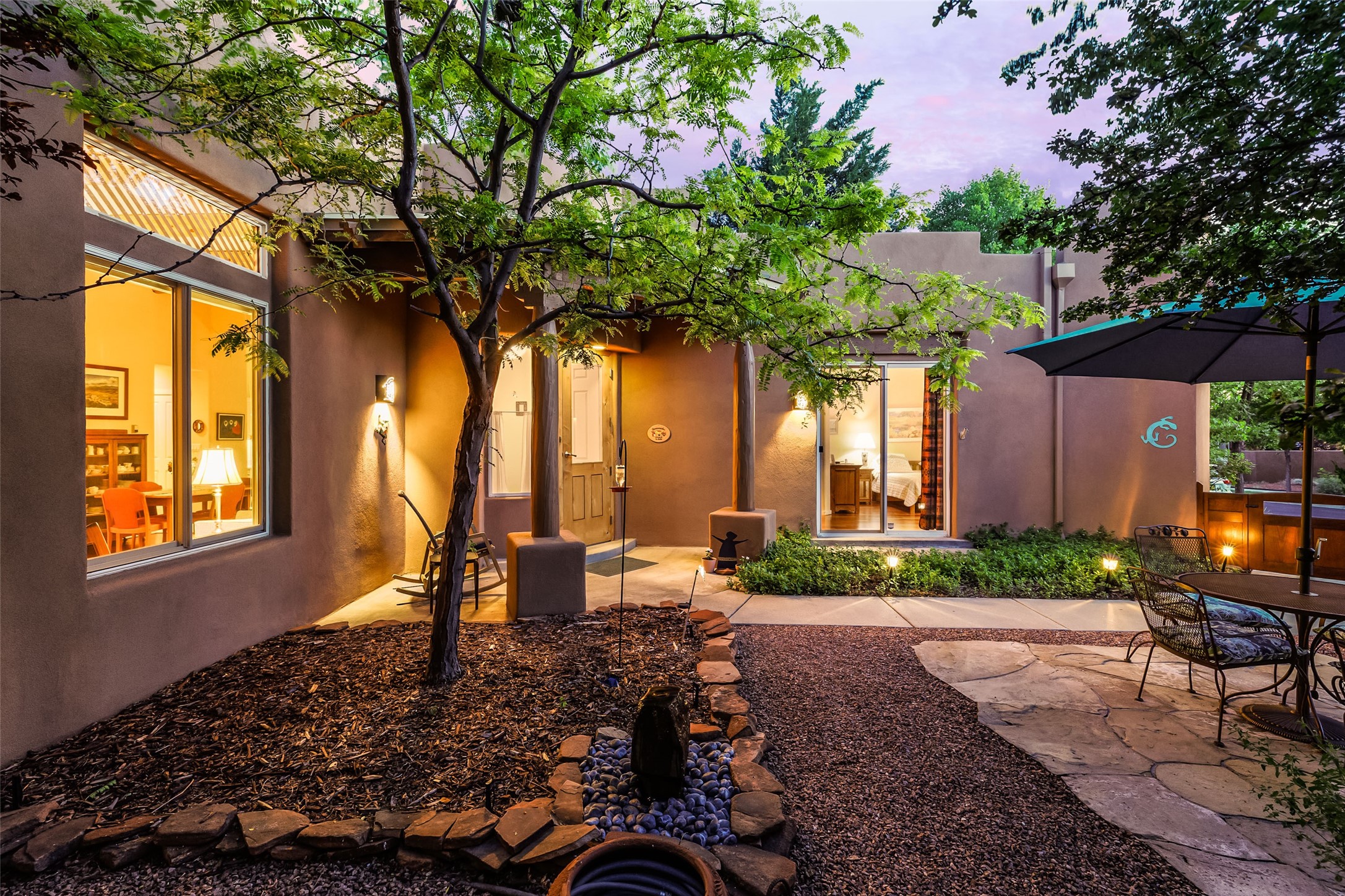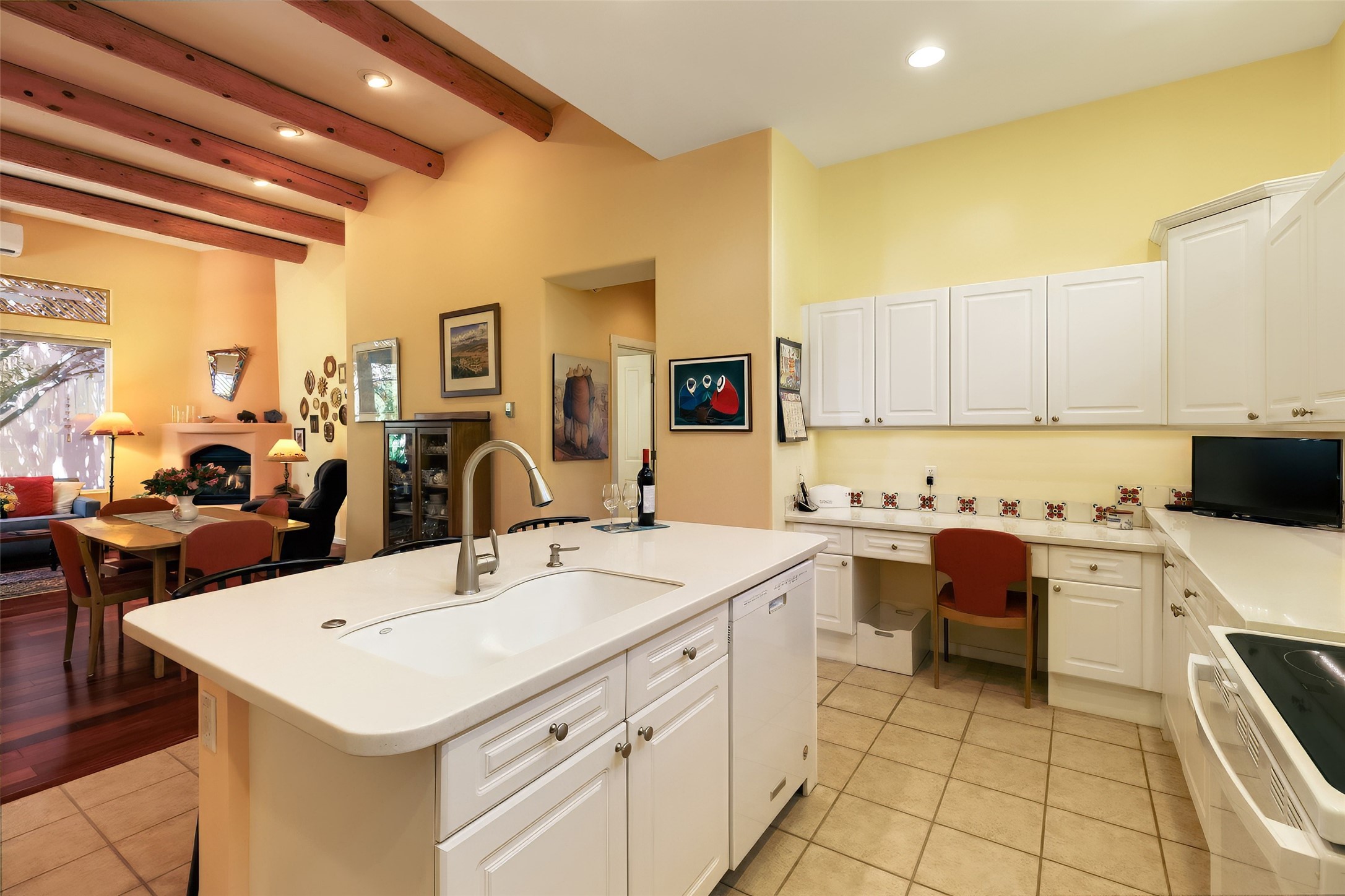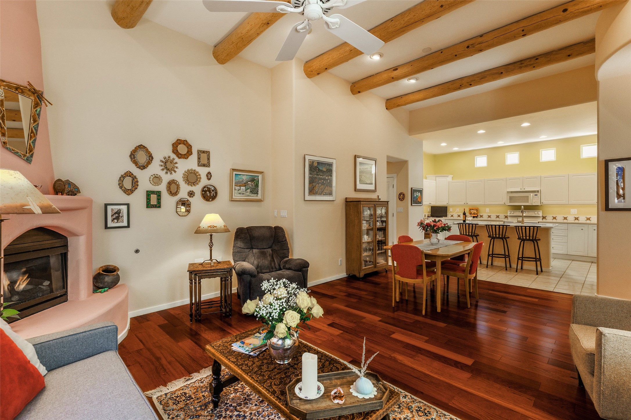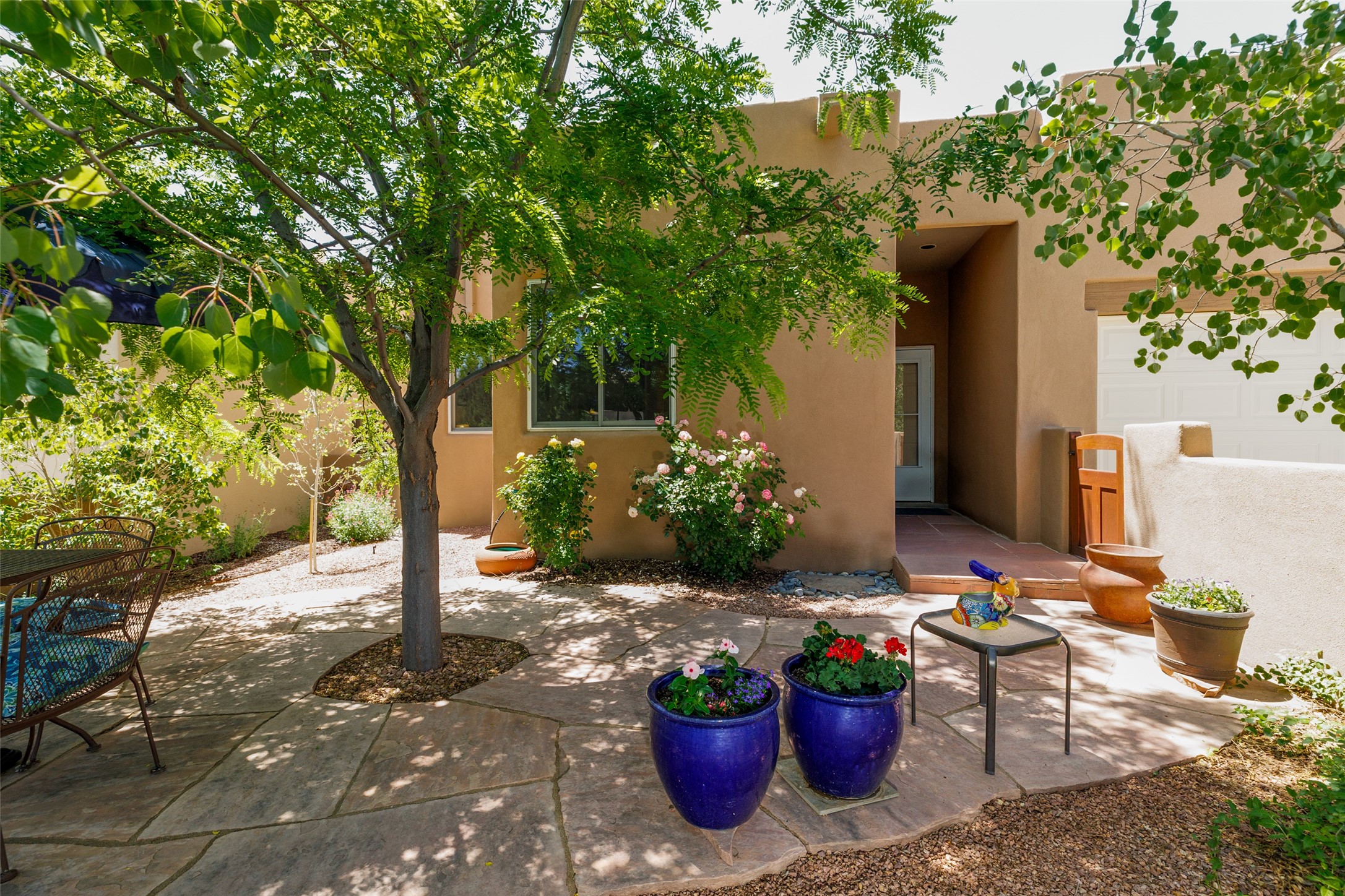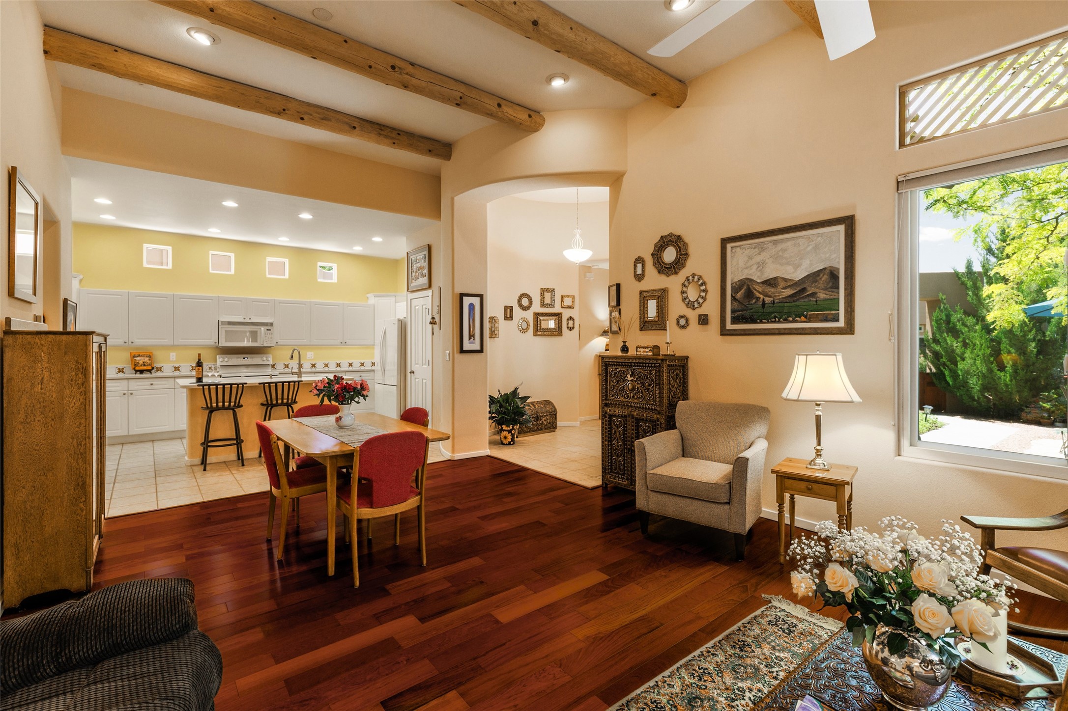 Popular Portal model on a quiet street in The Village at Rancho Viejo, this three bedroom, two bath single level home (no steps) has been meticulously maintained and updated by the current owner. The open concept living/dining area features a gas kiva fireplace, vigas, and 12 ft ceilings. The kitchen has a spacious island with seating, abundant cabinets, a cheery tile backsplash, a newer electric range (2024), a pantry and desk. Clerestory windows, recessed lights and under cabinet lighting provide ample light. There is great separation of the primary suite and guest bedrooms. The primary suite has a sliding door to the courtyard, a soaking tub and separate shower, spacious walk in closet, and dual sinks. The hall bath was updated in 2025 with a large tiled shower. The laundry room features a convenient utility sink and cabinets. Radiant in-floor heat, ceiling fans and three mini splits providing refrigerated air keep you comfortable year-round. The front and rear walled courtyards are beautifully landscaped with mature trees and plants, drip irrigation and a fountain in the front, offering privacy and tranquility. The living/dining rooms and bedrooms have gleaming hardwood floors (2020), and the bathrooms and kitchen are tiled (no carpet). The direct entry two car garage is drywalled and painted and has added lofted storage. Improvements include newer Andersen windows (2015) and a full restucco (2020). Rancho Viejo has miles of paved trails and 50 percent of the community is preserved as natural open space and parks.
