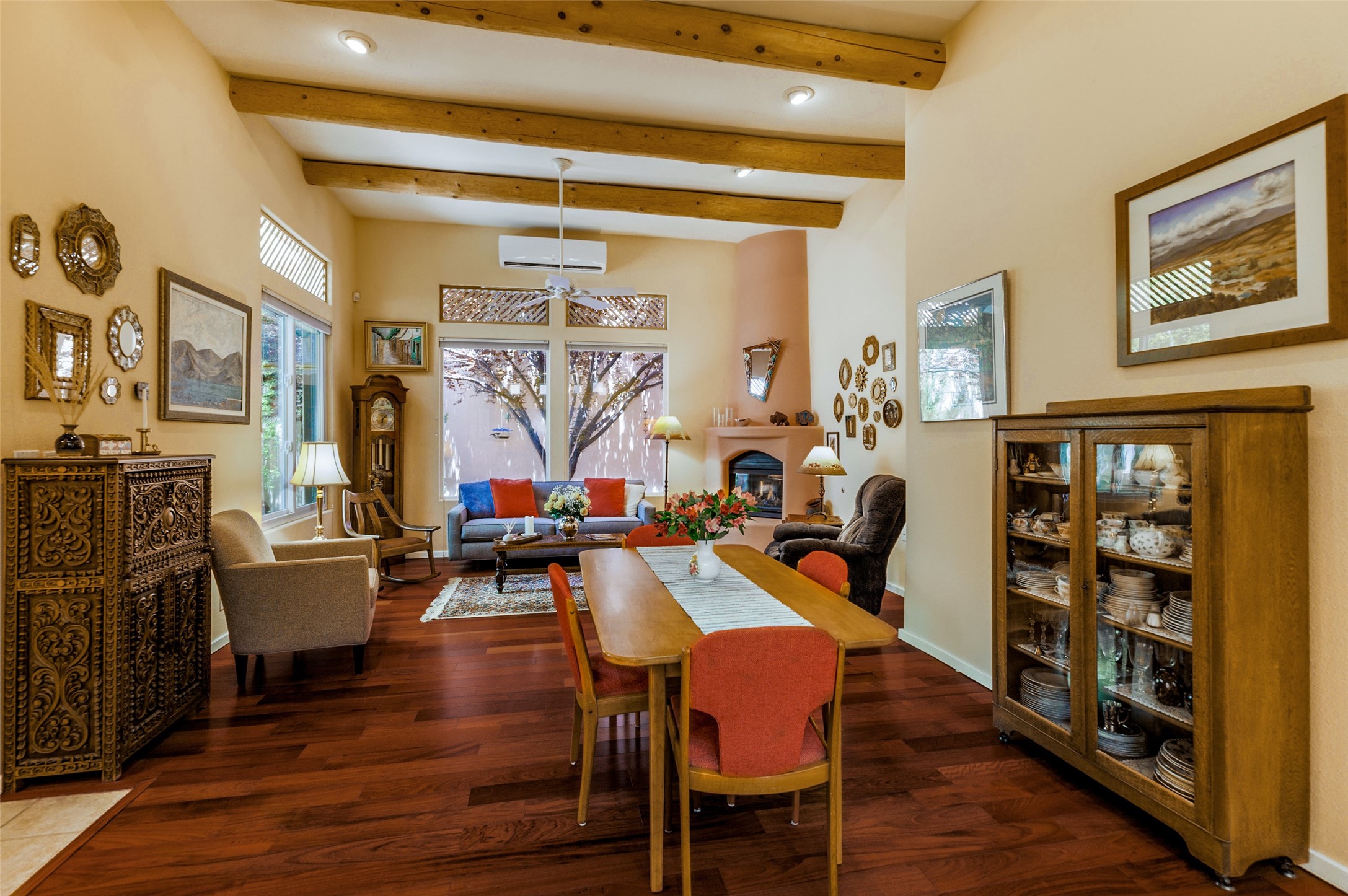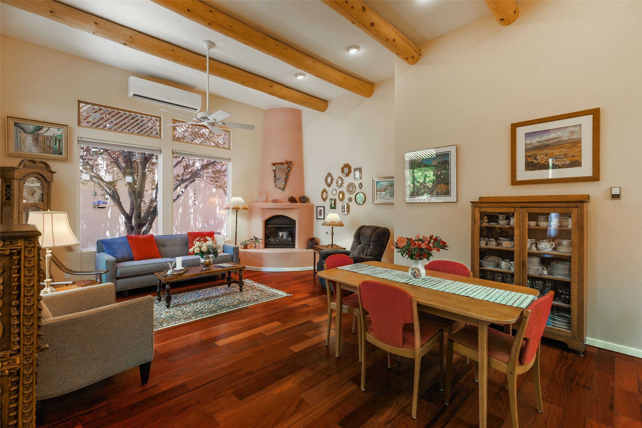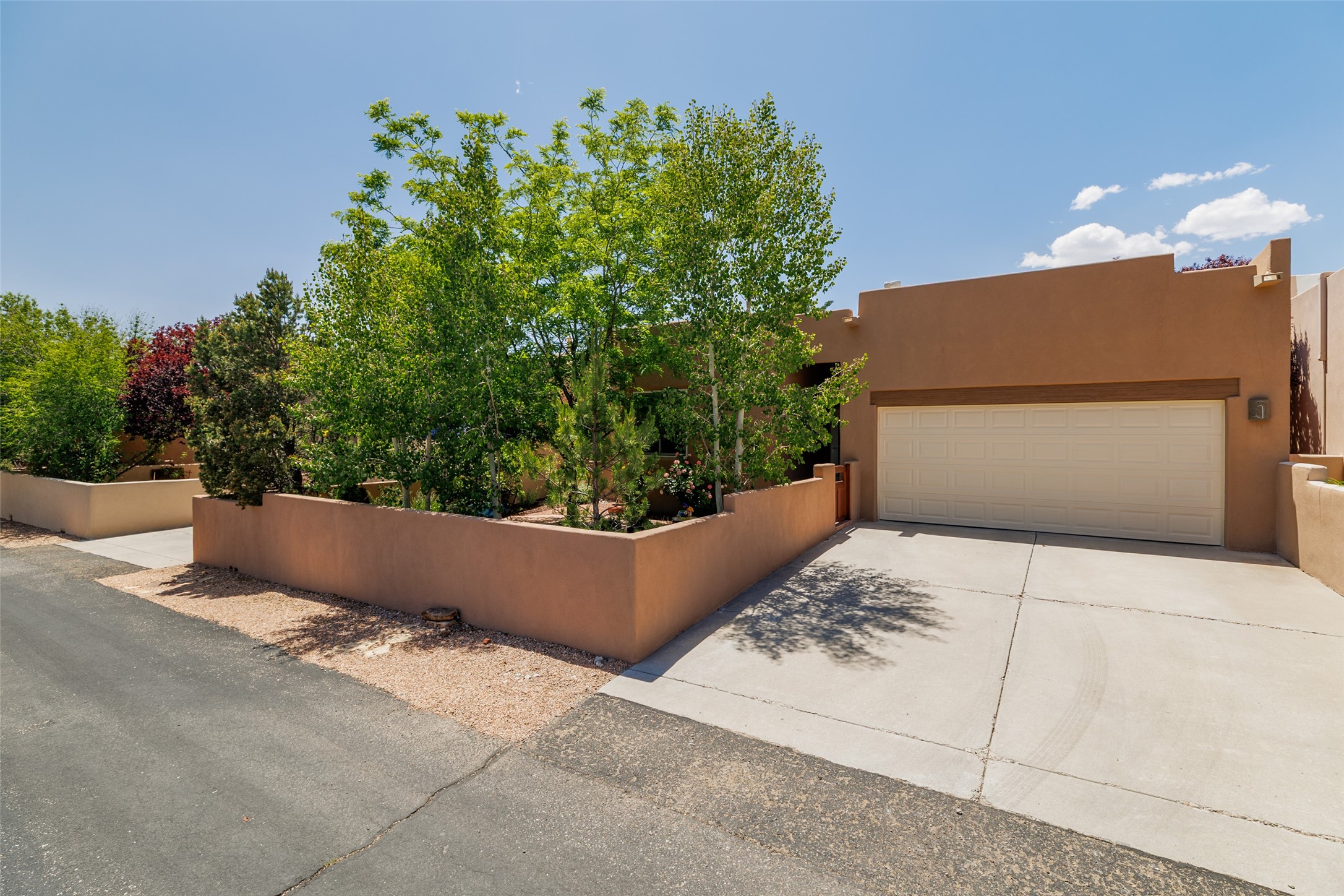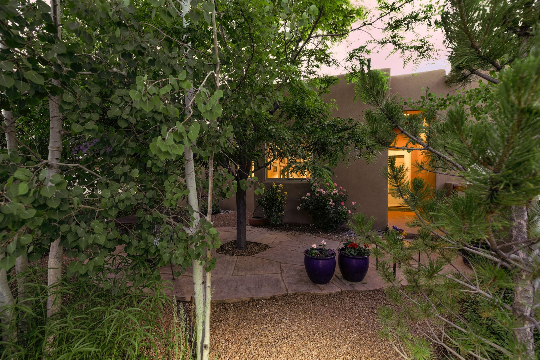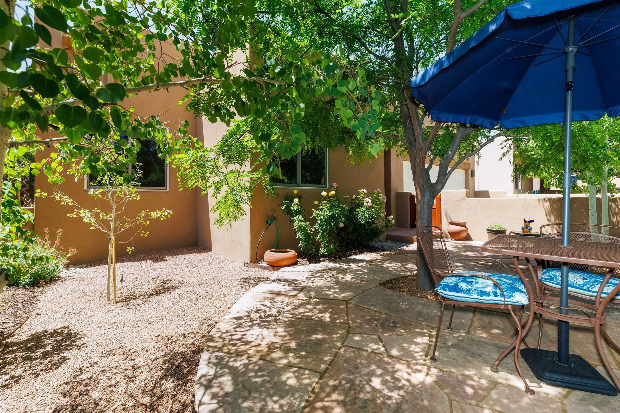 Popular Portal model on a quiet street in The Village at Rancho Viejo, this three bedroom, two bath single level home (no steps) has been meticulously maintained and updated by the current owner. The open concept living/dining area features a gas kiva fireplace, vigas, and 12 ft ceilings. The kitchen has a spacious island with seating, abundant cabinets, a cheery tile backsplash, a newer electric range (2024), a pantry and desk. Clerestory windows, recessed lights and under cabinet lighting provide ample light. There is great separation of the primary suite and guest bedrooms. The primary suite has a sliding door to the courtyard, a soaking tub and separate shower, spacious walk in closet, and dual sinks. The hall bath was updated in 2025 with a large tiled shower. The laundry room features a convenient utility sink and cabinets. Radiant in-floor heat, ceiling fans and three mini splits providing refrigerated air keep you comfortable year-round. The front and rear walled courtyards are beautifully landscaped with mature trees and plants, drip irrigation and a fountain in the front, offering privacy and tranquility. The living/dining rooms and bedrooms have gleaming hardwood floors (2020), and the bathrooms and kitchen are tiled (no carpet). The direct entry two car garage is drywalled and painted and has added lofted storage. Improvements include newer Andersen windows (2015) and a full restucco (2020). Rancho Viejo has miles of paved trails and 50 percent of the community is preserved as natural open space and parks.