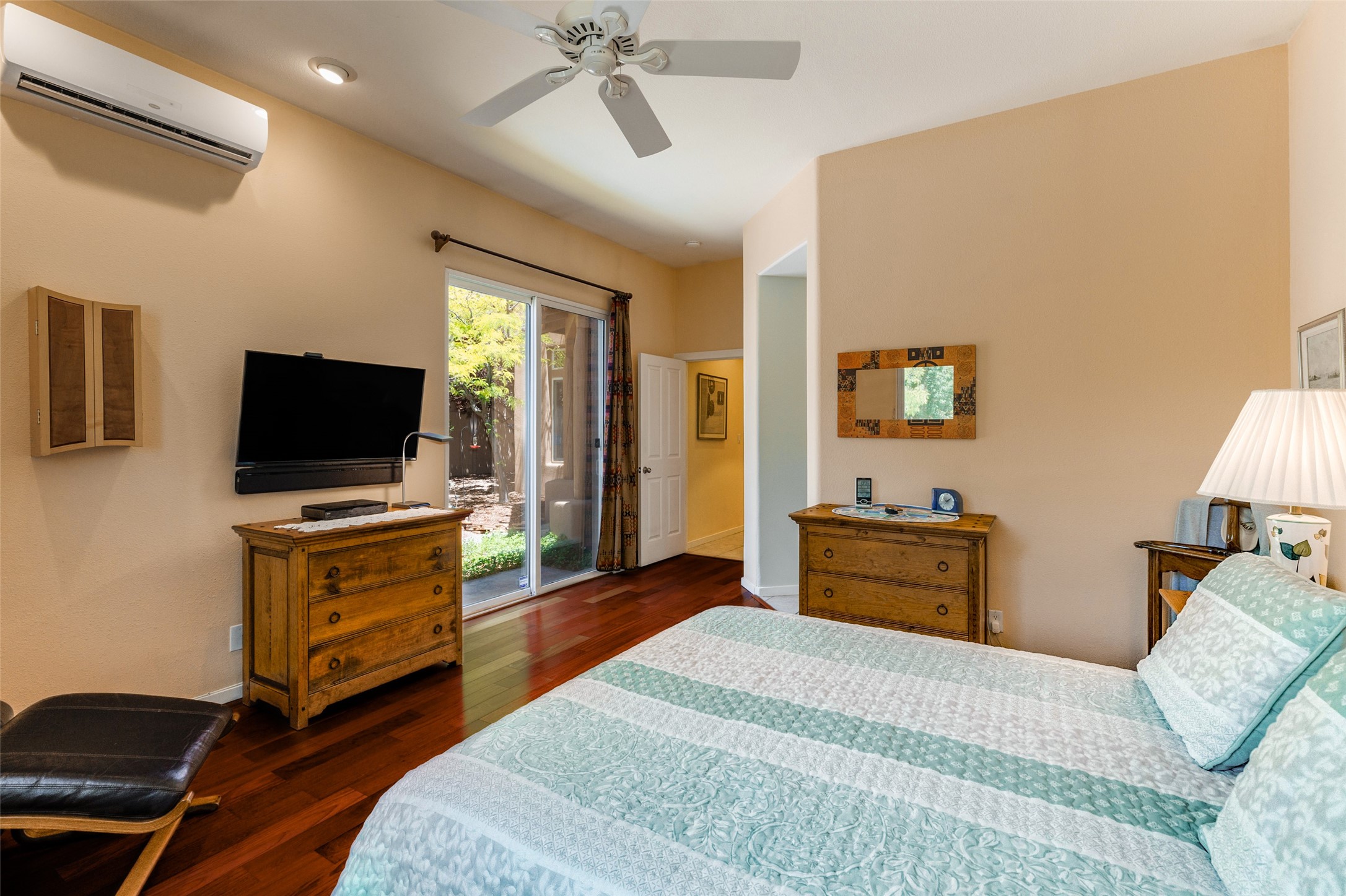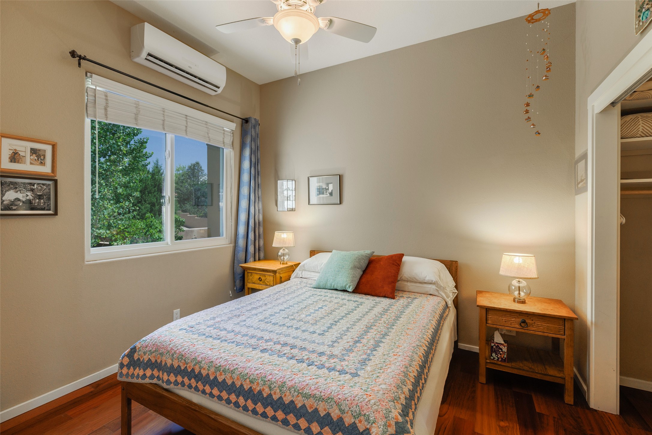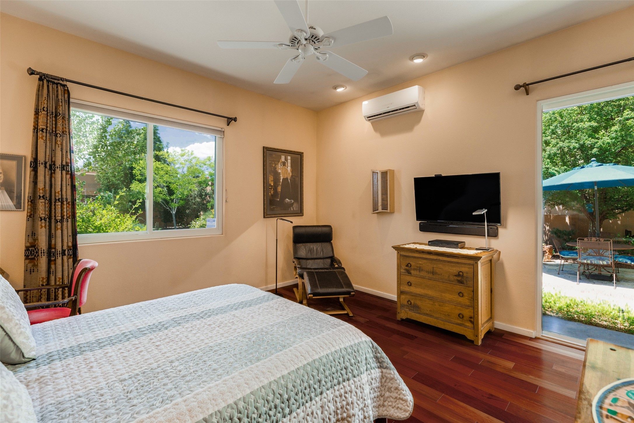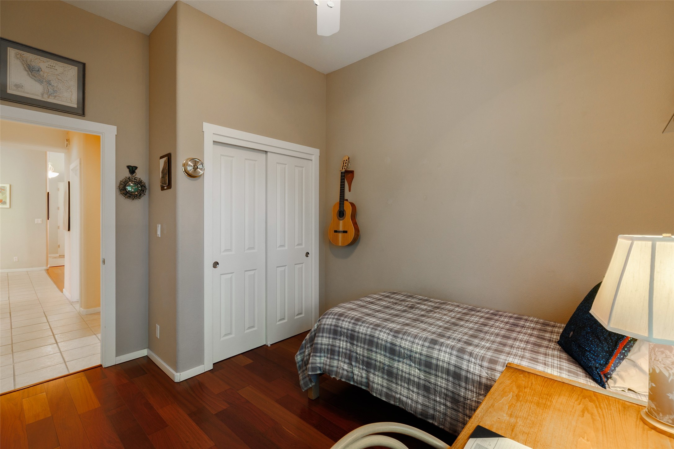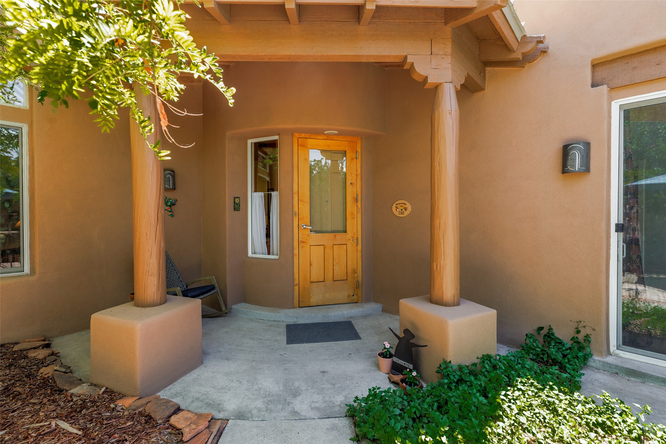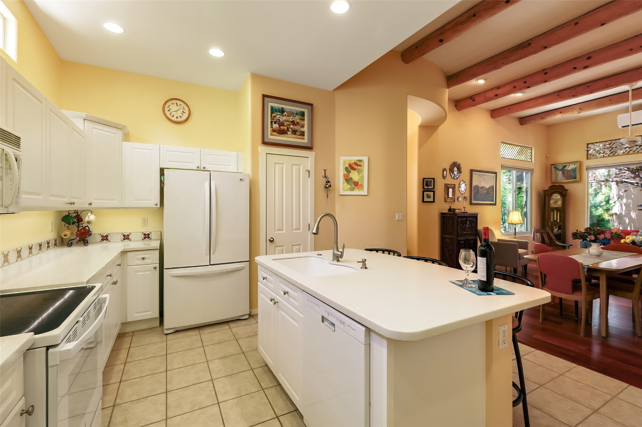 Popular Portal model on a quiet street in The Village at Rancho Viejo, this three bedroom, two bath single level home (no steps) has been meticulously maintained and updated by the current owner. The open concept living/dining area features a gas kiva fireplace, vigas, and 12 ft ceilings. The kitchen has a spacious island with seating, abundant cabinets, a cheery tile backsplash, a newer electric range (2024), a pantry and desk. Clerestory windows, recessed lights and under cabinet lighting provide ample light. There is great separation of the primary suite and guest bedrooms. The primary suite has a sliding door to the courtyard, a soaking tub and separate shower, spacious walk in closet, and dual sinks. The hall bath was updated in 2025 with a large tiled shower. The laundry room features a convenient utility sink and cabinets. Radiant in-floor heat, ceiling fans and three mini splits providing refrigerated air keep you comfortable year-round. The front and rear walled courtyards are beautifully landscaped with mature trees and plants, drip irrigation and a fountain in the front, offering privacy and tranquility. The living/dining rooms and bedrooms have gleaming hardwood floors (2020), and the bathrooms and kitchen are tiled (no carpet). The direct entry two car garage is drywalled and painted and has added lofted storage. Improvements include newer Andersen windows (2015) and a full restucco (2020). Rancho Viejo has miles of paved trails and 50 percent of the community is preserved as natural open space and parks.