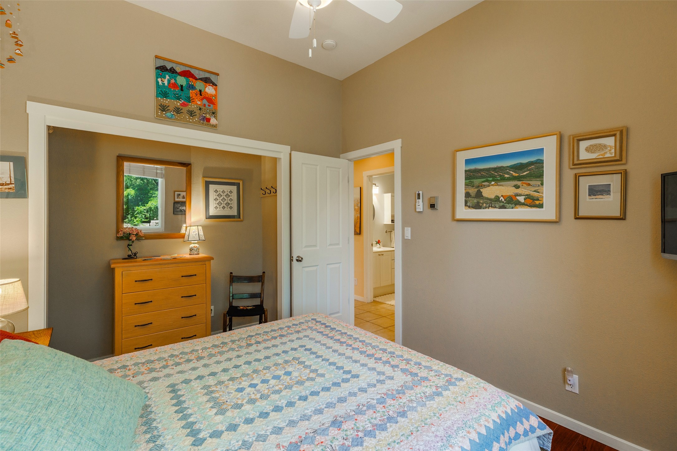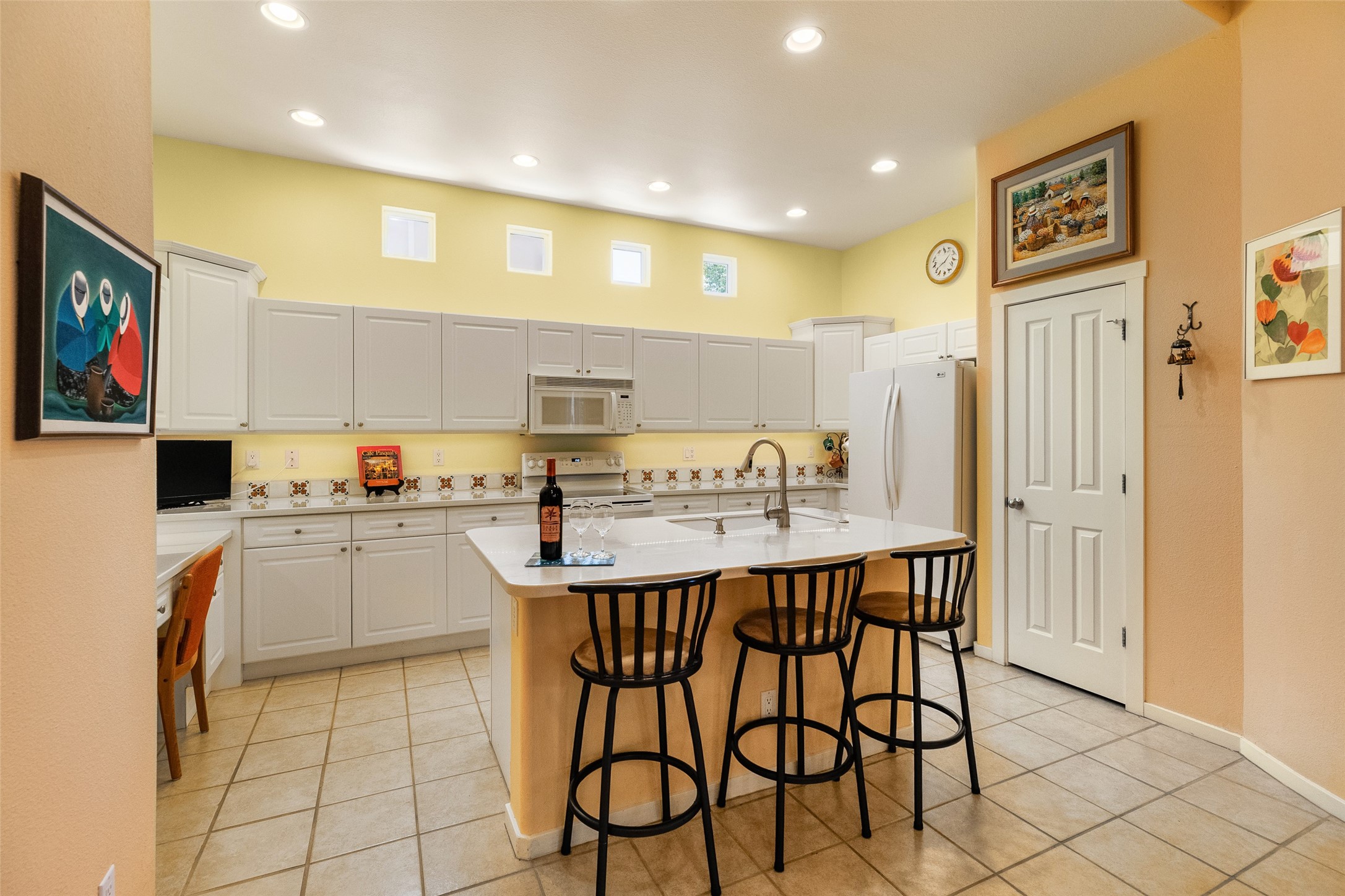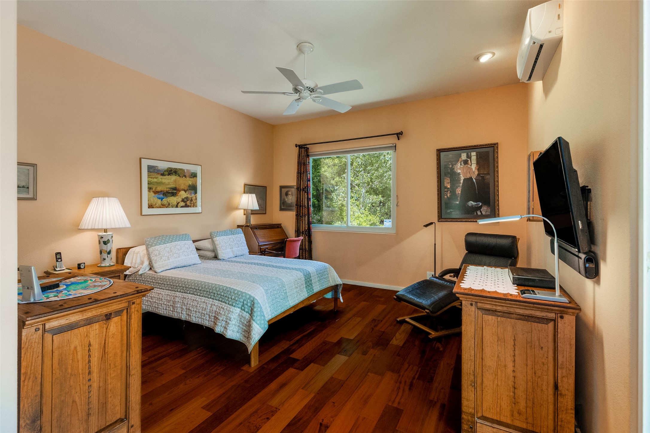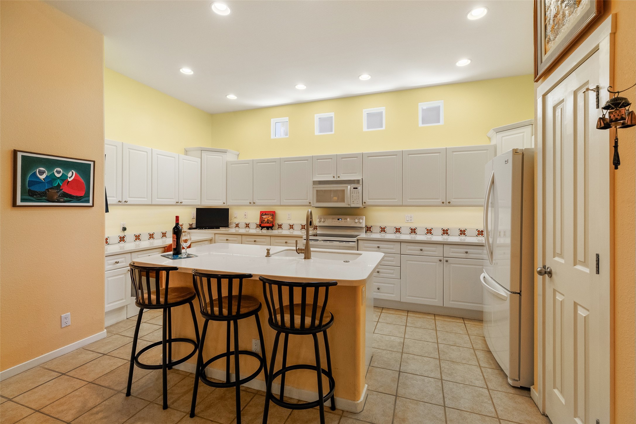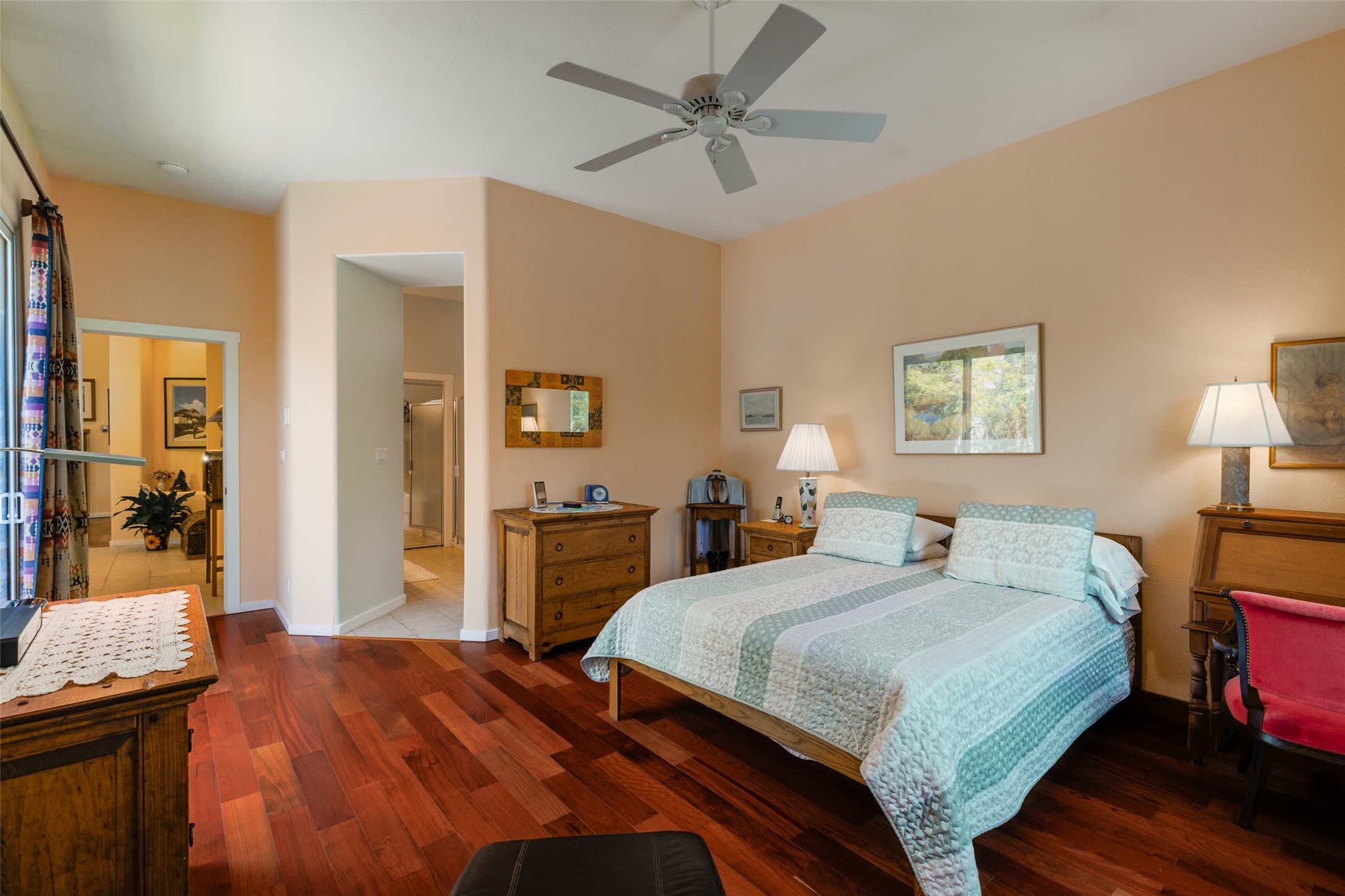 Popular Portal model on a quiet street in The Village at Rancho Viejo, this three bedroom, two bath single level home (no steps) has been meticulously maintained and updated by the current owner. The open concept living/dining area features a gas kiva fireplace, vigas, and 12 ft ceilings. The kitchen has a spacious island with seating, abundant cabinets, a cheery tile backsplash, a newer electric range (2024), a pantry and desk. Clerestory windows, recessed lights and under cabinet lighting provide ample light. There is great separation of the primary suite and guest bedrooms. The primary suite has a sliding door to the courtyard, a soaking tub and separate shower, spacious walk in closet, and dual sinks. The hall bath was updated in 2025 with a large tiled shower. The laundry room features a convenient utility sink and cabinets. Radiant in-floor heat, ceiling fans and three mini splits providing refrigerated air keep you comfortable year-round. The front and rear walled courtyards are beautifully landscaped with mature trees and plants, drip irrigation and a fountain in the front, offering privacy and tranquility. The living/dining rooms and bedrooms have gleaming hardwood floors (2020), and the bathrooms and kitchen are tiled (no carpet). The direct entry two car garage is drywalled and painted and has added lofted storage. Improvements include newer Andersen windows (2015) and a full restucco (2020). Rancho Viejo has miles of paved trails and 50 percent of the community is preserved as natural open space and parks.