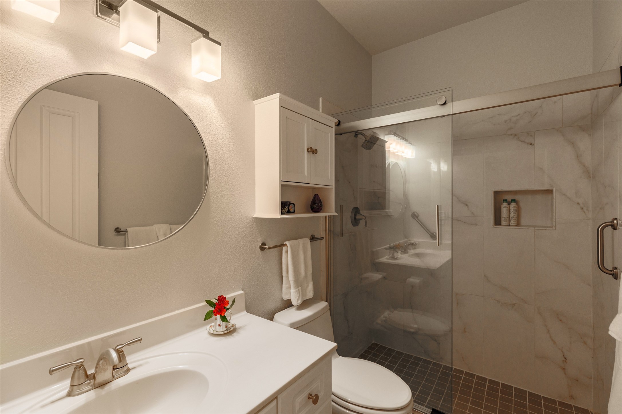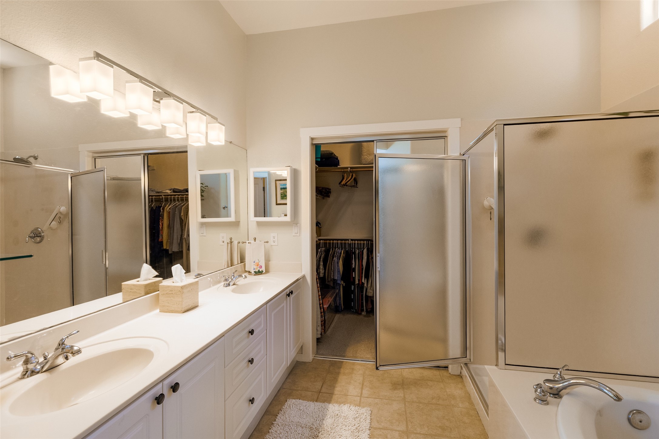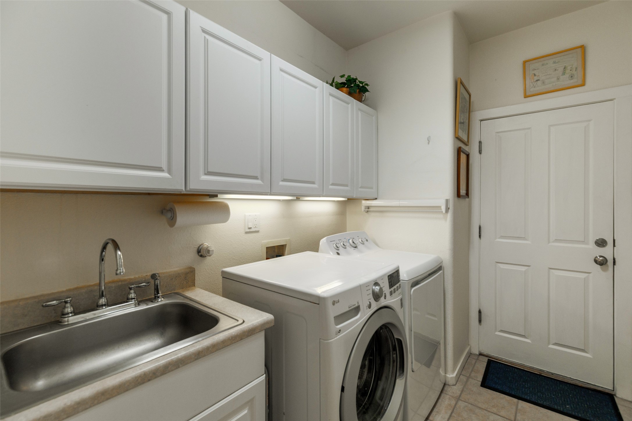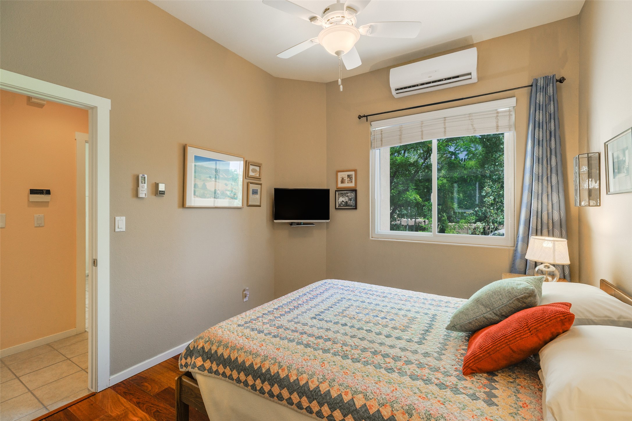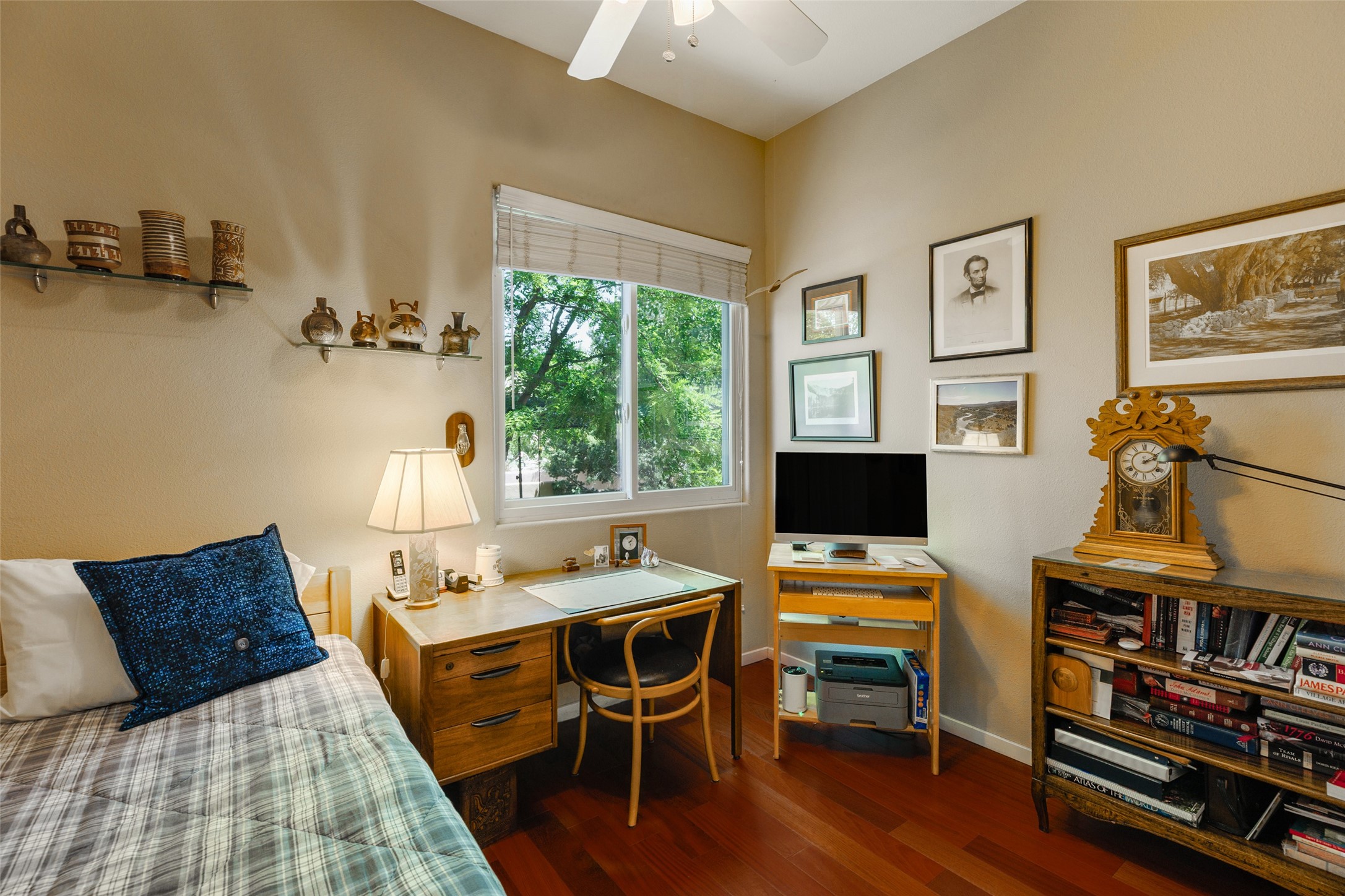 Popular Portal model on a quiet street in The Village at Rancho Viejo, this three bedroom, two bath single level home (no steps) has been meticulously maintained and updated by the current owner. The open concept living/dining area features a gas kiva fireplace, vigas, and 12 ft ceilings. The kitchen has a spacious island with seating, abundant cabinets, a cheery tile backsplash, a newer electric range (2024), a pantry and desk. Clerestory windows, recessed lights and under cabinet lighting provide ample light. There is great separation of the primary suite and guest bedrooms. The primary suite has a sliding door to the courtyard, a soaking tub and separate shower, spacious walk in closet, and dual sinks. The hall bath was updated in 2025 with a large tiled shower. The laundry room features a convenient utility sink and cabinets. Radiant in-floor heat, ceiling fans and three mini splits providing refrigerated air keep you comfortable year-round. The front and rear walled courtyards are beautifully landscaped with mature trees and plants, drip irrigation and a fountain in the front, offering privacy and tranquility. The living/dining rooms and bedrooms have gleaming hardwood floors (2020), and the bathrooms and kitchen are tiled (no carpet). The direct entry two car garage is drywalled and painted and has added lofted storage. Improvements include newer Andersen windows (2015) and a full restucco (2020). Rancho Viejo has miles of paved trails and 50 percent of the community is preserved as natural open space and parks.