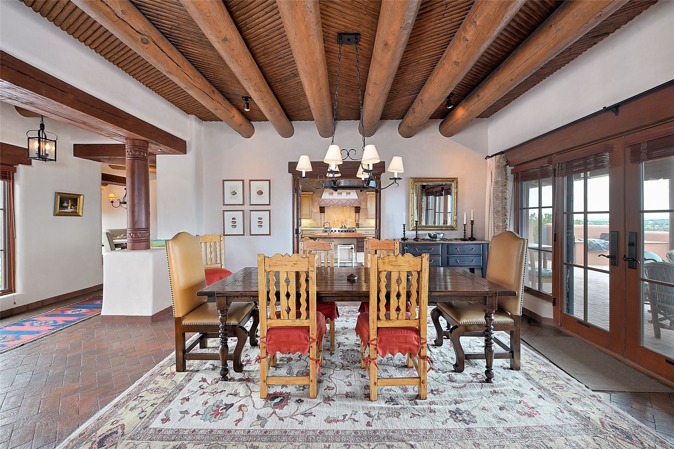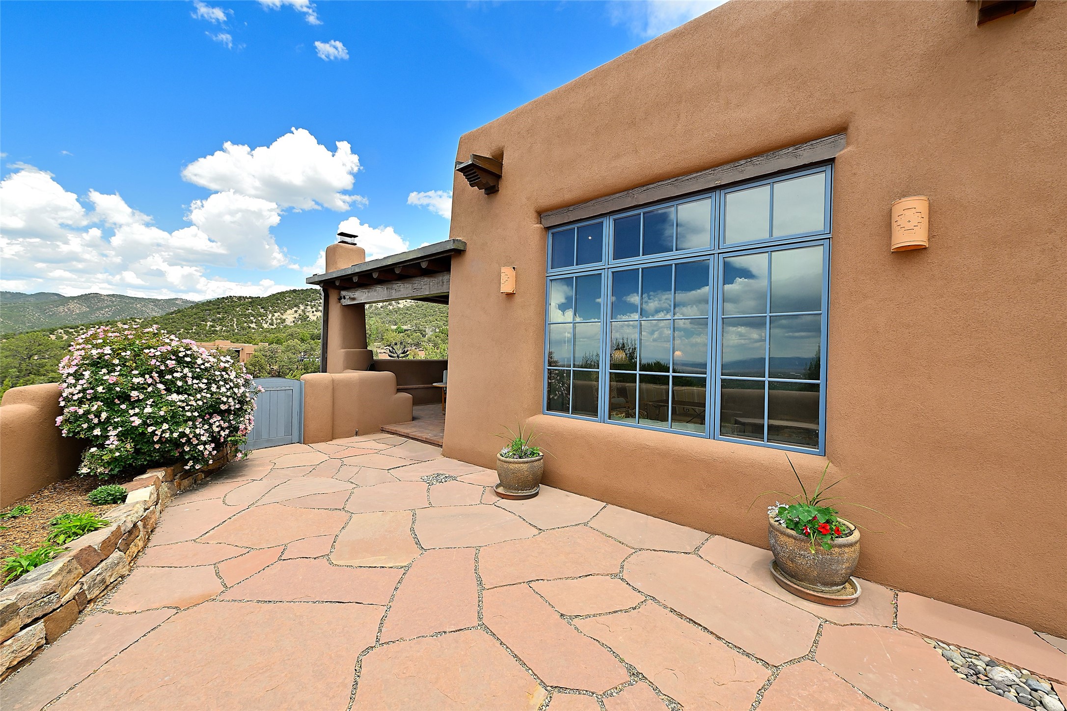 A true masterpiece of Spanish Pueblo architecture, this exceptional residence in Bishop's Lodge Hills is a stunning collaboration between acclaimed architect Ed Boniface and master builder Will Prull. Designed and constructed in 2007 for the current owner, with meticulous attention to detail, this home seamlessly blends traditional craftsmanship with modern luxury, all while capturing commanding views of the surrounding mountains and breathtaking sunsets. Upon entering the foyer, guests are enveloped in a space inspired by the sacred geometry of a Navajo Hogan, setting the tone for the rich architectural heritage woven throughout the home. The grand living room boasts soaring beamed ceilings supported by hand-carved corbels, while a striking fireplace design--borrowed from ancient traditions--serves as a warm and welcoming focal point. The formal dining area opens gracefully onto the Grand Portal, which leads to an expansive rooftop deck, offering panoramic vistas that define Santa Fe's unparalleled beauty. The chef's kitchen is a showpiece of authenticity and elegance, featuring antiqued custom cabinetry, classic tile countertops and custom carved backsplashes, and top-of-the-line Viking Stainless appliances. At its heart sits a black walnut-topped center island--both functional and visually stunning--complemented by an adjacent breakfast room that overlooks the walled entry courtyard, creating an intimate space for morning gatherings. The luxurious primary suite is a retreat unto itself, complete with a charming gas Kiva fireplace, two spa-like baths, and two walk-in closets. A separate office, situated within the primary wing, provides the perfect setting for focus and creativity. On the opposite wing, comfortable guest suites ensure privacy and tranquility, making this home an ideal sanctuary for both residents and visitors alike. Every aspect of this home's design and construction reflects an extraordinary commitment to craftsmanship, authenticity, and architectural excellence.