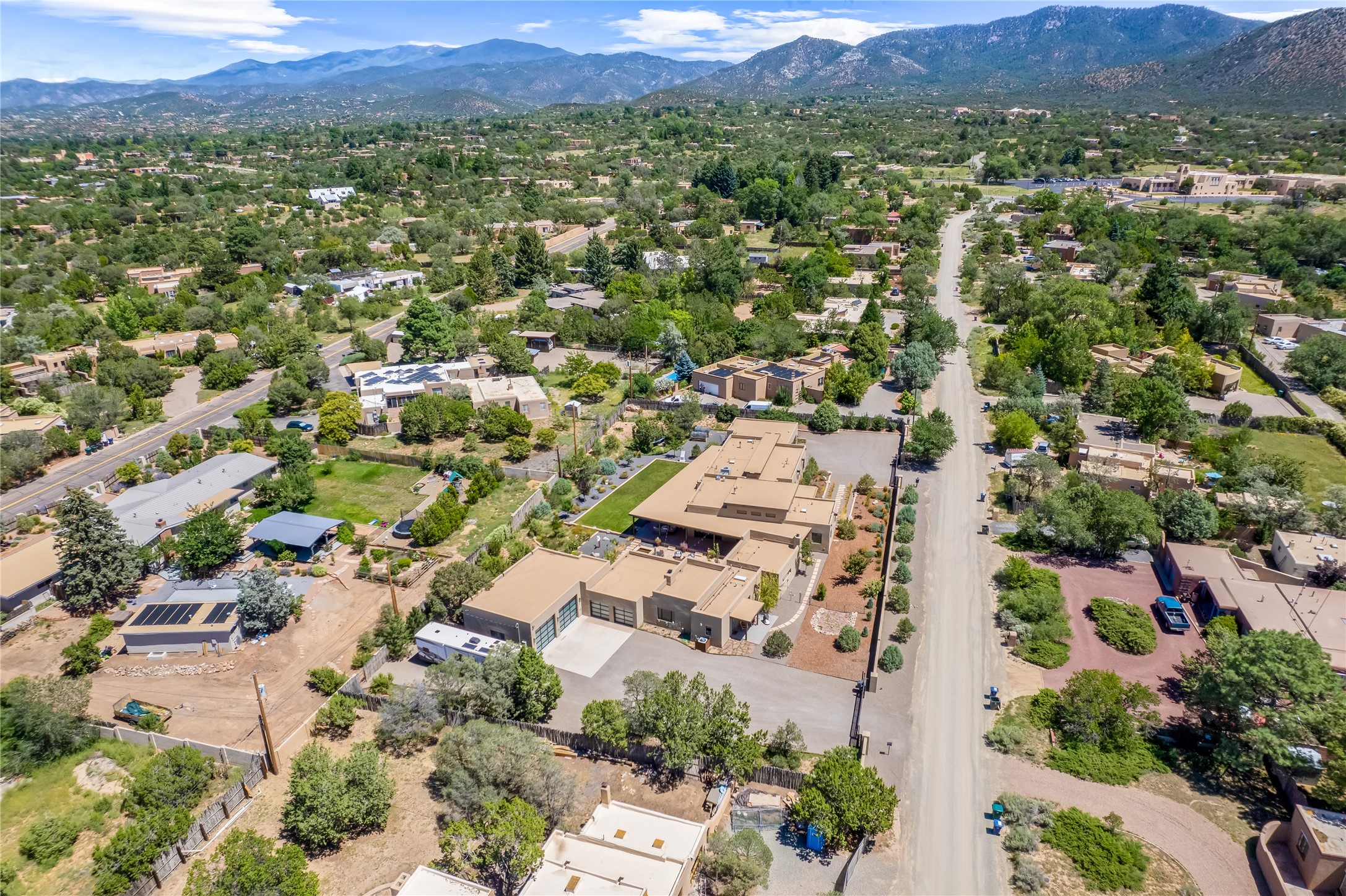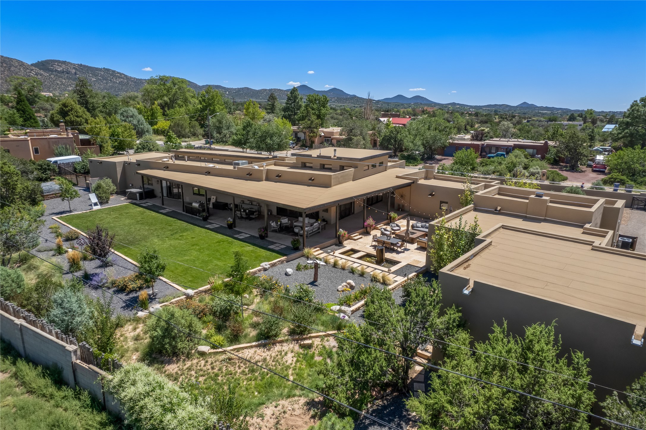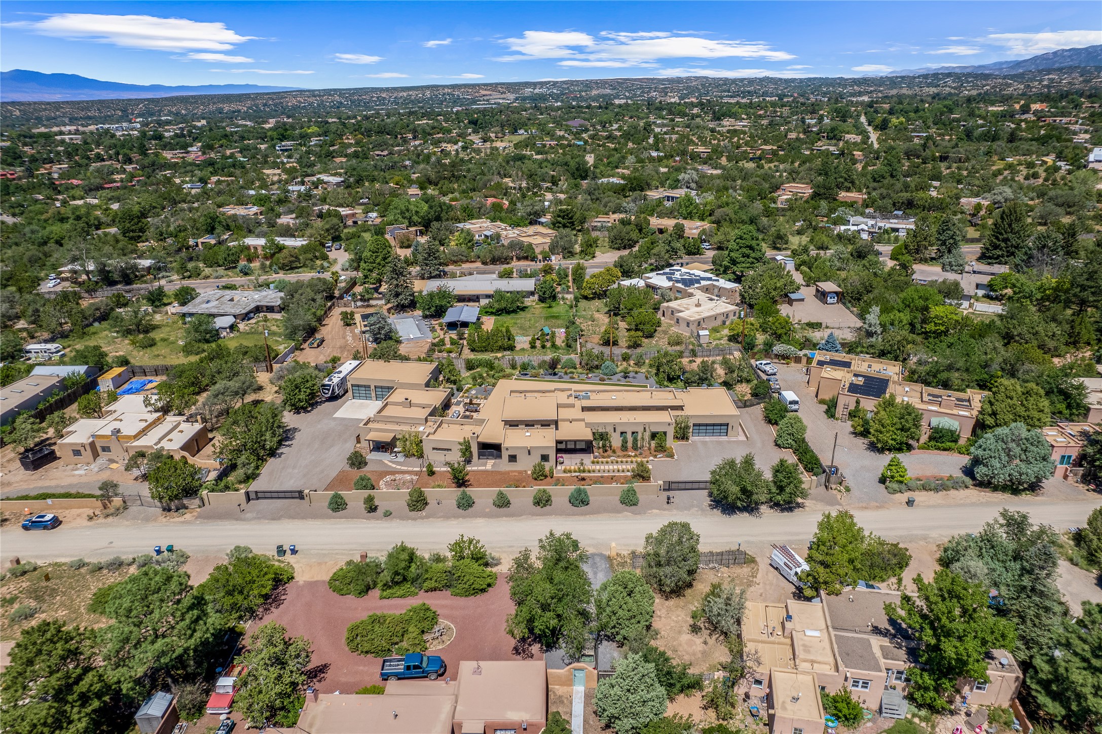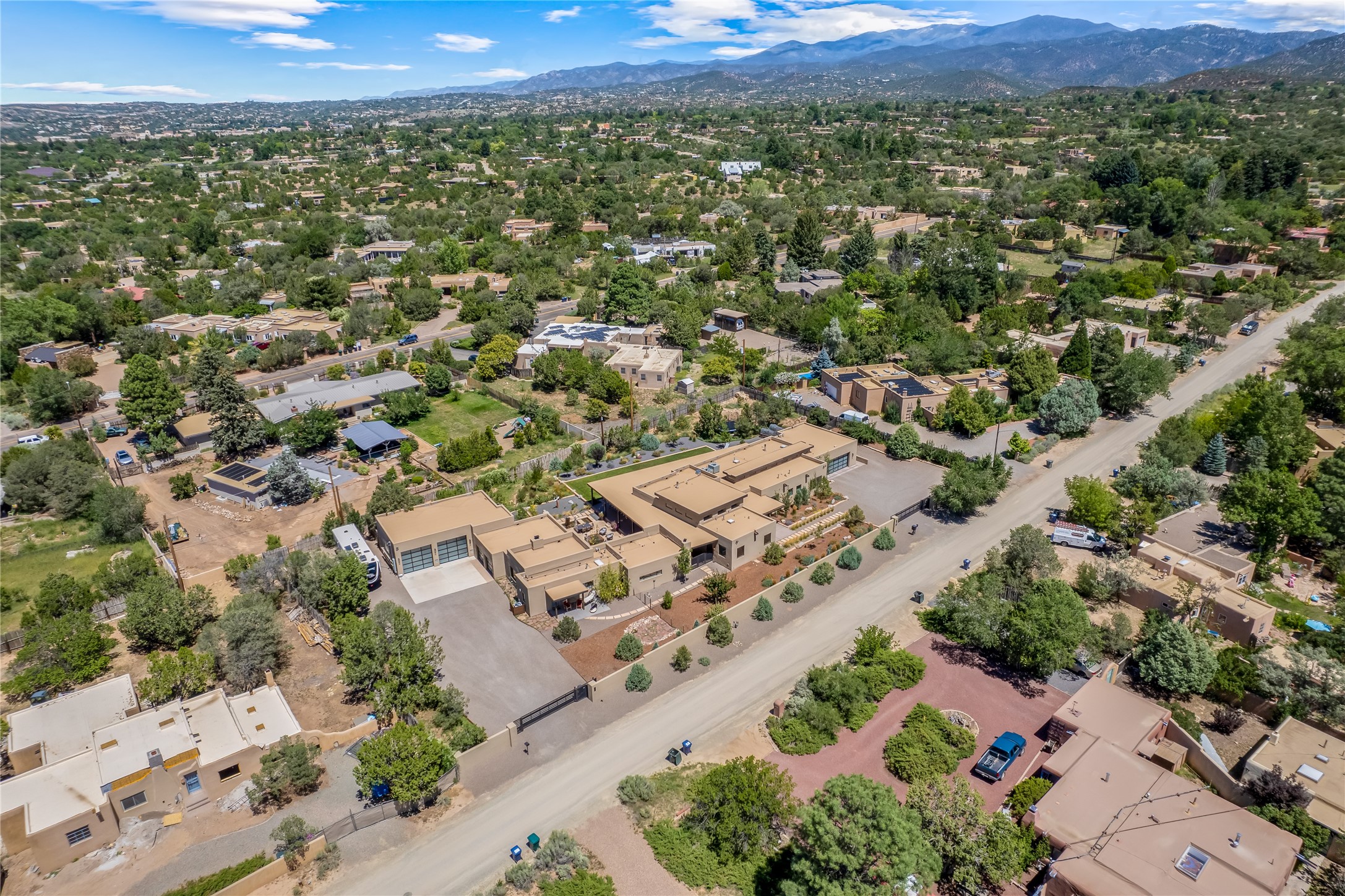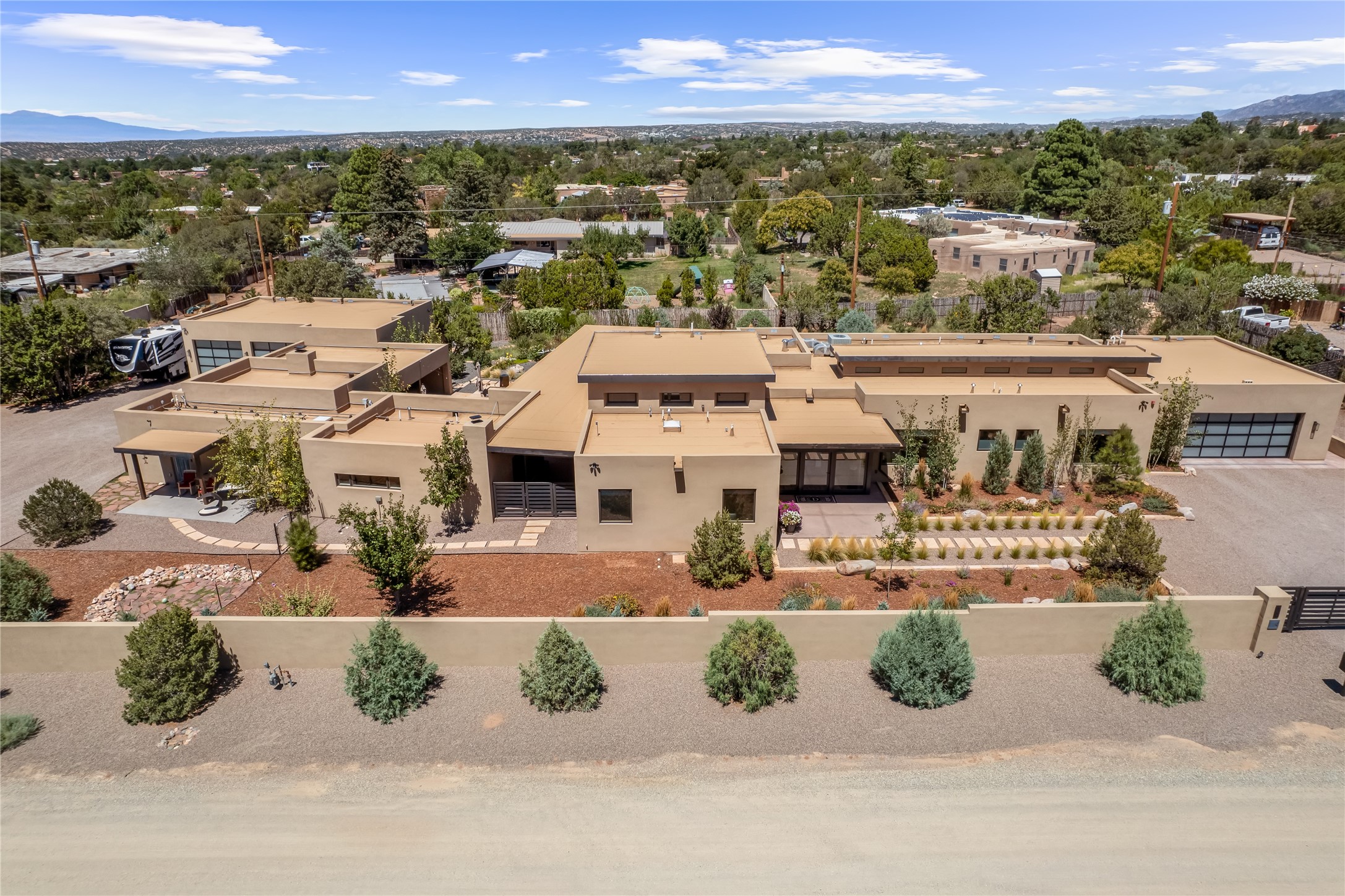 This exquisite 1-acre gated compound that's centrally located & just 2 miles from the historic Santa Fe Plaza features a masterfully designed main residence, spacious guest home, and 6 garage bays for collectors or creatives. The main home offers ~3,875 sq. ft. of refined living with Venetian plaster walls in public areas, custom cabinetry throughout, and 8-ft interior doors. The living and dining rooms feature an impressive dual aspect Ortal fireplace. Soaring ceilings and a wet bar with beverage drawers complete the living room, which opens to a ~1,700 sq. ft. covered patio. Multi-slide door systems open to this impressive patio, that includes built-in Bromic heaters and a 42 inch Wolf grill. The chef's kitchen is anchored by a Lacanche 7-burner stove, pot filler, Sub-Zero refrigerator and freezer, Wolf steam oven, Cove dishwasher and hot/cold tap. The butler's pantry has an abundance of storage, undermount lighting and Red/White EuroCave wine refrigerators. A serene primary suite includes a steam shower, soaking tub, room sized walk-in closet with island, and patio access. Smart touches include Sonos surround system, California Closets, electric patio shades, and a whole-house water filtration system. The guest house (~1,460 sq. ft.) offers generous privacy with a large living area, bedroom, and its own designer fireplace. An attached garage/storage wing (~1,853 sq. ft.) includes a standard 2-car bay plus an oversized 2+ bay garage with 10'x12' doors--ideal for small RVs, boats, or a home gym/studio. Both main and guest garages include EV hookup capabilities. Outdoors, enjoy lush landscaping by McCumber Fine Gardens, fruit trees, raised garden beds, a custom firepit and water feature, and ample space for entertaining--easily accommodating up to 100 guests. Additional highlights include steel electric gates, frosted glass garage doors, radiant heat in main home, and the most luxurious laundry/craft room you will find. This gated retreat is a one-of-a-kind compound.