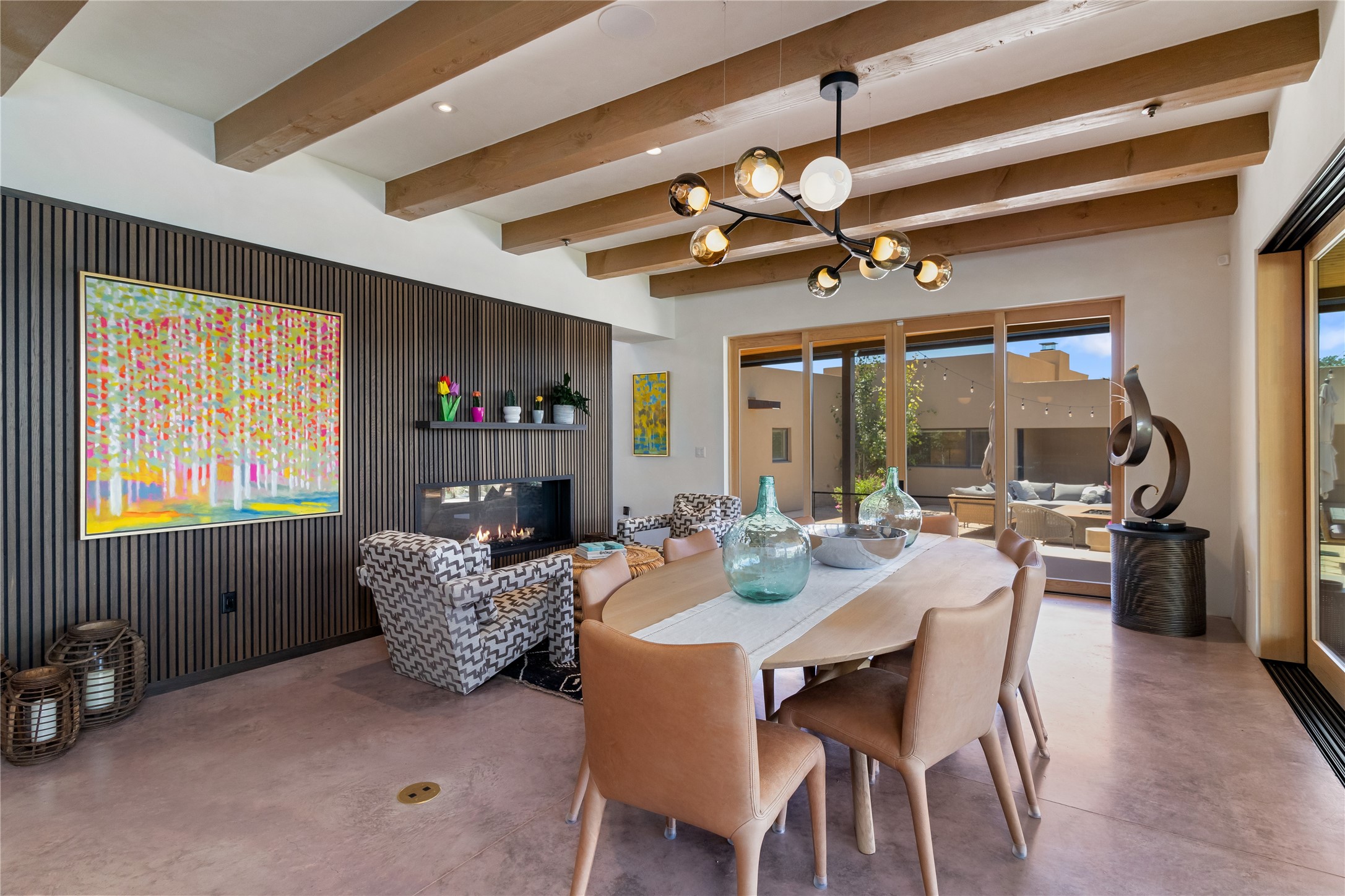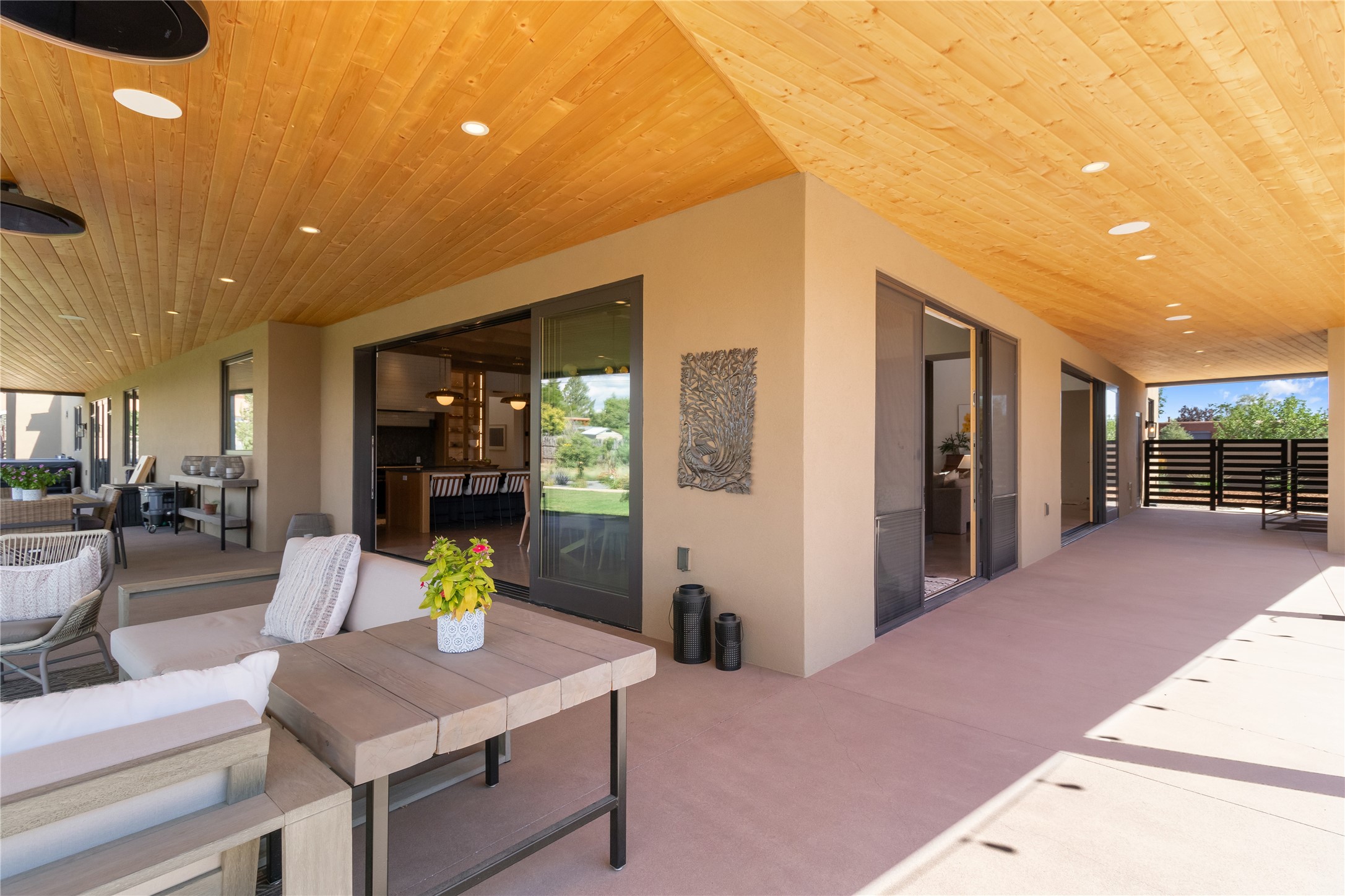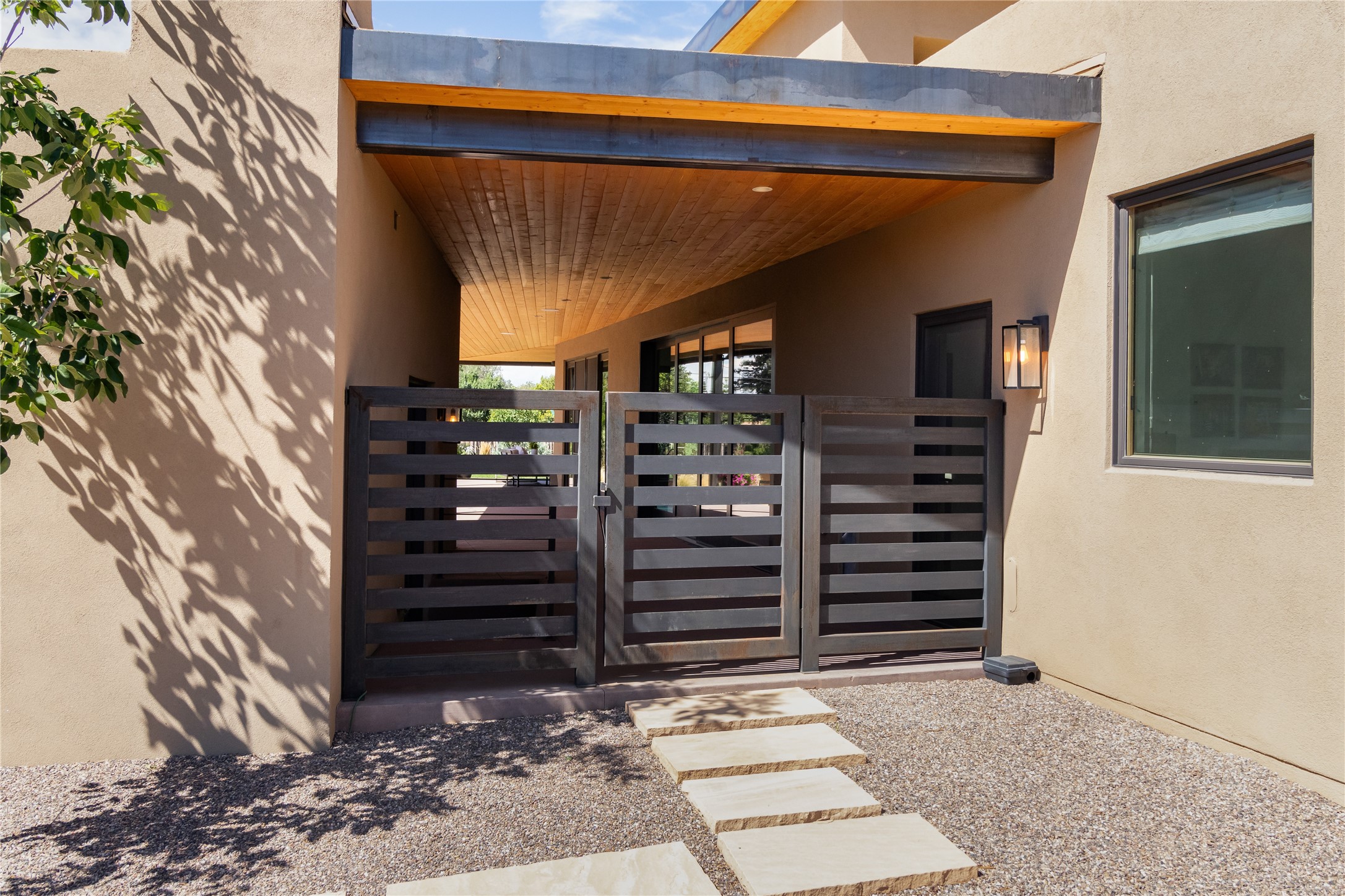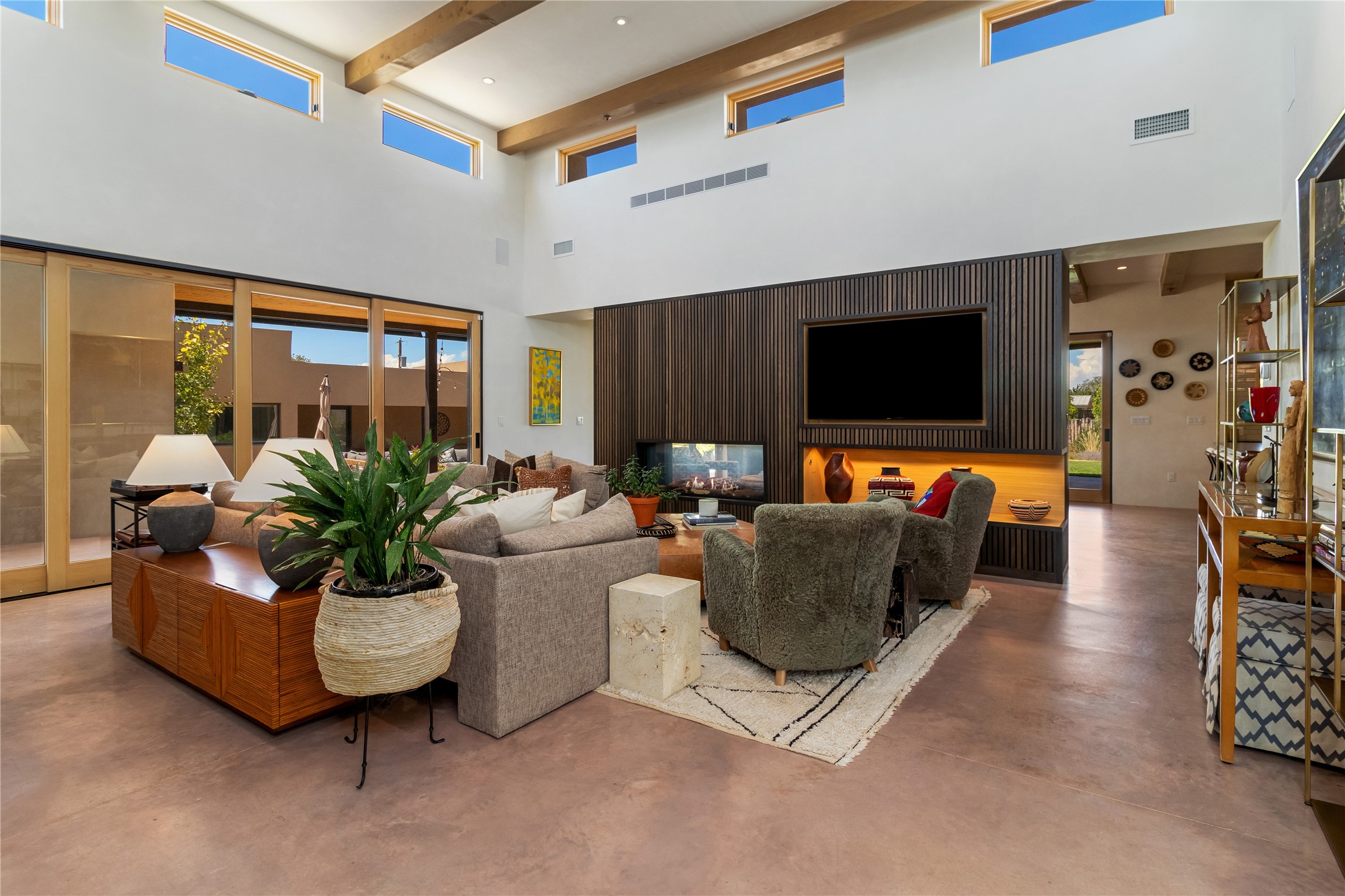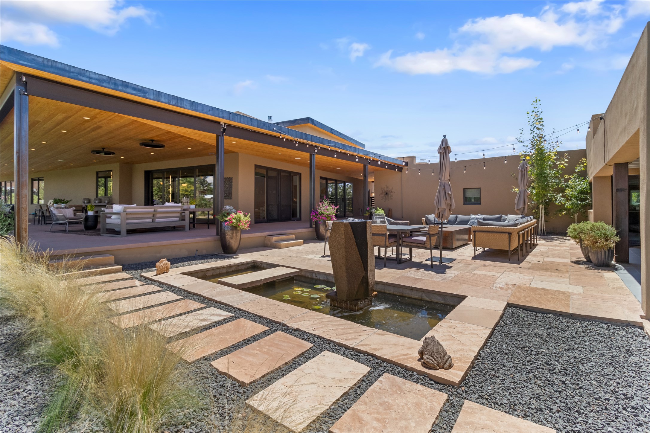 This exquisite 1-acre gated compound that's centrally located & just 2 miles from the historic Santa Fe Plaza features a masterfully designed main residence, spacious guest home, and 6 garage bays for collectors or creatives. The main home offers ~3,875 sq. ft. of refined living with Venetian plaster walls in public areas, custom cabinetry throughout, and 8-ft interior doors. The living and dining rooms feature an impressive dual aspect Ortal fireplace. Soaring ceilings and a wet bar with beverage drawers complete the living room, which opens to a ~1,700 sq. ft. covered patio. Multi-slide door systems open to this impressive patio, that includes built-in Bromic heaters and a 42 inch Wolf grill. The chef's kitchen is anchored by a Lacanche 7-burner stove, pot filler, Sub-Zero refrigerator and freezer, Wolf steam oven, Cove dishwasher and hot/cold tap. The butler's pantry has an abundance of storage, undermount lighting and Red/White EuroCave wine refrigerators. A serene primary suite includes a steam shower, soaking tub, room sized walk-in closet with island, and patio access. Smart touches include Sonos surround system, California Closets, electric patio shades, and a whole-house water filtration system. The guest house (~1,460 sq. ft.) offers generous privacy with a large living area, bedroom, and its own designer fireplace. An attached garage/storage wing (~1,853 sq. ft.) includes a standard 2-car bay plus an oversized 2+ bay garage with 10'x12' doors--ideal for small RVs, boats, or a home gym/studio. Both main and guest garages include EV hookup capabilities. Outdoors, enjoy lush landscaping by McCumber Fine Gardens, fruit trees, raised garden beds, a custom firepit and water feature, and ample space for entertaining--easily accommodating up to 100 guests. Additional highlights include steel electric gates, frosted glass garage doors, radiant heat in main home, and the most luxurious laundry/craft room you will find. This gated retreat is a one-of-a-kind compound.
