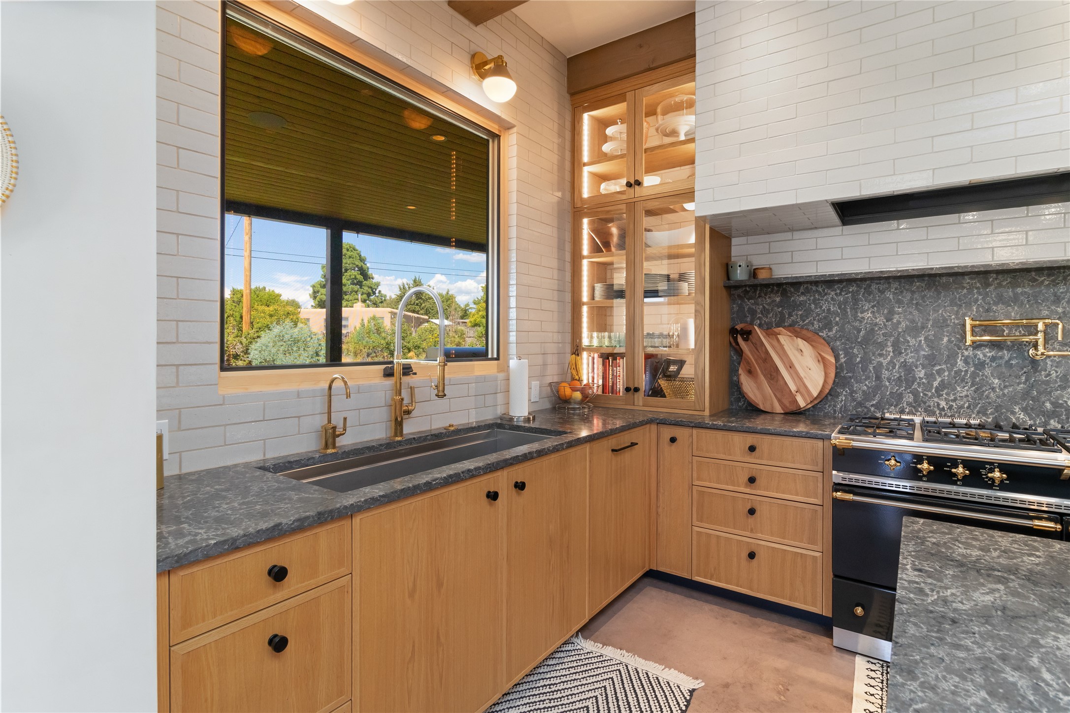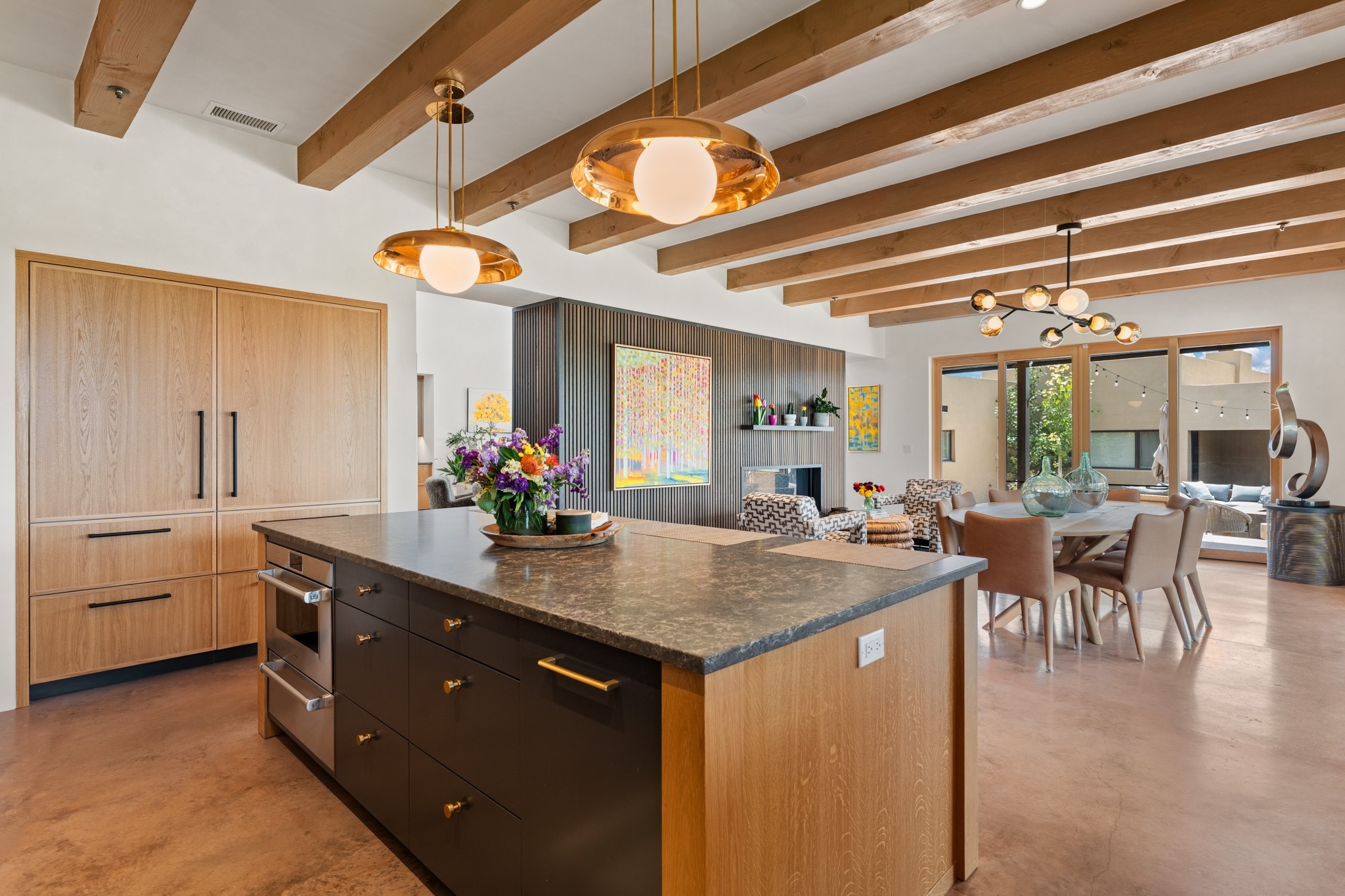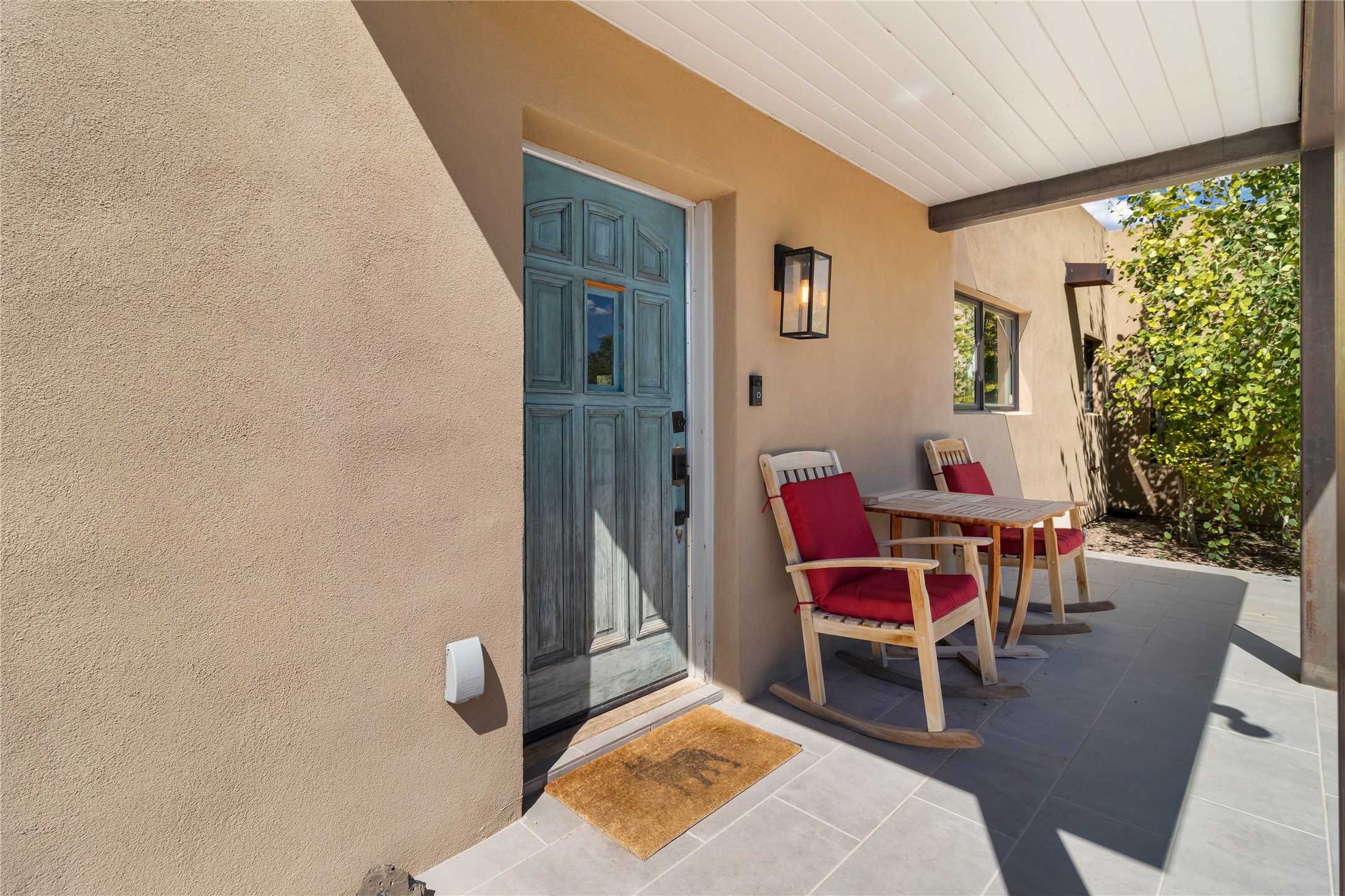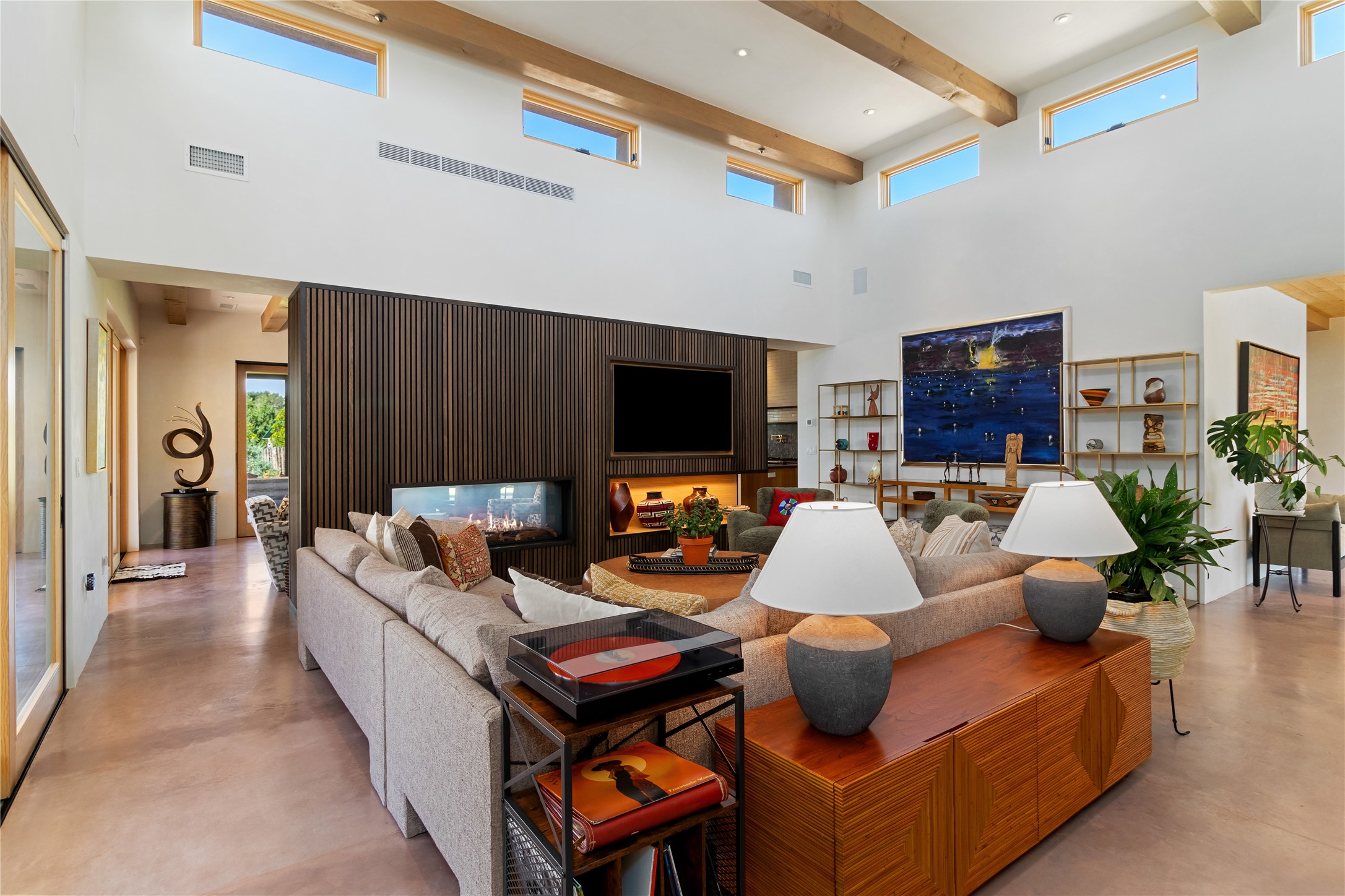 This exquisite 1-acre gated compound that's centrally located & just 2 miles from the historic Santa Fe Plaza features a masterfully designed main residence, spacious guest home, and 6 garage bays for collectors or creatives. The main home offers ~3,875 sq. ft. of refined living with Venetian plaster walls in public areas, custom cabinetry throughout, and 8-ft interior doors. The living and dining rooms feature an impressive dual aspect Ortal fireplace. Soaring ceilings and a wet bar with beverage drawers complete the living room, which opens to a ~1,700 sq. ft. covered patio. Multi-slide door systems open to this impressive patio, that includes built-in Bromic heaters and a 42 inch Wolf grill. The chef's kitchen is anchored by a Lacanche 7-burner stove, pot filler, Sub-Zero refrigerator and freezer, Wolf steam oven, Cove dishwasher and hot/cold tap. The butler's pantry has an abundance of storage, undermount lighting and Red/White EuroCave wine refrigerators. A serene primary suite includes a steam shower, soaking tub, room sized walk-in closet with island, and patio access. Smart touches include Sonos surround system, California Closets, electric patio shades, and a whole-house water filtration system. The guest house (~1,460 sq. ft.) offers generous privacy with a large living area, bedroom, and its own designer fireplace. An attached garage/storage wing (~1,853 sq. ft.) includes a standard 2-car bay plus an oversized 2+ bay garage with 10'x12' doors--ideal for small RVs, boats, or a home gym/studio. Both main and guest garages include EV hookup capabilities. Outdoors, enjoy lush landscaping by McCumber Fine Gardens, fruit trees, raised garden beds, a custom firepit and water feature, and ample space for entertaining--easily accommodating up to 100 guests. Additional highlights include steel electric gates, frosted glass garage doors, radiant heat in main home, and the most luxurious laundry/craft room you will find. This gated retreat is a one-of-a-kind compound.