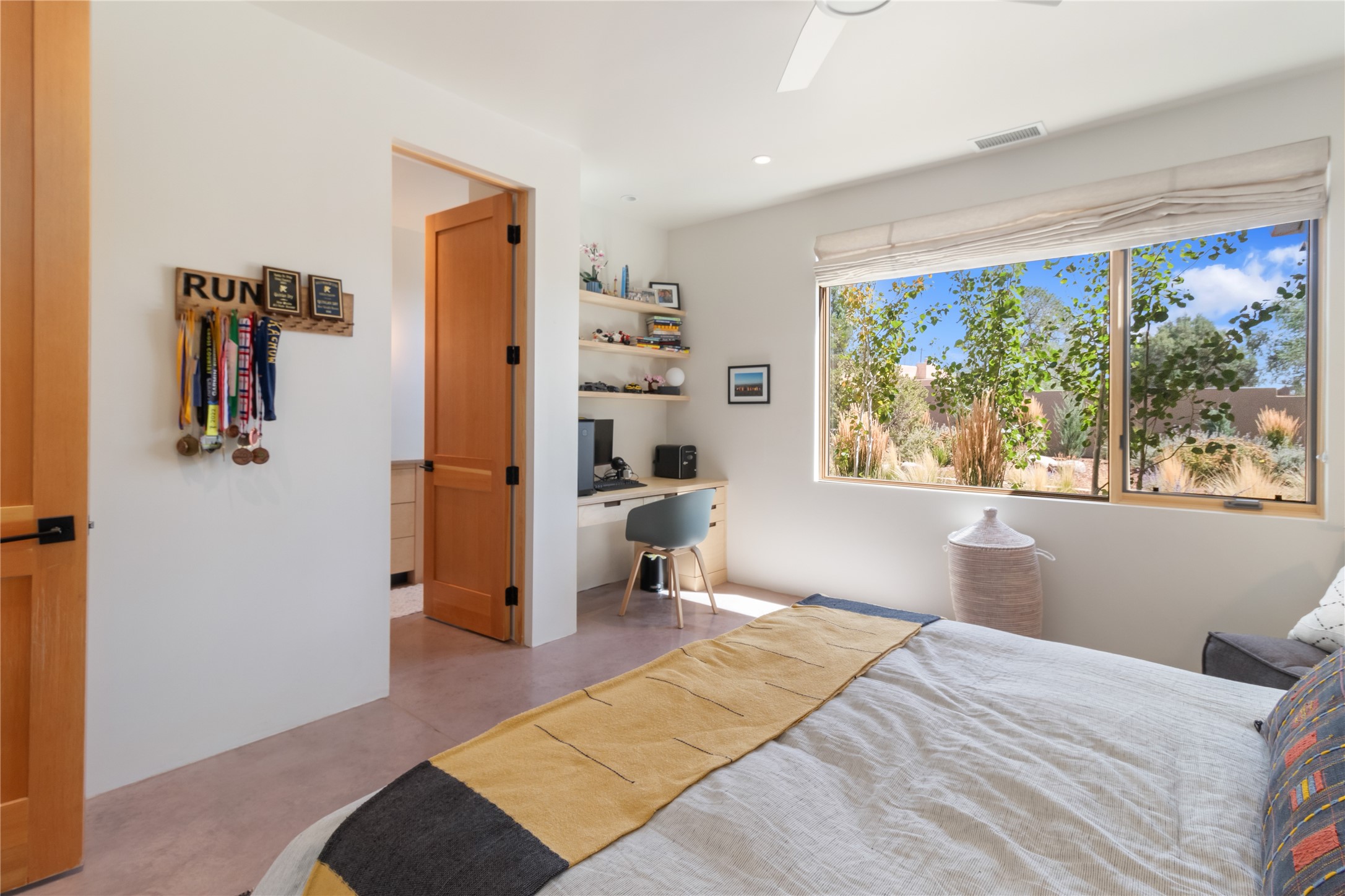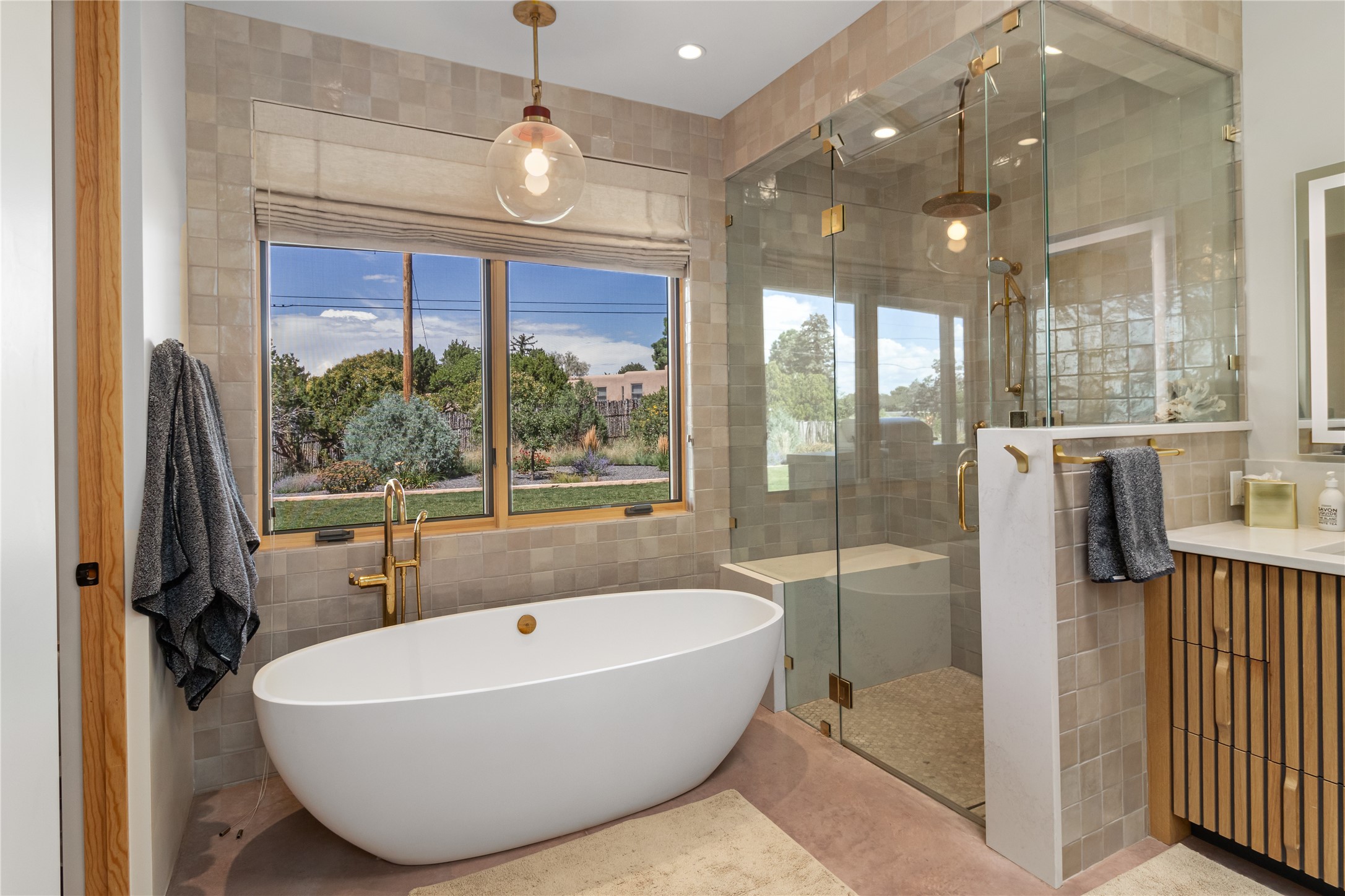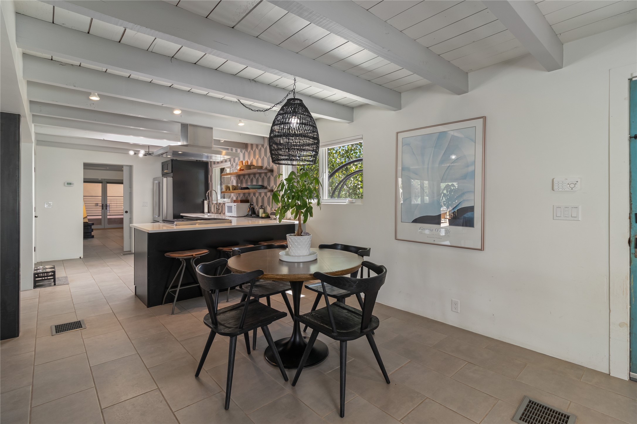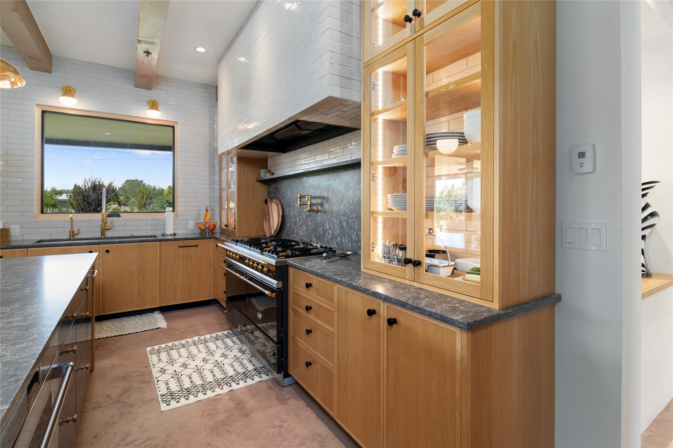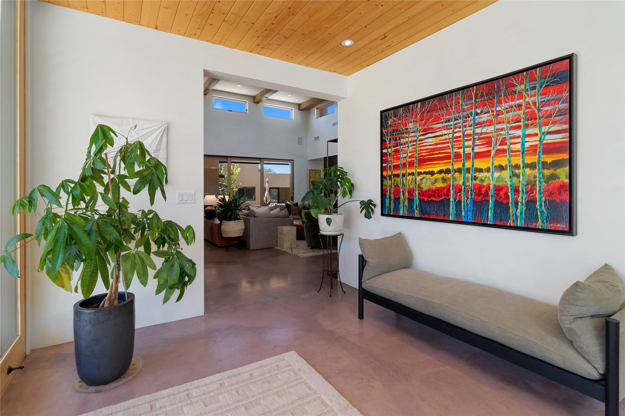 This exquisite 1-acre gated compound that's centrally located & just 2 miles from the historic Santa Fe Plaza features a masterfully designed main residence, spacious guest home, and 6 garage bays for collectors or creatives. The main home offers ~3,875 sq. ft. of refined living with Venetian plaster walls in public areas, custom cabinetry throughout, and 8-ft interior doors. The living and dining rooms feature an impressive dual aspect Ortal fireplace. Soaring ceilings and a wet bar with beverage drawers complete the living room, which opens to a ~1,700 sq. ft. covered patio. Multi-slide door systems open to this impressive patio, that includes built-in Bromic heaters and a 42 inch Wolf grill. The chef's kitchen is anchored by a Lacanche 7-burner stove, pot filler, Sub-Zero refrigerator and freezer, Wolf steam oven, Cove dishwasher and hot/cold tap. The butler's pantry has an abundance of storage, undermount lighting and Red/White EuroCave wine refrigerators. A serene primary suite includes a steam shower, soaking tub, room sized walk-in closet with island, and patio access. Smart touches include Sonos surround system, California Closets, electric patio shades, and a whole-house water filtration system. The guest house (~1,460 sq. ft.) offers generous privacy with a large living area, bedroom, and its own designer fireplace. An attached garage/storage wing (~1,853 sq. ft.) includes a standard 2-car bay plus an oversized 2+ bay garage with 10'x12' doors--ideal for small RVs, boats, or a home gym/studio. Both main and guest garages include EV hookup capabilities. Outdoors, enjoy lush landscaping by McCumber Fine Gardens, fruit trees, raised garden beds, a custom firepit and water feature, and ample space for entertaining--easily accommodating up to 100 guests. Additional highlights include steel electric gates, frosted glass garage doors, radiant heat in main home, and the most luxurious laundry/craft room you will find. This gated retreat is a one-of-a-kind compound.