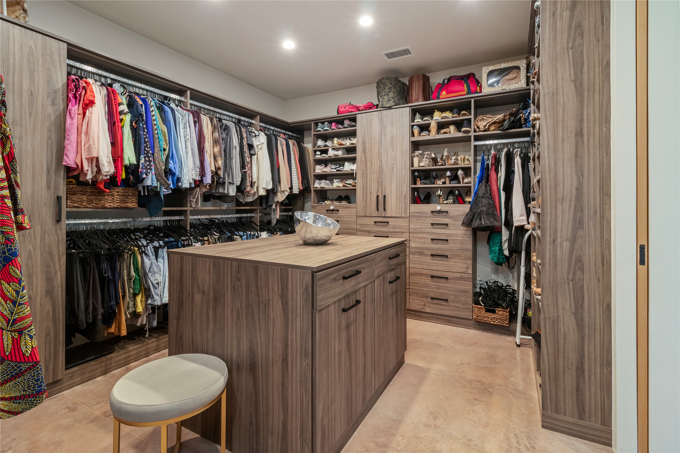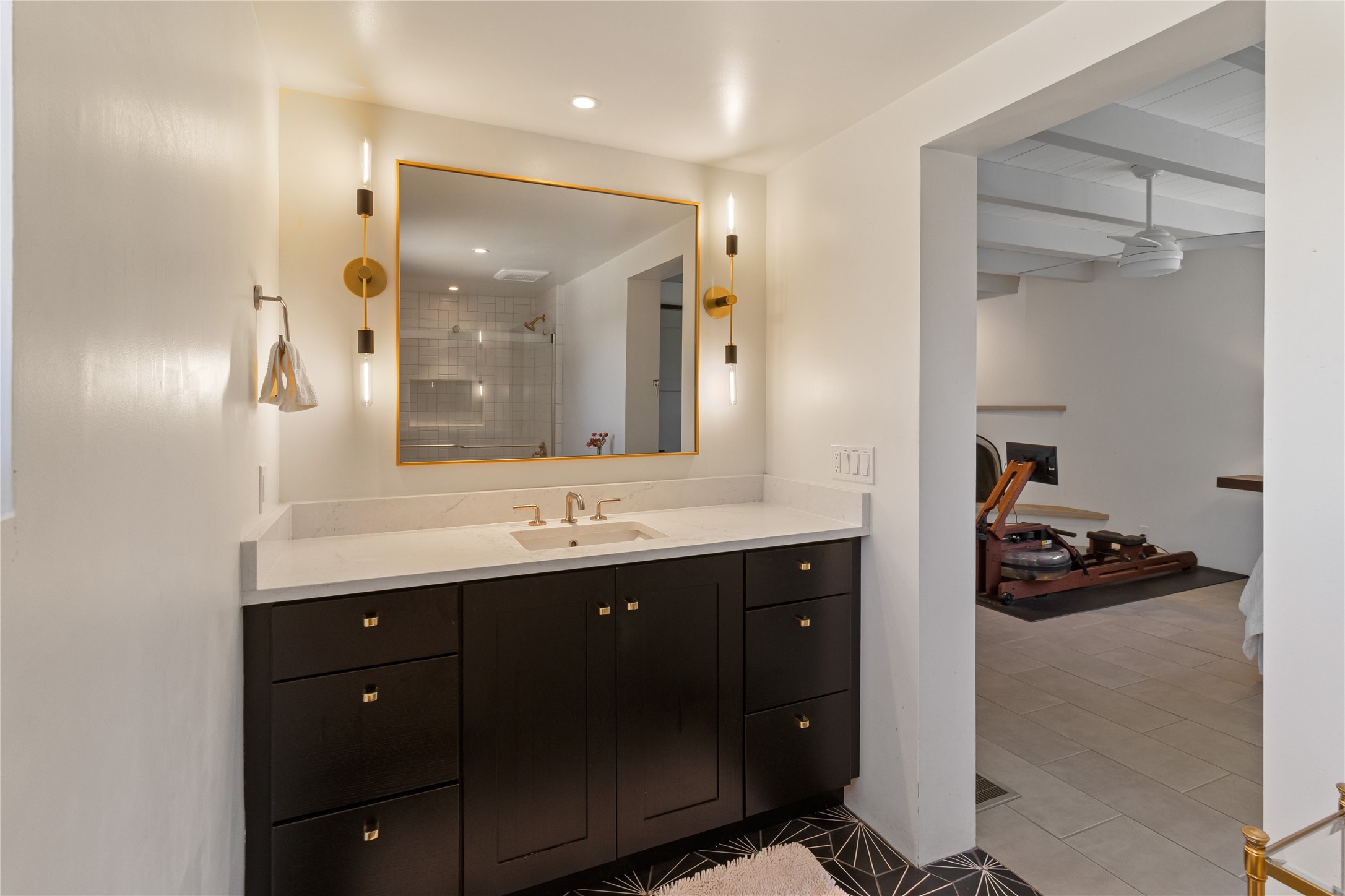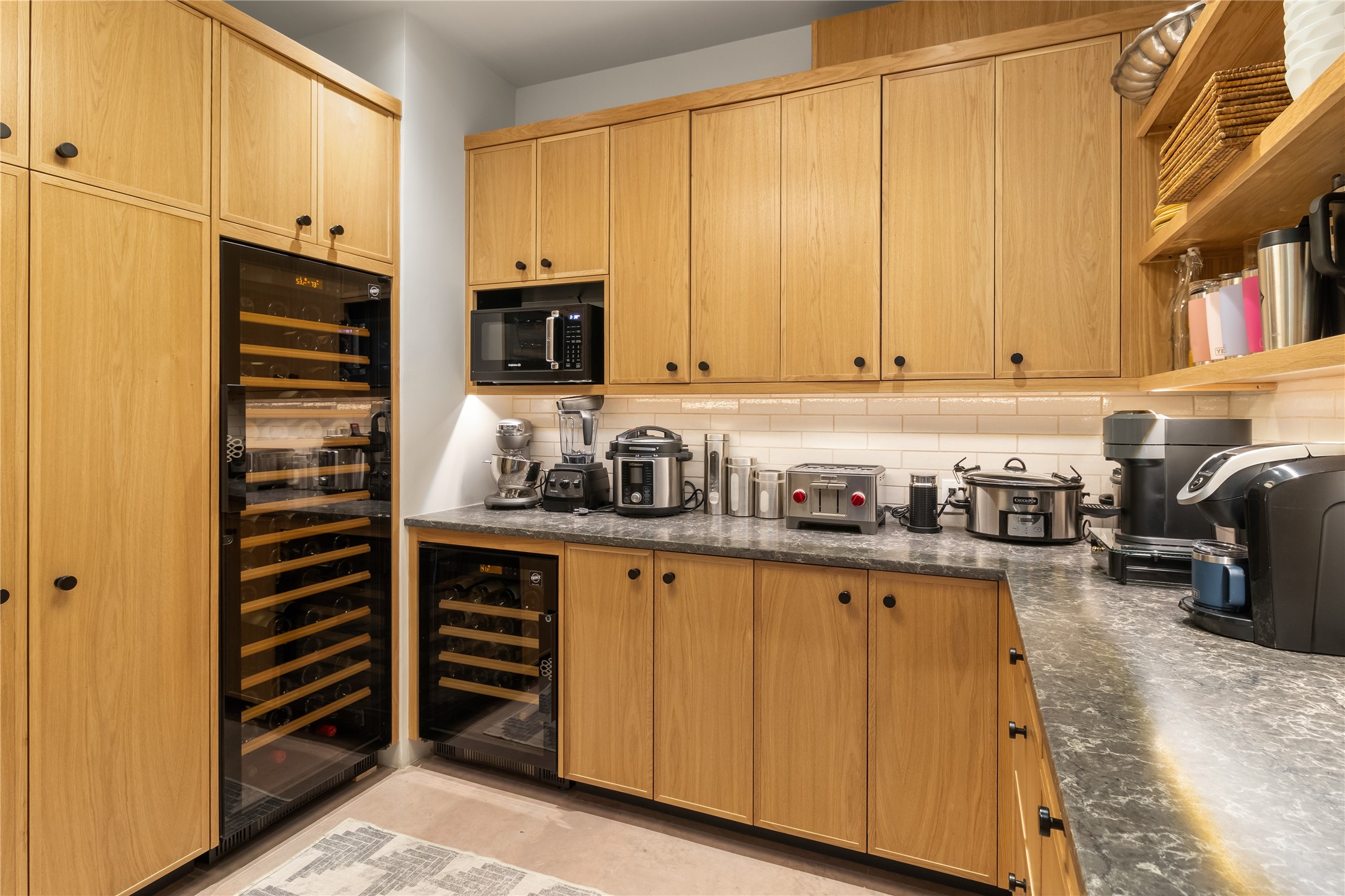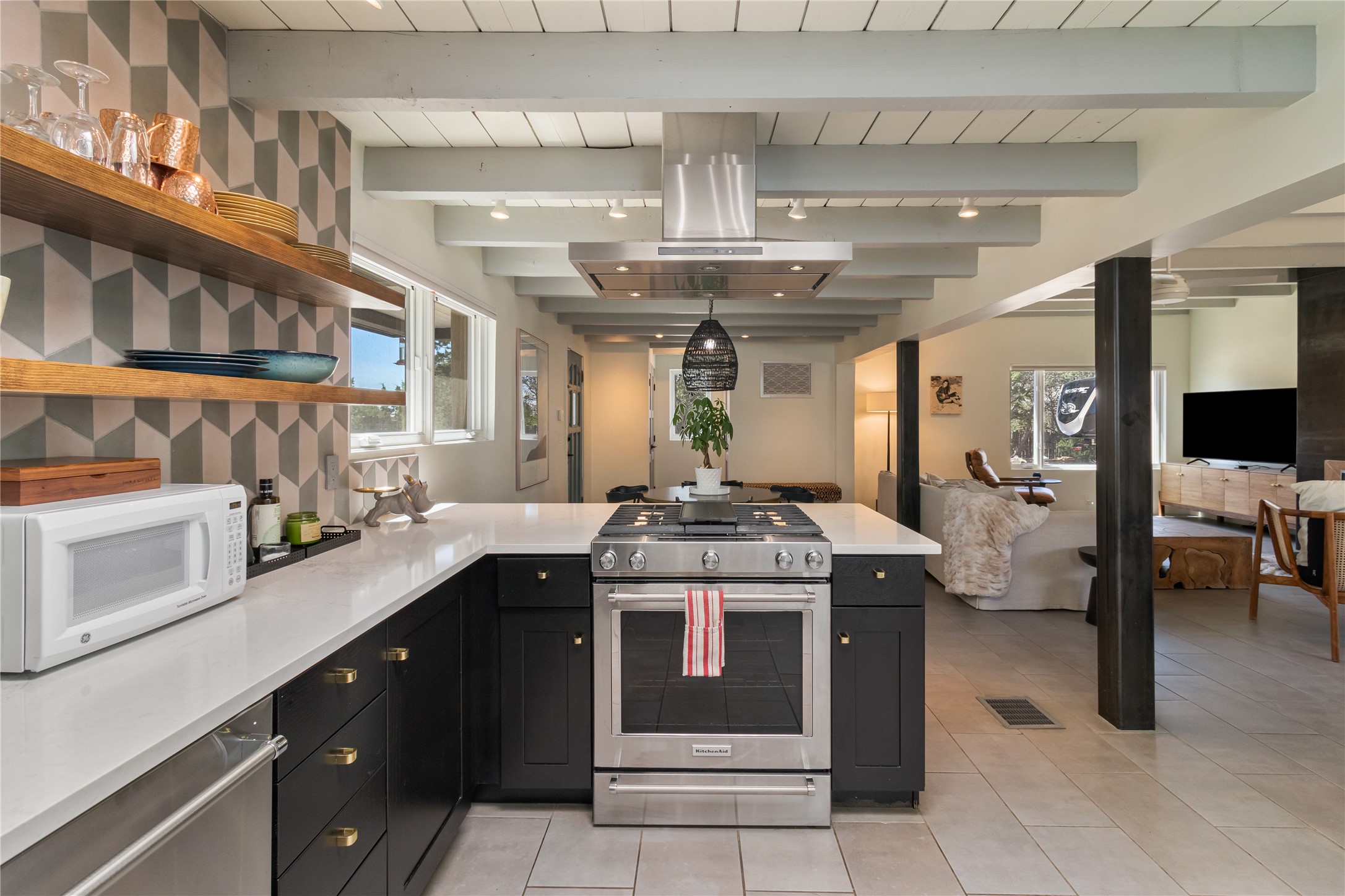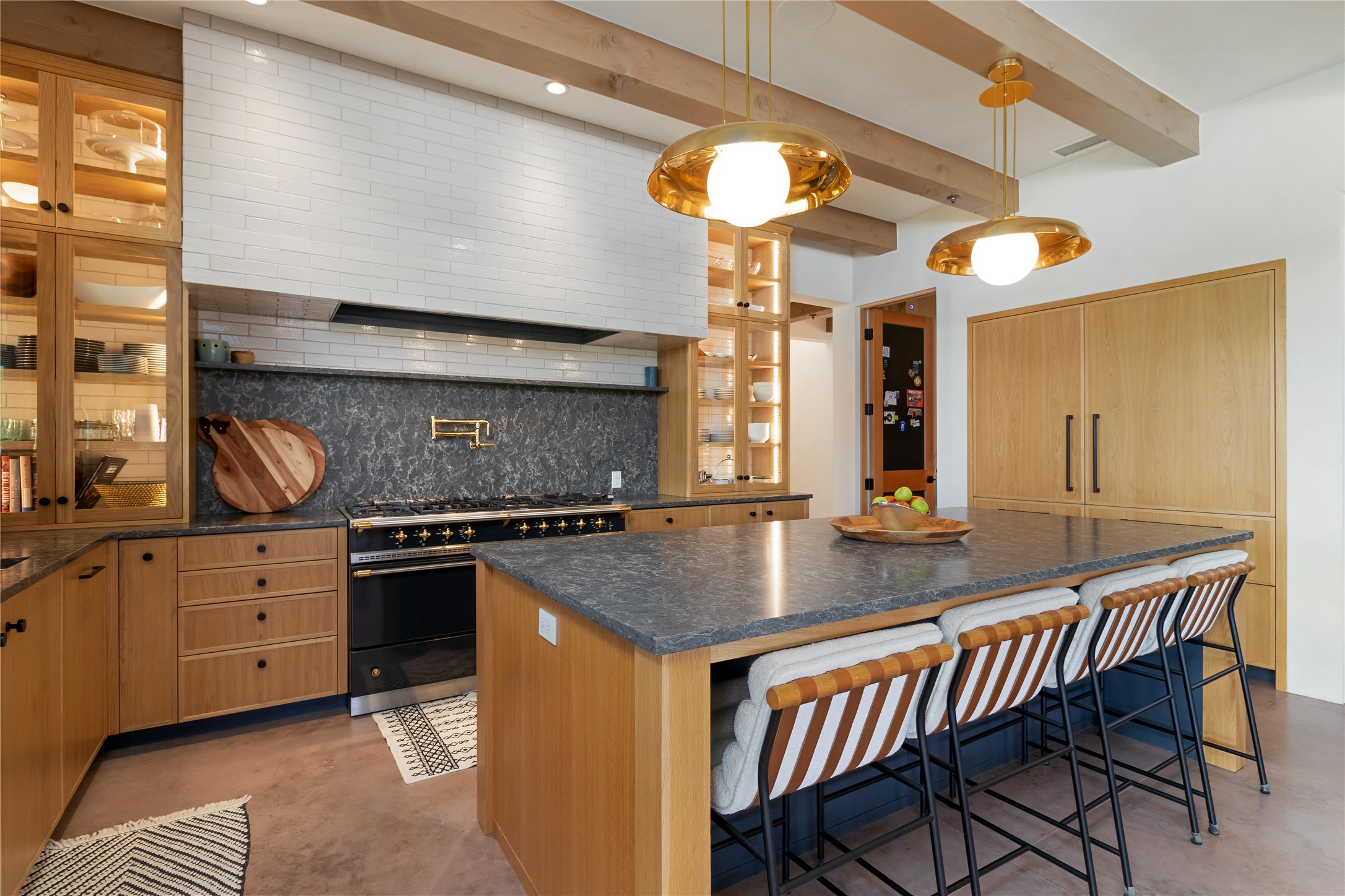 This exquisite 1-acre gated compound that's centrally located & just 2 miles from the historic Santa Fe Plaza features a masterfully designed main residence, spacious guest home, and 6 garage bays for collectors or creatives. The main home offers ~3,875 sq. ft. of refined living with Venetian plaster walls in public areas, custom cabinetry throughout, and 8-ft interior doors. The living and dining rooms feature an impressive dual aspect Ortal fireplace. Soaring ceilings and a wet bar with beverage drawers complete the living room, which opens to a ~1,700 sq. ft. covered patio. Multi-slide door systems open to this impressive patio, that includes built-in Bromic heaters and a 42 inch Wolf grill. The chef's kitchen is anchored by a Lacanche 7-burner stove, pot filler, Sub-Zero refrigerator and freezer, Wolf steam oven, Cove dishwasher and hot/cold tap. The butler's pantry has an abundance of storage, undermount lighting and Red/White EuroCave wine refrigerators. A serene primary suite includes a steam shower, soaking tub, room sized walk-in closet with island, and patio access. Smart touches include Sonos surround system, California Closets, electric patio shades, and a whole-house water filtration system. The guest house (~1,460 sq. ft.) offers generous privacy with a large living area, bedroom, and its own designer fireplace. An attached garage/storage wing (~1,853 sq. ft.) includes a standard 2-car bay plus an oversized 2+ bay garage with 10'x12' doors--ideal for small RVs, boats, or a home gym/studio. Both main and guest garages include EV hookup capabilities. Outdoors, enjoy lush landscaping by McCumber Fine Gardens, fruit trees, raised garden beds, a custom firepit and water feature, and ample space for entertaining--easily accommodating up to 100 guests. Additional highlights include steel electric gates, frosted glass garage doors, radiant heat in main home, and the most luxurious laundry/craft room you will find. This gated retreat is a one-of-a-kind compound.