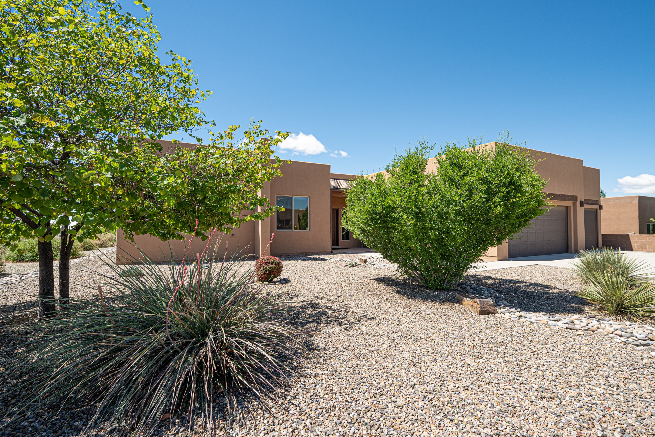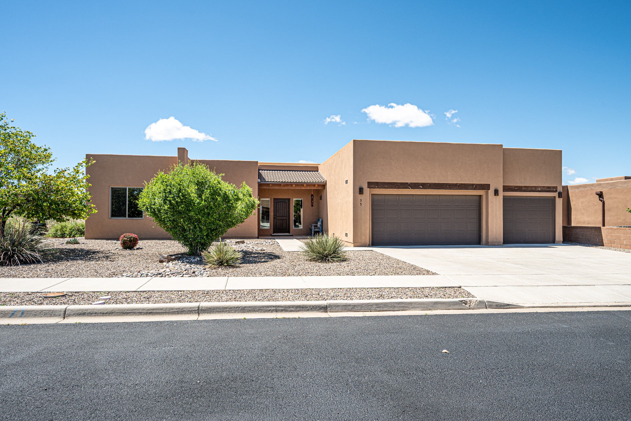 This thoughtfully designed three-bedroom, two-bathroom home offers space, comfort, and elegance in a peaceful neighborhood that is both easy to live in and commute from. The single-level home spans +/- 2000 square feet and includes a 200+ sqft attached studio (the converted third garage bay)--ideal as a fourth bedroom, office, or creative space. A bright living room with a cozy fireplace invites relaxation, while the modern kitchen features stainless steel appliances, stone counters, and ample space for cooking and entertaining. High ceilings, recessed lighting, and tile flooring enhance the open layout. The primary bedroom is complemented by an en-suite bathroom with double vanities, soaking tub with separate shower, and a generous walk-in closet. Two additional bedrooms provide flexibility for family or remote work. Located in the back of the development with views of green space and close to walking trails, your private outdoor space will feel limitless. Mature landscaping, the covered back portal and large side pergola combine to offer space for gatherings, gardening, or quiet moments. Other features include an attached 2-car garage, central AC and heat, and a roof with transferable warranty. Located near the Dinosaur Trail Trailhead and close to local supermarkets and healthcare, this home combines practical living with Santa Fe charm.