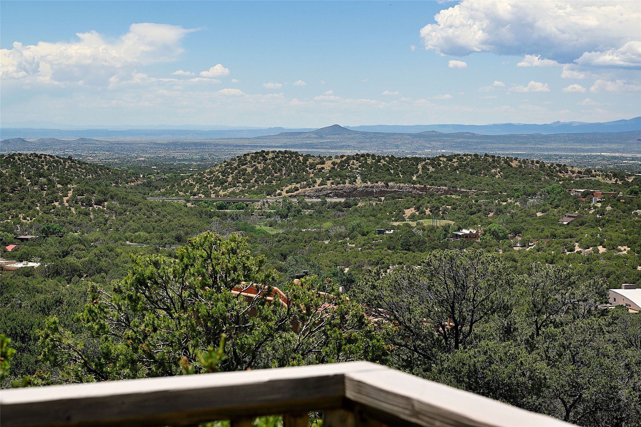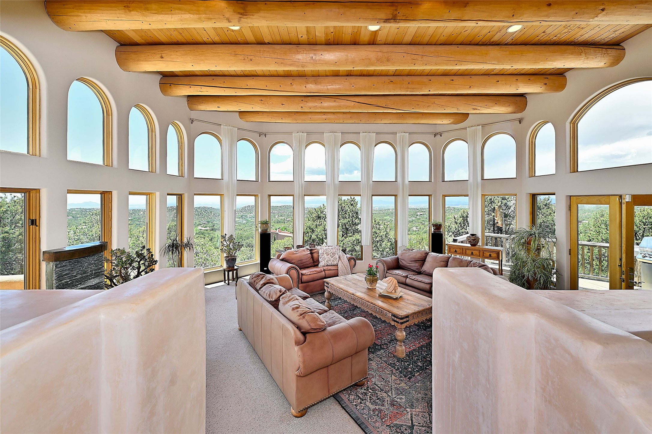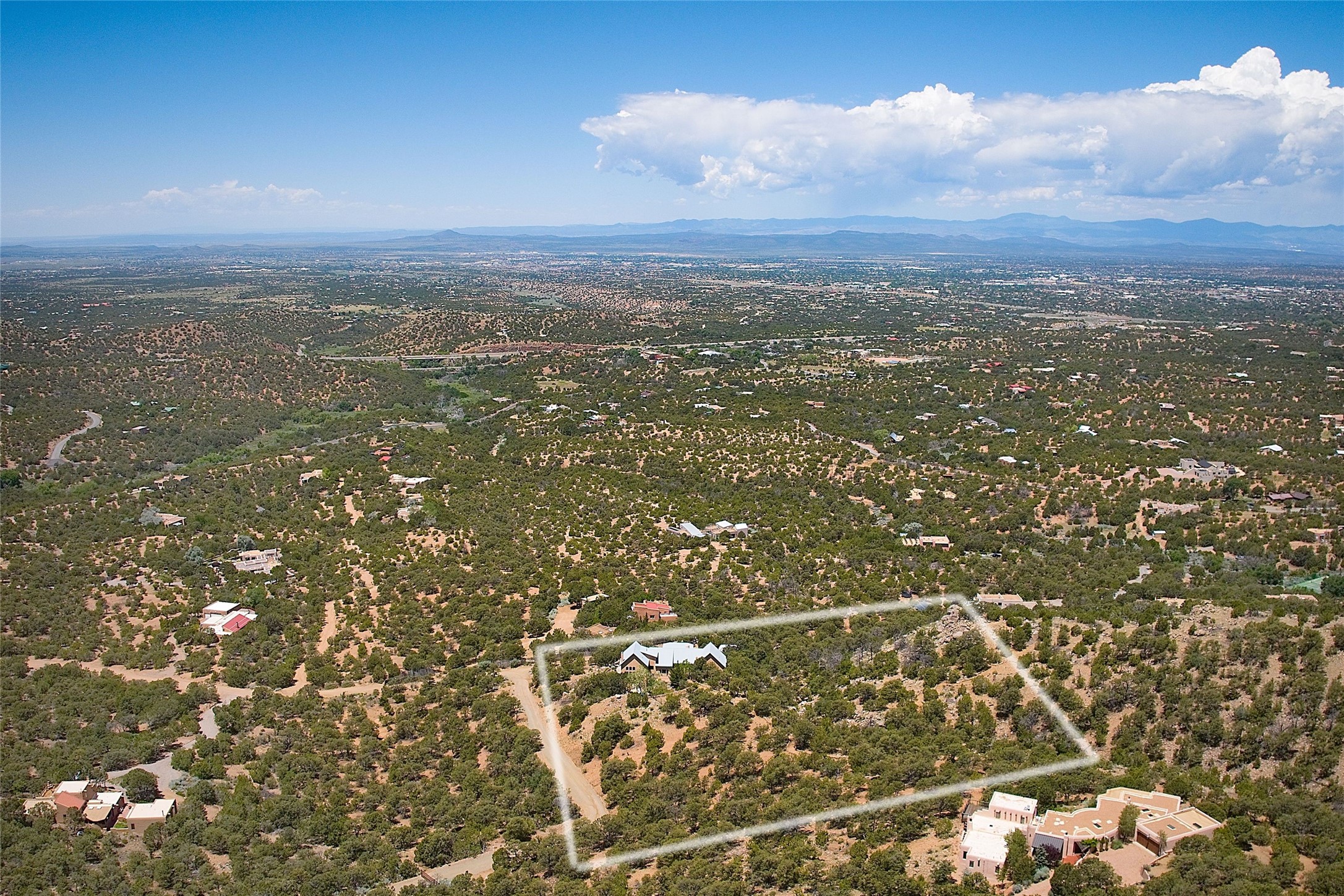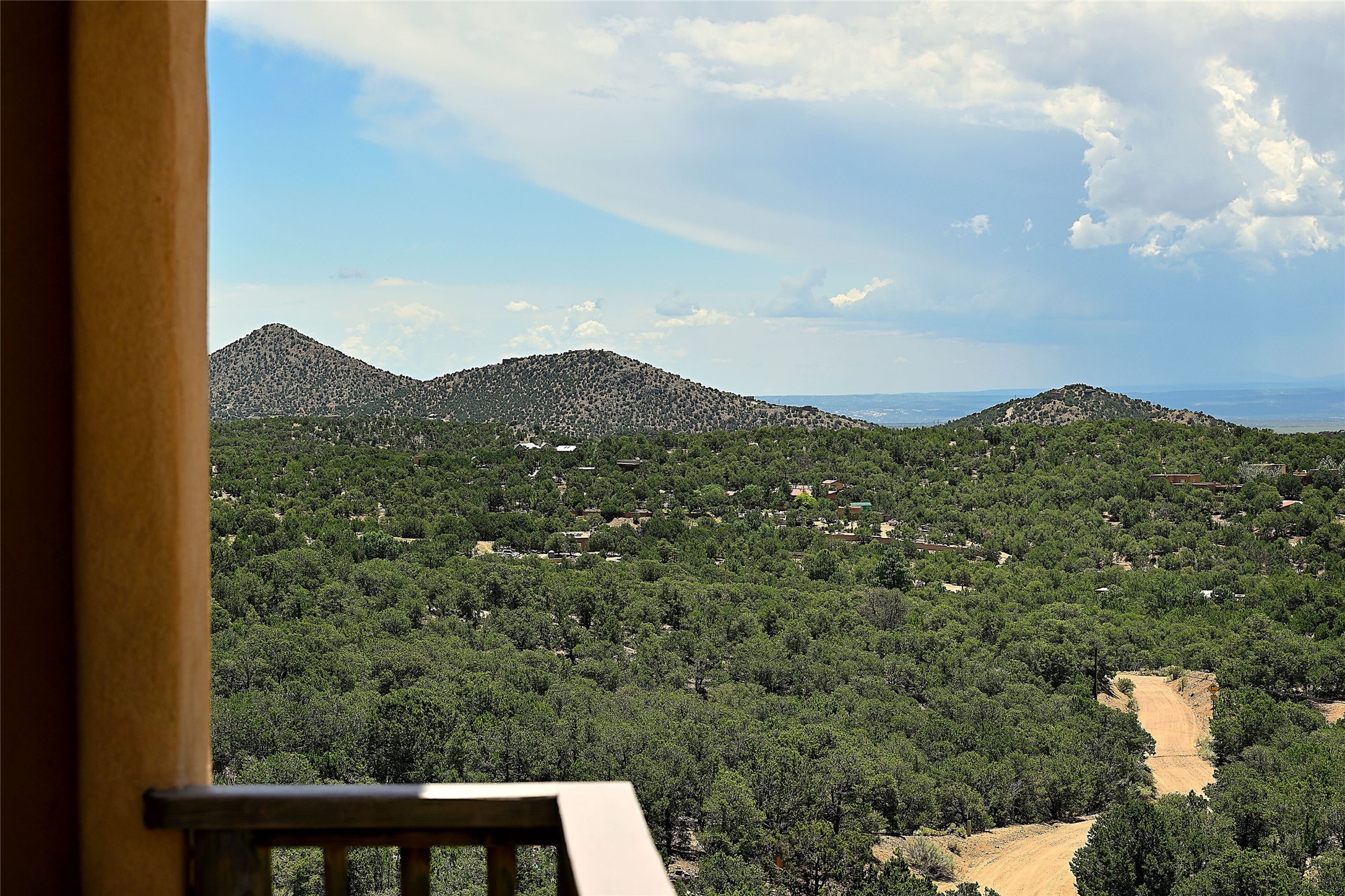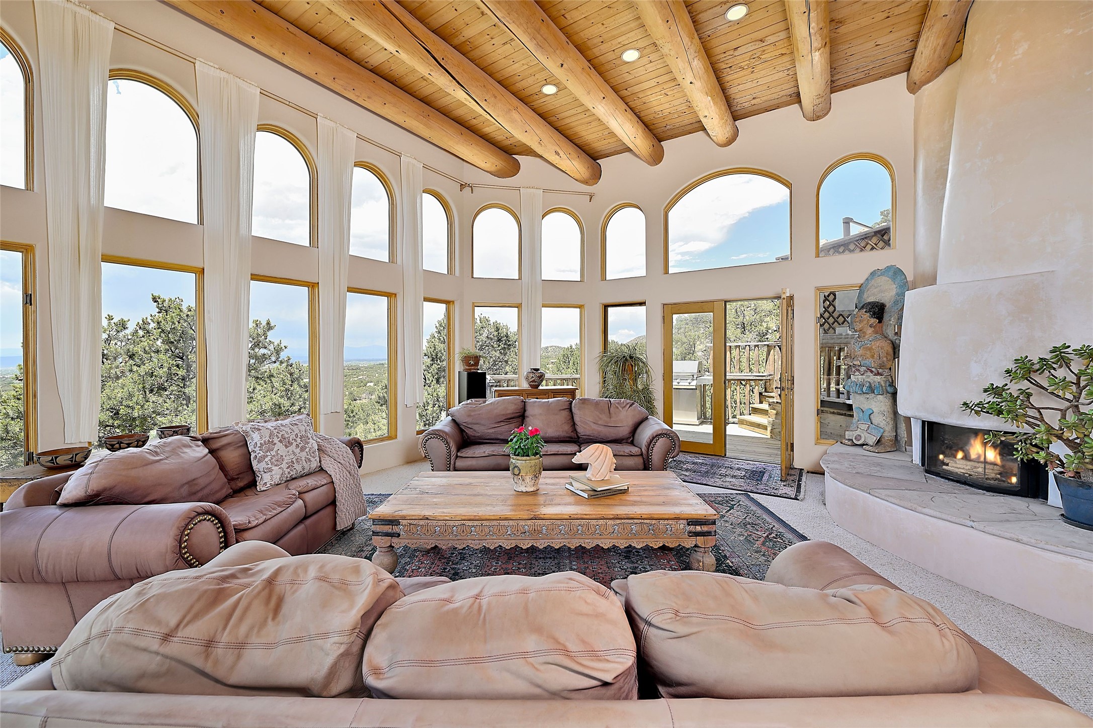 Elevated Living in Santa Fe's Foothills: A Majestic Retreat with Unrivaled ViewsPerched at approximately 7,500 feet, this unique Santa Fe residence offers a top-of-the-world experience, blending seclusion with breathtaking vistas across five mountain ranges. From fiery sunsets and dramatic desert storms to shimmering city lights, this home captures the ever-changing beauty of Northern New Mexico.Designed for those seeking comfort, privacy, and inspiration, the residence sits on five pinon-studded acres -- with an astonishing skyline and easy access to Santa Fe. It's just nine minutes from the historic Plaza, world-class dining, and renowned museums. A thoughtfully sited trail leads to a scenic overlook at top of the property, perfect for early evening toasts in the glow of twilight.Inside, the great room invites abundant natural light through soaring two-story windows and opens to three spacious decks--ideal for embracing the splendor of the high desert sky. The interiors are gracefully appointed with antique, artisan touches: hand-troweled plaster walls, ash and sandstone floors, and hand-crafted cabinetry. Traditional elements like oversized vigas, rough-hewn pine, and smooth-crafted latillas provide warmth and a sense of place.Five wood-burning fireplaces -- three of them harmonized in a Suisse-inspired layout -- bring cozy charm to the living, dining, and outdoor spaces during cooler months. The open kitchen, outdoor spaces and generous and inviting living areas make entertaining exhilarating and effortless.The home's three-bedroom floorplan includes a luxurious main-level primary suite with spa bath, walk-in closet, and direct deck access. Upstairs, a second glorious suite -- currently used as an art studio --presents show-stopping views and its own magnificent terrace. The third bedroom, downstairs, overlooks the courtyard, with its own en-suite bath. Additional architectural details include special northeast facing moon-view windows, beautifully framing the boulder, stone and earth-wrapped cove below with native plantings and lawn -- a perfect nook for shaded afternoon retreats.A thoughtfully planned fenced dog run makes this property as pet-friendly as it is people-perfect.