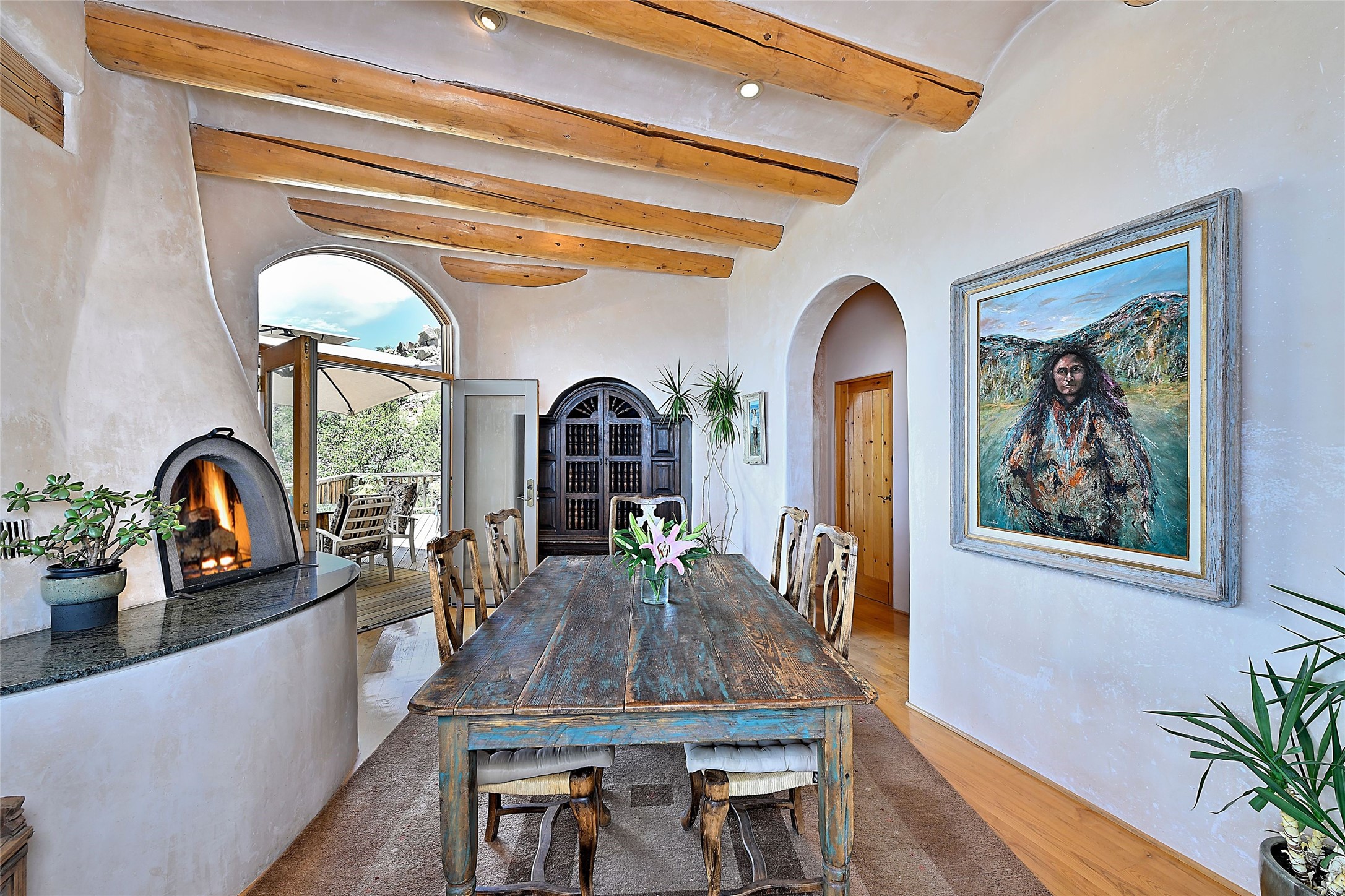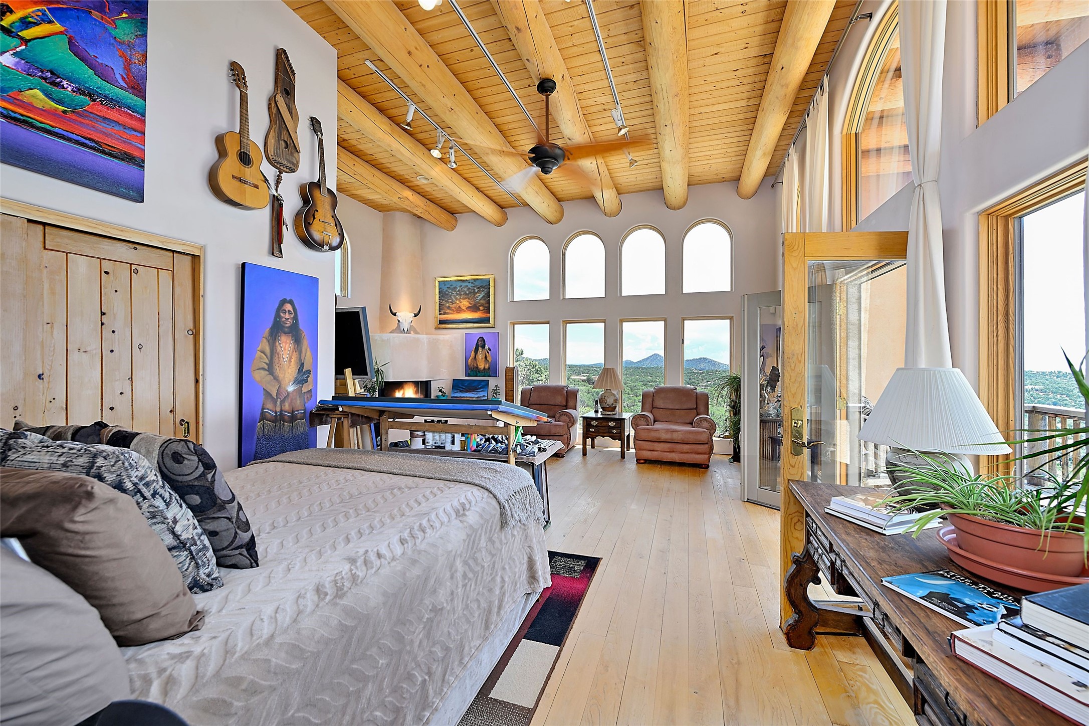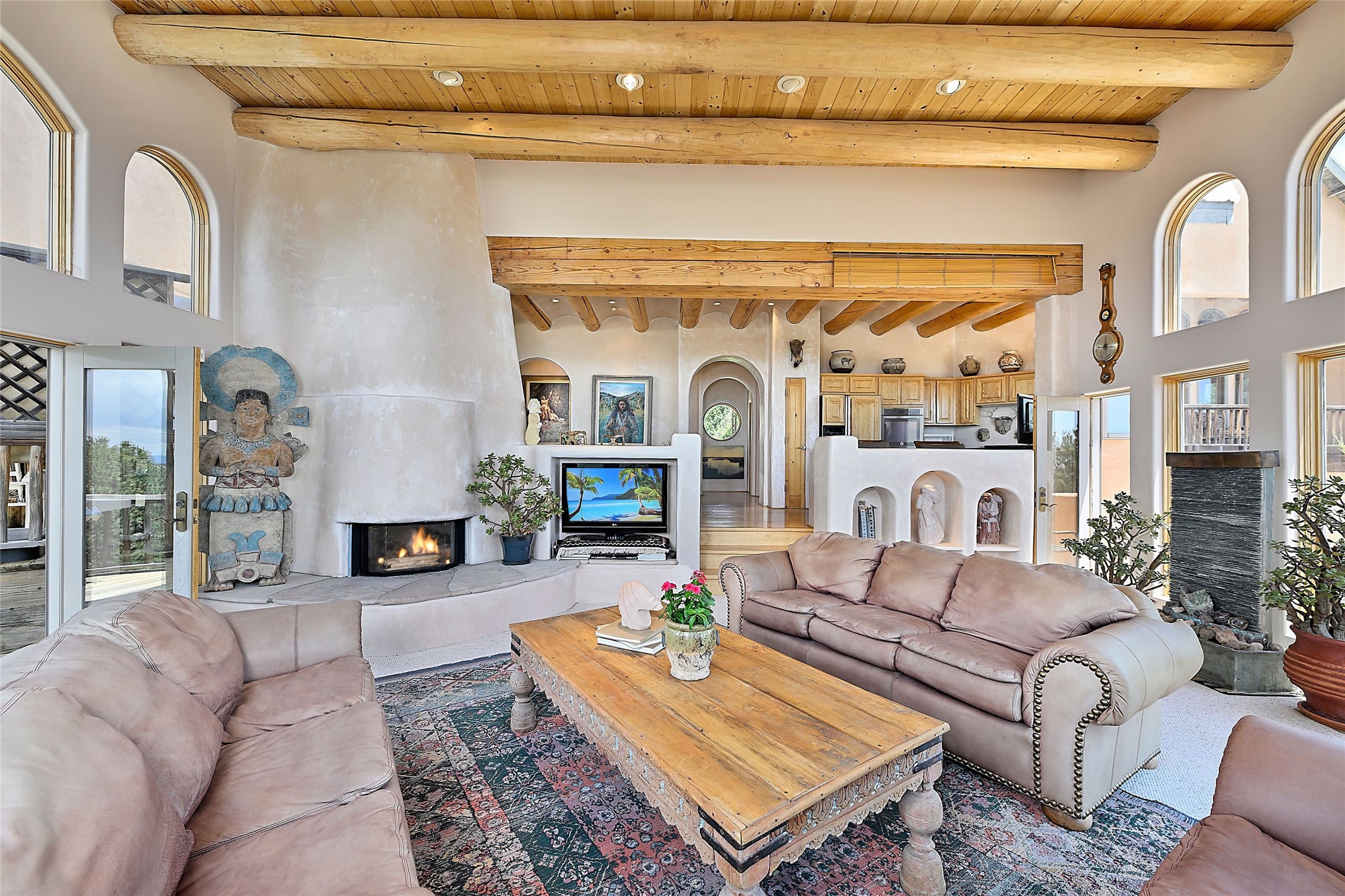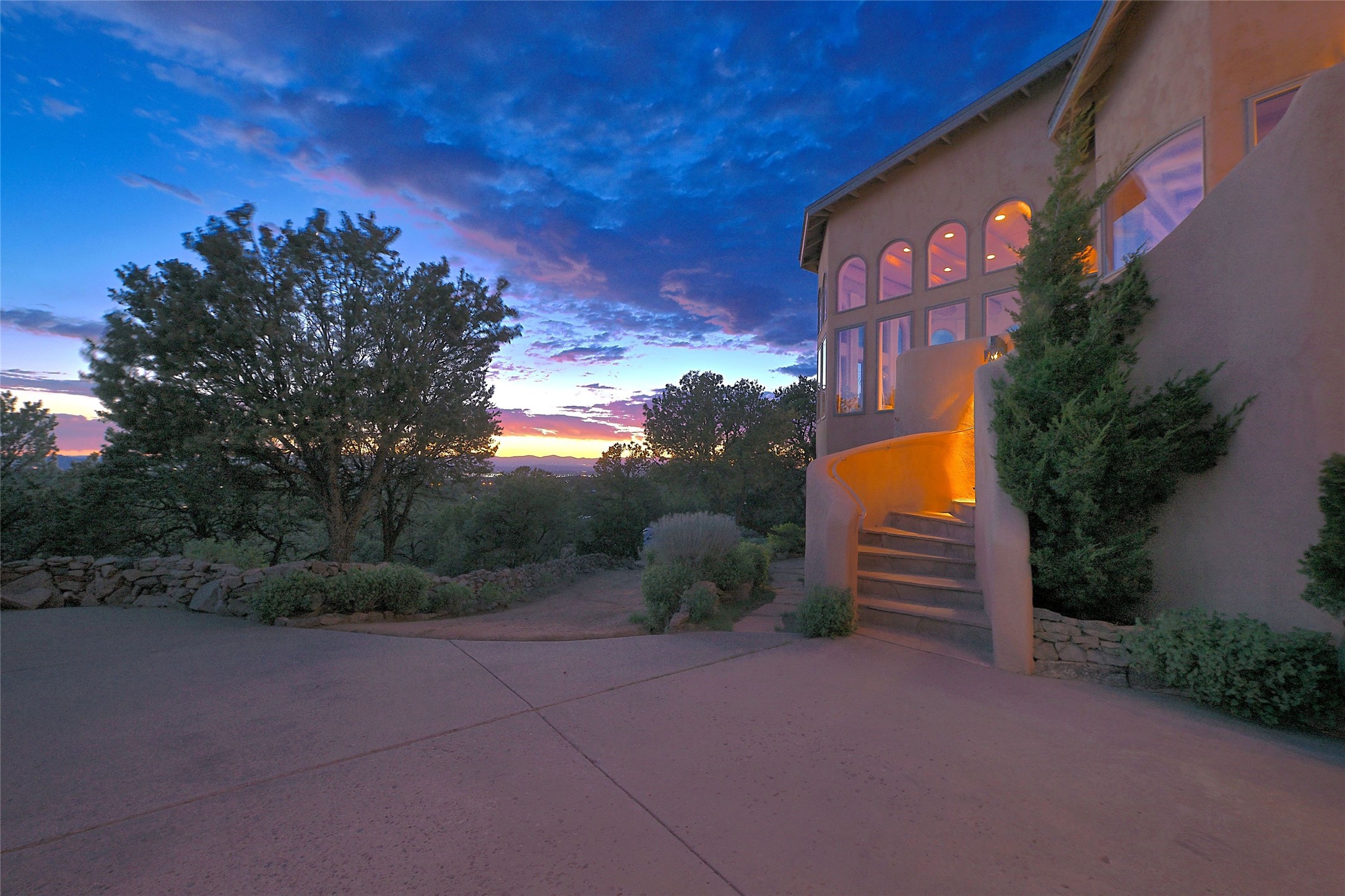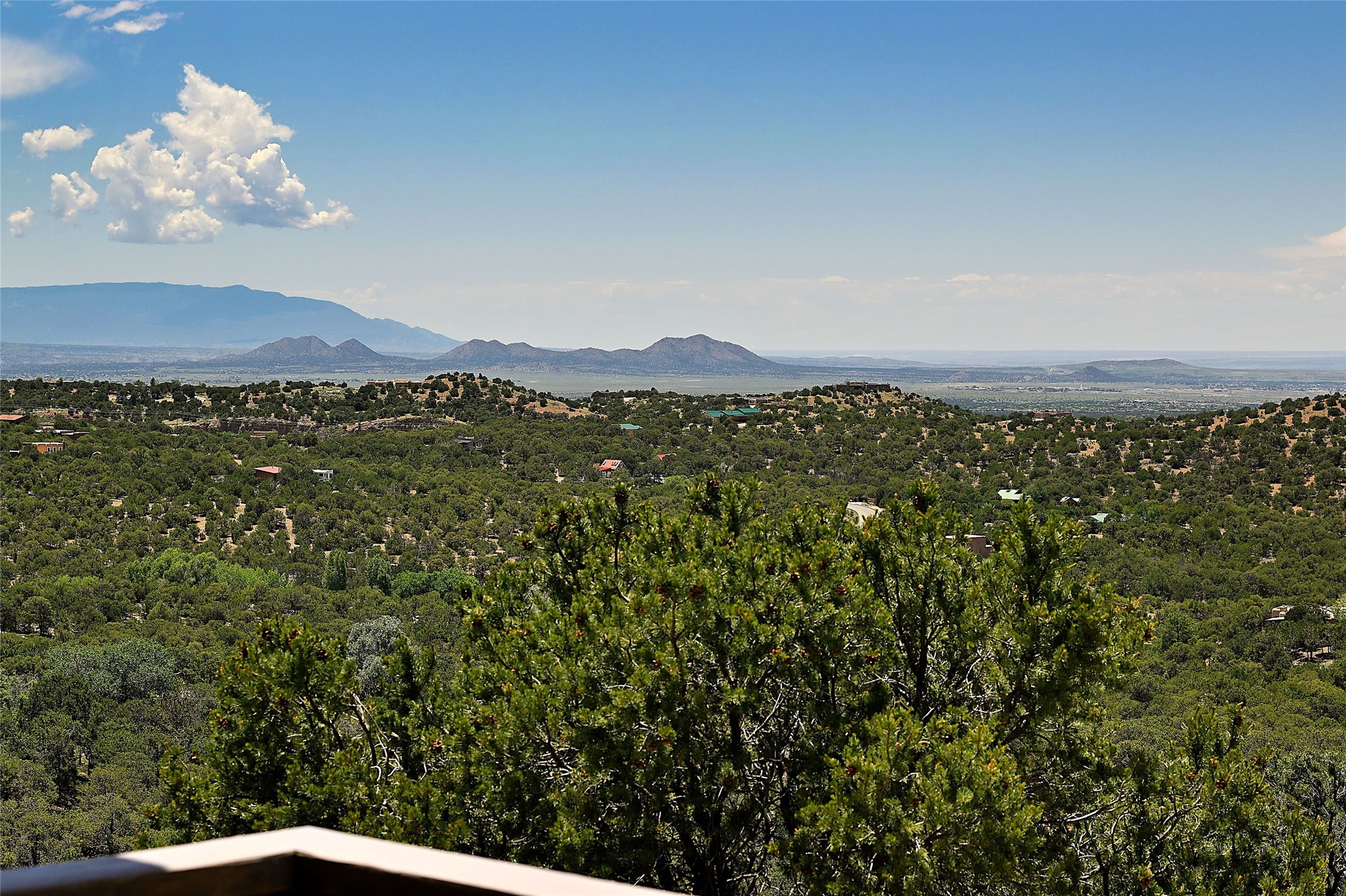 Elevated Living in Santa Fe's Foothills: A Majestic Retreat with Unrivaled ViewsPerched at approximately 7,500 feet, this unique Santa Fe residence offers a top-of-the-world experience, blending seclusion with breathtaking vistas across five mountain ranges. From fiery sunsets and dramatic desert storms to shimmering city lights, this home captures the ever-changing beauty of Northern New Mexico.Designed for those seeking comfort, privacy, and inspiration, the residence sits on five pinon-studded acres -- with an astonishing skyline and easy access to Santa Fe. It's just nine minutes from the historic Plaza, world-class dining, and renowned museums. A thoughtfully sited trail leads to a scenic overlook at top of the property, perfect for early evening toasts in the glow of twilight.Inside, the great room invites abundant natural light through soaring two-story windows and opens to three spacious decks--ideal for embracing the splendor of the high desert sky. The interiors are gracefully appointed with antique, artisan touches: hand-troweled plaster walls, ash and sandstone floors, and hand-crafted cabinetry. Traditional elements like oversized vigas, rough-hewn pine, and smooth-crafted latillas provide warmth and a sense of place.Five wood-burning fireplaces -- three of them harmonized in a Suisse-inspired layout -- bring cozy charm to the living, dining, and outdoor spaces during cooler months. The open kitchen, outdoor spaces and generous and inviting living areas make entertaining exhilarating and effortless.The home's three-bedroom floorplan includes a luxurious main-level primary suite with spa bath, walk-in closet, and direct deck access. Upstairs, a second glorious suite -- currently used as an art studio --presents show-stopping views and its own magnificent terrace. The third bedroom, downstairs, overlooks the courtyard, with its own en-suite bath. Additional architectural details include special northeast facing moon-view windows, beautifully framing the boulder, stone and earth-wrapped cove below with native plantings and lawn -- a perfect nook for shaded afternoon retreats.A thoughtfully planned fenced dog run makes this property as pet-friendly as it is people-perfect.