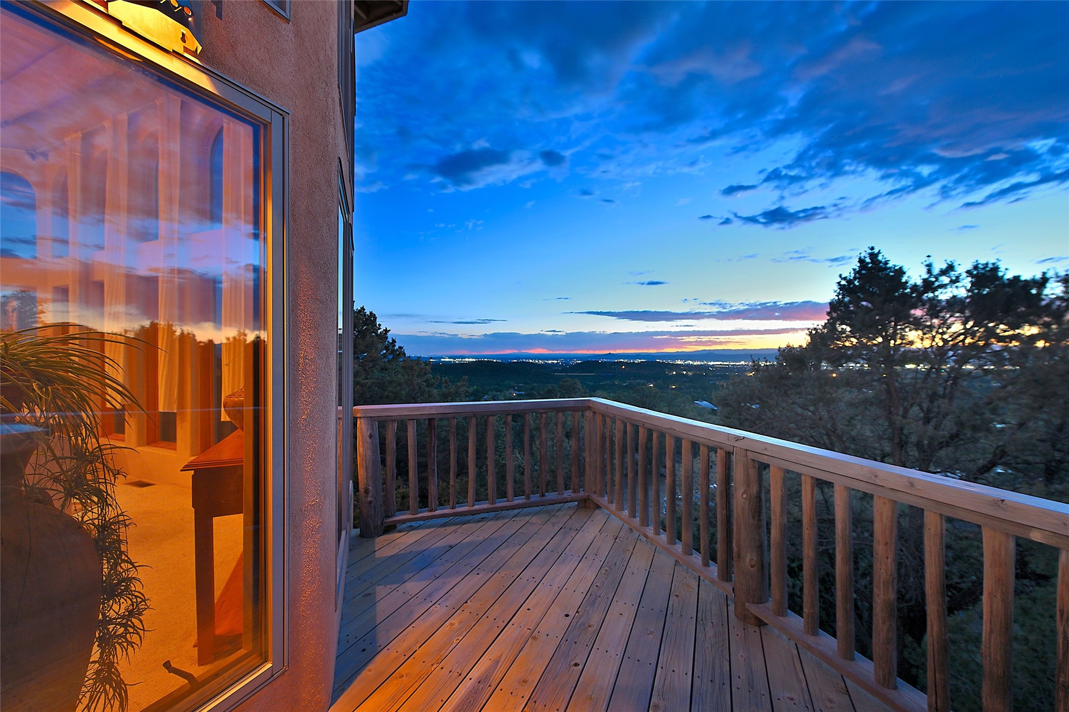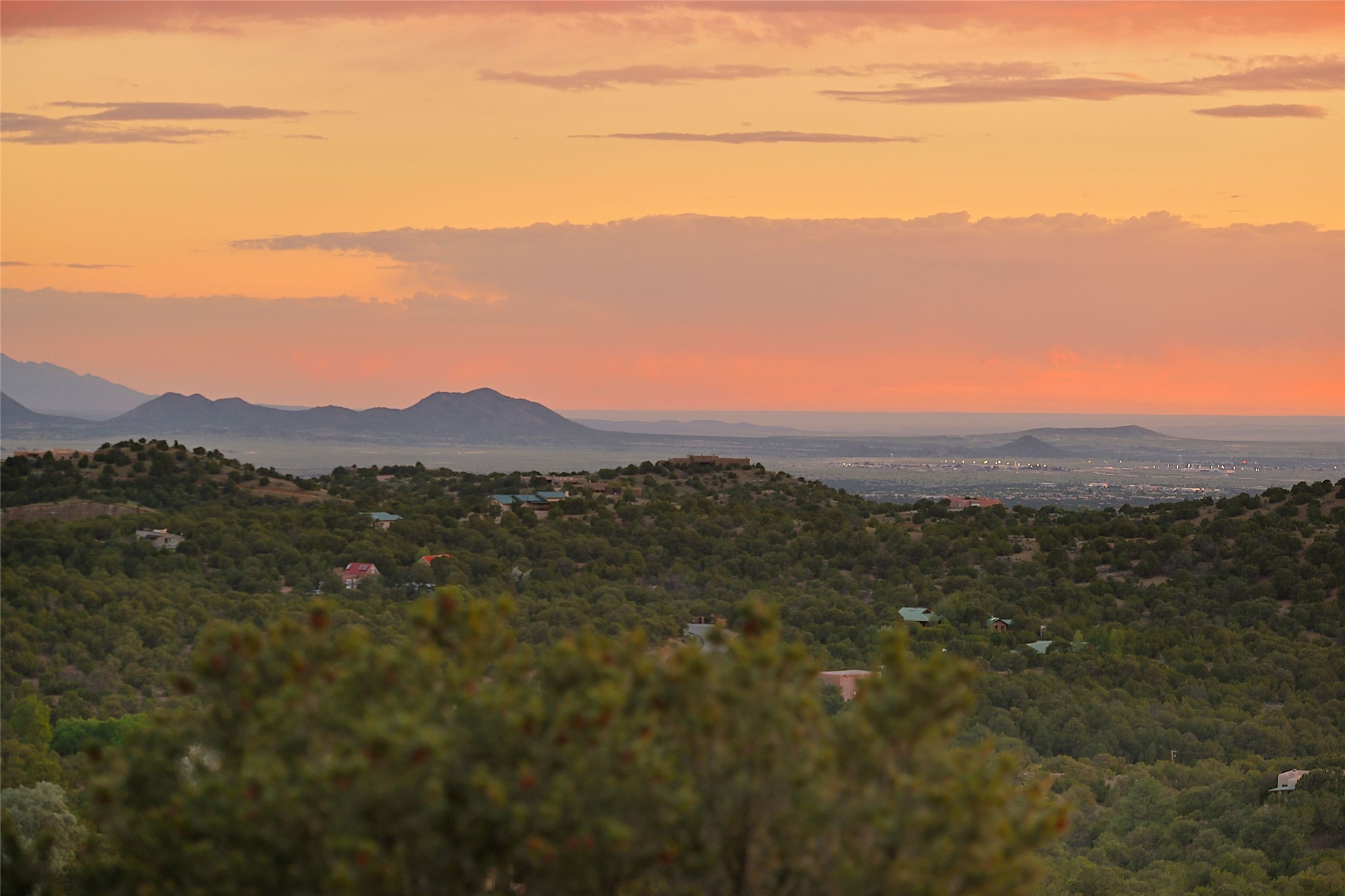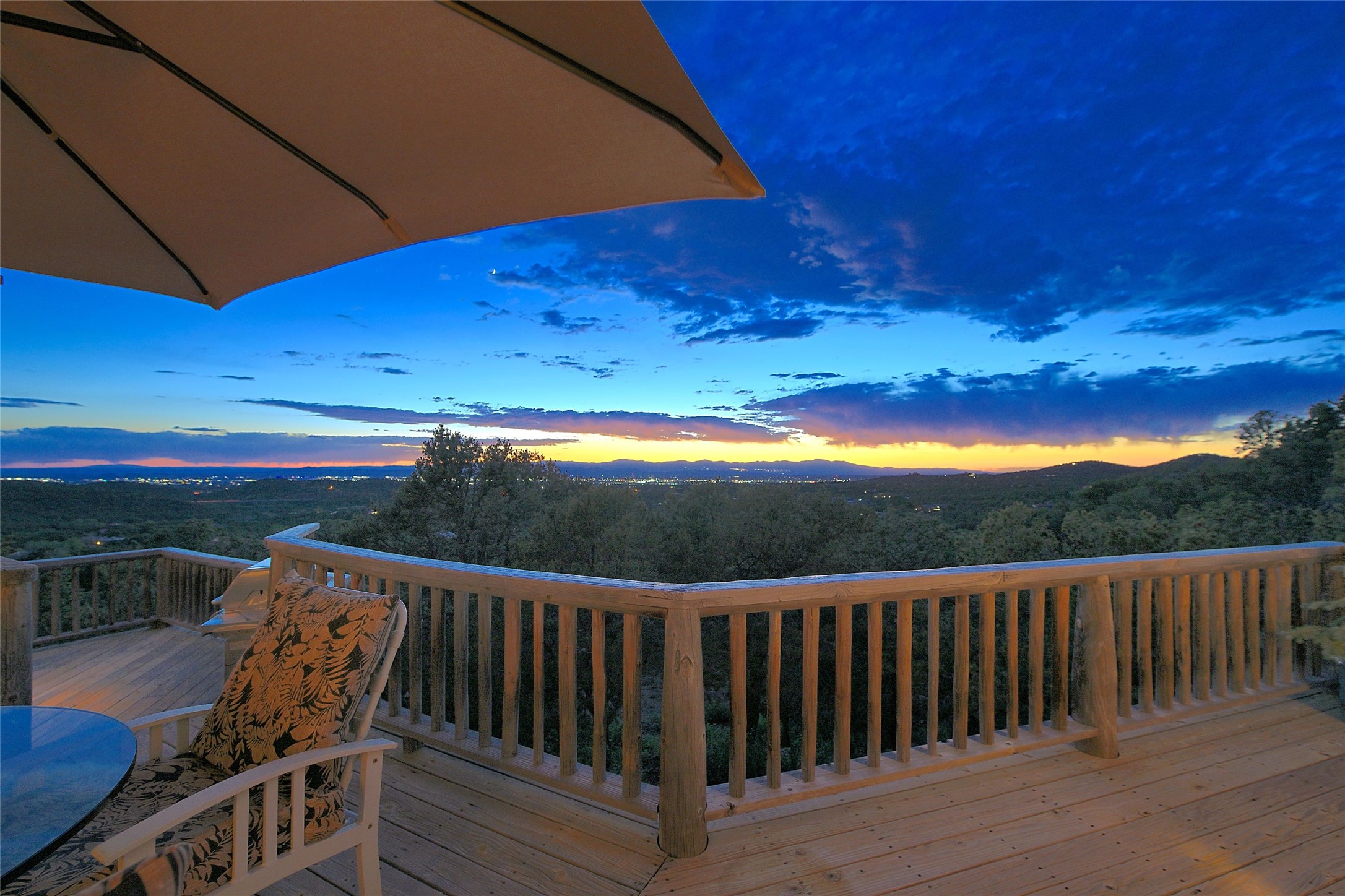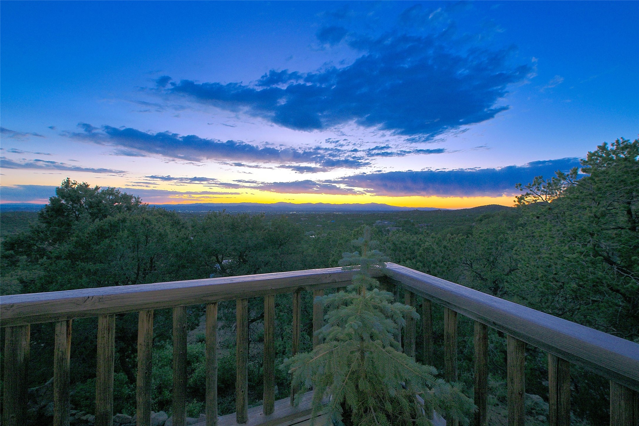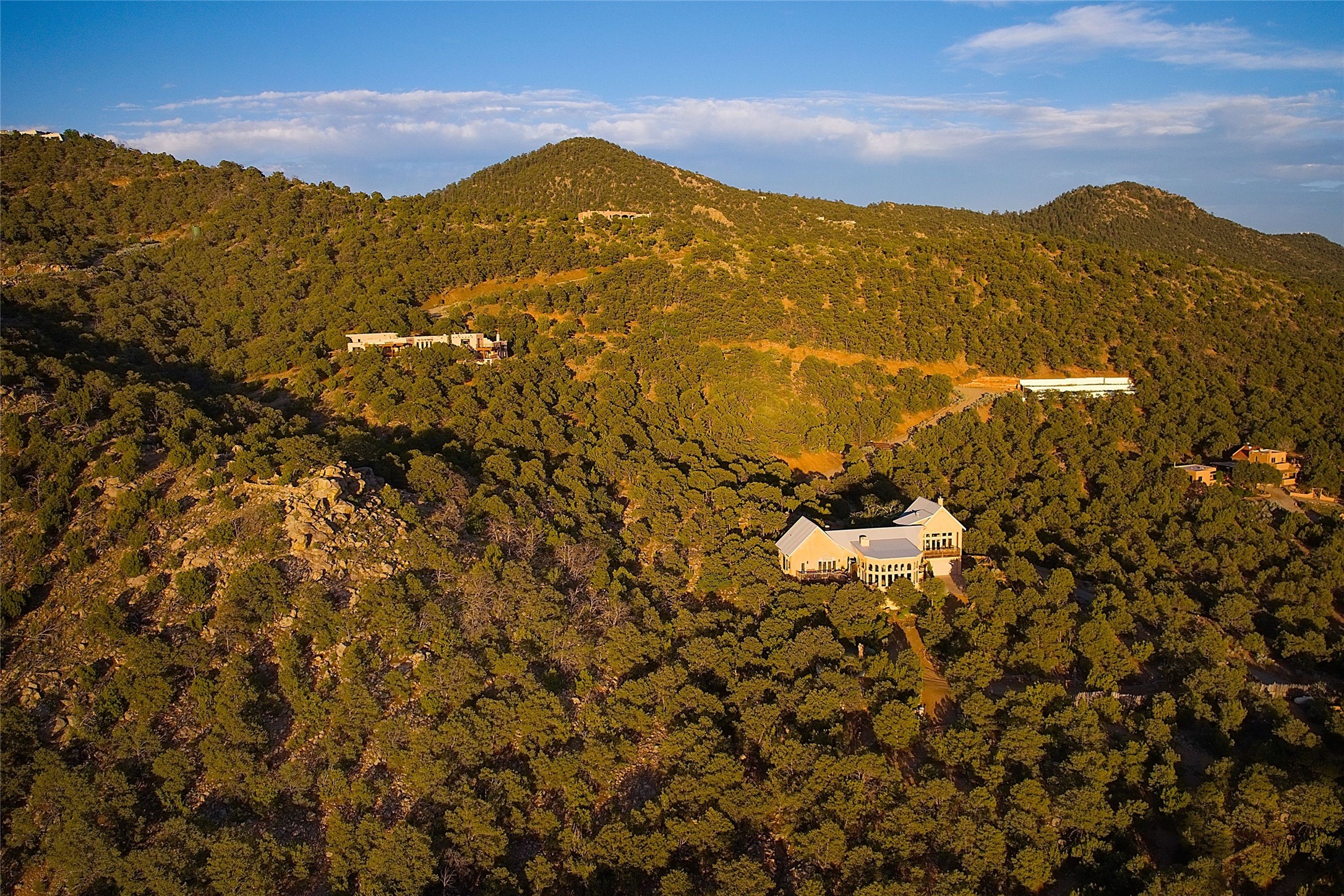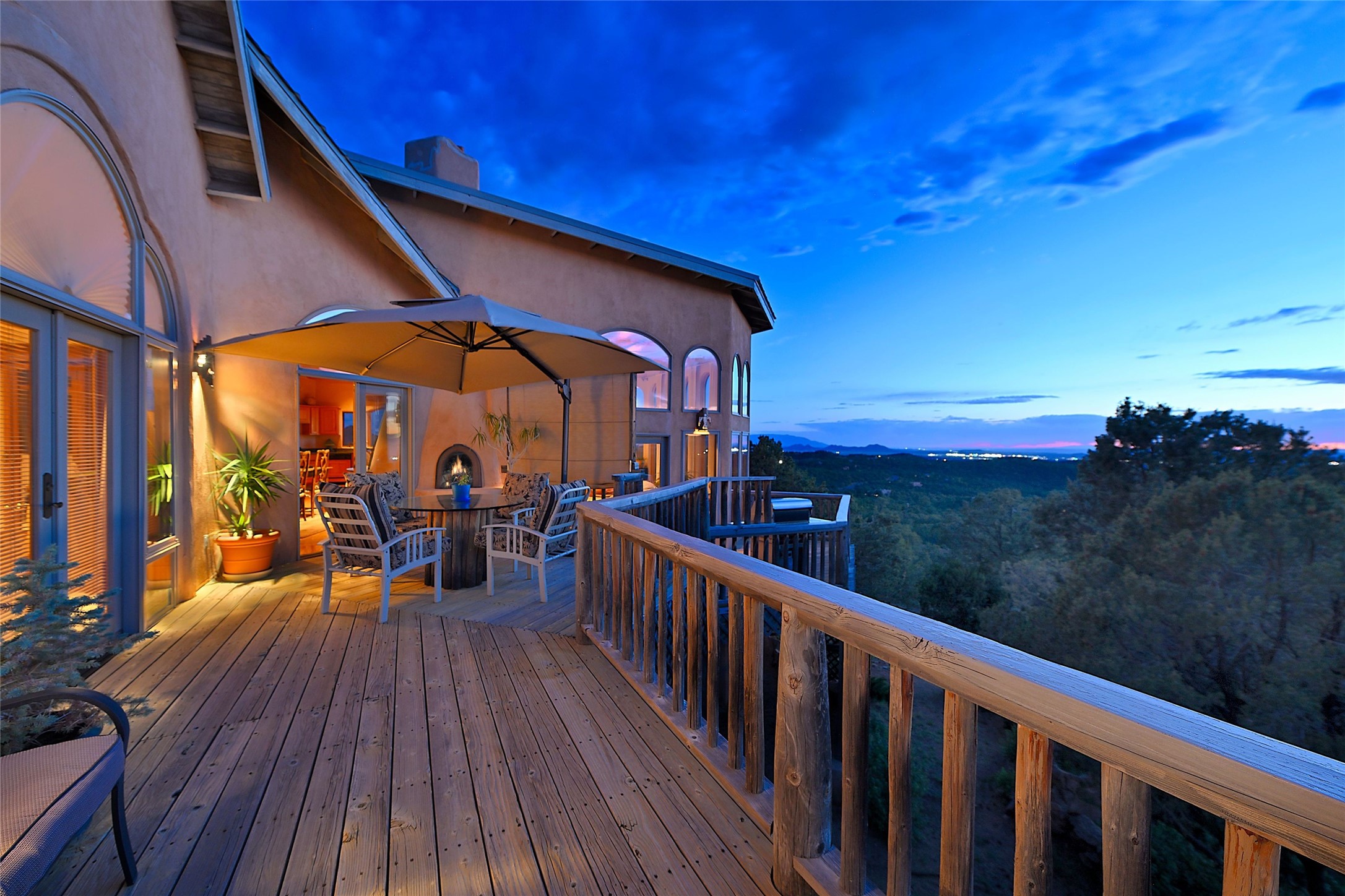 Elevated Living in Santa Fe's Foothills: A Majestic Retreat with Unrivaled ViewsPerched at approximately 7,500 feet, this unique Santa Fe residence offers a top-of-the-world experience, blending seclusion with breathtaking vistas across five mountain ranges. From fiery sunsets and dramatic desert storms to shimmering city lights, this home captures the ever-changing beauty of Northern New Mexico.Designed for those seeking comfort, privacy, and inspiration, the residence sits on five pinon-studded acres -- with an astonishing skyline and easy access to Santa Fe. It's just nine minutes from the historic Plaza, world-class dining, and renowned museums. A thoughtfully sited trail leads to a scenic overlook at top of the property, perfect for early evening toasts in the glow of twilight.Inside, the great room invites abundant natural light through soaring two-story windows and opens to three spacious decks--ideal for embracing the splendor of the high desert sky. The interiors are gracefully appointed with antique, artisan touches: hand-troweled plaster walls, ash and sandstone floors, and hand-crafted cabinetry. Traditional elements like oversized vigas, rough-hewn pine, and smooth-crafted latillas provide warmth and a sense of place.Five wood-burning fireplaces -- three of them harmonized in a Suisse-inspired layout -- bring cozy charm to the living, dining, and outdoor spaces during cooler months. The open kitchen, outdoor spaces and generous and inviting living areas make entertaining exhilarating and effortless.The home's three-bedroom floorplan includes a luxurious main-level primary suite with spa bath, walk-in closet, and direct deck access. Upstairs, a second glorious suite -- currently used as an art studio --presents show-stopping views and its own magnificent terrace. The third bedroom, downstairs, overlooks the courtyard, with its own en-suite bath. Additional architectural details include special northeast facing moon-view windows, beautifully framing the boulder, stone and earth-wrapped cove below with native plantings and lawn -- a perfect nook for shaded afternoon retreats.A thoughtfully planned fenced dog run makes this property as pet-friendly as it is people-perfect.