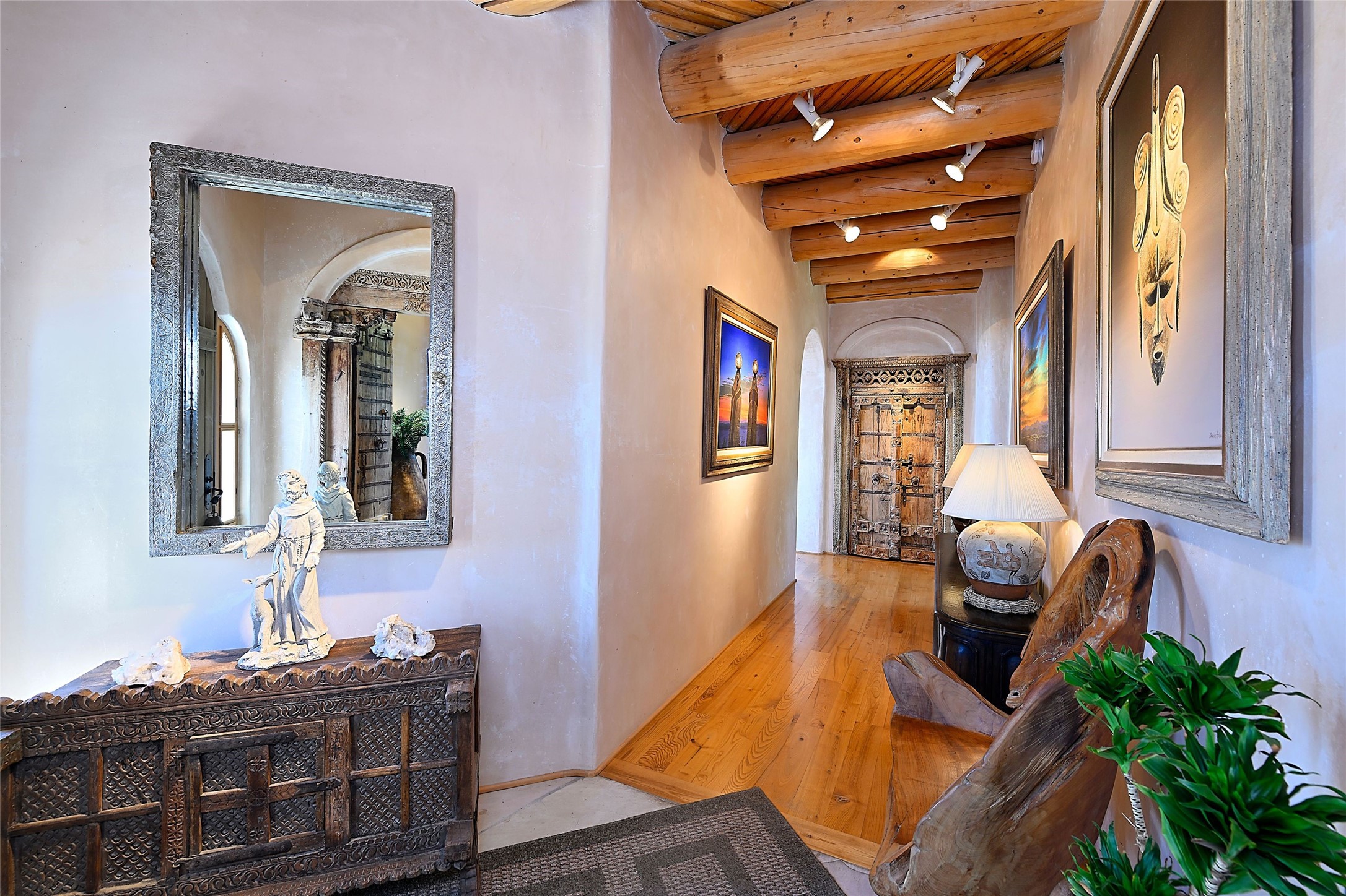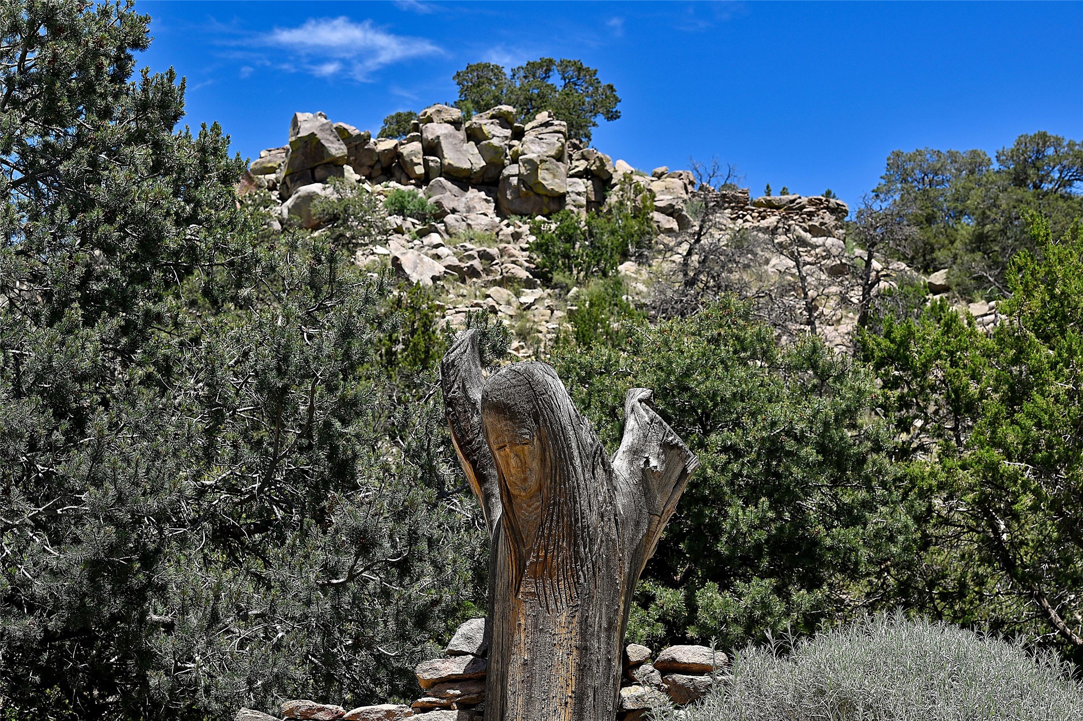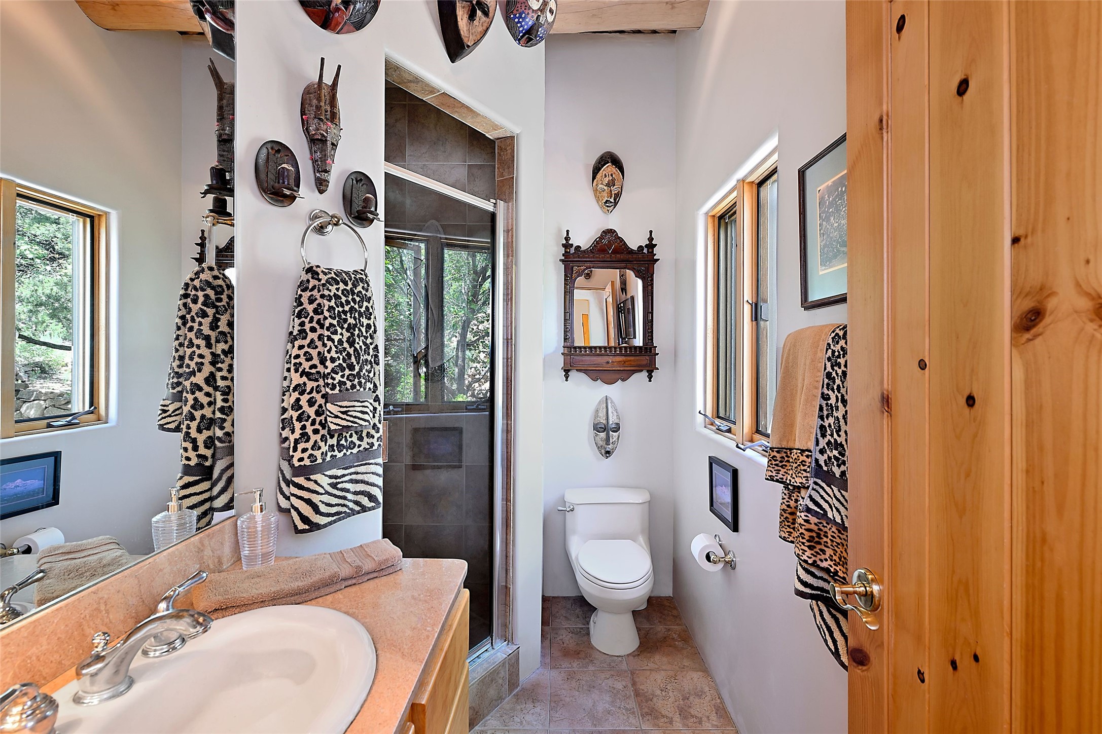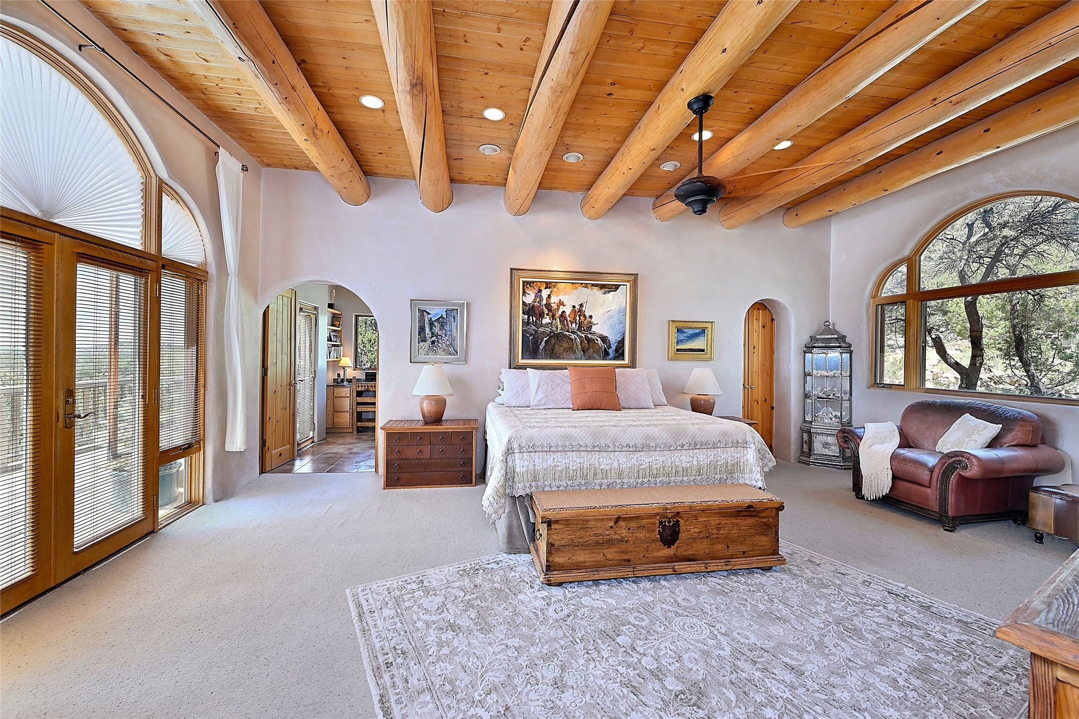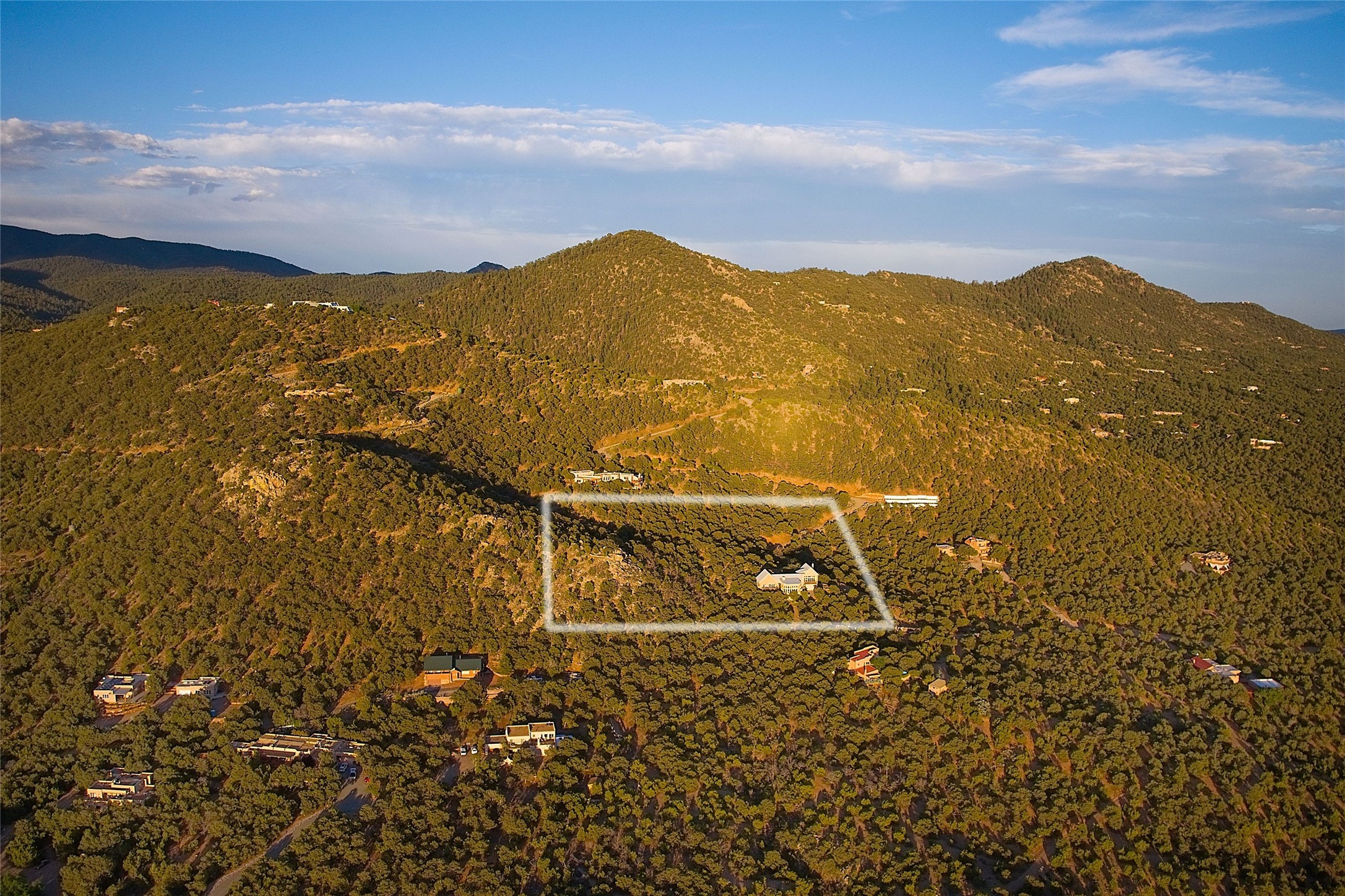 Elevated Living in Santa Fe's Foothills: A Majestic Retreat with Unrivaled ViewsPerched at approximately 7,500 feet, this unique Santa Fe residence offers a top-of-the-world experience, blending seclusion with breathtaking vistas across five mountain ranges. From fiery sunsets and dramatic desert storms to shimmering city lights, this home captures the ever-changing beauty of Northern New Mexico.Designed for those seeking comfort, privacy, and inspiration, the residence sits on five pinon-studded acres -- with an astonishing skyline and easy access to Santa Fe. It's just nine minutes from the historic Plaza, world-class dining, and renowned museums. A thoughtfully sited trail leads to a scenic overlook at top of the property, perfect for early evening toasts in the glow of twilight.Inside, the great room invites abundant natural light through soaring two-story windows and opens to three spacious decks--ideal for embracing the splendor of the high desert sky. The interiors are gracefully appointed with antique, artisan touches: hand-troweled plaster walls, ash and sandstone floors, and hand-crafted cabinetry. Traditional elements like oversized vigas, rough-hewn pine, and smooth-crafted latillas provide warmth and a sense of place.Five wood-burning fireplaces -- three of them harmonized in a Suisse-inspired layout -- bring cozy charm to the living, dining, and outdoor spaces during cooler months. The open kitchen, outdoor spaces and generous and inviting living areas make entertaining exhilarating and effortless.The home's three-bedroom floorplan includes a luxurious main-level primary suite with spa bath, walk-in closet, and direct deck access. Upstairs, a second glorious suite -- currently used as an art studio --presents show-stopping views and its own magnificent terrace. The third bedroom, downstairs, overlooks the courtyard, with its own en-suite bath. Additional architectural details include special northeast facing moon-view windows, beautifully framing the boulder, stone and earth-wrapped cove below with native plantings and lawn -- a perfect nook for shaded afternoon retreats.A thoughtfully planned fenced dog run makes this property as pet-friendly as it is people-perfect.