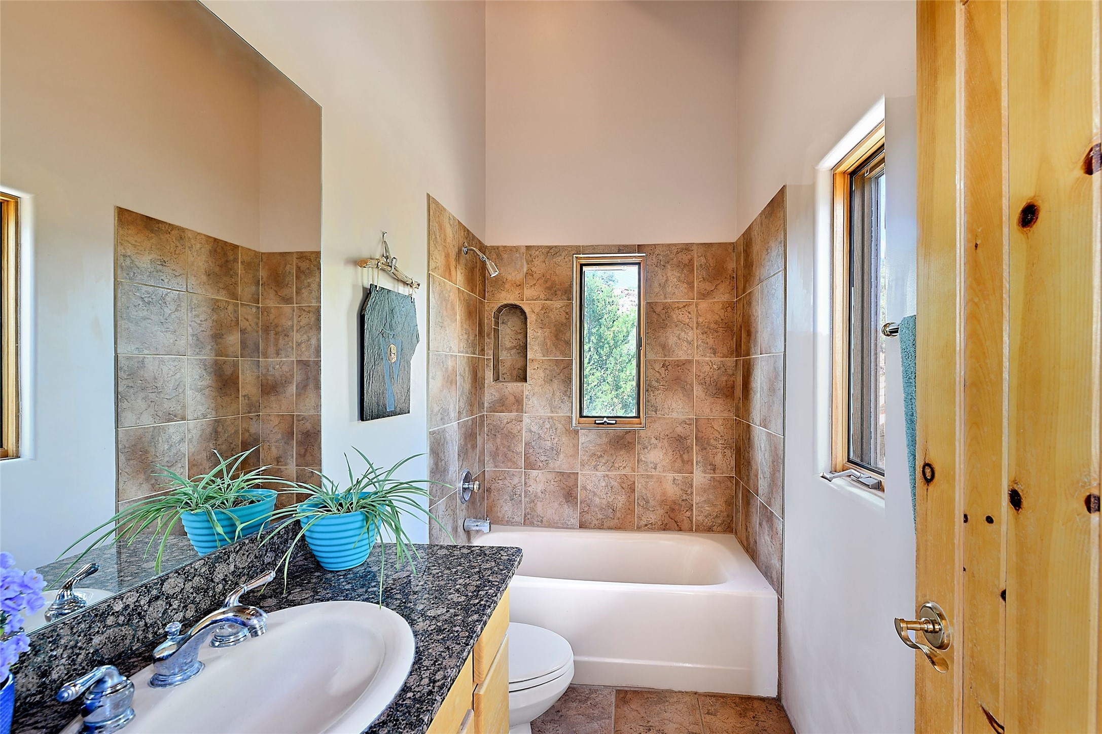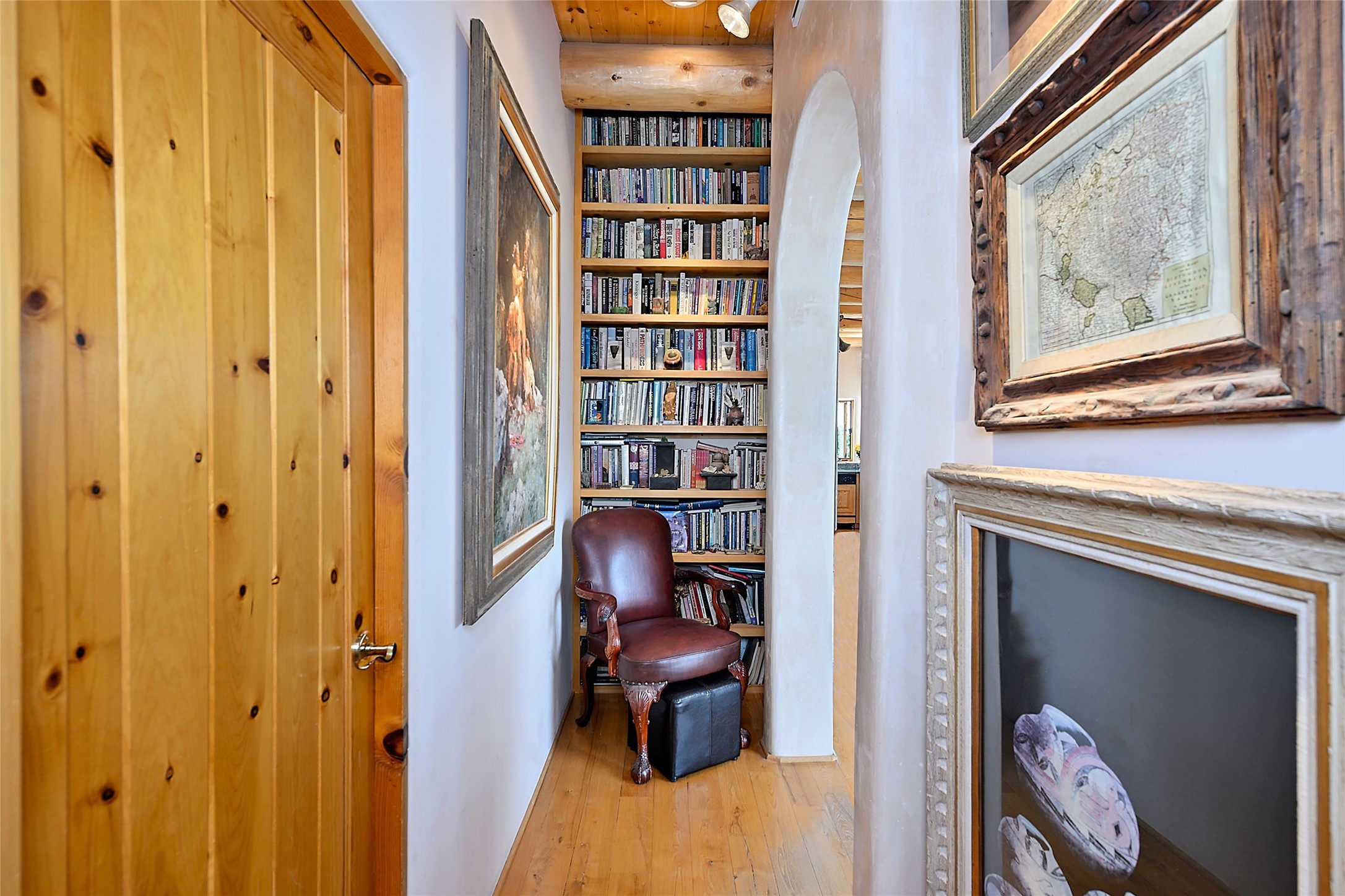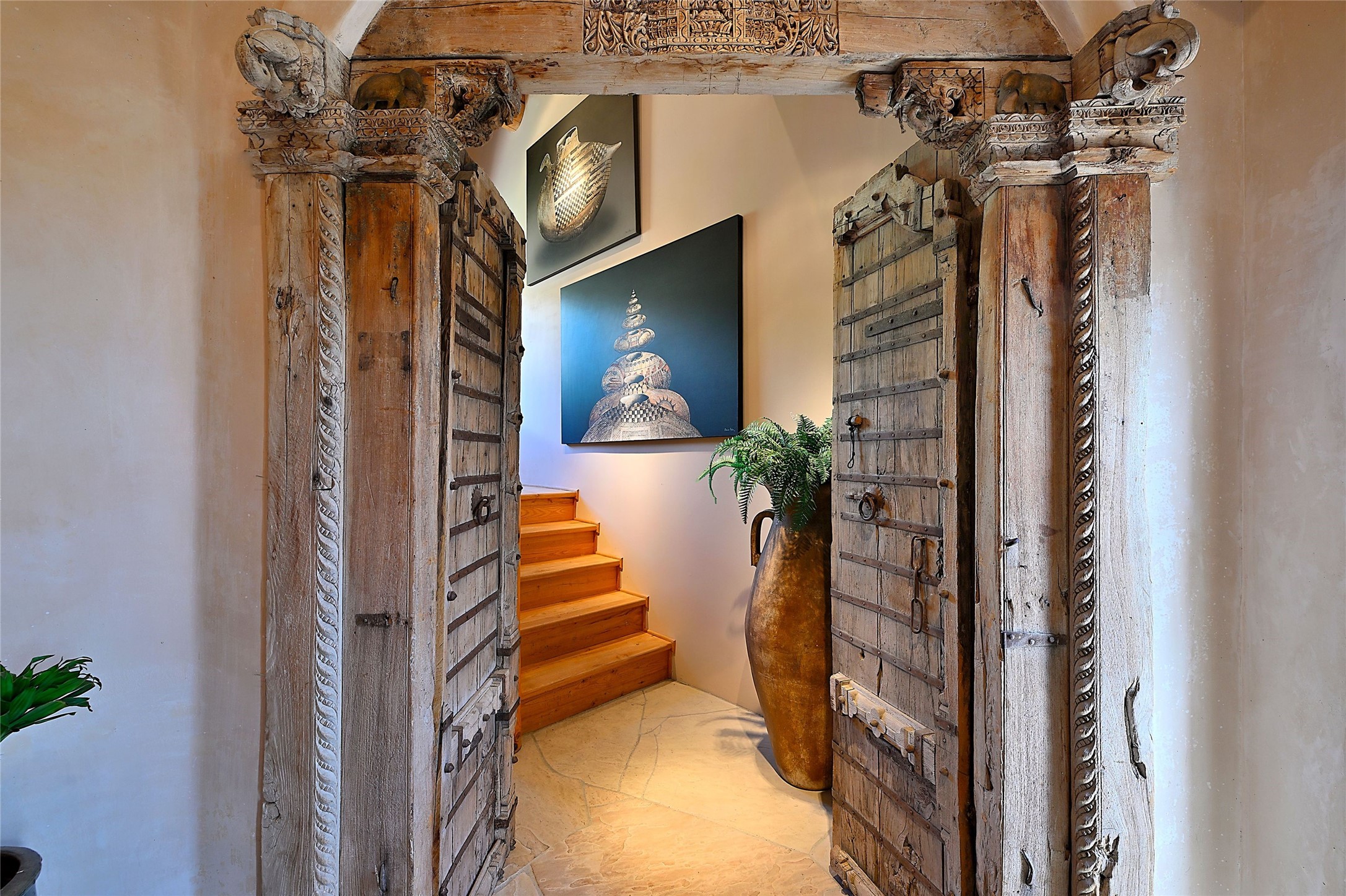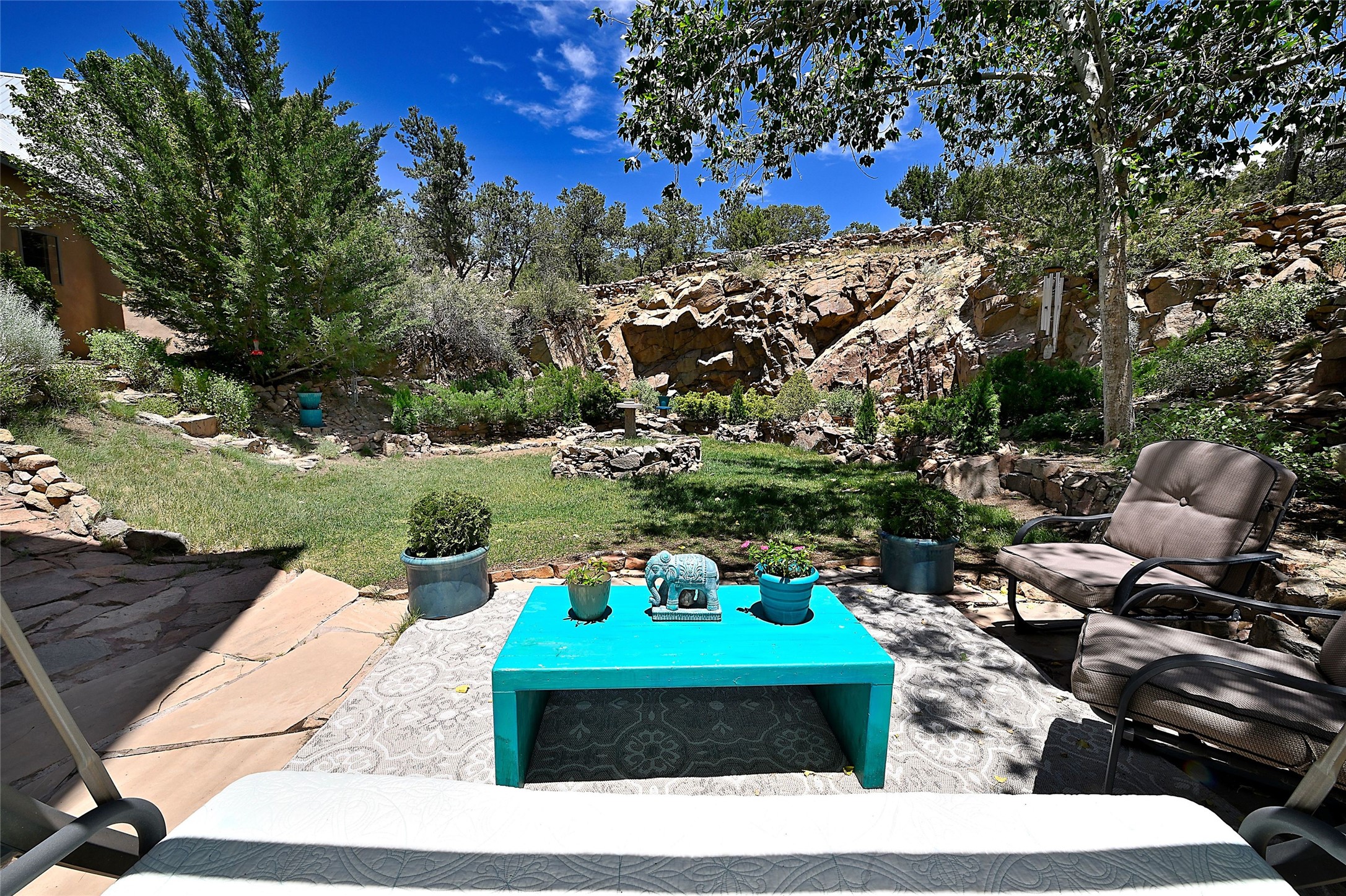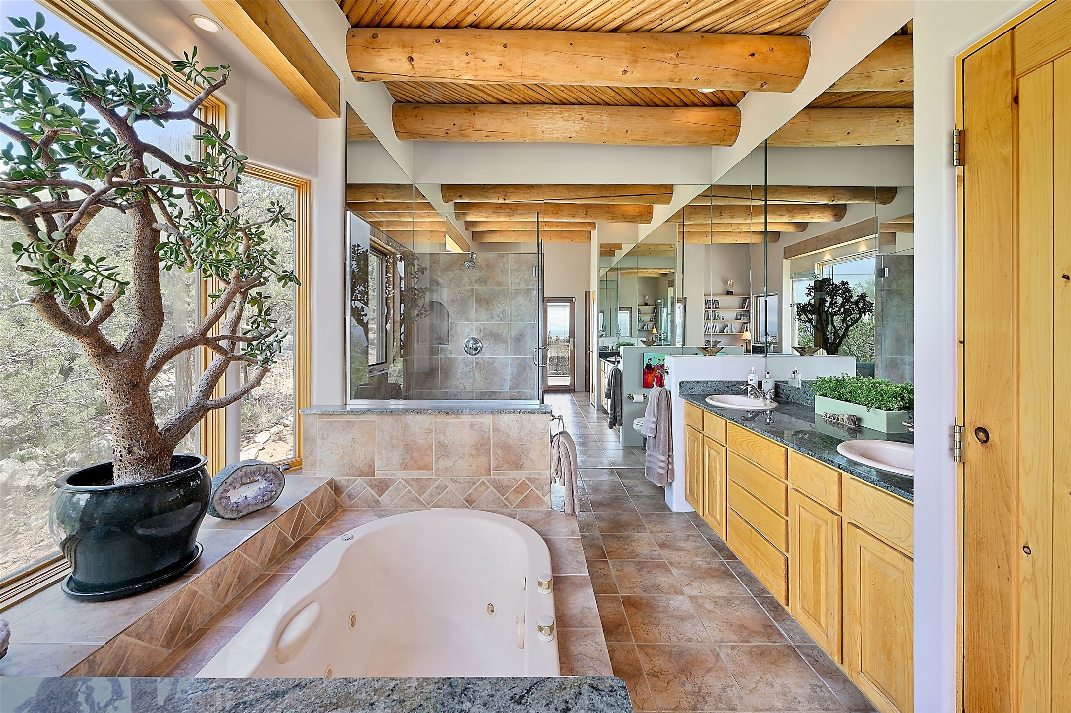 Elevated Living in Santa Fe's Foothills: A Majestic Retreat with Unrivaled ViewsPerched at approximately 7,500 feet, this unique Santa Fe residence offers a top-of-the-world experience, blending seclusion with breathtaking vistas across five mountain ranges. From fiery sunsets and dramatic desert storms to shimmering city lights, this home captures the ever-changing beauty of Northern New Mexico.Designed for those seeking comfort, privacy, and inspiration, the residence sits on five pinon-studded acres -- with an astonishing skyline and easy access to Santa Fe. It's just nine minutes from the historic Plaza, world-class dining, and renowned museums. A thoughtfully sited trail leads to a scenic overlook at top of the property, perfect for early evening toasts in the glow of twilight.Inside, the great room invites abundant natural light through soaring two-story windows and opens to three spacious decks--ideal for embracing the splendor of the high desert sky. The interiors are gracefully appointed with antique, artisan touches: hand-troweled plaster walls, ash and sandstone floors, and hand-crafted cabinetry. Traditional elements like oversized vigas, rough-hewn pine, and smooth-crafted latillas provide warmth and a sense of place.Five wood-burning fireplaces -- three of them harmonized in a Suisse-inspired layout -- bring cozy charm to the living, dining, and outdoor spaces during cooler months. The open kitchen, outdoor spaces and generous and inviting living areas make entertaining exhilarating and effortless.The home's three-bedroom floorplan includes a luxurious main-level primary suite with spa bath, walk-in closet, and direct deck access. Upstairs, a second glorious suite -- currently used as an art studio --presents show-stopping views and its own magnificent terrace. The third bedroom, downstairs, overlooks the courtyard, with its own en-suite bath. Additional architectural details include special northeast facing moon-view windows, beautifully framing the boulder, stone and earth-wrapped cove below with native plantings and lawn -- a perfect nook for shaded afternoon retreats.A thoughtfully planned fenced dog run makes this property as pet-friendly as it is people-perfect.