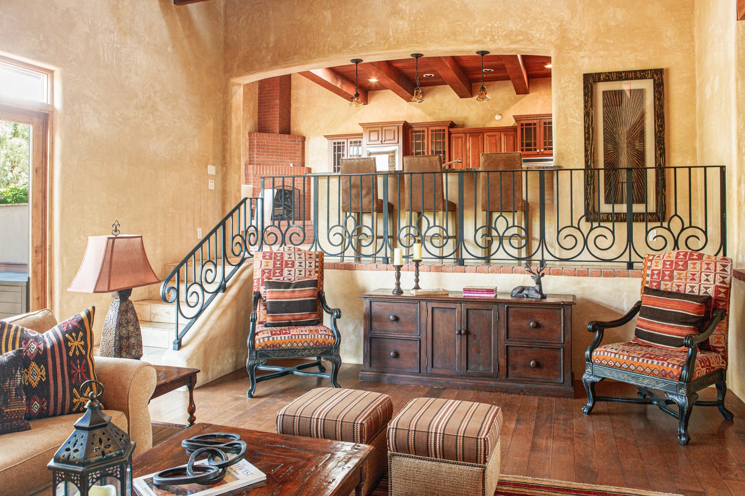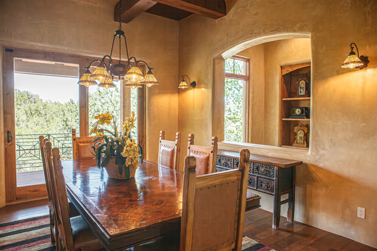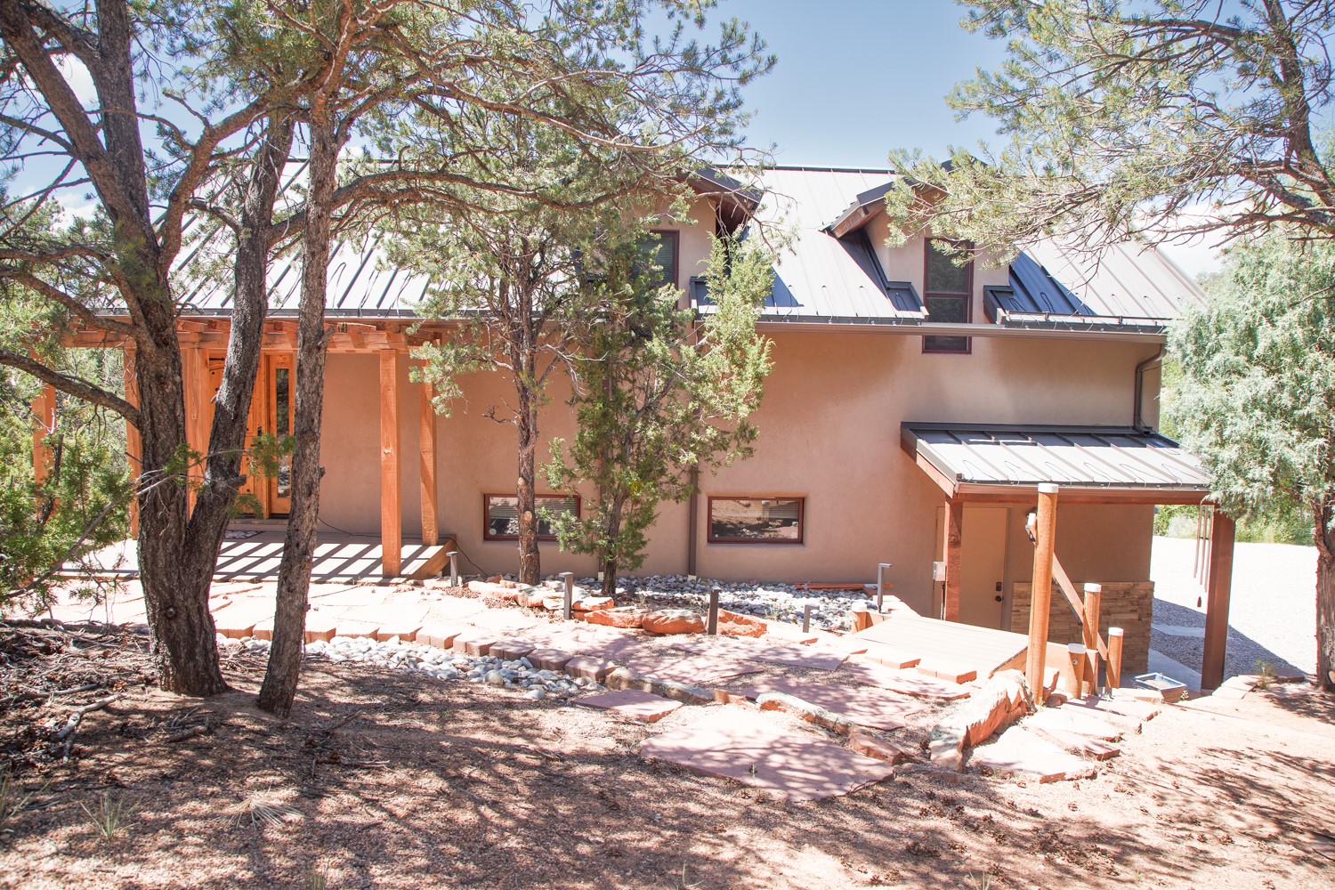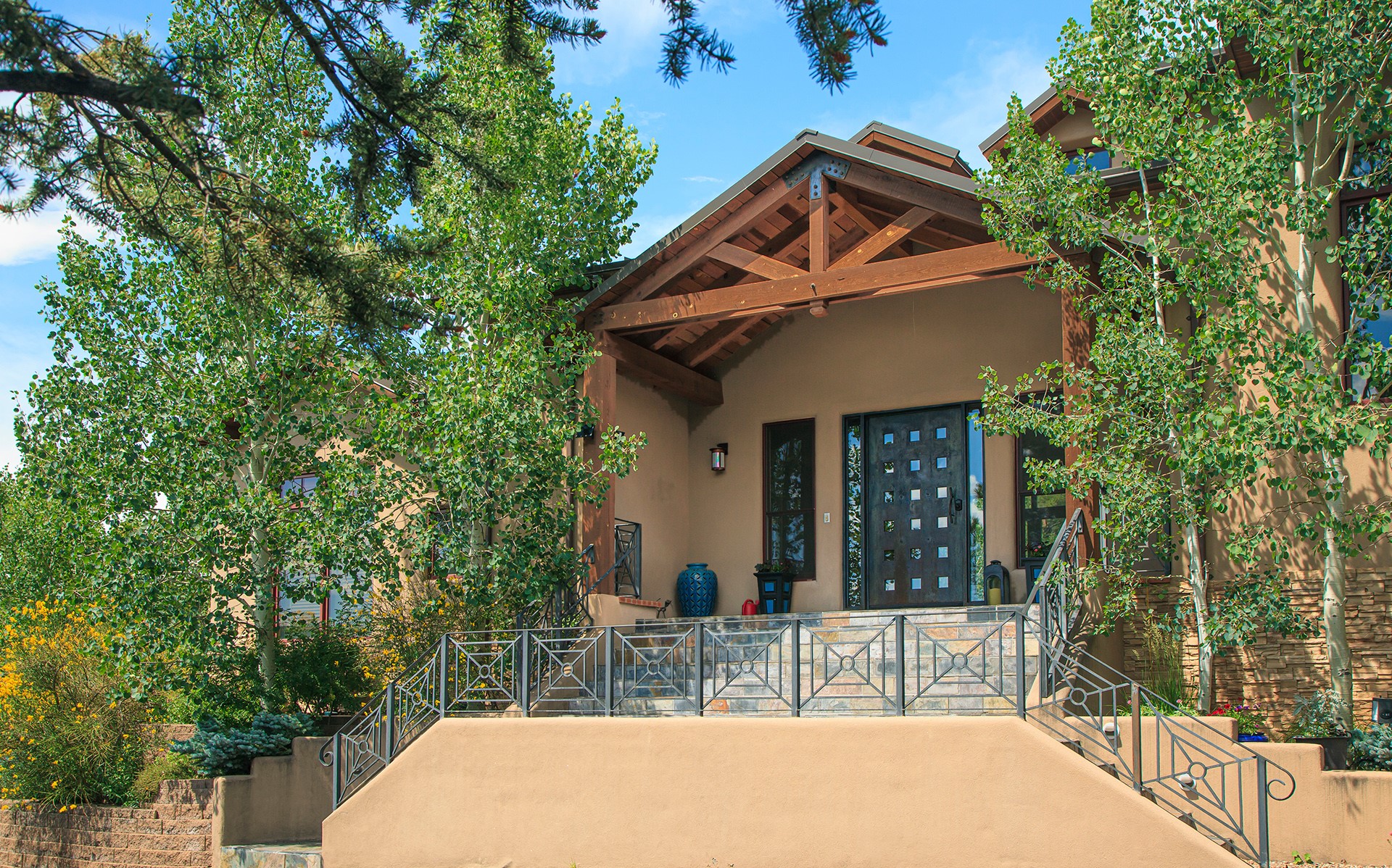 This stunning gated estate sprawls across over 4 acres, offering the perfect blend of privacy and convenience, and only a 20-minute drive to the Santa Fe Ski Basin. The home's architecture is exceptional, featuring a pitched roof, prominent exposed timbers and trusses, a gabled dormer, clerestory windows, a metal roof that enhances its aesthetic appeal and an elevator. The grand entryway is highlighted by a custom steel door and a cascading waterfall feature. The gourmet kitchen is a chef's dream, equipped with a large island, breakfast nook, side-by-side Sub-Zero refrigerator and freezer, a wine and beverage center, and a formal dining area. The spacious living and family rooms are designed for entertaining, with one bedroom in this wing--one large enough to serve as a children's playroom. The expansive master suite includes a sitting area with kiva fireplace, a large bathroom, his and hers closets, and a beautiful view of the adjacent surrounding 25-acre open space. Nearby are an office and two ensuite bedrooms. The lower level features an exercise room, game room, kitchenette, wine cellar, and a bath. Outside, the property is equally impressive, with decks, porches, and patios nestled among lush fruit trees, aspens, and gardens. The outdoor living spaces include a professional BBQ, fireplace, and seating area around a tranquil Koi Pond. A separate combination car/RV garage provides ample space for large vehicles, with a private one-bedroom, one-bath guest house situated above it. This is quite simply a little slice of heaven just minutes from downtown Santa Fe and the Historic Plaza!