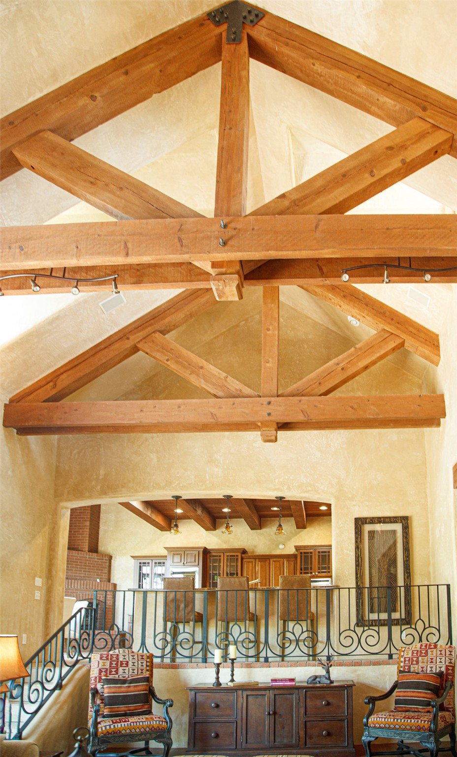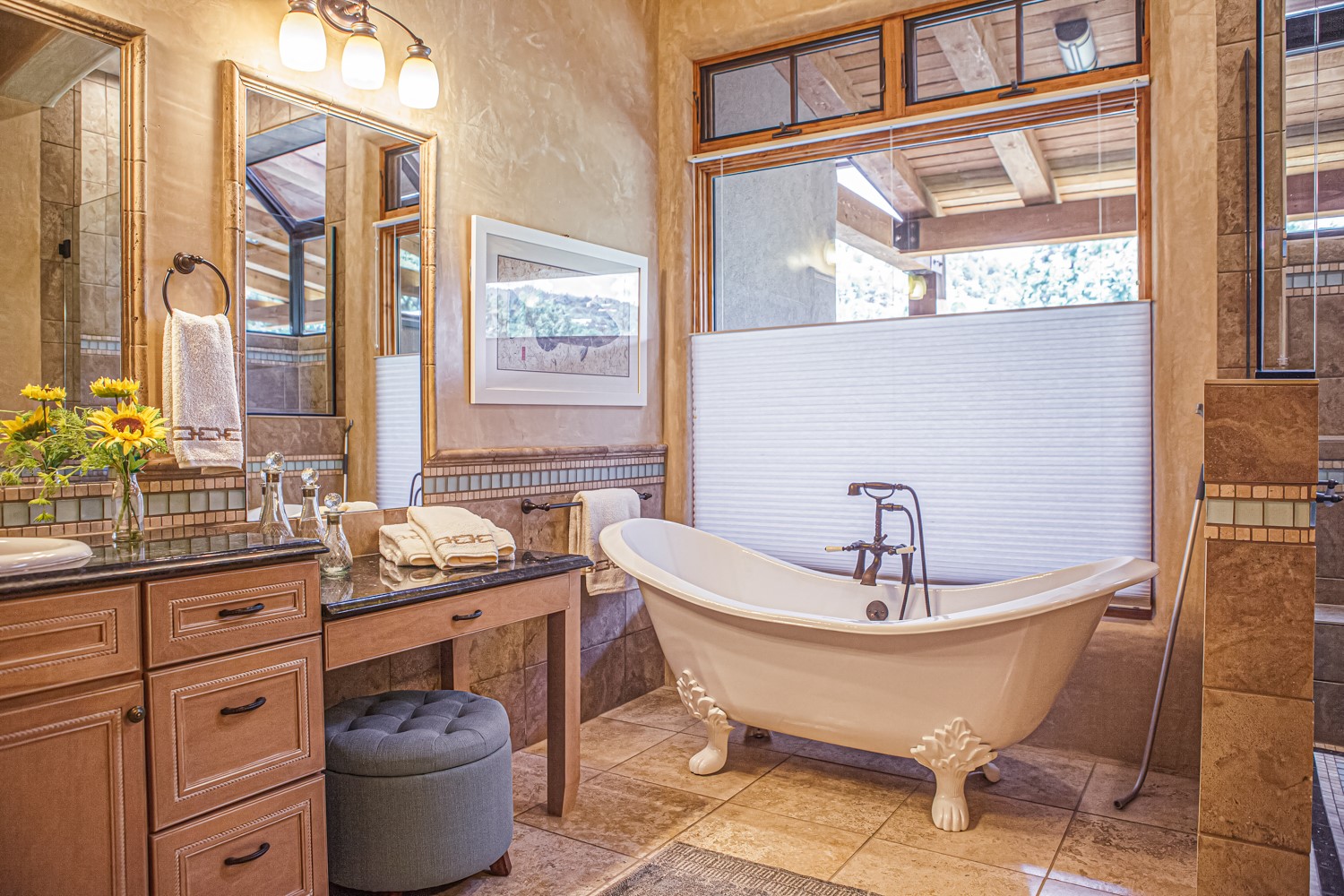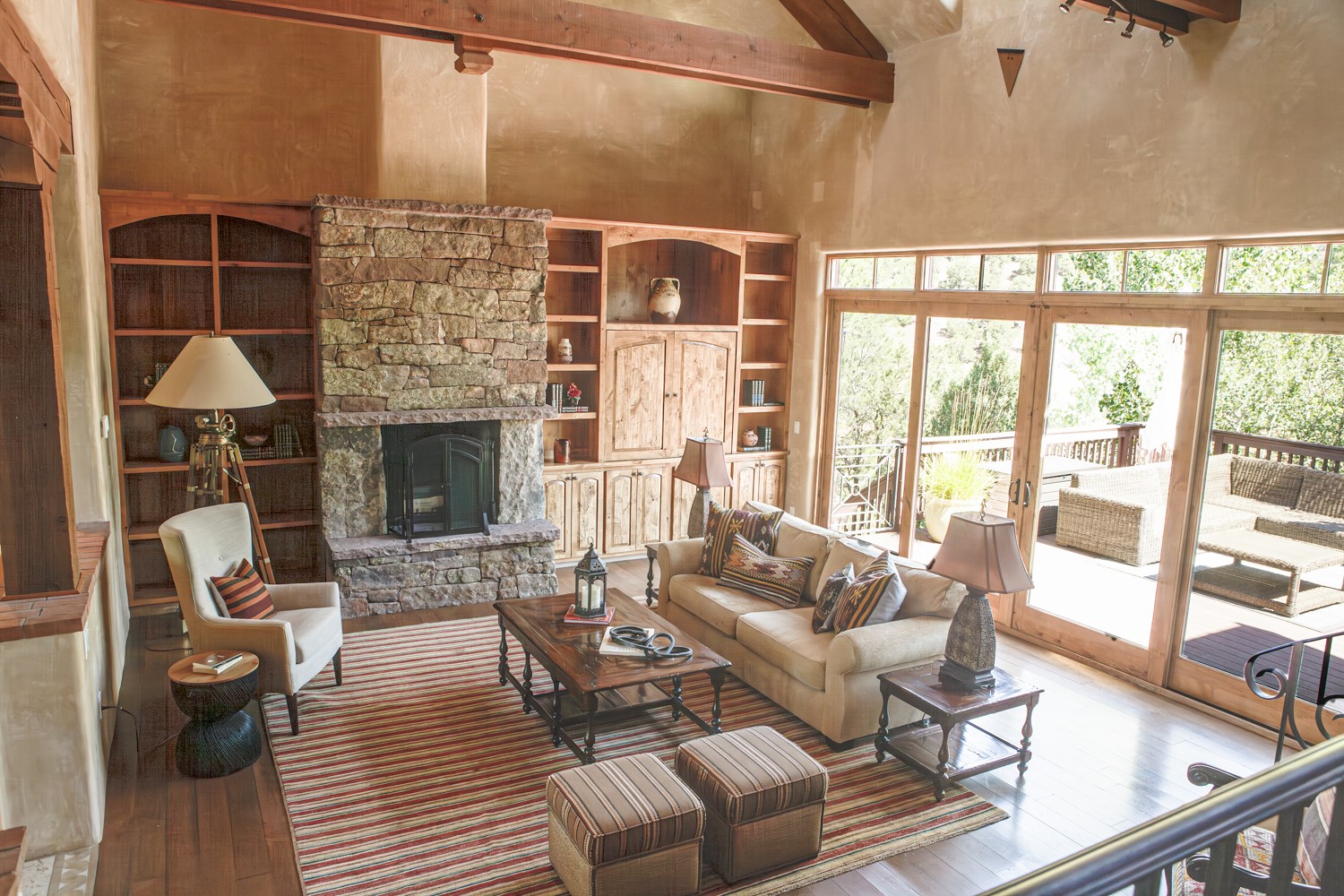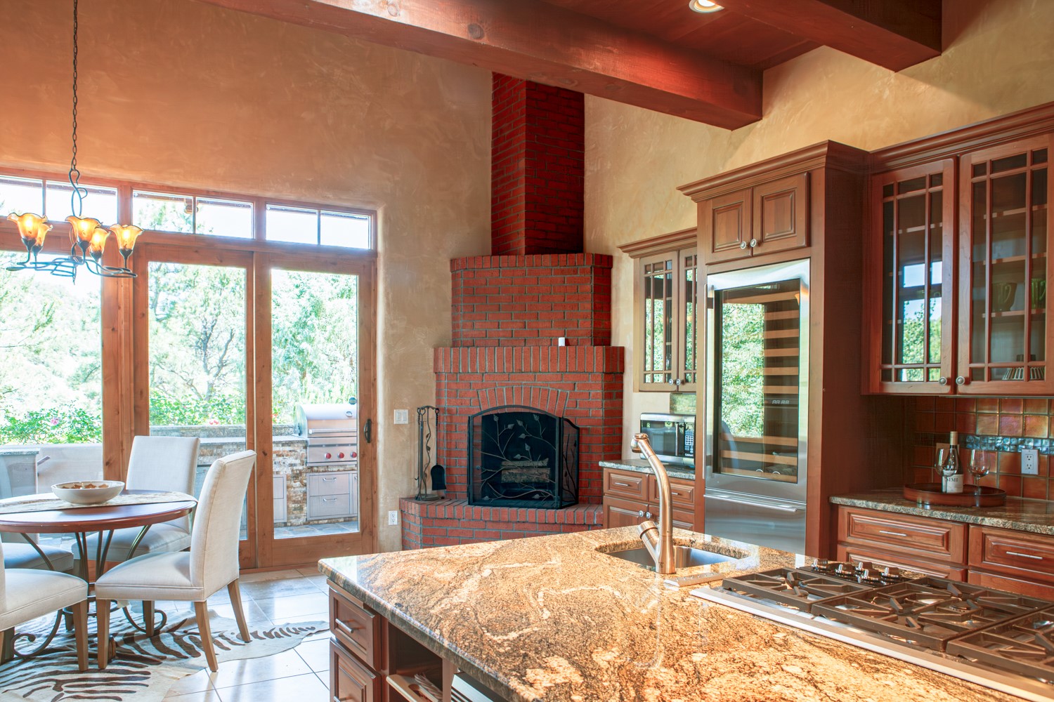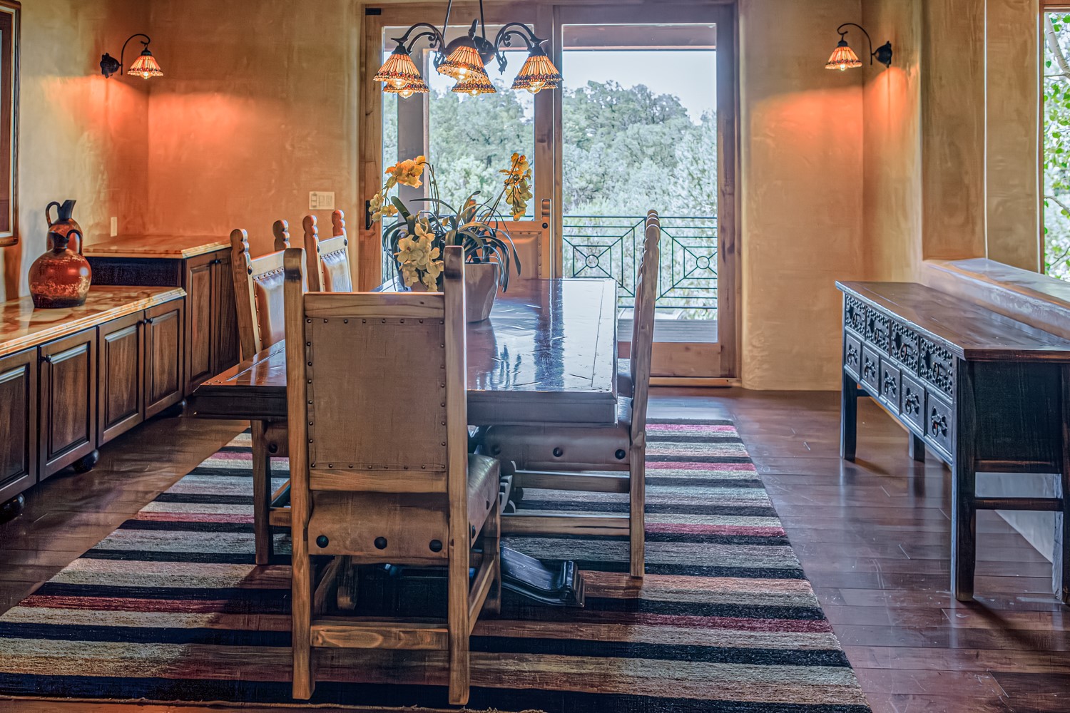 This stunning gated estate sprawls across over 4 acres, offering the perfect blend of privacy and convenience, and only a 20-minute drive to the Santa Fe Ski Basin. The home's architecture is exceptional, featuring a pitched roof, prominent exposed timbers and trusses, a gabled dormer, clerestory windows, a metal roof that enhances its aesthetic appeal and an elevator. The grand entryway is highlighted by a custom steel door and a cascading waterfall feature. The gourmet kitchen is a chef's dream, equipped with a large island, breakfast nook, side-by-side Sub-Zero refrigerator and freezer, a wine and beverage center, and a formal dining area. The spacious living and family rooms are designed for entertaining, with one bedroom in this wing--one large enough to serve as a children's playroom. The expansive master suite includes a sitting area with kiva fireplace, a large bathroom, his and hers closets, and a beautiful view of the adjacent surrounding 25-acre open space. Nearby are an office and two ensuite bedrooms. The lower level features an exercise room, game room, kitchenette, wine cellar, and a bath. Outside, the property is equally impressive, with decks, porches, and patios nestled among lush fruit trees, aspens, and gardens. The outdoor living spaces include a professional BBQ, fireplace, and seating area around a tranquil Koi Pond. A separate combination car/RV garage provides ample space for large vehicles, with a private one-bedroom, one-bath guest house situated above it. This is quite simply a little slice of heaven just minutes from downtown Santa Fe and the Historic Plaza!