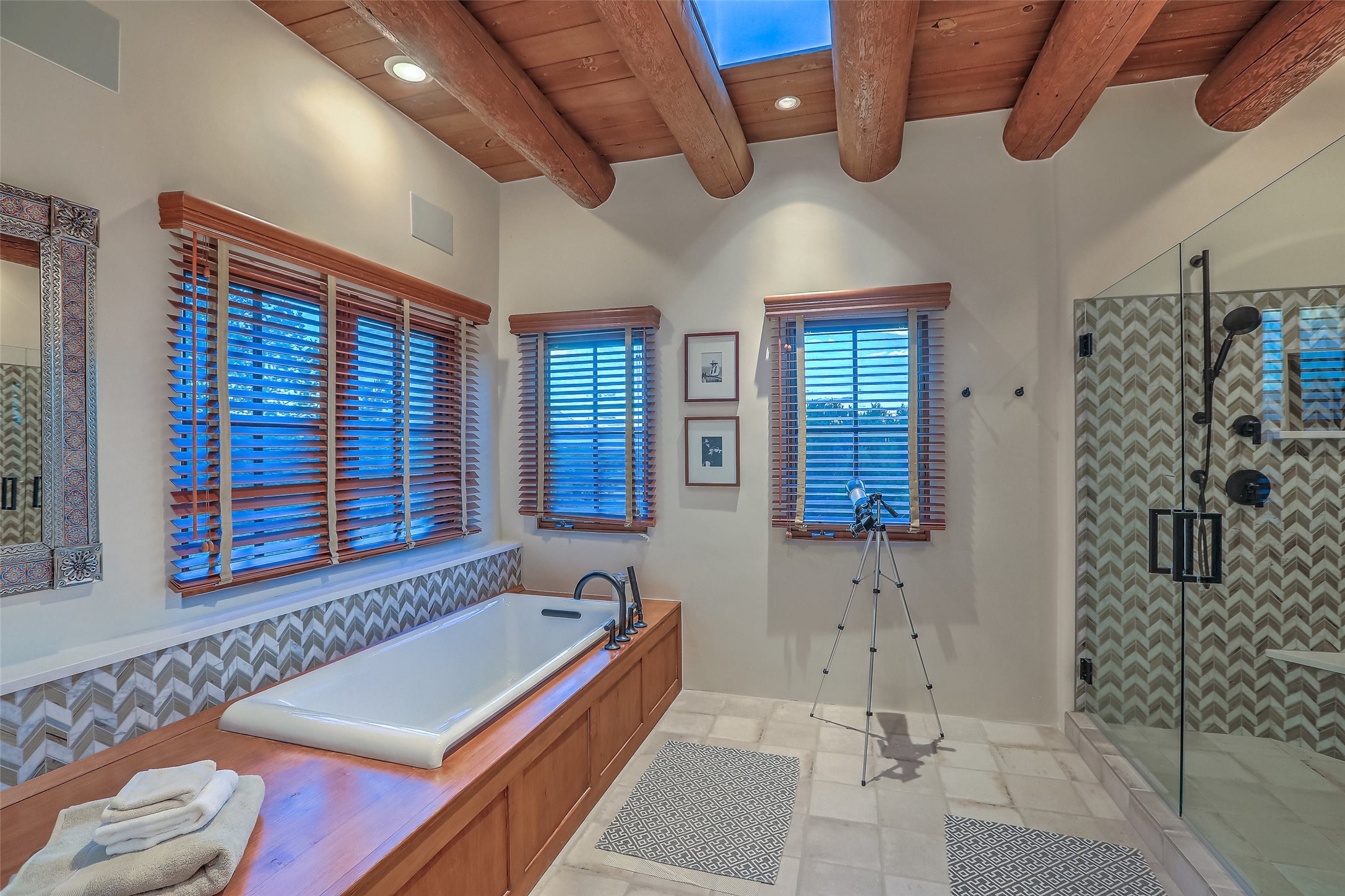 A past Showcase winner of the Grand Haciendas Parade of Homes, this newly upgraded Las Campanas beauty is luxurious and lovingly maintained. Impeccably remodeled with elegant and thoughtful upgrades and finishes throughout. Entering on a curving driveway this home is set back from the road and is extremely private. Mature trees and lovingly cared for yard and grounds. The views of Los Alamos and of the Jemez mountains and sunset views are breathtaking and always unique. This split 3 bedroom suite home has the Master Bedroom in a private wing with an adjacent den. Each bedroom has access to a private outdoor sitting area. The newer, beautiful contemporary kitchen with breakfast nook, has newer Thermador appliances. Bright inside with plaster walls and high viga ceilings throughout and the home includes travertine tile floors and quartz countertops. Ready for the new owner to enjoy this breathtaking Santa Fe home oasis. The dining and living room areas have easy access to a fabulous portal for outdoor al fresco enjoyment and relaxation with a fireplace and built-in outdoor gas grill. Adjacent areas thoughtfully designed outside patio spaces for additional enjoyment of Santa Fe's lovely starry night skies. Fountains and carefully cared for landscaping also surround the home. High quality Sonas sound technology system. About 866sf 3 car garage with cedar storage closet. Approximately 612sf total outdoor portal spaces which are comprised of 5 covered portals. On demand hot water system with a newer Kinetico whole house water softener system. About 10 minutes to town. We look forward to showing you this home, and we welcome you to come and see this distinguished home soon!