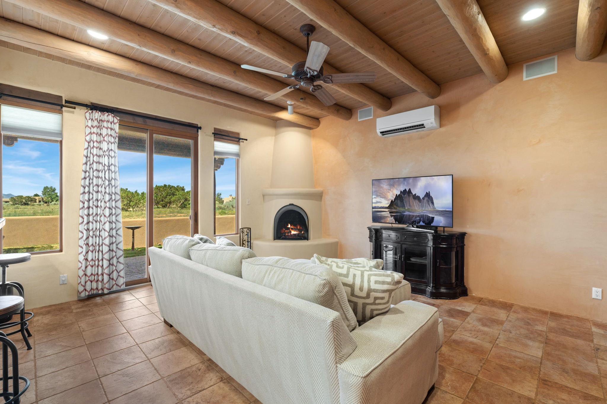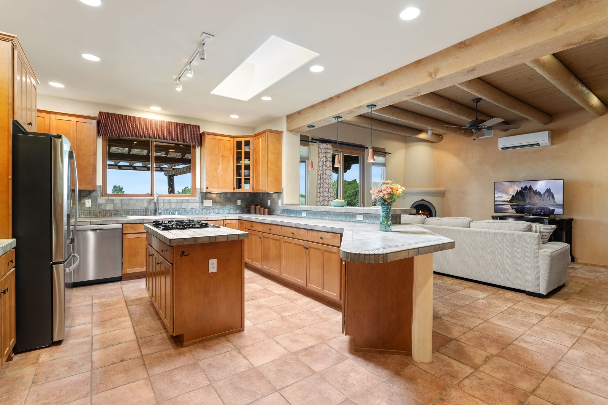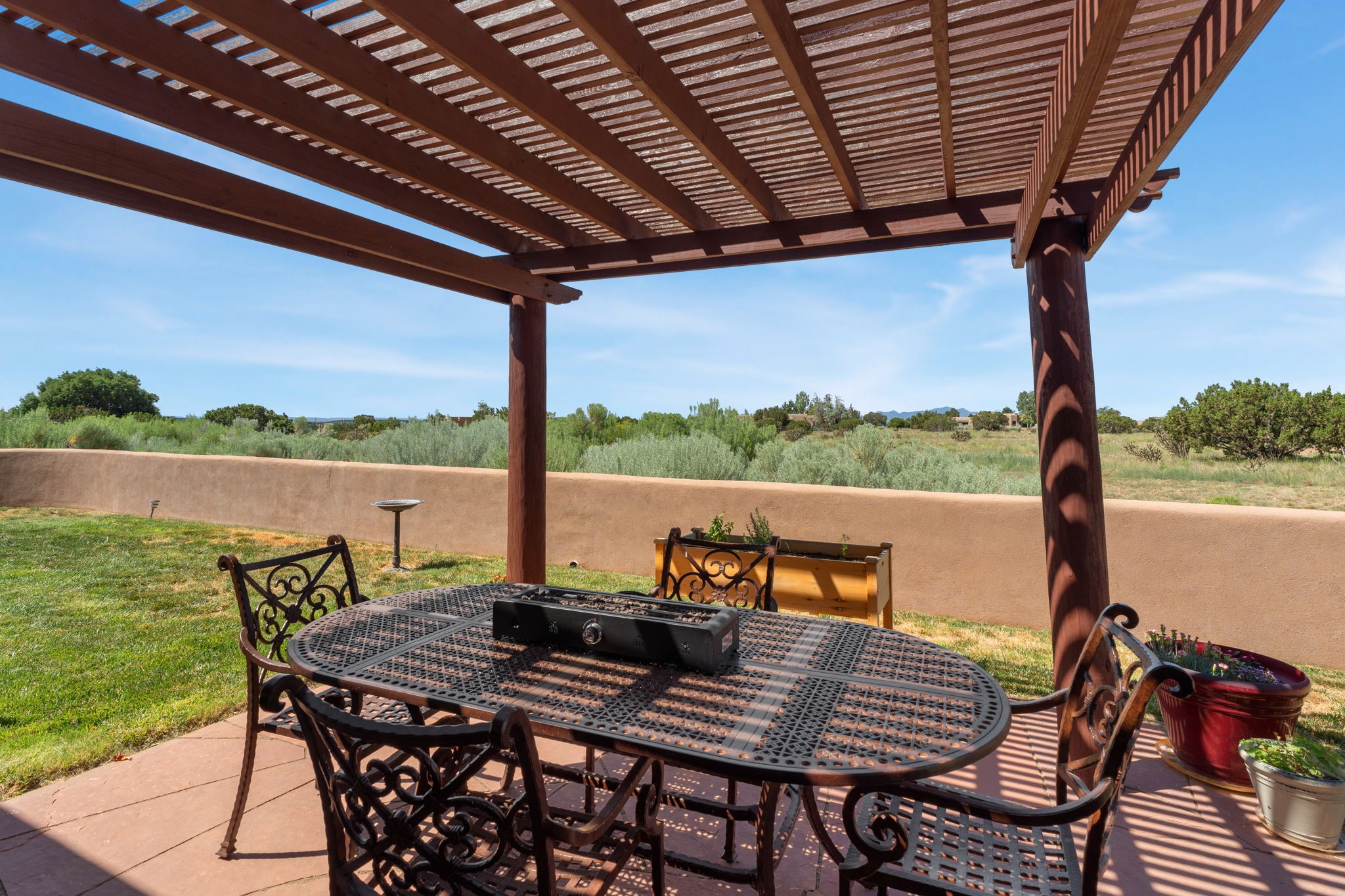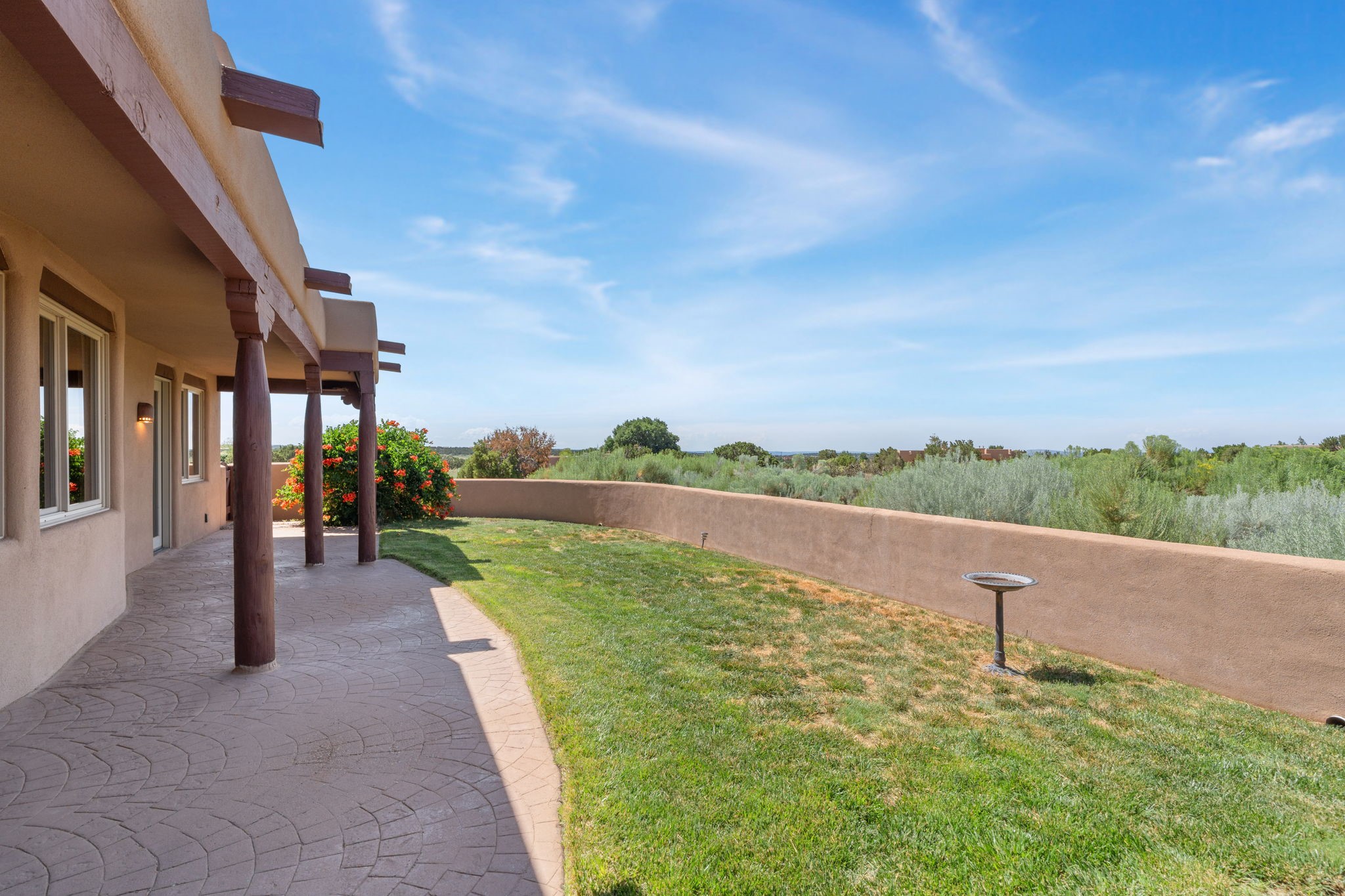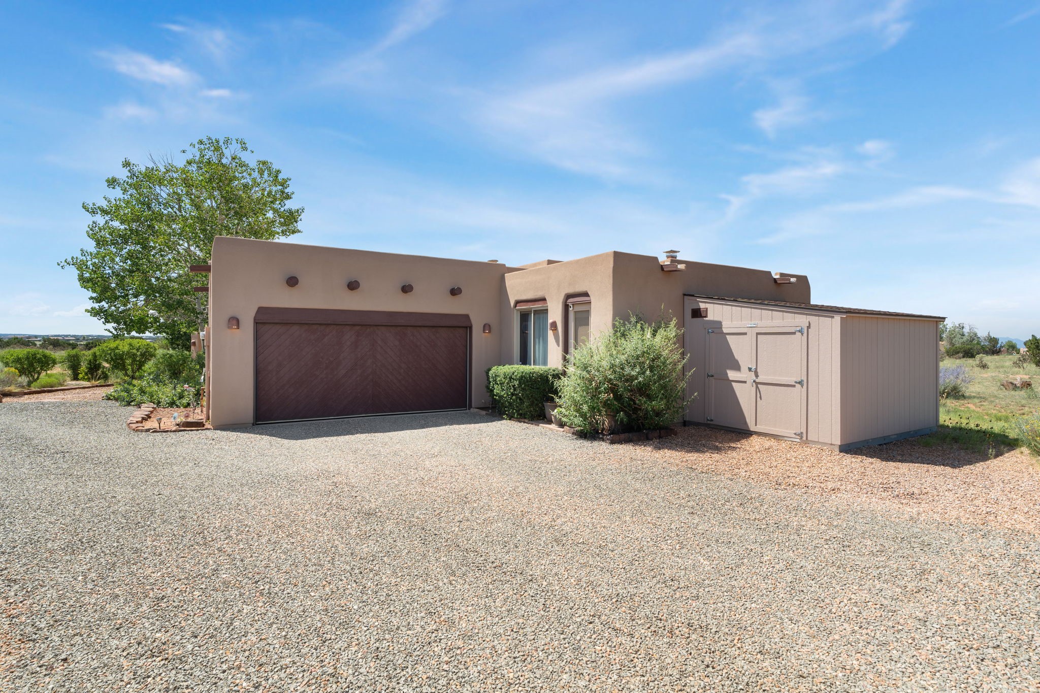 Beautiful, single-level Eldorado home with views, great floorplan and pre-inspected! Two living areas, both with vigas and kiva fireplaces. Den and office have large built-in bookcases. In-floor, natural gas radiant heat and 4 splits for air conditioning and heat. Light and bright studio has a cement floor and is detached from the house with two entrances and has a split for heat and AC - can also be accessed from the garage. Front and back walled courtyards with the rear portal running the length of the property. Generous kitchen has views, stainless appliances, loads of counter space and storage. California closet systems in each bedroom. Home has been pre-inspected and most repairs are complete. Report available on request. Recent roof maintenance with 1-year warranty. NO STEPS. NO KITEC. Radiant heat is Onix. Domestic plumbing is copper. Weil-McClain boiler and Bradford White water heater, both new in 2016. Recent new hot water recirculating pump installed. Proper laundry room with sink and storage. New shed is 10' x 12. Septic inspection is completed and report in supplements. Lot corners are flagged. Four raised garden beds. This home has abundant storage. Sparkling clean and ready to go!