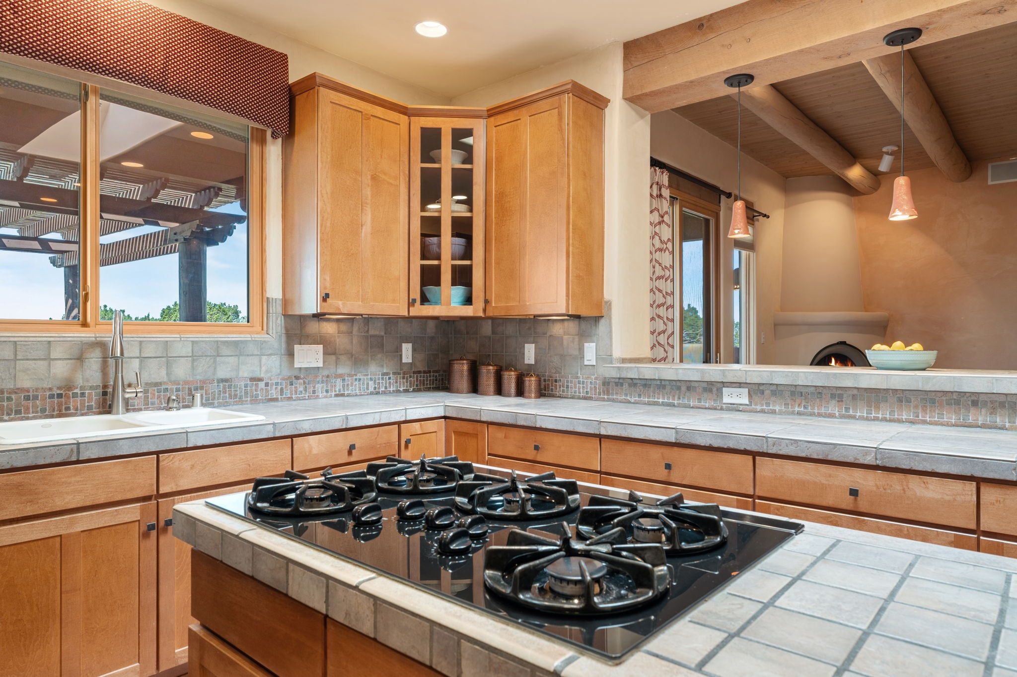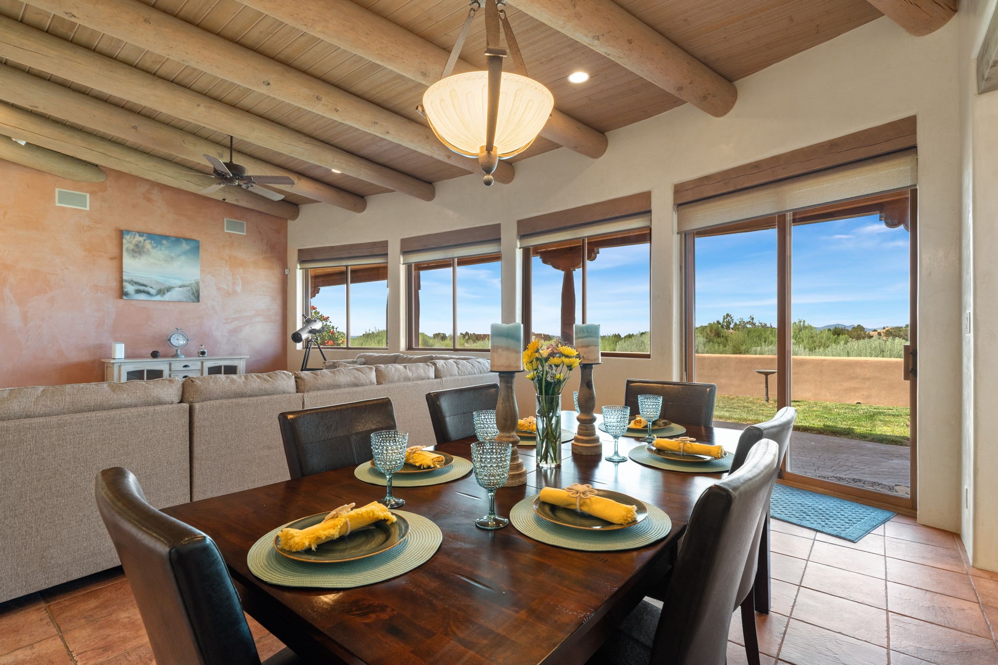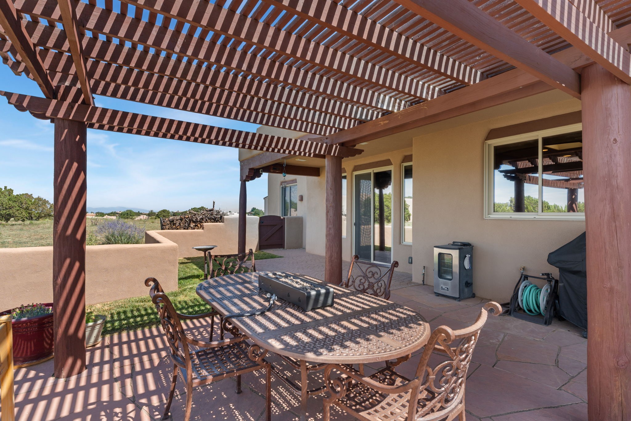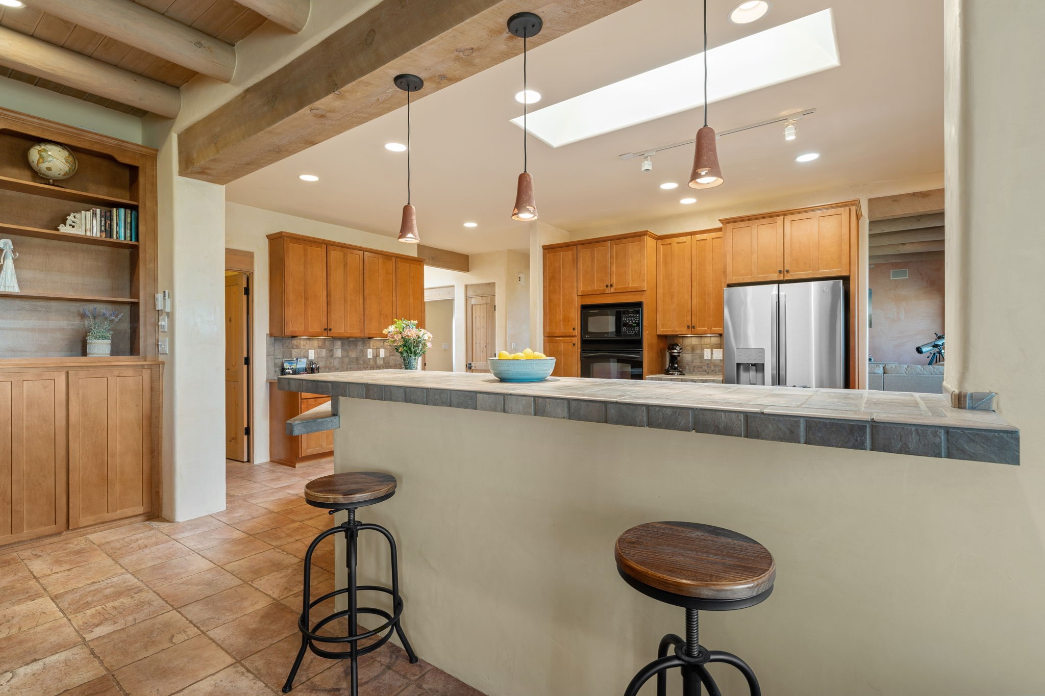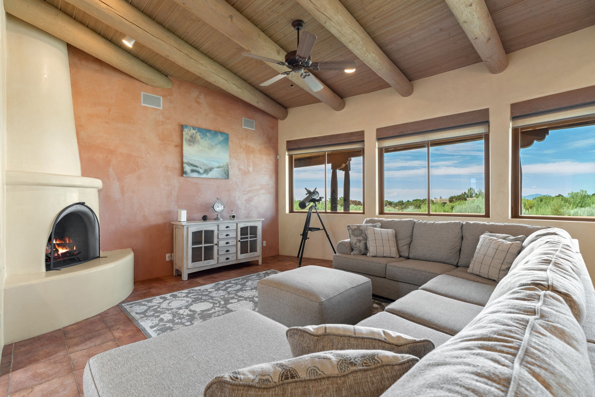 Beautiful, single-level Eldorado home with views, great floorplan and pre-inspected! Two living areas, both with vigas and kiva fireplaces. Den and office have large built-in bookcases. In-floor, natural gas radiant heat and 4 splits for air conditioning and heat. Light and bright studio has a cement floor and is detached from the house with two entrances and has a split for heat and AC - can also be accessed from the garage. Front and back walled courtyards with the rear portal running the length of the property. Generous kitchen has views, stainless appliances, loads of counter space and storage. California closet systems in each bedroom. Home has been pre-inspected and most repairs are complete. Report available on request. Recent roof maintenance with 1-year warranty. NO STEPS. NO KITEC. Radiant heat is Onix. Domestic plumbing is copper. Weil-McClain boiler and Bradford White water heater, both new in 2016. Recent new hot water recirculating pump installed. Proper laundry room with sink and storage. New shed is 10' x 12. Septic inspection is completed and report in supplements. Lot corners are flagged. Four raised garden beds. This home has abundant storage. Sparkling clean and ready to go!