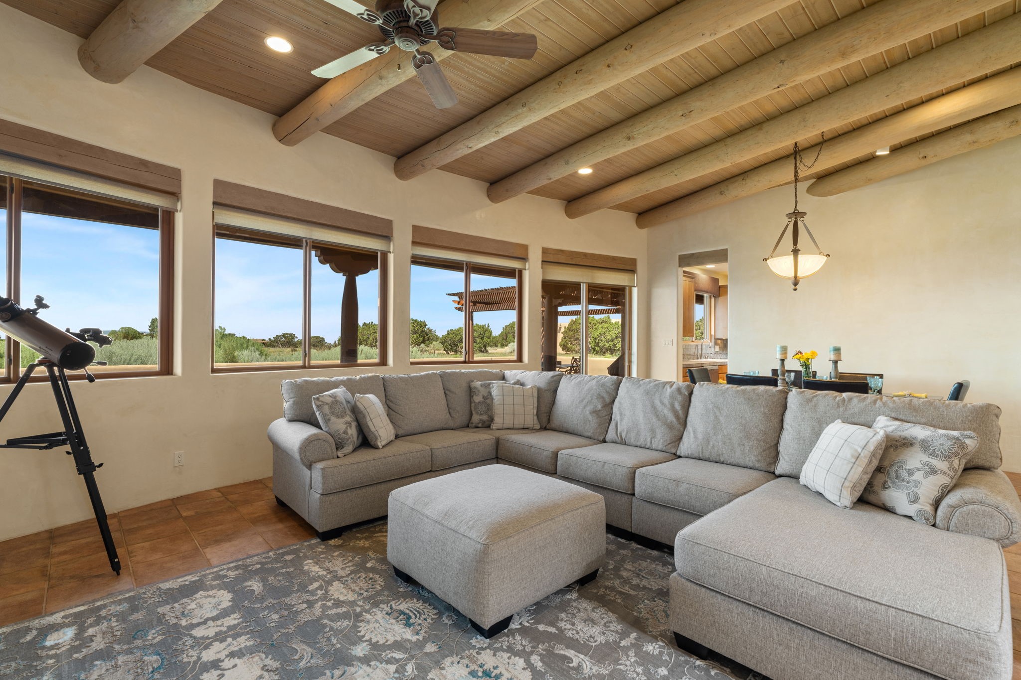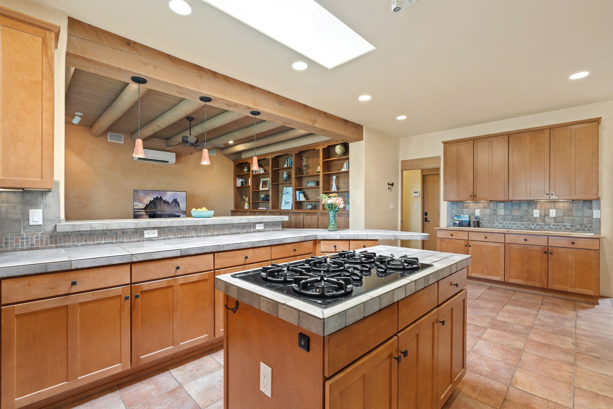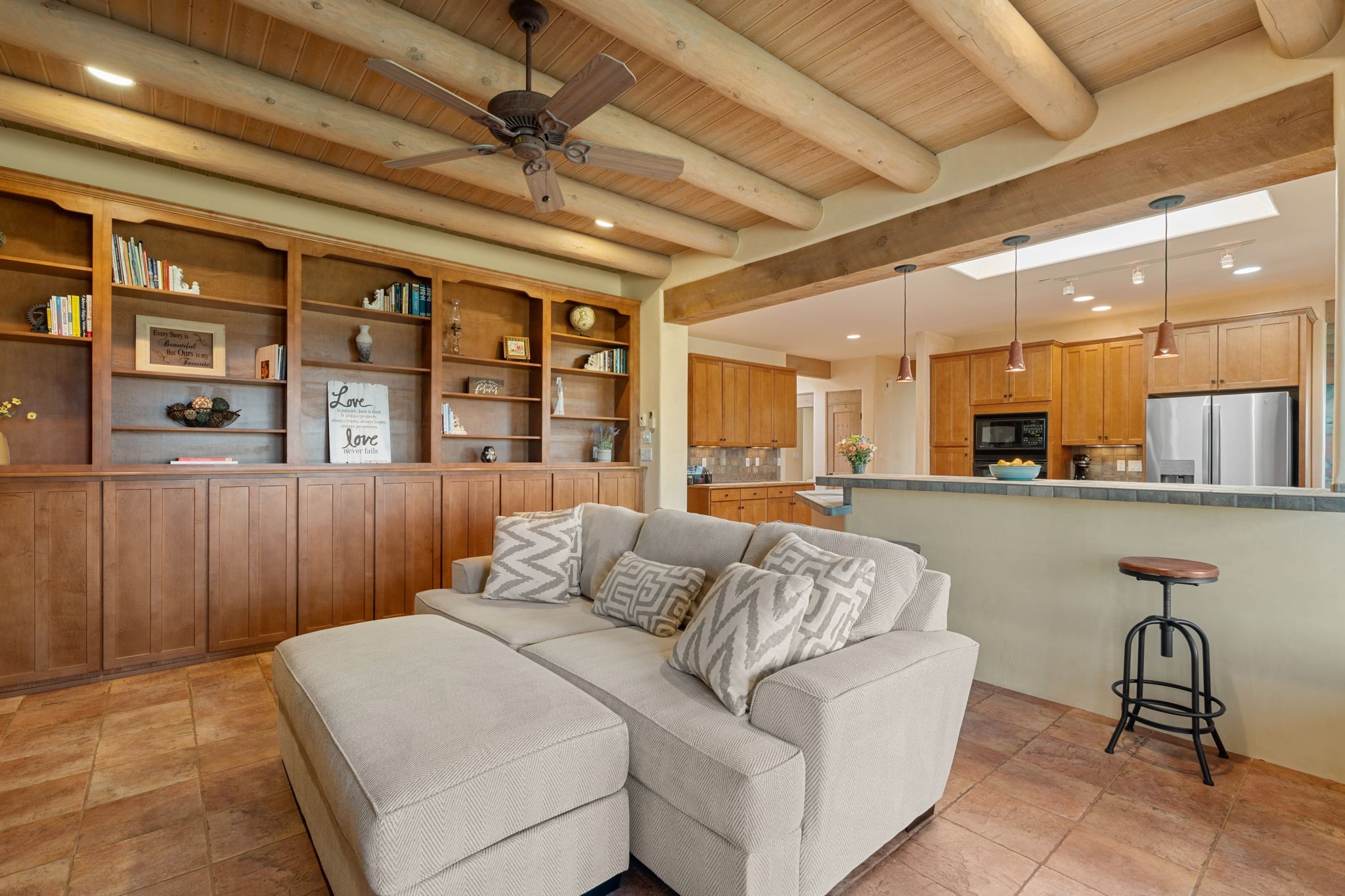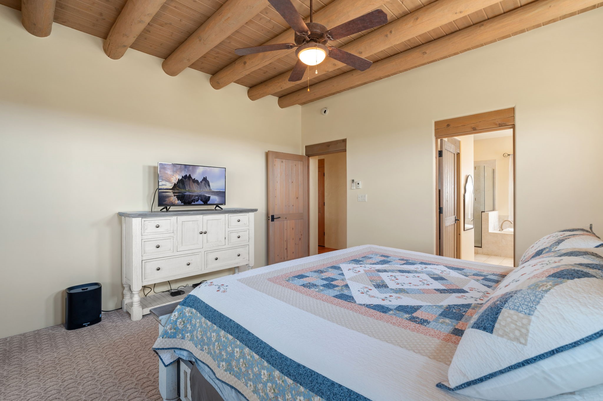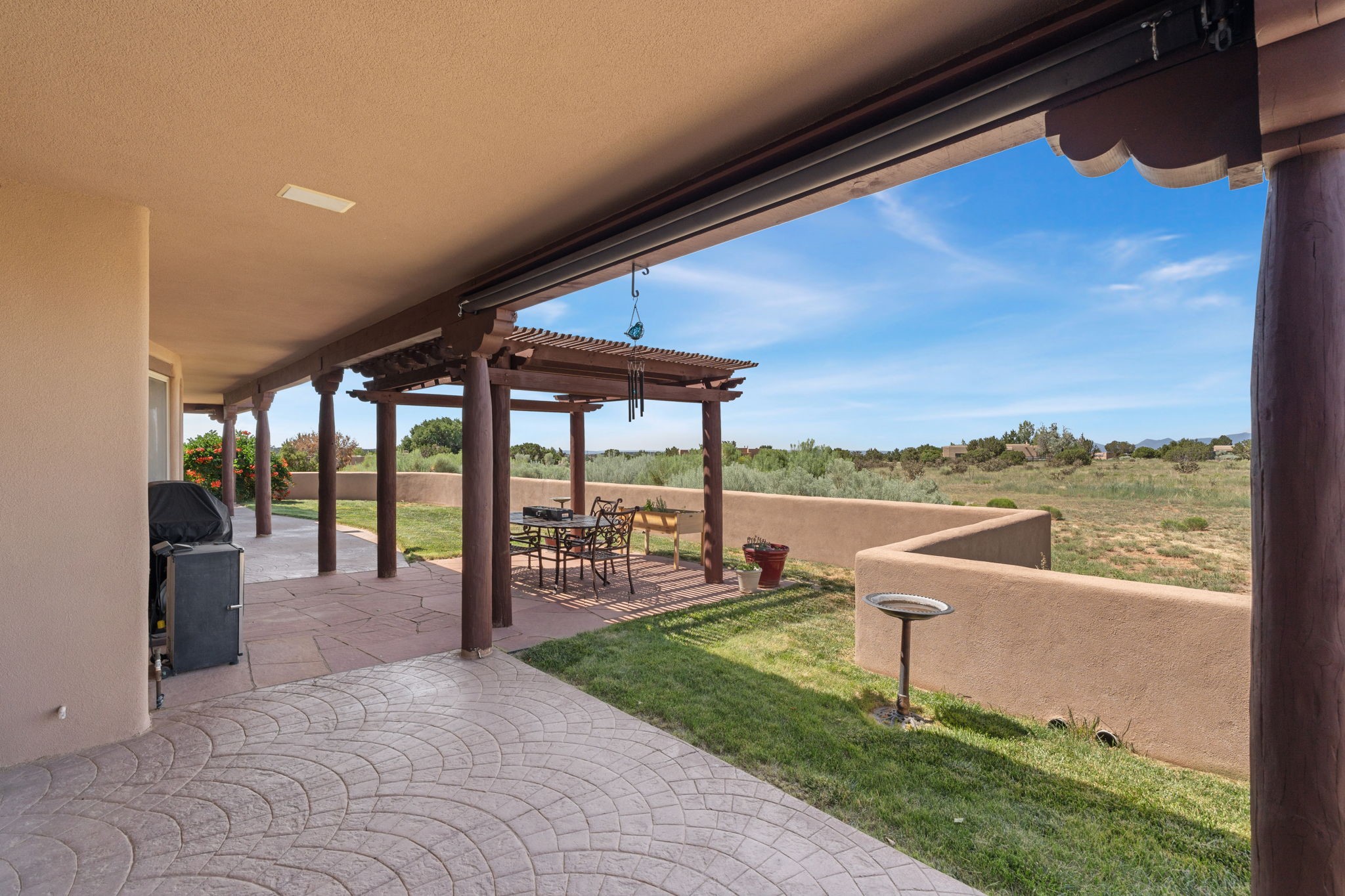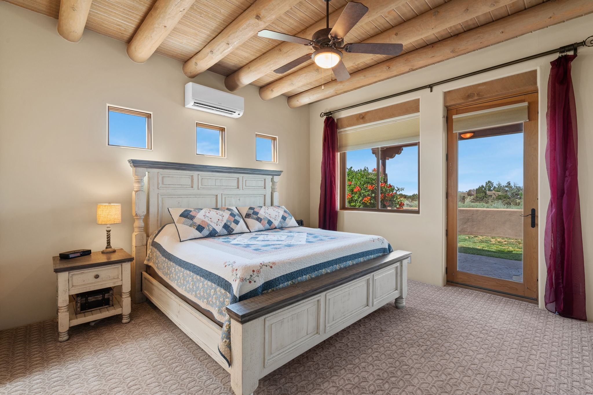 Beautiful, single-level Eldorado home with views, great floorplan and pre-inspected! Two living areas, both with vigas and kiva fireplaces. Den and office have large built-in bookcases. In-floor, natural gas radiant heat and 4 splits for air conditioning and heat. Light and bright studio has a cement floor and is detached from the house with two entrances and has a split for heat and AC - can also be accessed from the garage. Front and back walled courtyards with the rear portal running the length of the property. Generous kitchen has views, stainless appliances, loads of counter space and storage. California closet systems in each bedroom. Home has been pre-inspected and most repairs are complete. Report available on request. Recent roof maintenance with 1-year warranty. NO STEPS. NO KITEC. Radiant heat is Onix. Domestic plumbing is copper. Weil-McClain boiler and Bradford White water heater, both new in 2016. Recent new hot water recirculating pump installed. Proper laundry room with sink and storage. New shed is 10' x 12. Septic inspection is completed and report in supplements. Lot corners are flagged. Four raised garden beds. This home has abundant storage. Sparkling clean and ready to go!