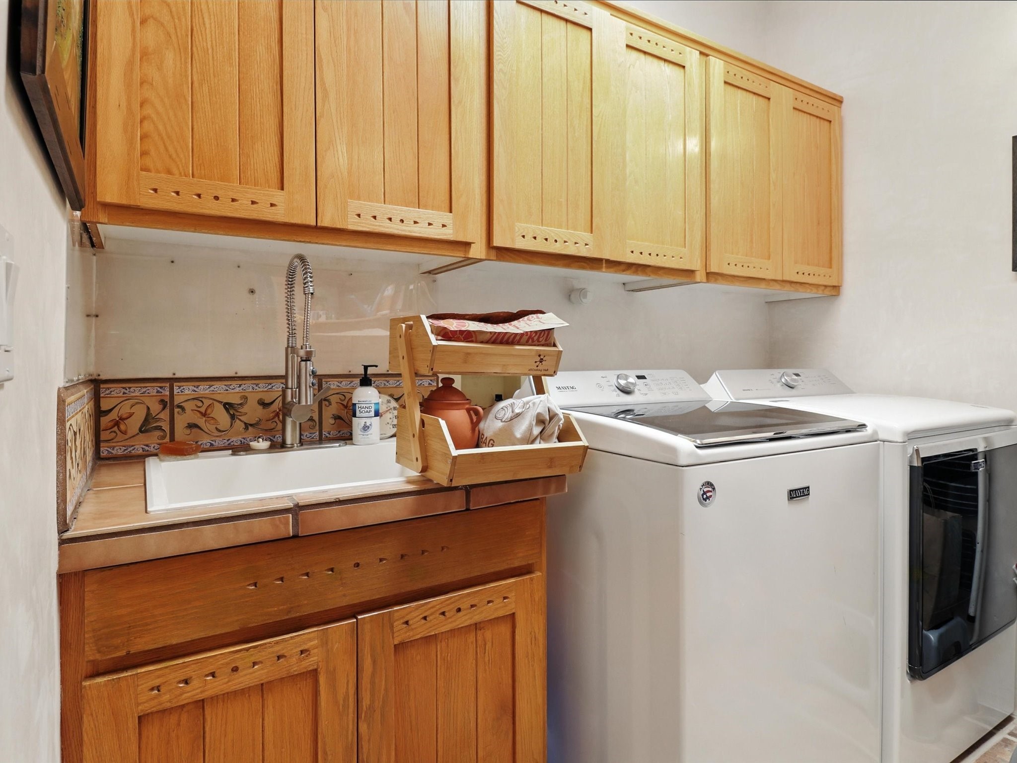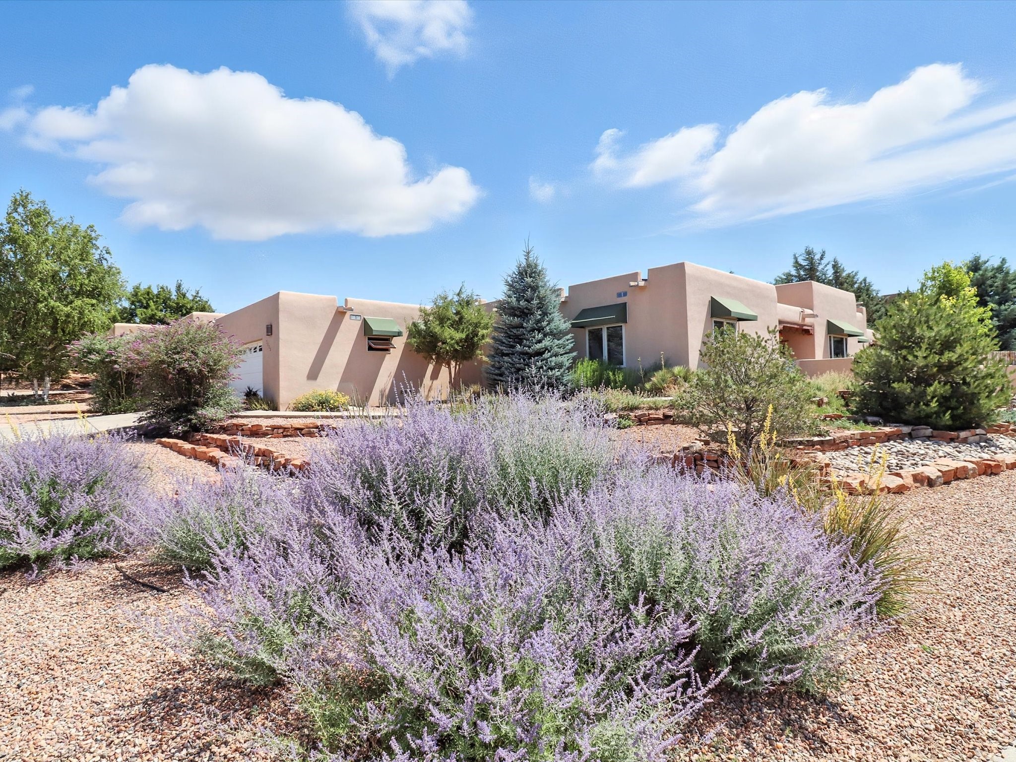 This beautifully maintained and thoughtfully updated home blends timeless Southwestern charm with refined, modern comfort. Spacious and gracefully proportioned rooms are enhanced by luxurious details throughout, including diamond finish plaster walls and elegant, large-format ceramic tile flooring. Step into the dramatic great room, where a soaring 12-foot viga ceiling and a cozy kiva fireplace create a stunning central gathering space. The fully remodeled kitchen is open to the living area and features slab granite countertops, stainless steel appliances, abundant custom cabinetry, and a sunny breakfast nook, perfect for everyday living and entertaining alike. The adjacent formal dining room, also crowned by a high viga ceiling, offers seamless flow for gatherings both intimate and celebratory.A separate den with a wood-burning kiva-style fireplace provides additional flexible living space and opens to a private rear patio and manicured outdoor area.The expansive owner's suite is thoughtfully positioned for privacy and serenity. It includes a peaceful sitting area, direct access to the heated sunroom, and a beautifully appointed updated bath featuring a glass brick wall that gently filters natural light. Two additional bedrooms are located at the opposite end of the home. One is currently serving as studio and office, the other a wonderful guest room, with both sharing a generous full bath. Additional features include: walled and gated yard with security cameras, attached oversized two-car garage, large walk-in closets in every bedroom, heated enclosed Portal Santa Fe room with adjoining covered BBQ area, 5 mini-split Mitsubishi systems for personalized cooling and supplemental heat w/ upgraded hyper compressors, 13 GPM tankless water heater, Toto Washlet toilets, 18 solar panel (owned), and a large in-town lot with all city utilities. This home has been a place of deep joy, creativity, & care, now ready to welcome its next chapter w/ warmth & grace.