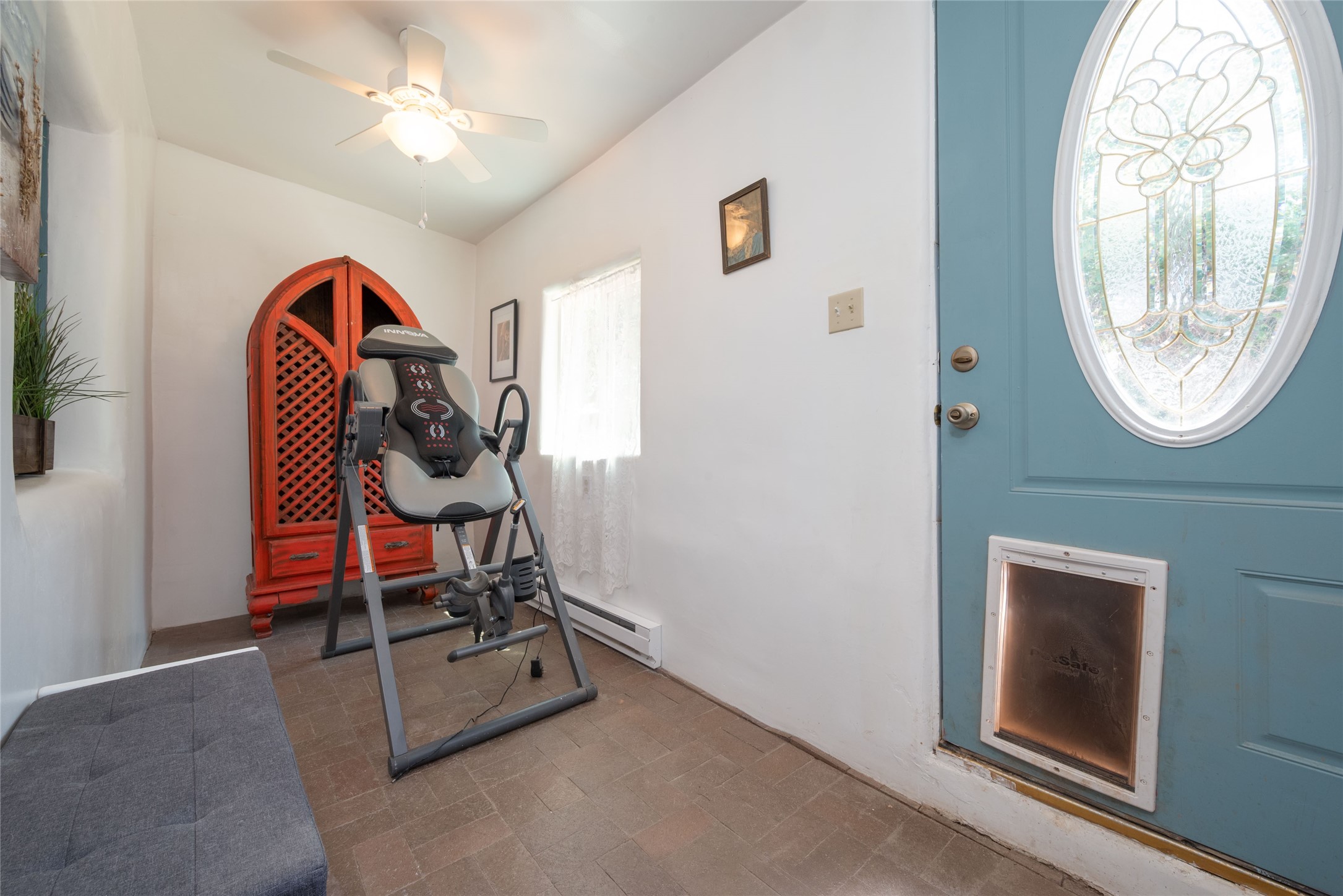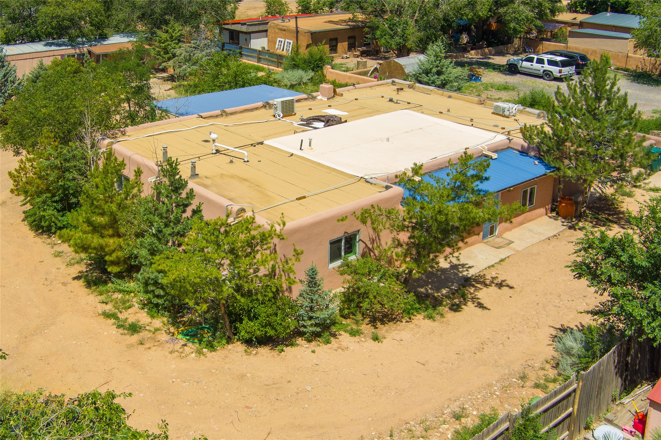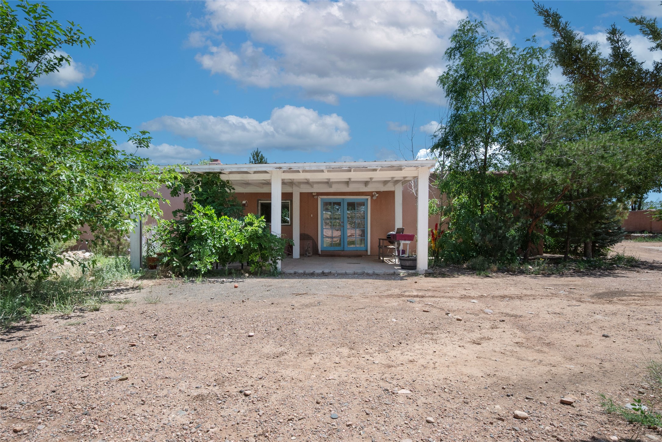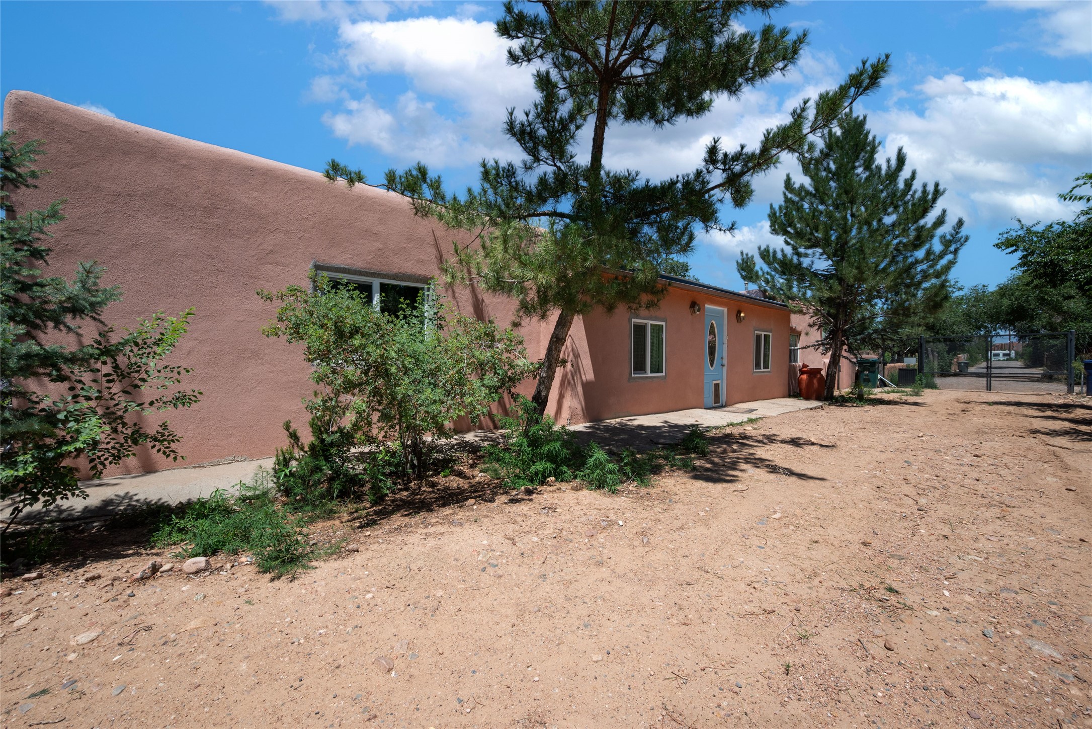 Welcome to 2918 Santeros Road--a serene and beautifully maintained home that blends classic Santa Fe charm with modern comfort. This 3-bedroom, 1 1/2-bath residence offers approximately 2098 sq ft of living space featuring traditional Southwestern elements such as adobe construction, vigas, a kiva fireplace, and plastered walls. The open-concept kitchen/dining area is perfect for entertaining. Outside, enjoy private patios, mature native landscaping, and a peaceful courtyard ideal for relaxing or dining al fresco. Located minutes from shopping, schools, biking trails, and the Santa Fe airport. This property combines tranquility with convenience. Easy access to Hwy 599. As an added bonus there are also multiple out buildings and a single wide mobile home that can be used as storage or upgraded to livable space. There is also plenty of space to expand on the 0.4 acre lot! Upgrades within the last year include: Minisplit AC/Heaters; windows in the living room, primary bed, mud room, and 1 guest bedroom; new electric circuit panel and grounding rods; soaking tub and rain shower in main bathroom. Sellers have also installed a City Water Meter it just needs to be connected if Buyer wants that option.