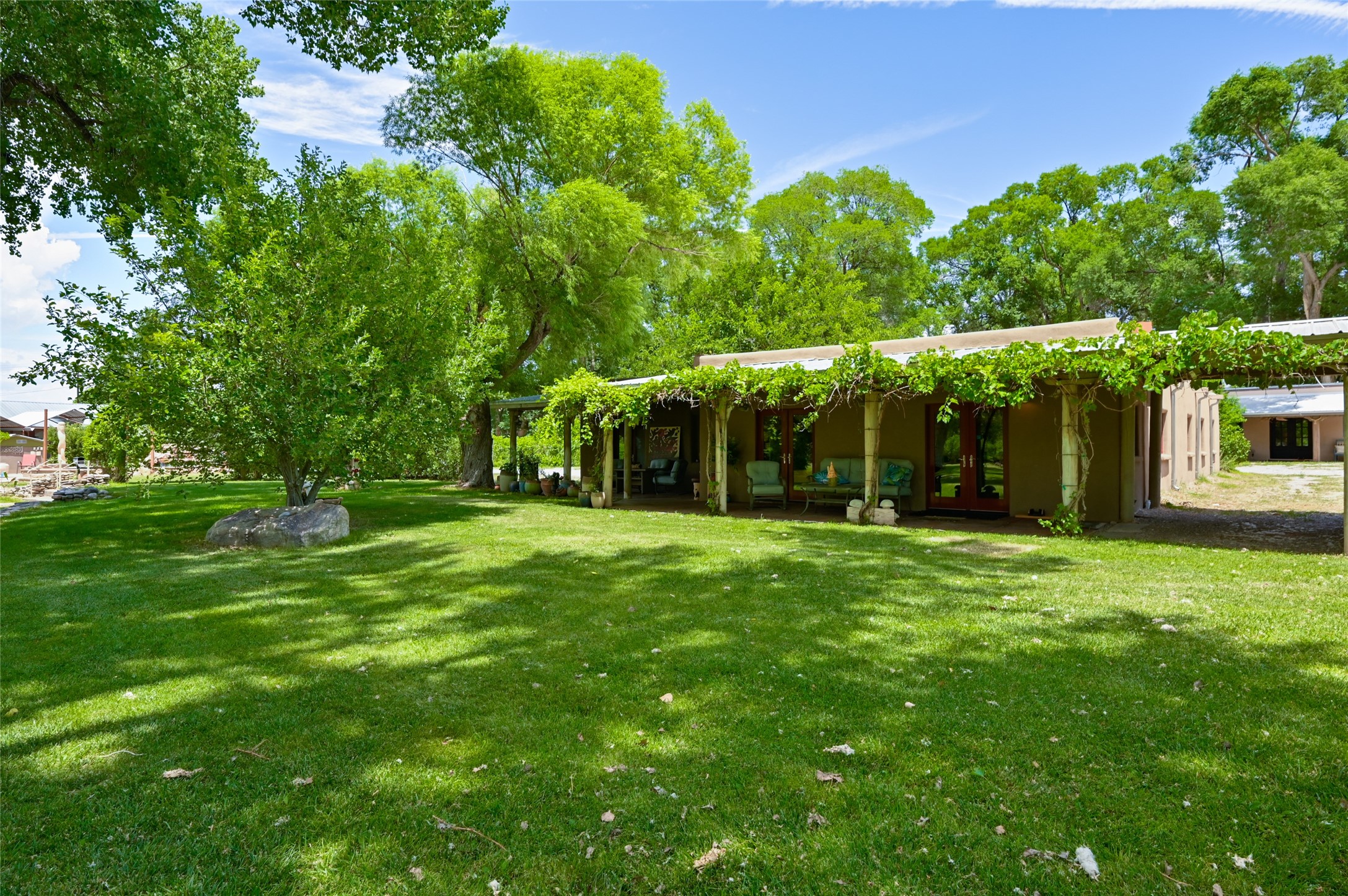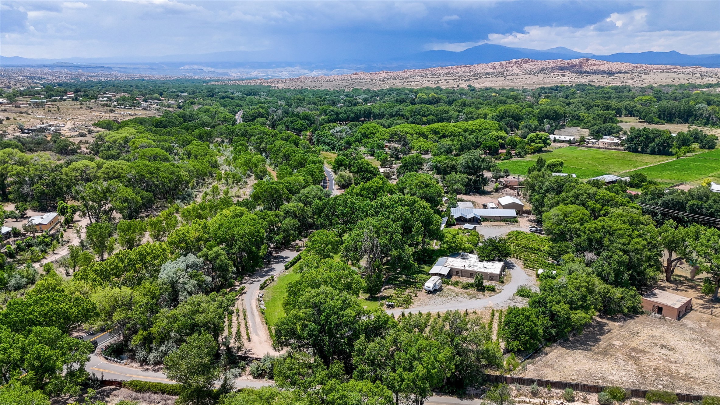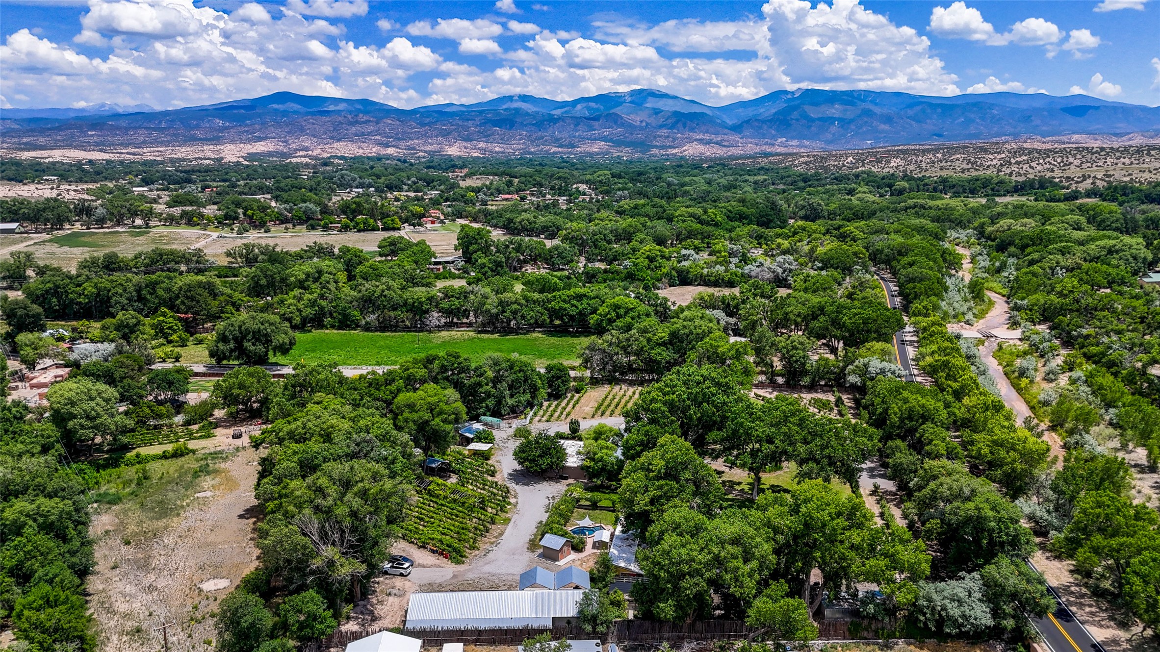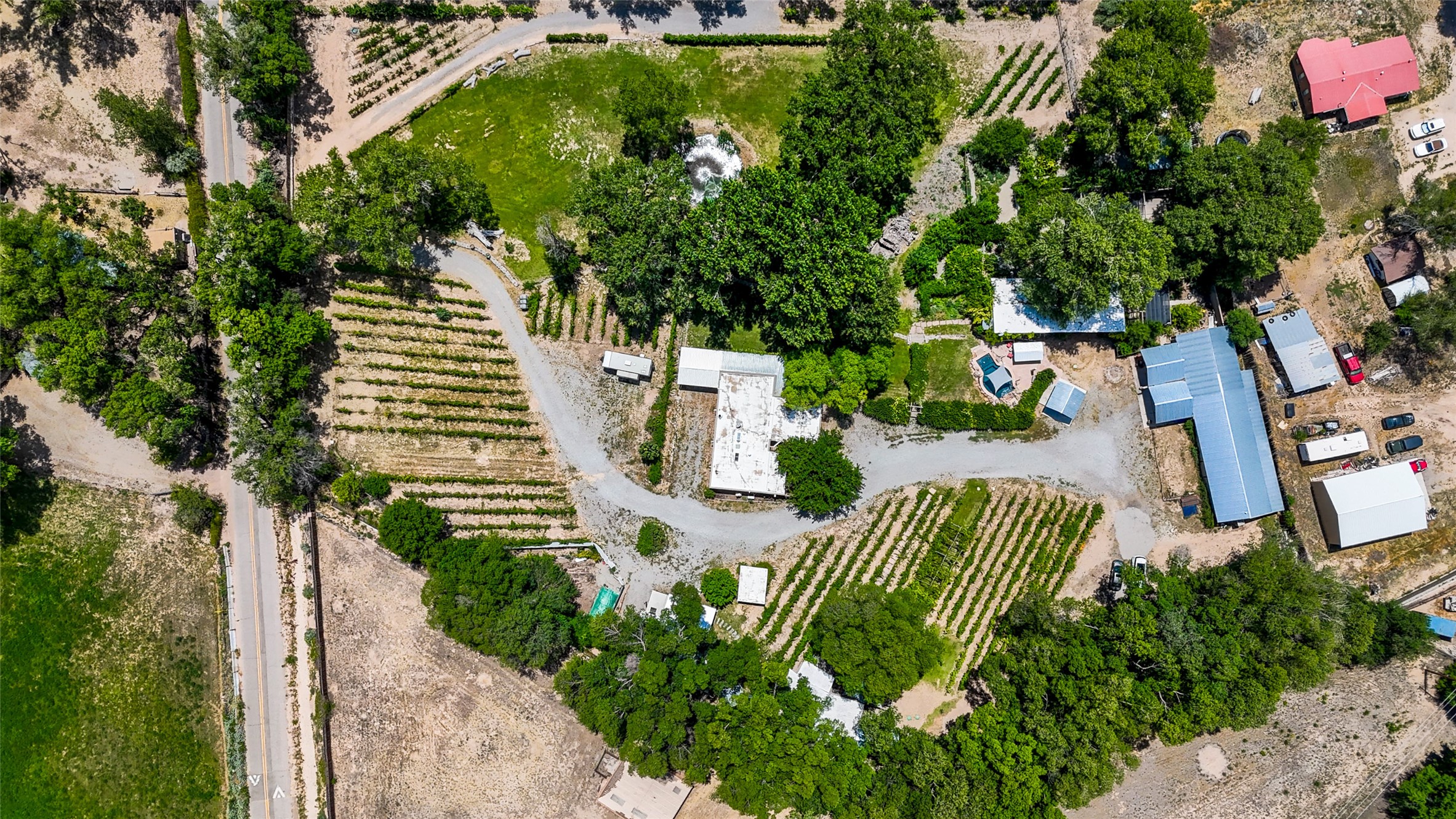 Heavenly 4.5-Acre Estate in Pojoaque Valley - Vineyard, Casitas & More!Rare opportunity to own one of the most spectacular estates in the Pojoaque Valley, just minutes from downtown Santa Fe. This 4.5-acre property offers a serene retreat with 3 acre-feet of domestic water rights and 6.91 acre-feet of irrigation water rights, supporting both vineyard expansion and lush garden potential. The grounds are also home to mature apple, plum, pear, and cherry trees.The main residence is a classic adobe featuring 4 bedrooms and 2 bathrooms (ESTIMATED SQ. FT. 2300), with traditional New Mexican details including vigas, brick floors, two rock fireplaces, and a spacious portal perfect for outdoor living.Three additional casitas (ESTIMATED TOTAL 3100 SQ. FT. COMBINED) provide excellent flexibility:1BR/1BA Casita - 800 sq. ft.2BR/2BA Casita - 811 sq. ft.1BR / 1BA Casita ready for your personal touch and renovation vision - 1500 sq. ft.Ideal for short-term rentals, guest stays, or multi-generational living.Outdoor amenities offer exceptional entertainment and relaxation opportunities:25-person hot tub/poolFirepit lounge areaOutdoor bathrooms and showersBrick pizza ovensWine cellar2 RV hookupsA large metal barn offers generous storage or potential for workshop, studio, or event use.Whether you dream of running a boutique vineyard, hosting retreats, or simply living in peaceful luxury, this unique Pojoaque Valley estate delivers charm, privacy, and unlimited potential.