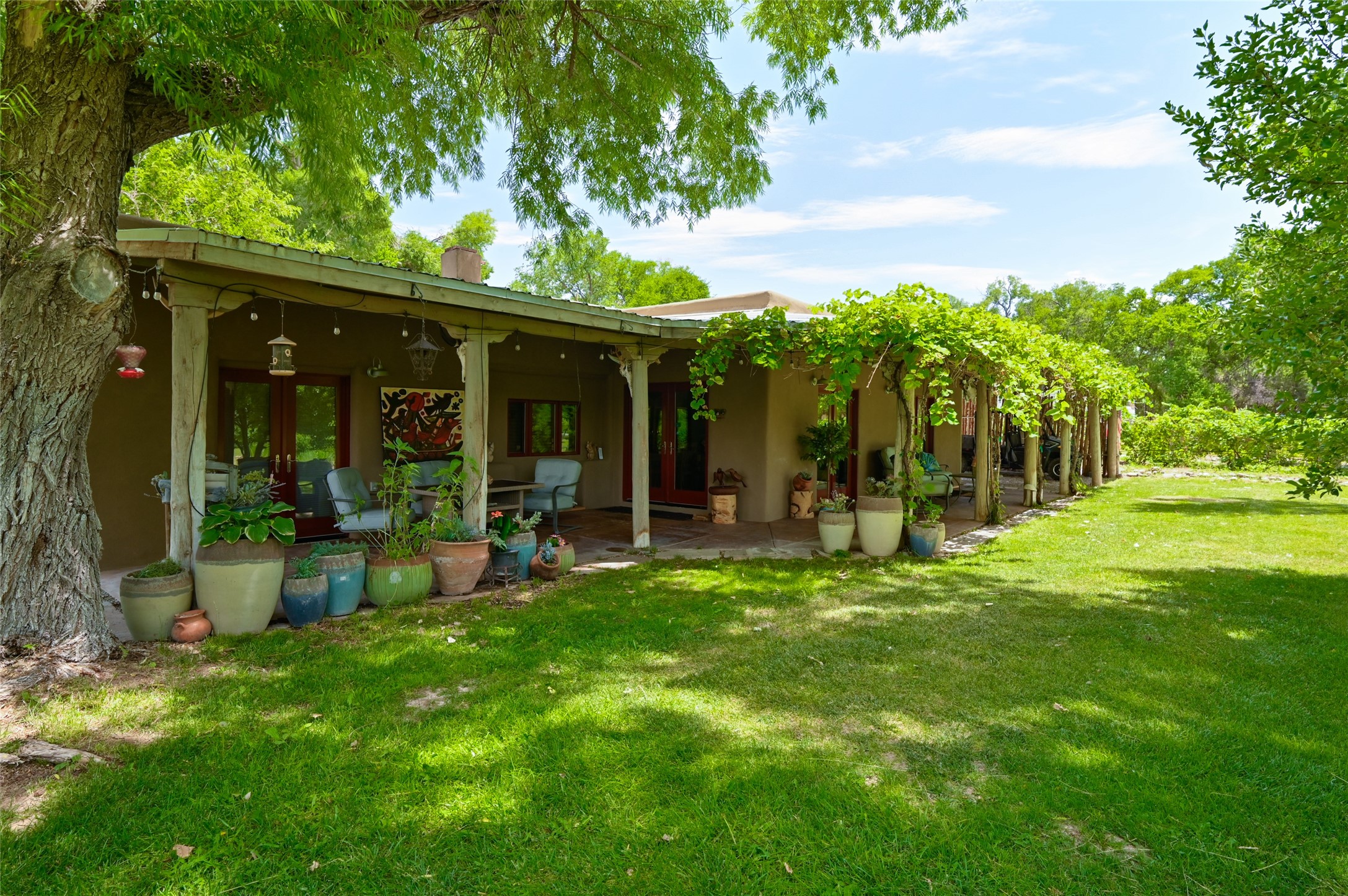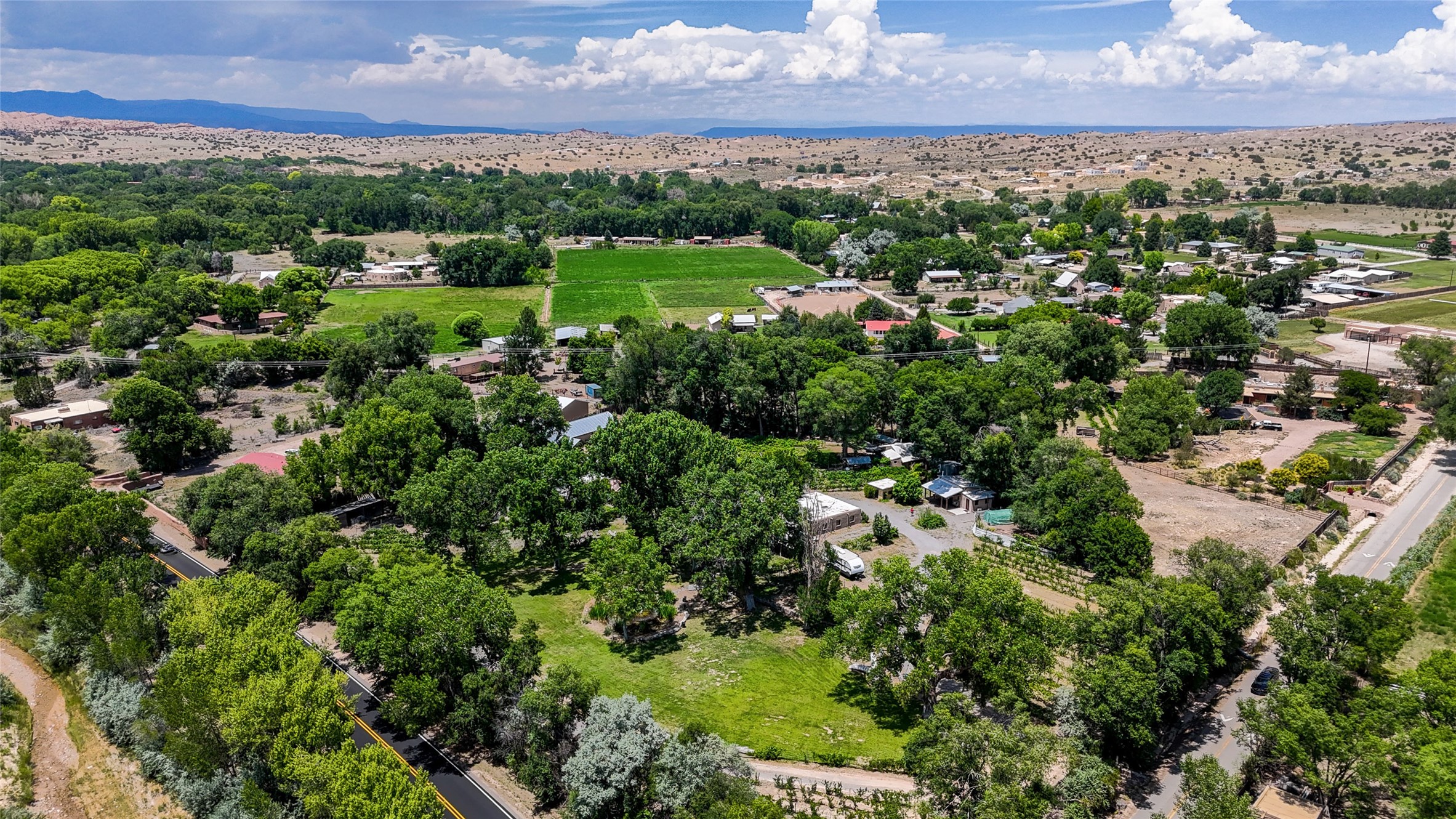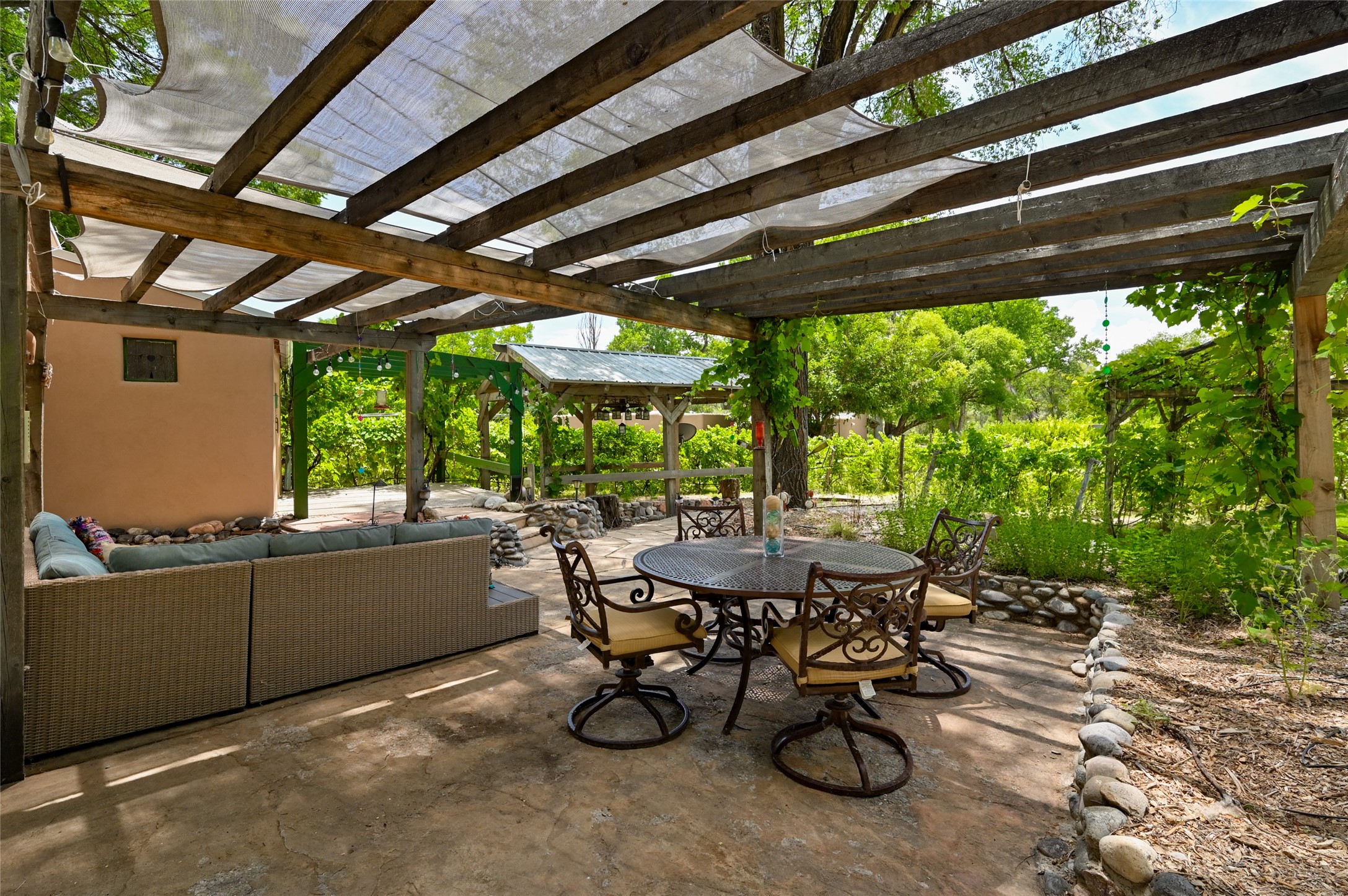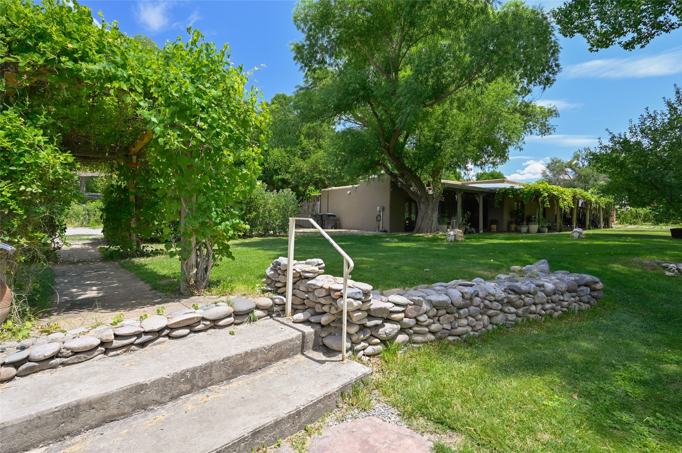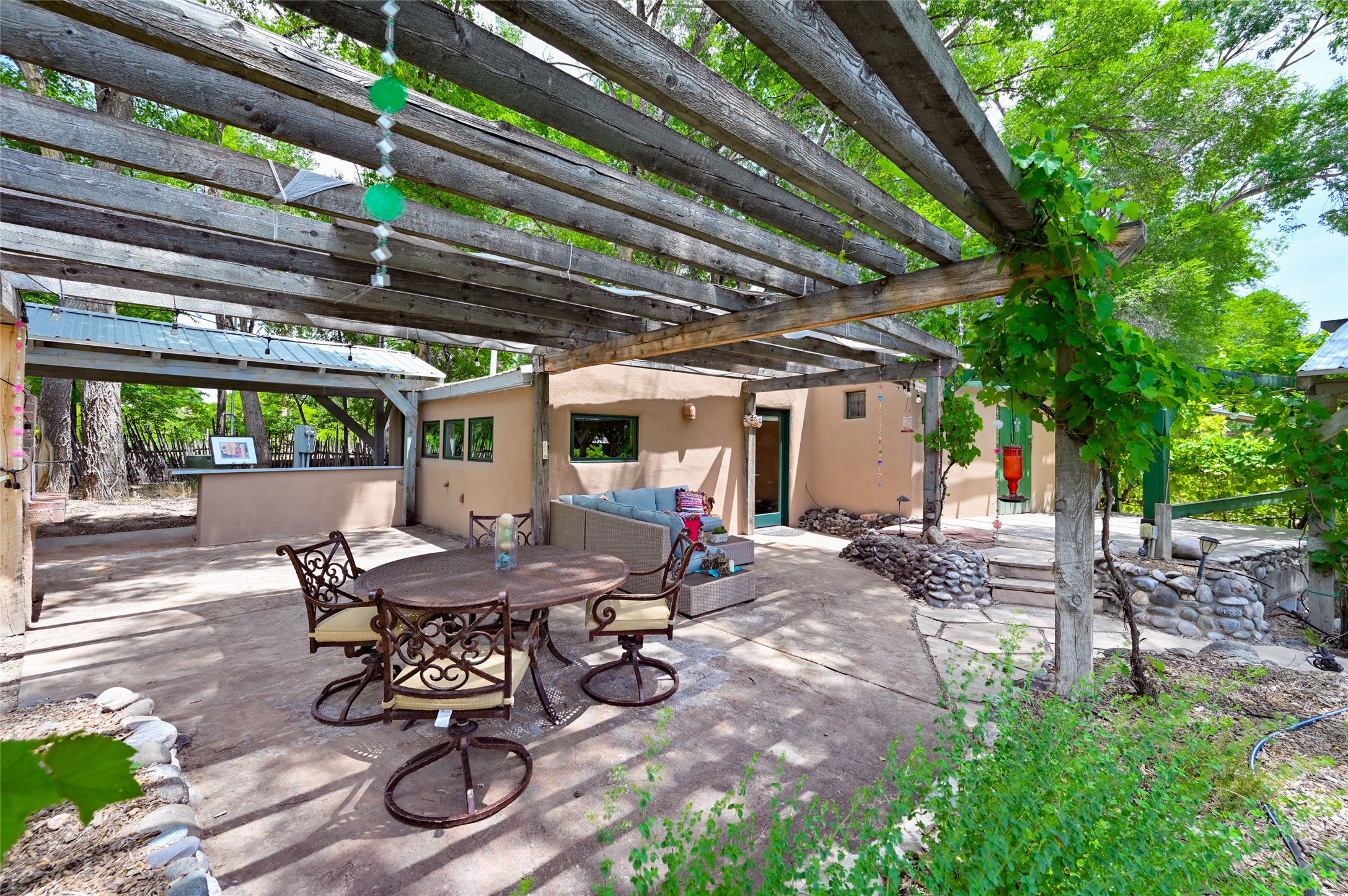 Heavenly 4.5-Acre Estate in Pojoaque Valley - Vineyard, Casitas & More!Rare opportunity to own one of the most spectacular estates in the Pojoaque Valley, just minutes from downtown Santa Fe. This 4.5-acre property offers a serene retreat with 3 acre-feet of domestic water rights and 6.91 acre-feet of irrigation water rights, supporting both vineyard expansion and lush garden potential. The grounds are also home to mature apple, plum, pear, and cherry trees.The main residence is a classic adobe featuring 4 bedrooms and 2 bathrooms (ESTIMATED SQ. FT. 2300), with traditional New Mexican details including vigas, brick floors, two rock fireplaces, and a spacious portal perfect for outdoor living.Three additional casitas (ESTIMATED TOTAL 3100 SQ. FT. COMBINED) provide excellent flexibility:1BR/1BA Casita - 800 sq. ft.2BR/2BA Casita - 811 sq. ft.1BR / 1BA Casita ready for your personal touch and renovation vision - 1500 sq. ft.Ideal for short-term rentals, guest stays, or multi-generational living.Outdoor amenities offer exceptional entertainment and relaxation opportunities:25-person hot tub/poolFirepit lounge areaOutdoor bathrooms and showersBrick pizza ovensWine cellar2 RV hookupsA large metal barn offers generous storage or potential for workshop, studio, or event use.Whether you dream of running a boutique vineyard, hosting retreats, or simply living in peaceful luxury, this unique Pojoaque Valley estate delivers charm, privacy, and unlimited potential.